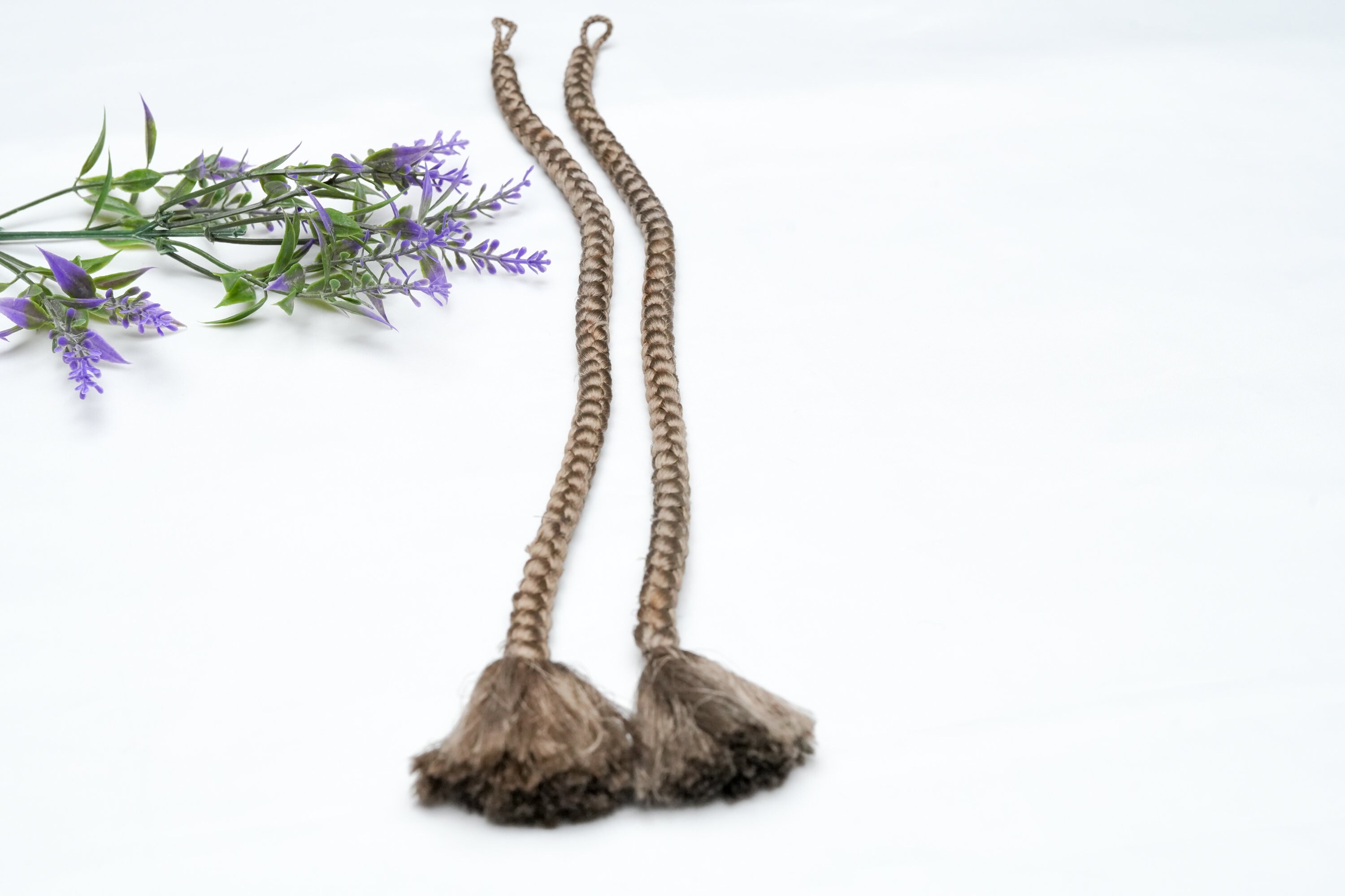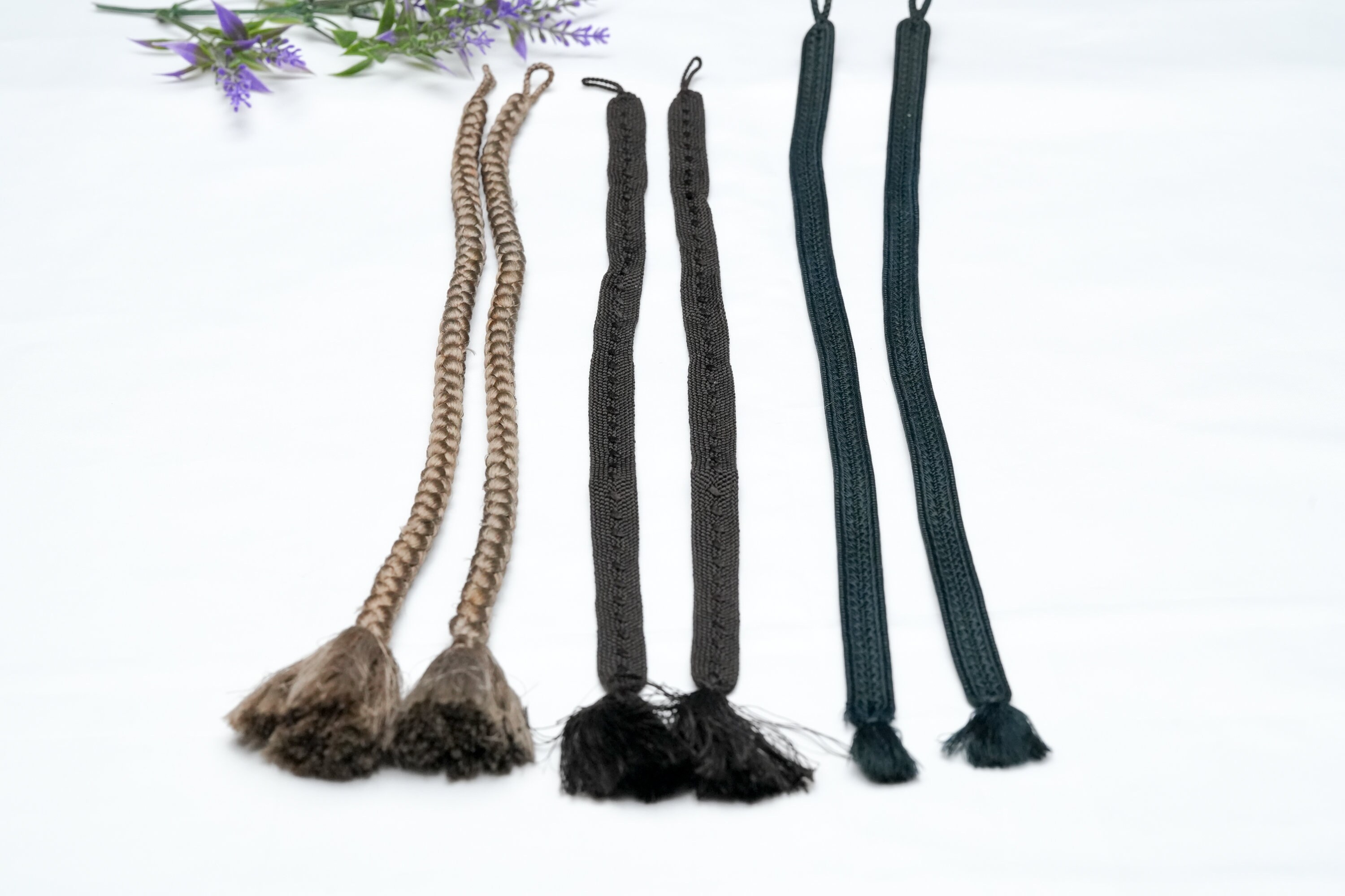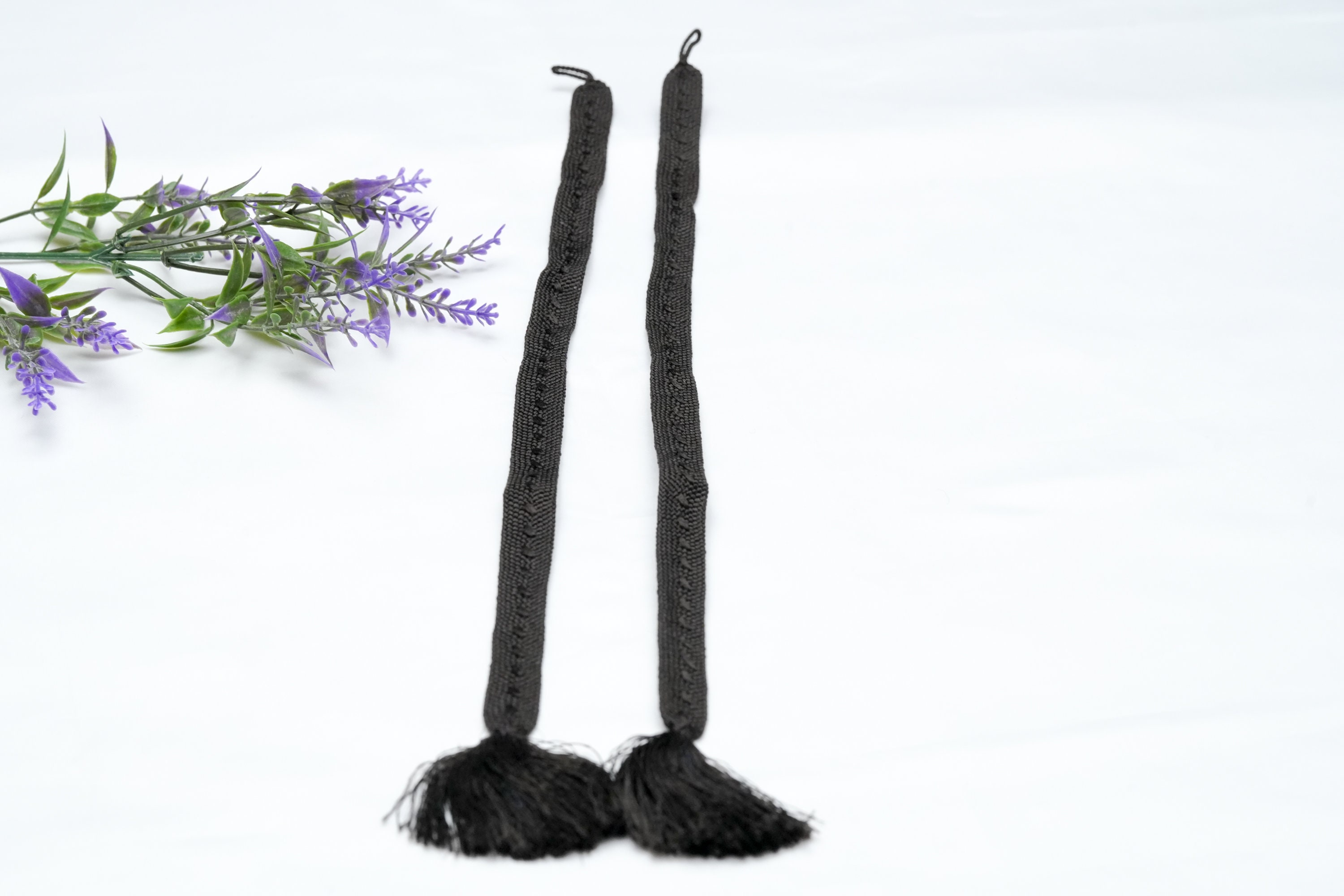 Haorihimos are short, woven cords being attached to inside seam of Haori collar as a formal accessory. They generally come with hooks on ends of the cord that will hang on to the loops on each side of Haori collar making a floating tassel decoration in the center.