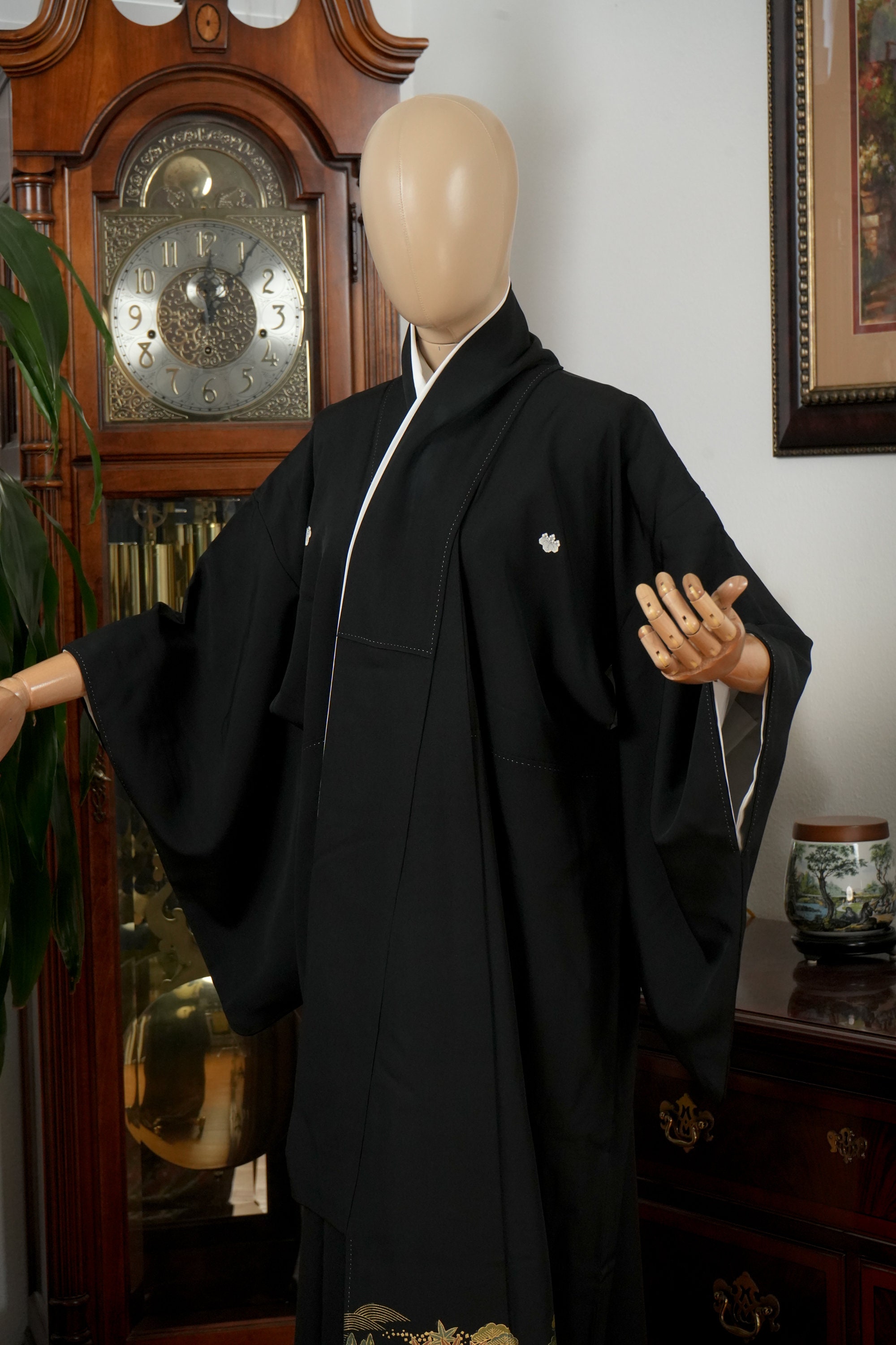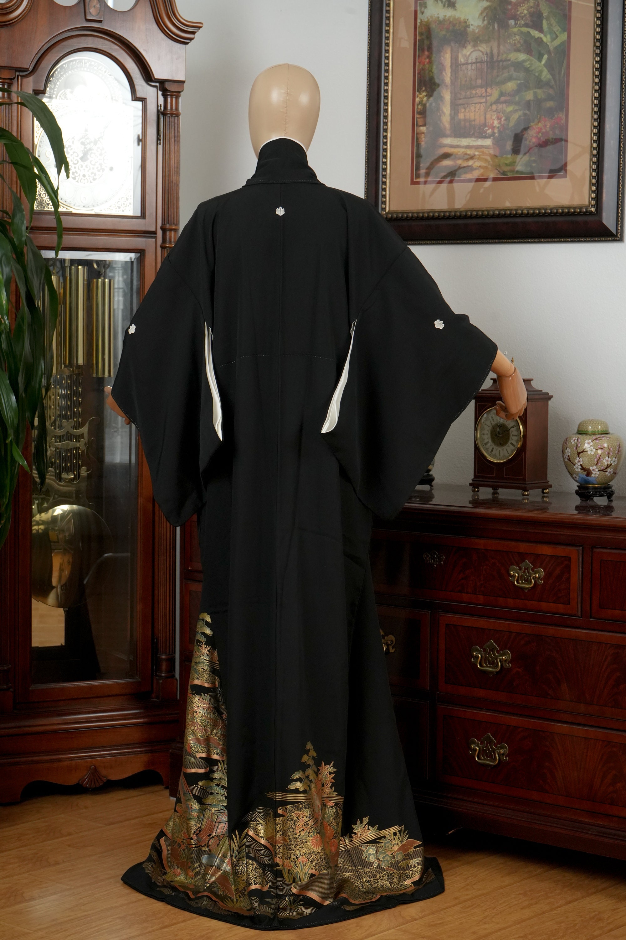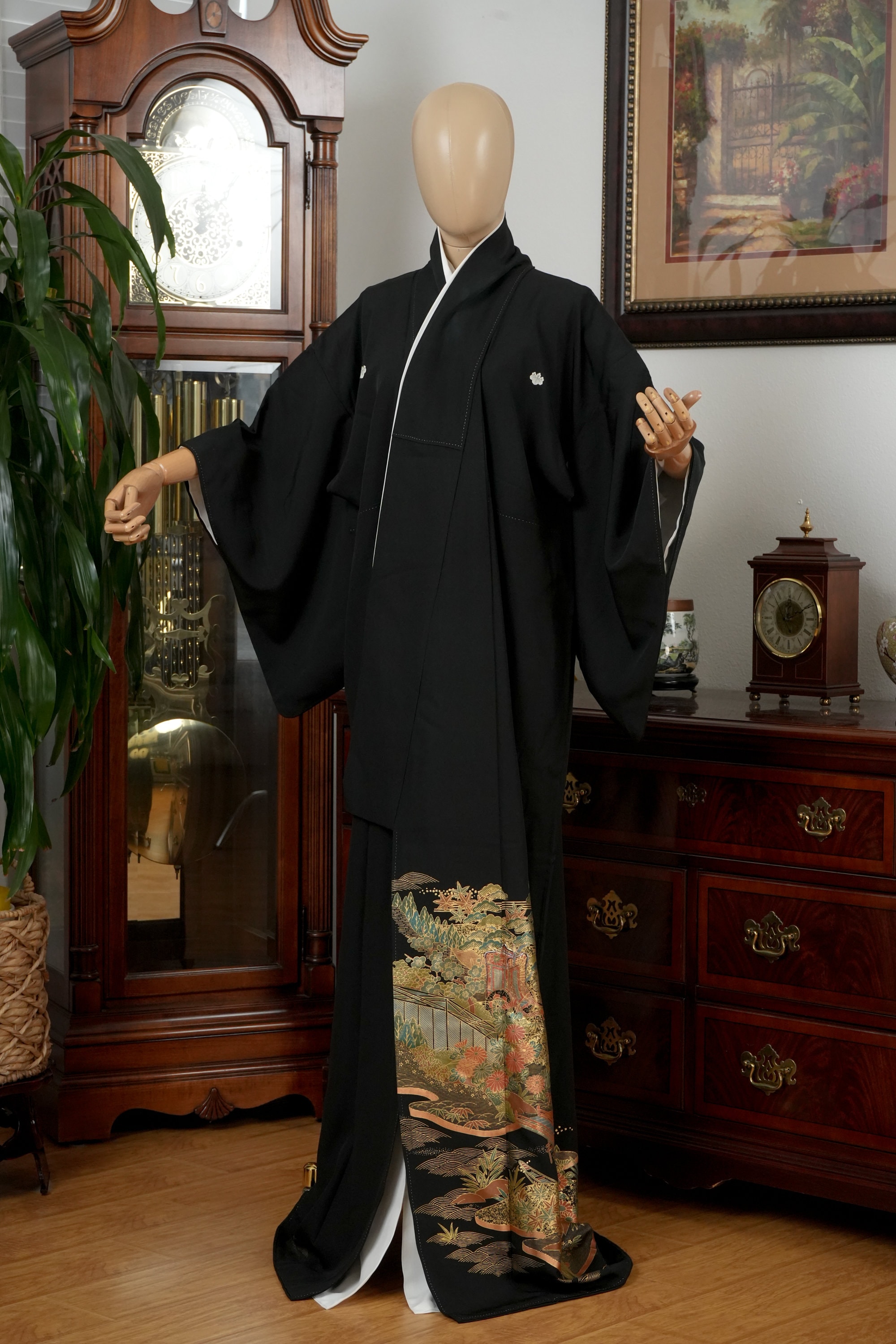 Tomesode is the most formal, high class Kimono for all ceremonies and occasions. Black ones are worn by married women and colored ones are worn by both married and unmarried women. Distinct characteristics of Tomesode are family crests and surrounding patterns around the hem. Numbers of family crests specify formality and rank.