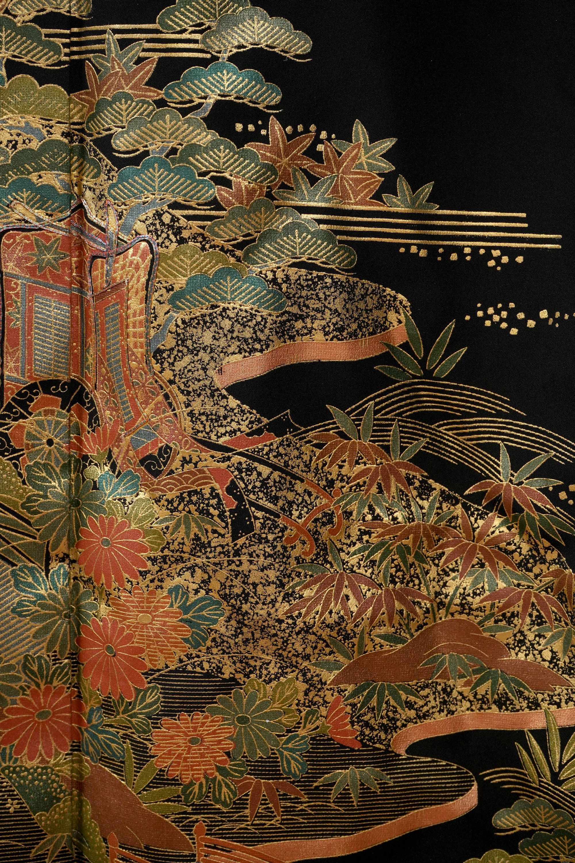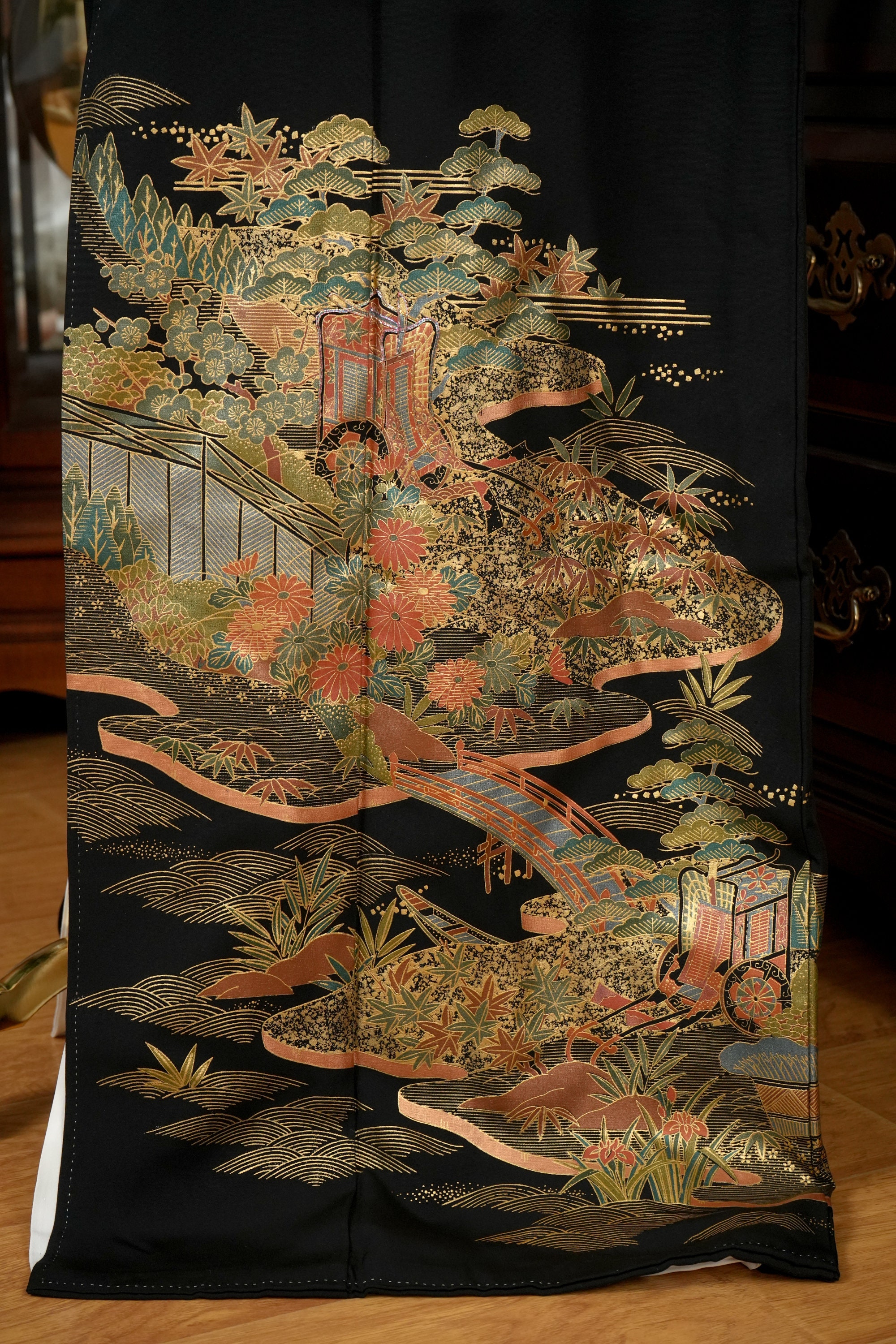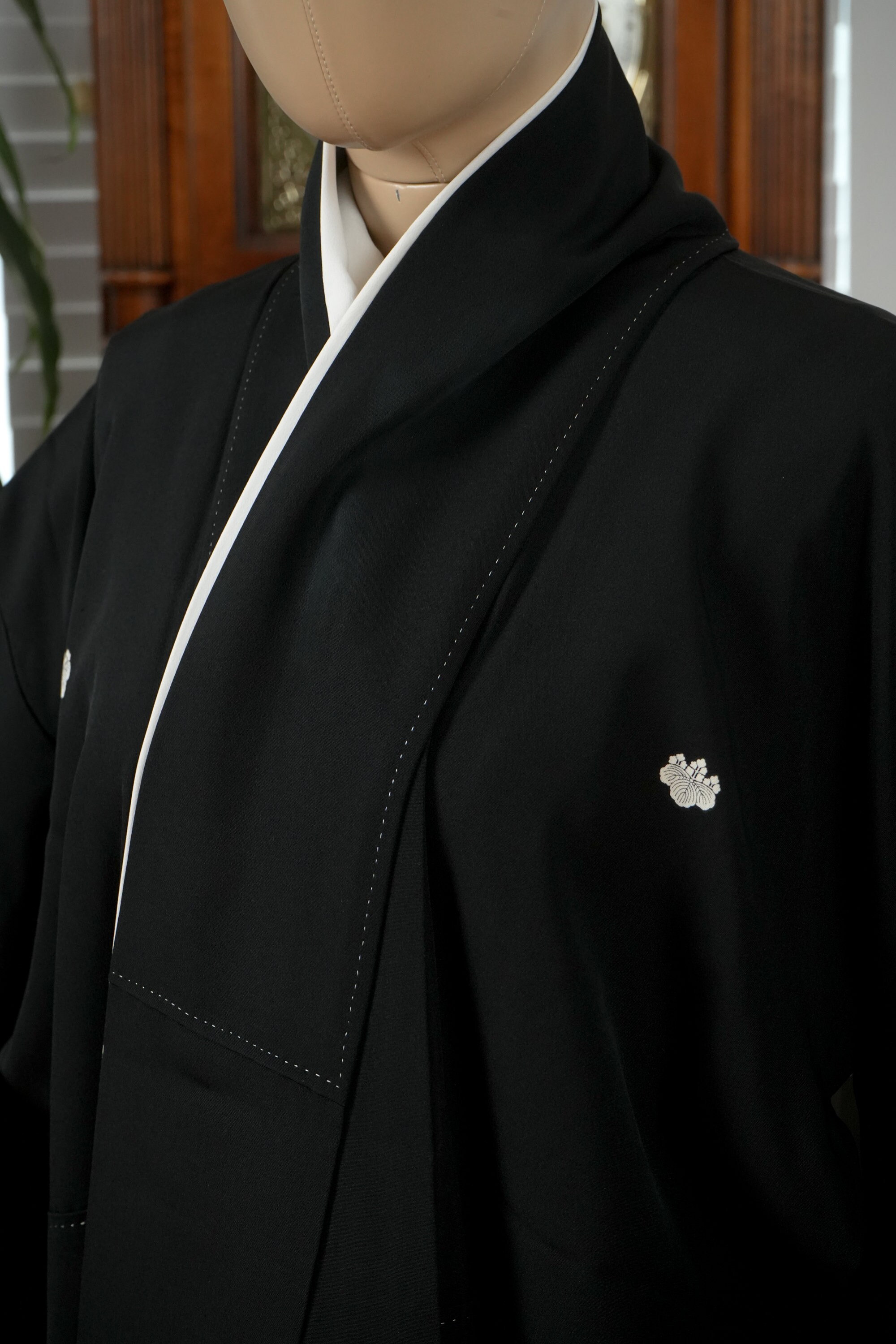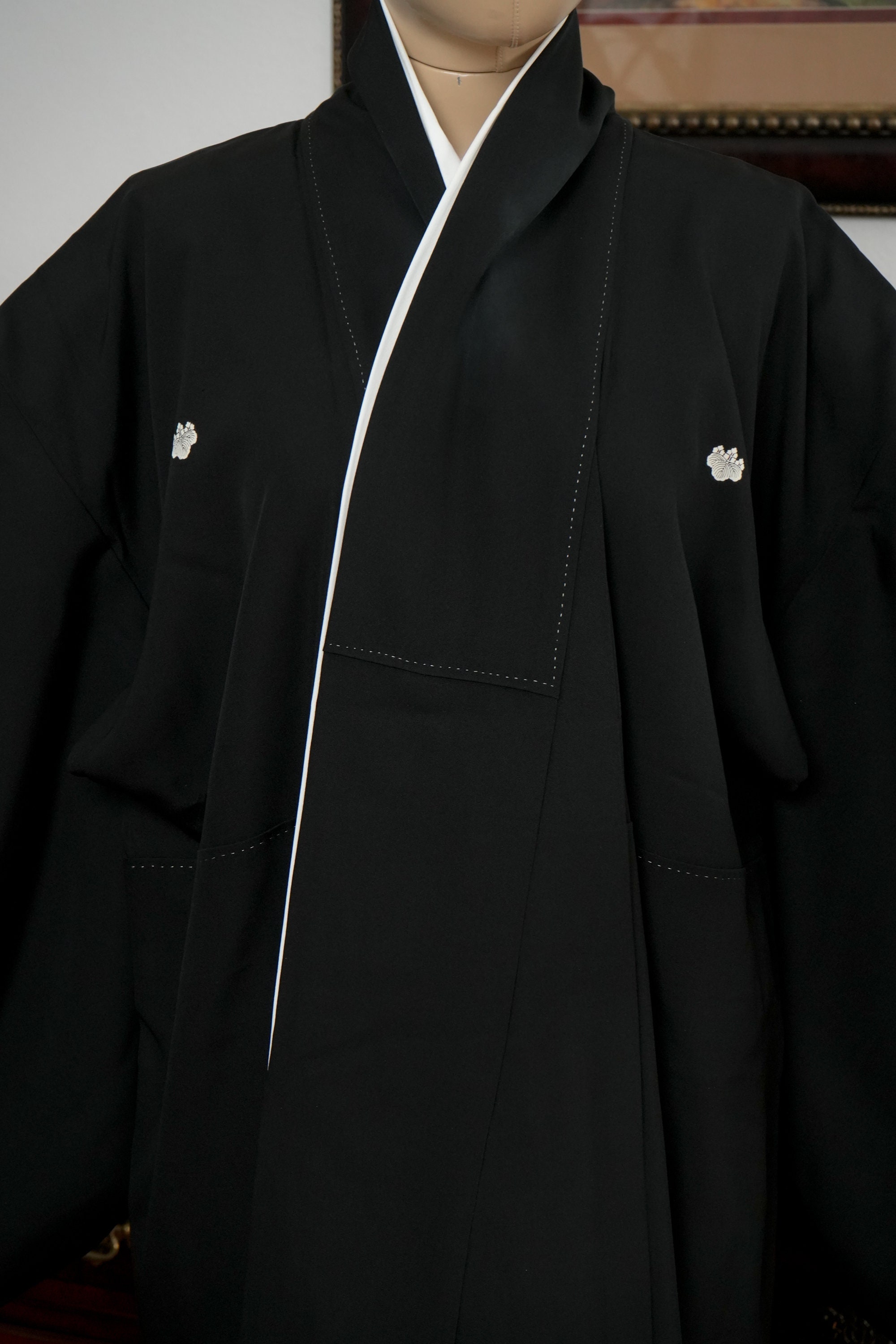 Tomesode is the most formal, high class Kimono for all ceremonies and occasions. Black ones are worn by married women and colored ones are worn by both married and unmarried women. Distinct characteristics of Tomesode are family crests and surrounding patterns around the hem. Numbers of family crests specify formality and rank.