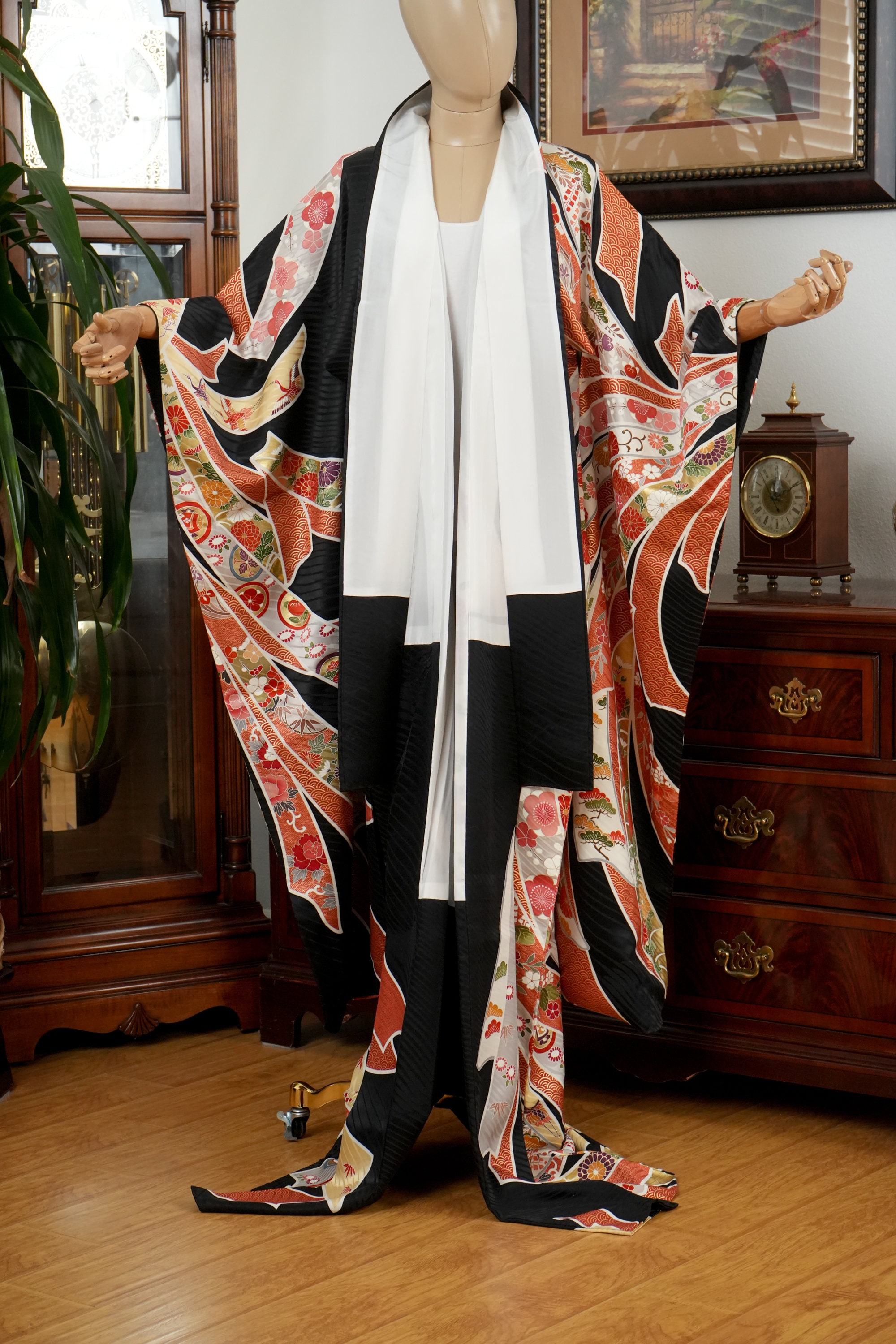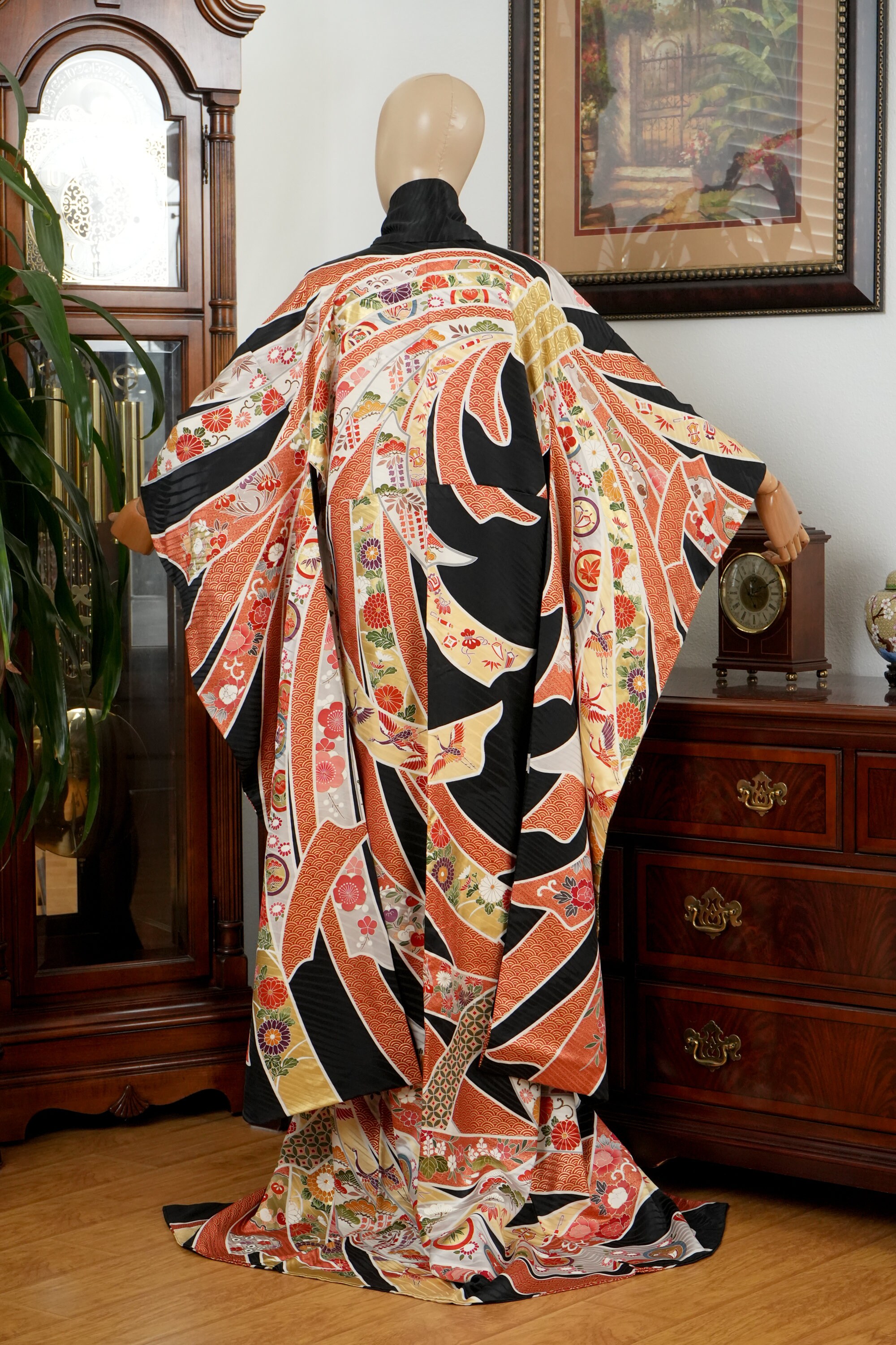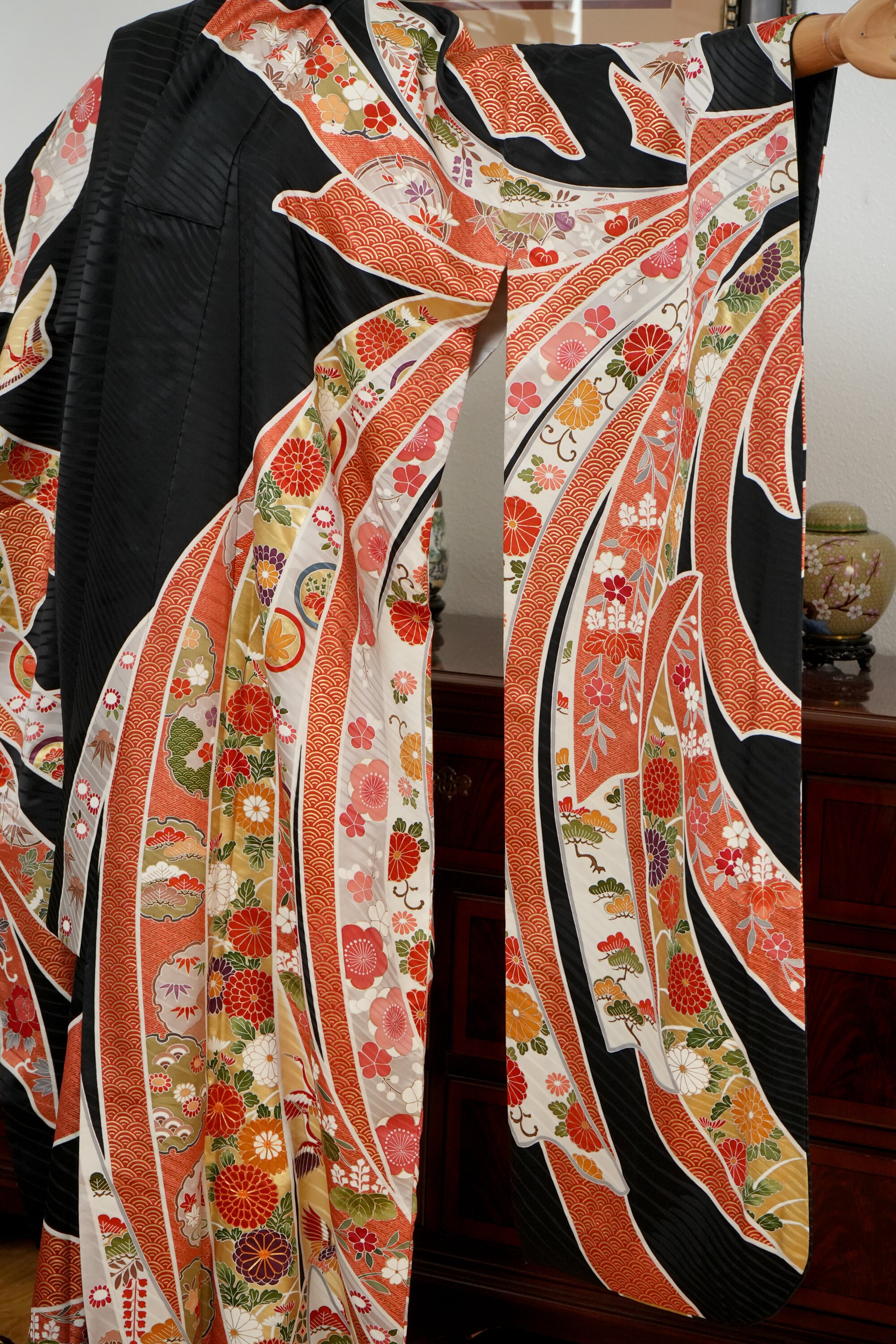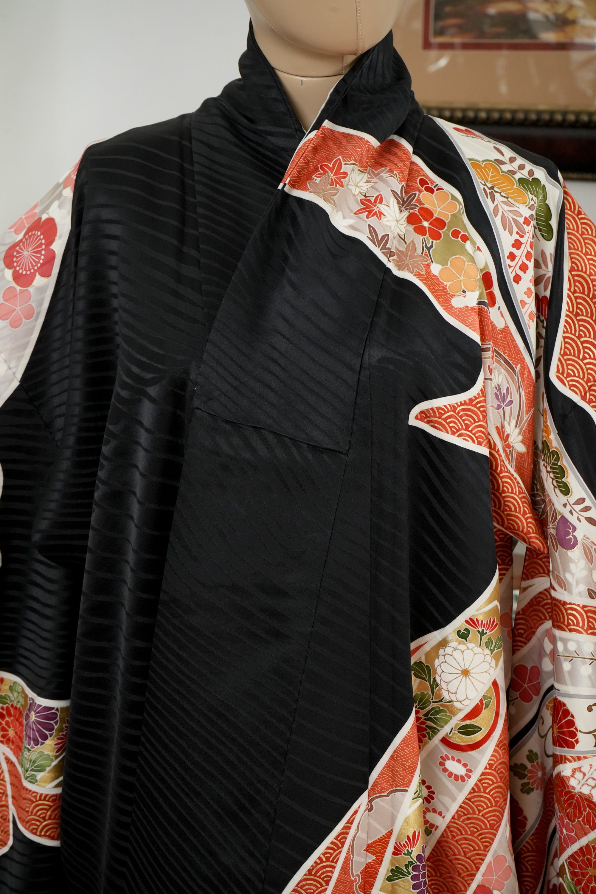 Furisode is a formal kimono distinguishable by its long sleeves. Furisode is the most formal style of kimono worn by young unmarried women in Japan, generally used for formal social functions such as the tea ceremony, wedding ceremonies and graduation ceremonies. Furisode's elegant aesthetics along with such fine details often make a great wall decoration for home as well.