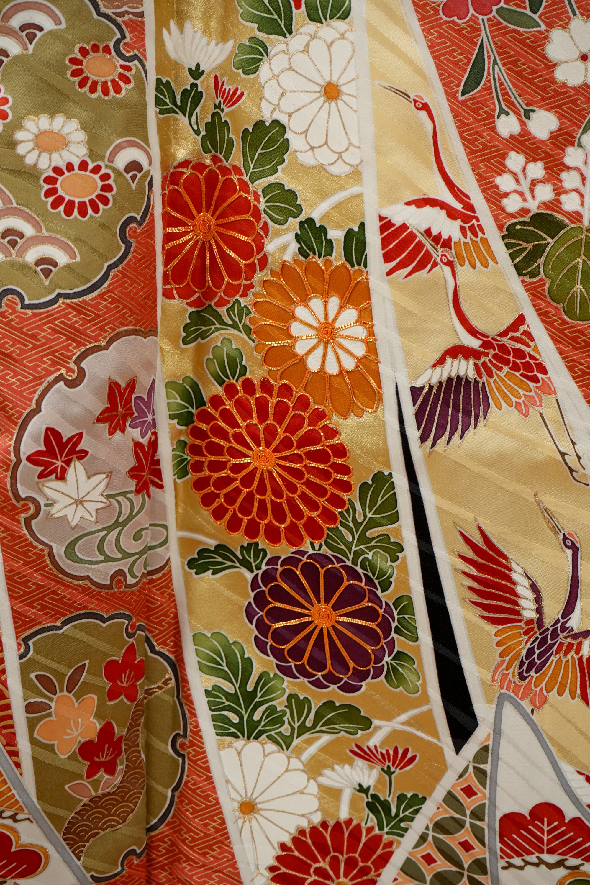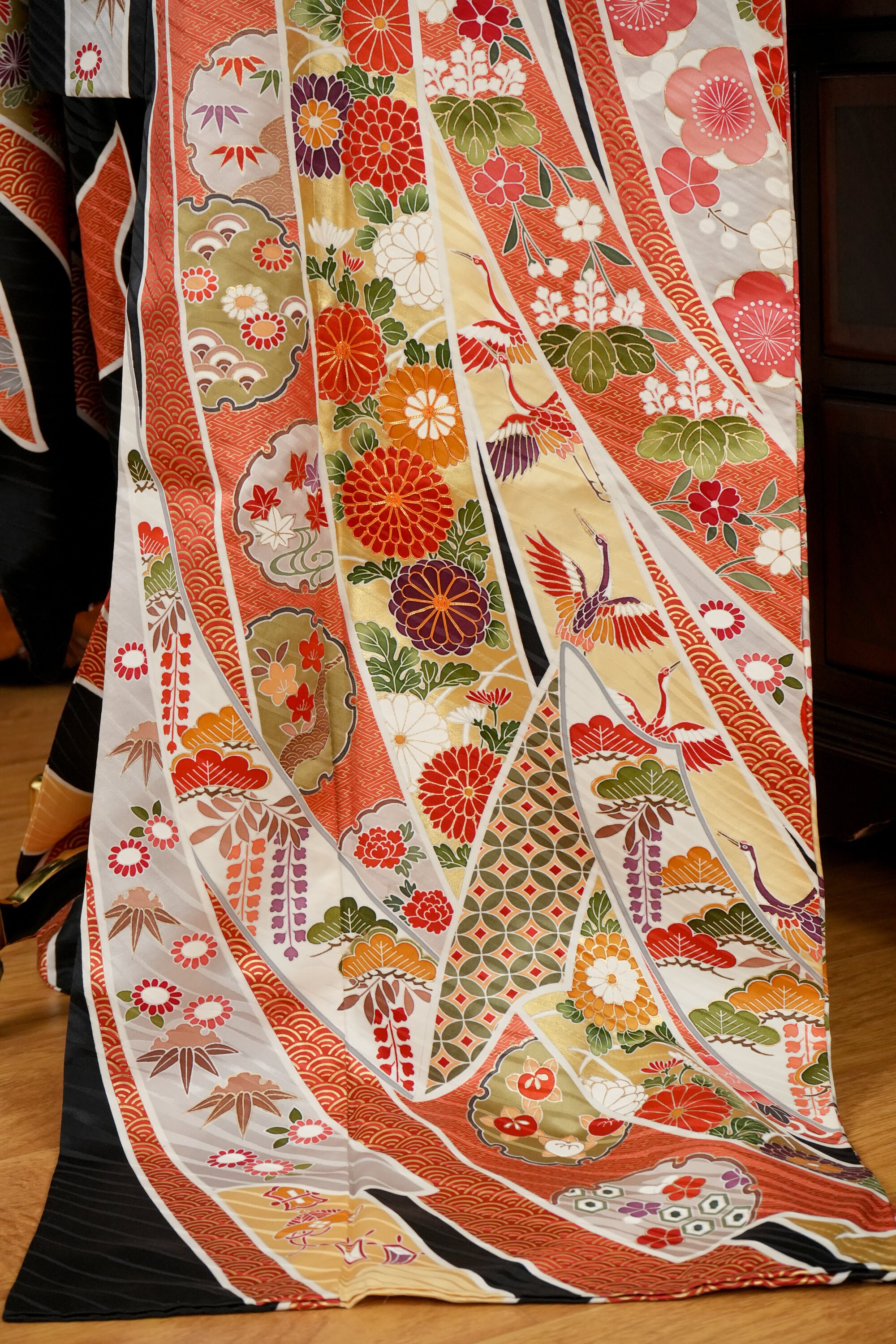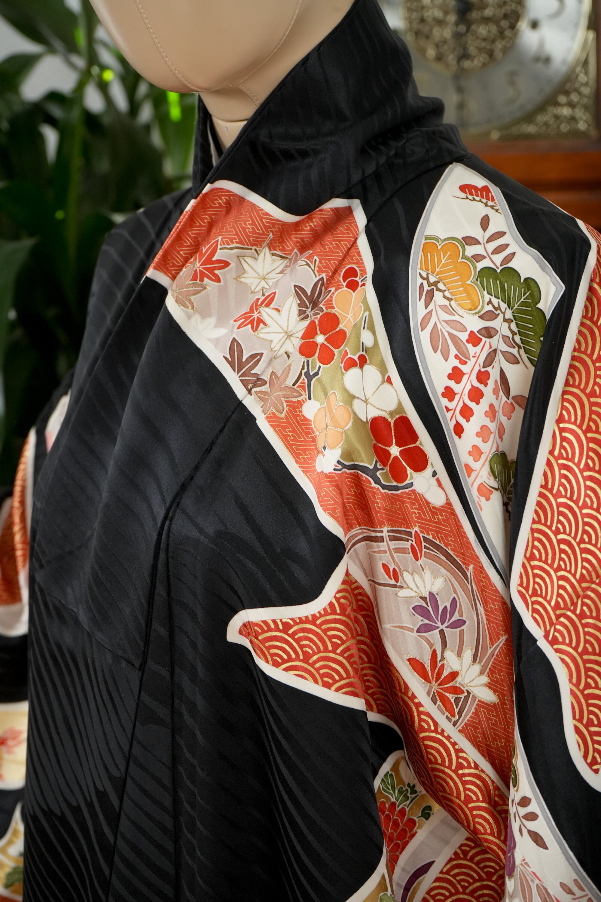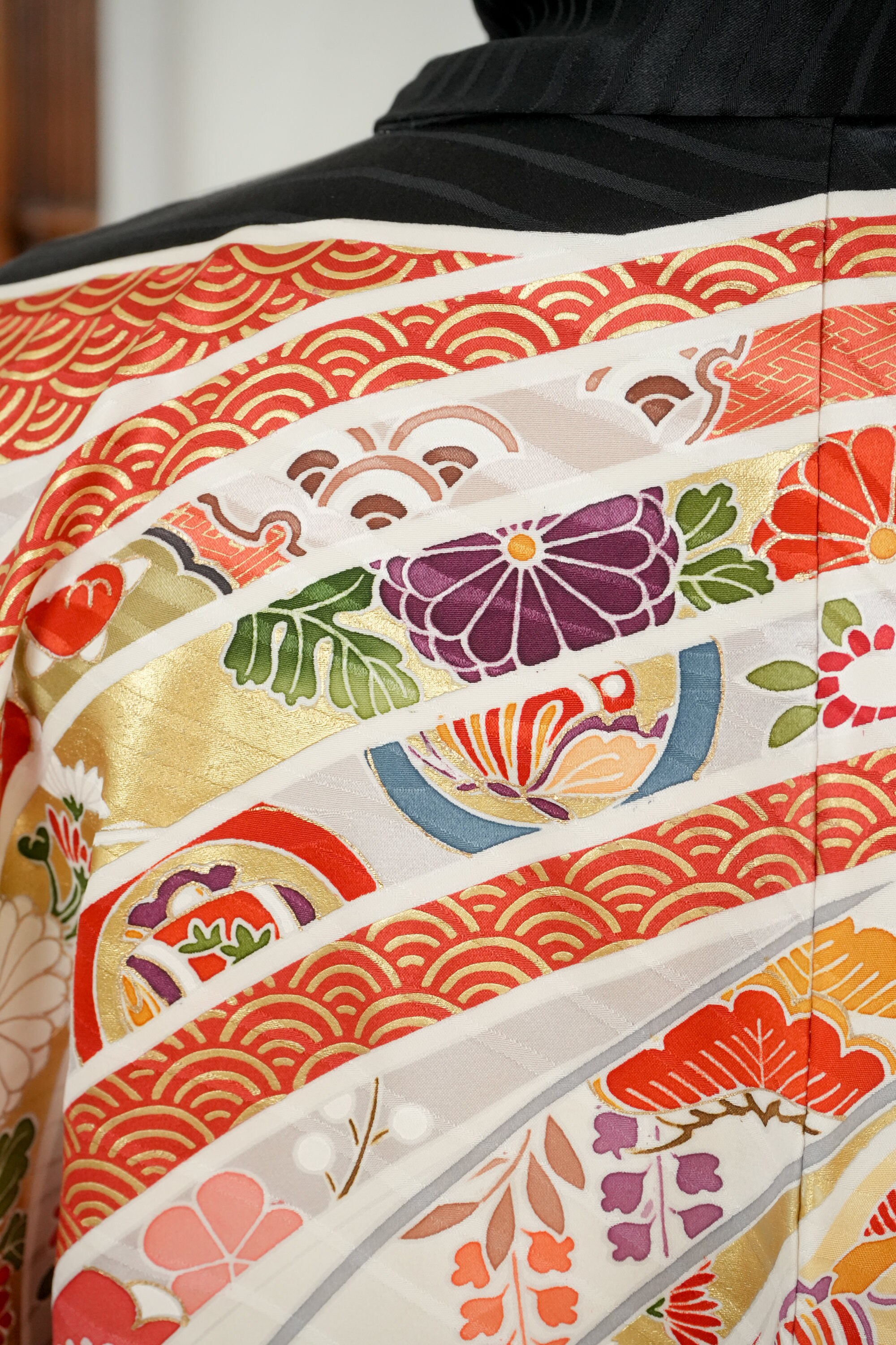 Furisode is a formal kimono distinguishable by its long sleeves. Furisode is the most formal style of kimono worn by young unmarried women in Japan, generally used for formal social functions such as the tea ceremony, wedding ceremonies and graduation ceremonies. Furisode's elegant aesthetics along with such fine details often make a great wall decoration for home as well.