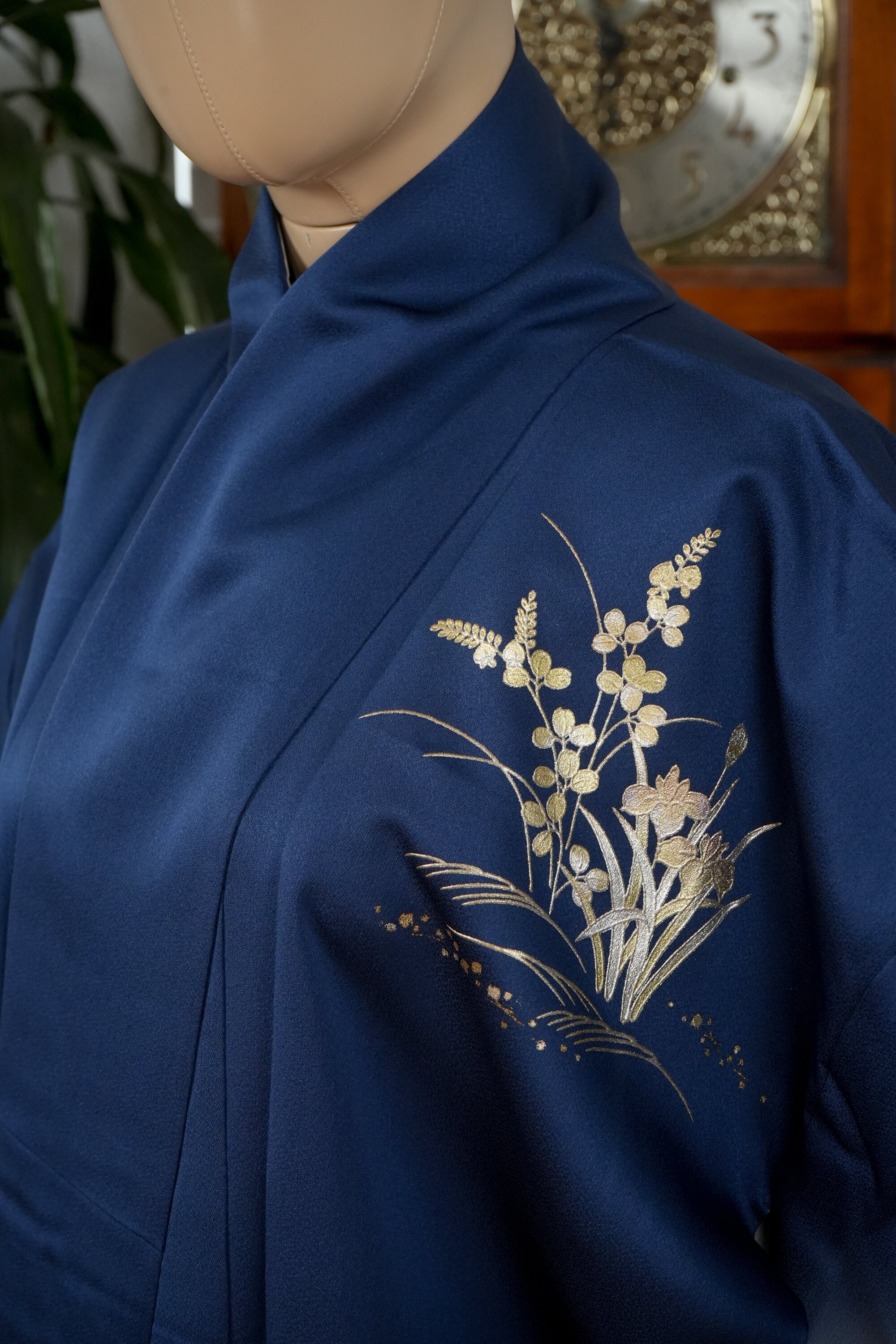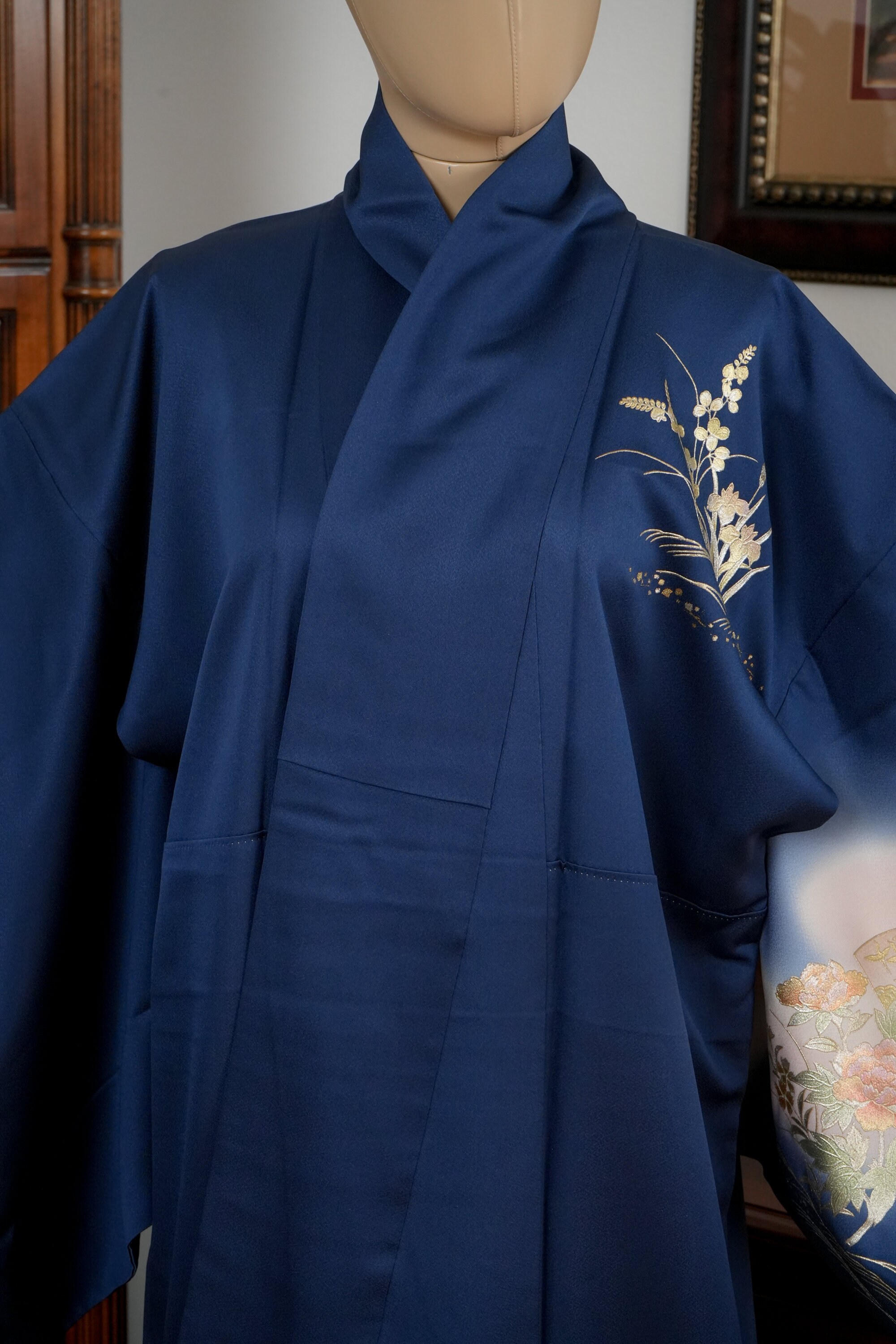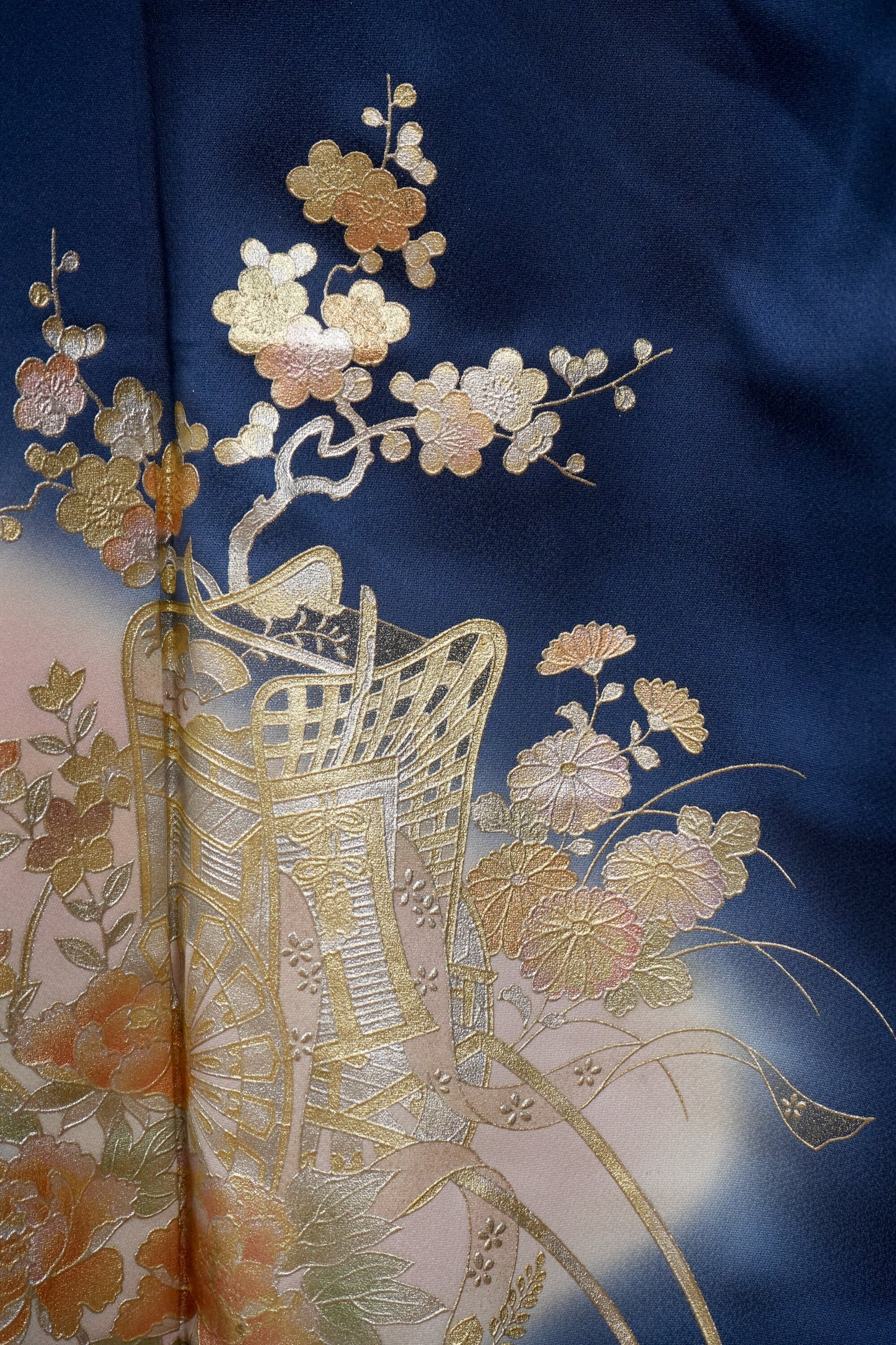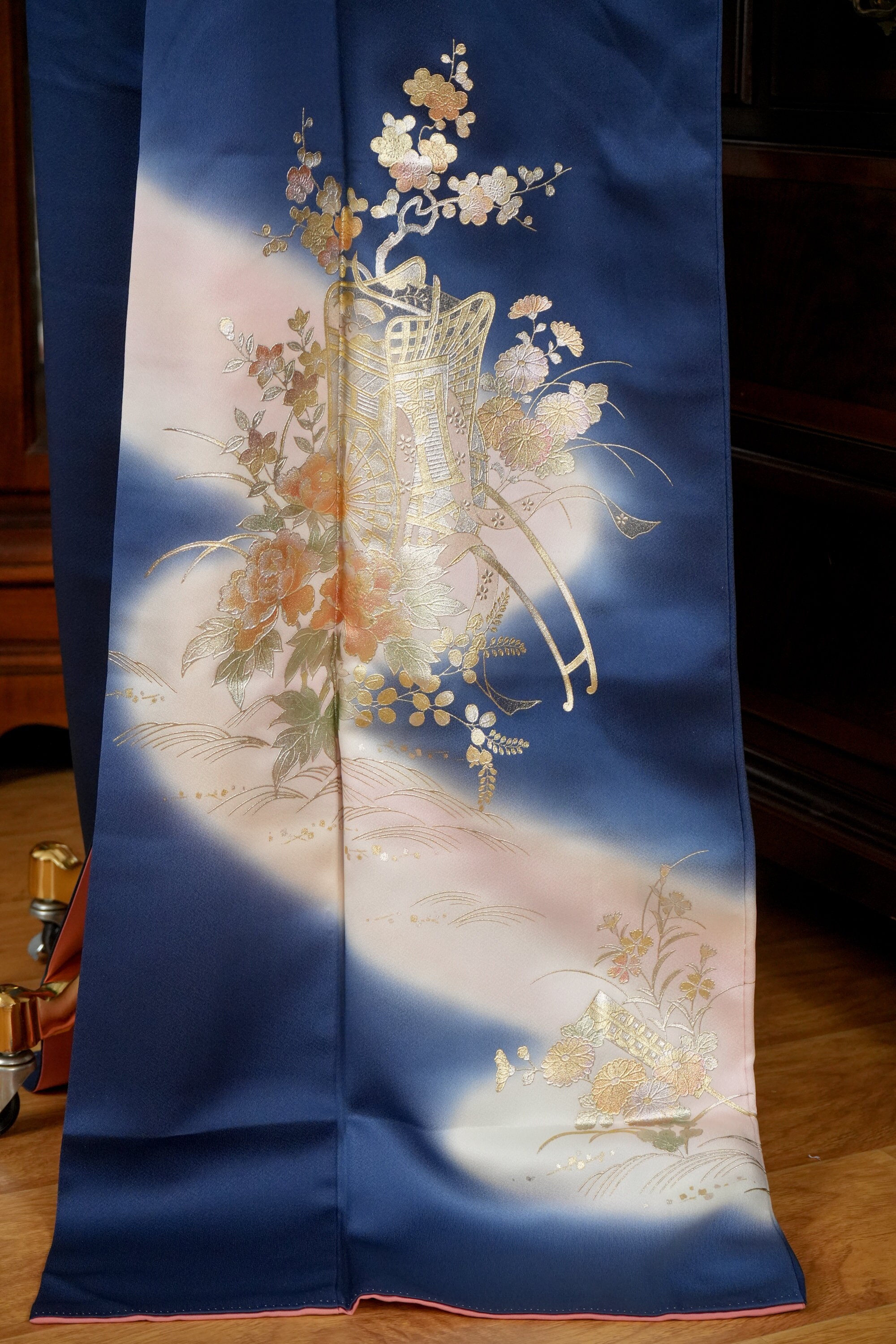 Homongi is a high-class formal Kimono for official visits that became very popular in Meiji period among upper-class females. It is commonly worn as a festive garment for ceremonies and parties by both married and unmarried women. Linked patterns on the chest, shoulder, sleeves and family crests are distinct characteristics of Homongi Kimono.