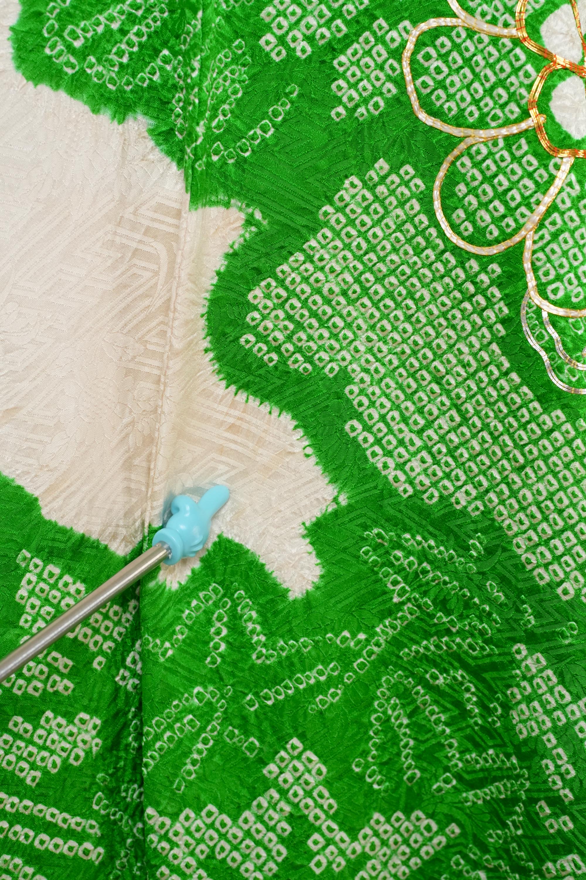BLEMISHES: There are some faint green lines which are mere projections from underneath fabric, not stains. There are some discolorations where Shibori patches connect to the main fabric.