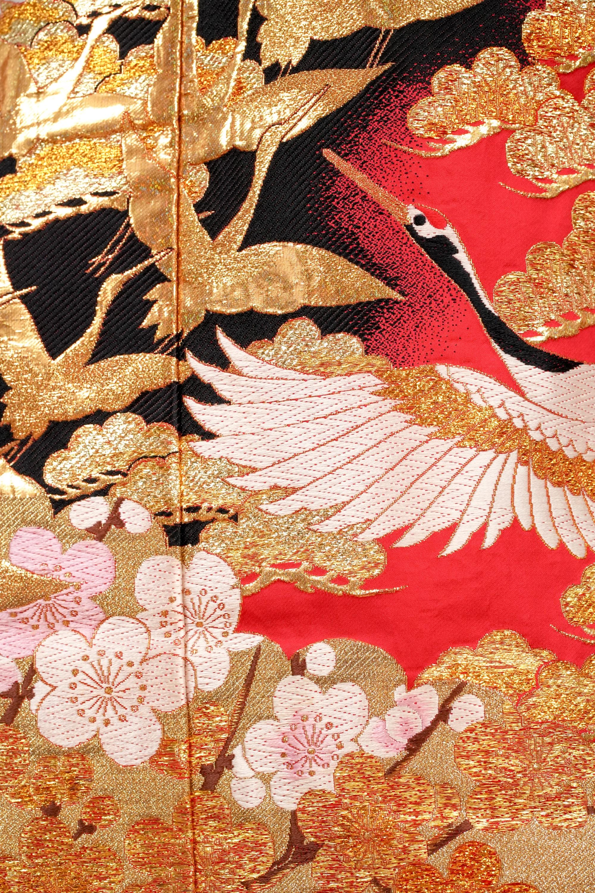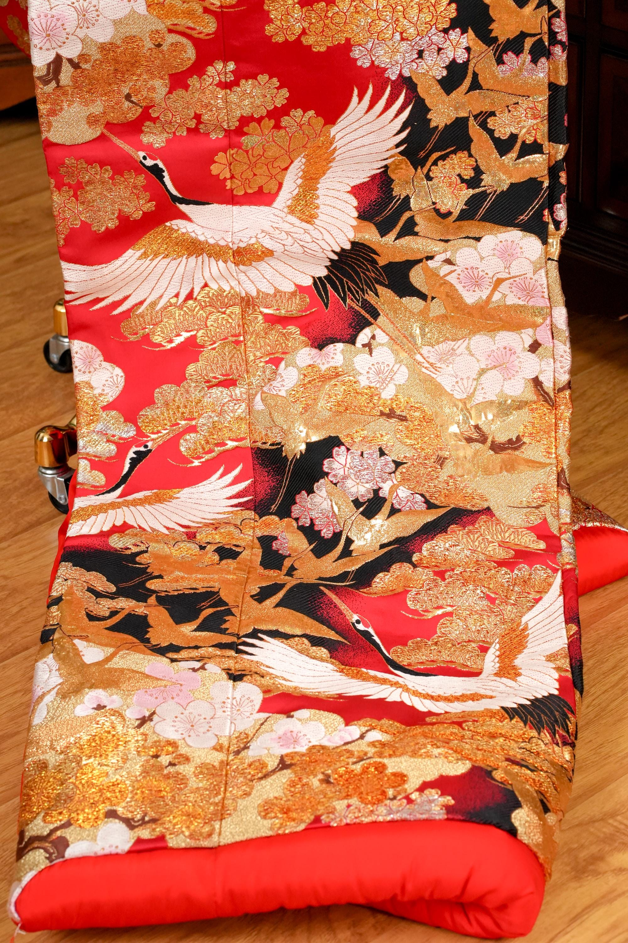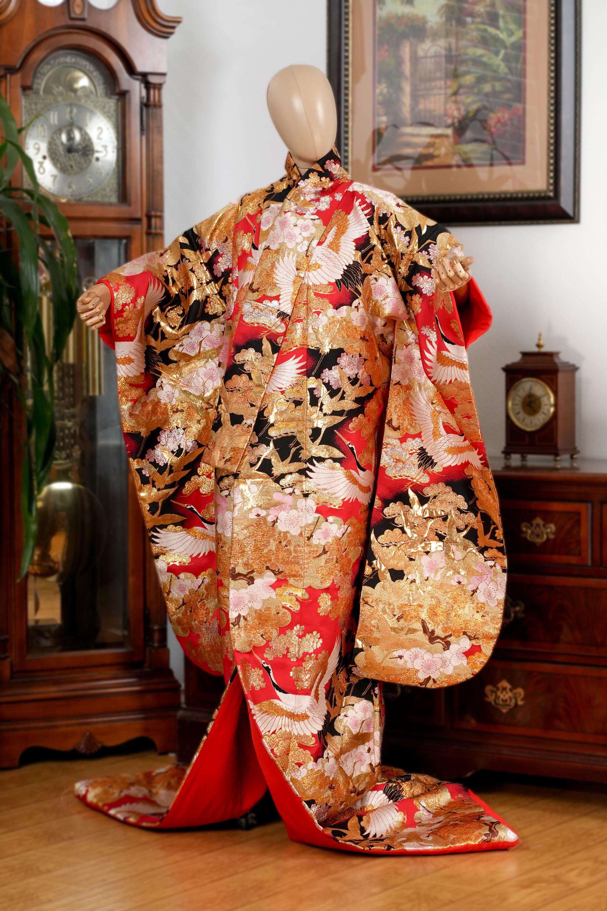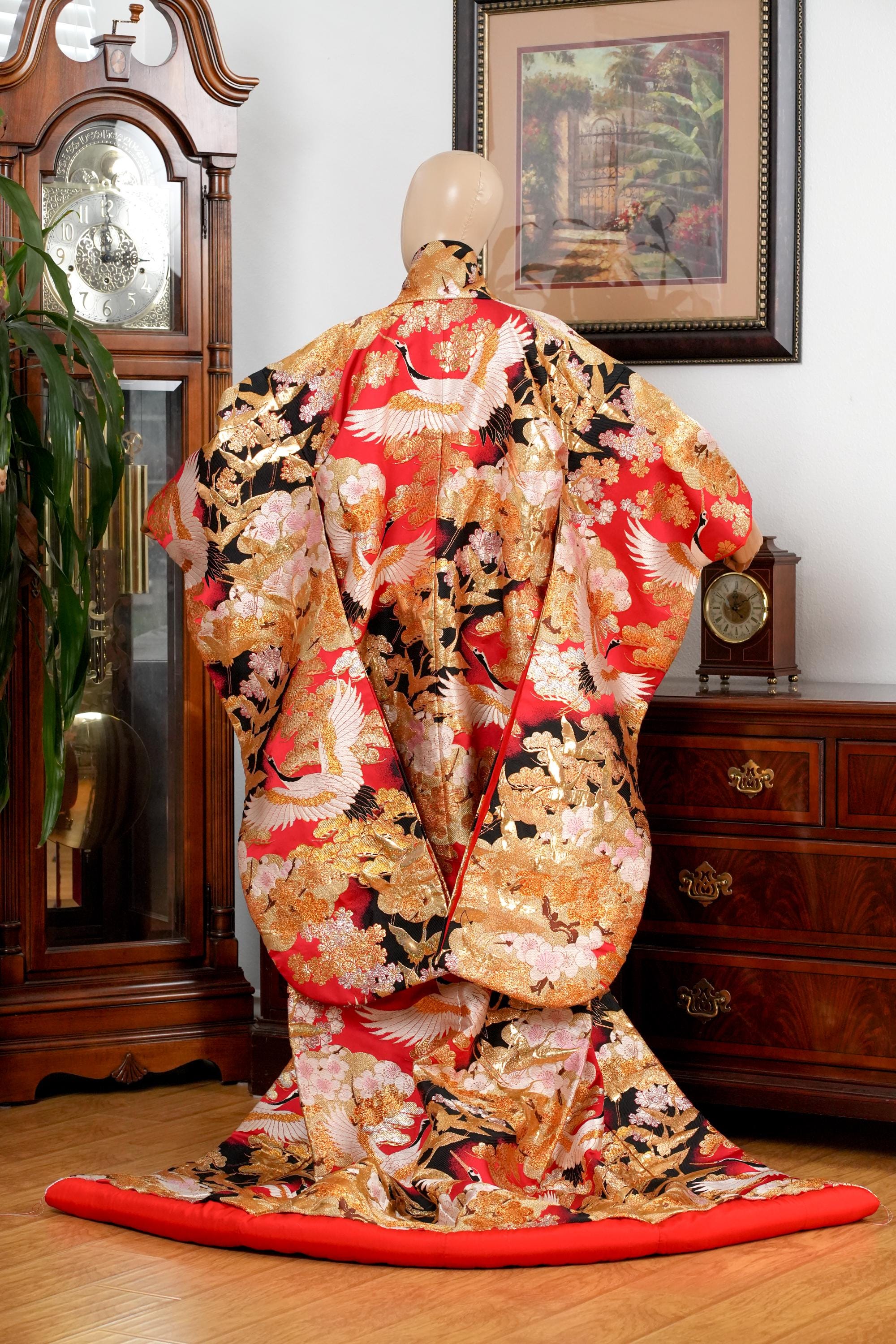 Uchikake is a bridal kimono worn at Japanese traditional wedding ceremony. It is thickly padded, stylishly designed with rich patterns and generally weighs quite heavy. Uchikake is the most luxurious Kimono of all and it comes with extended length and heavily padded hem. Uchikake is normally worn over Kakeshita as an outer wedding Kimono.