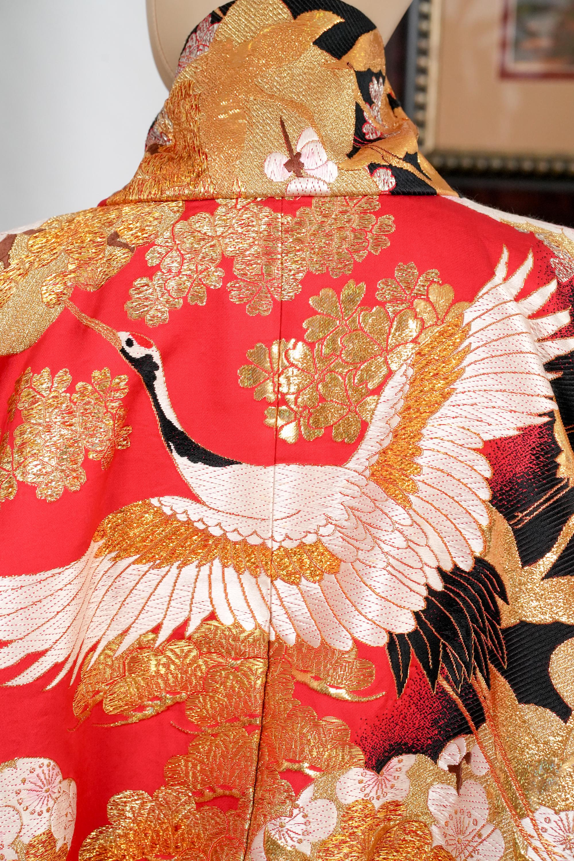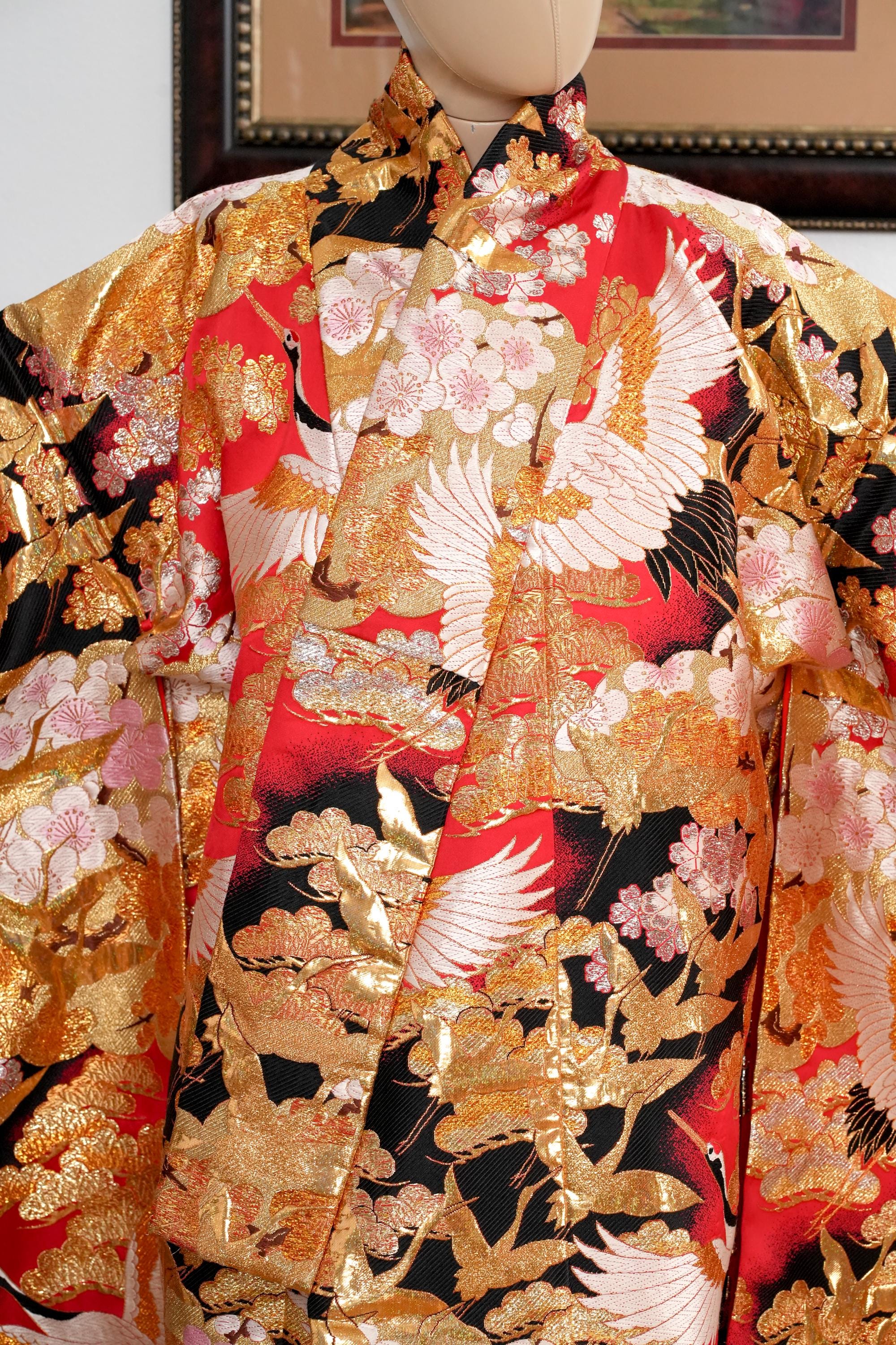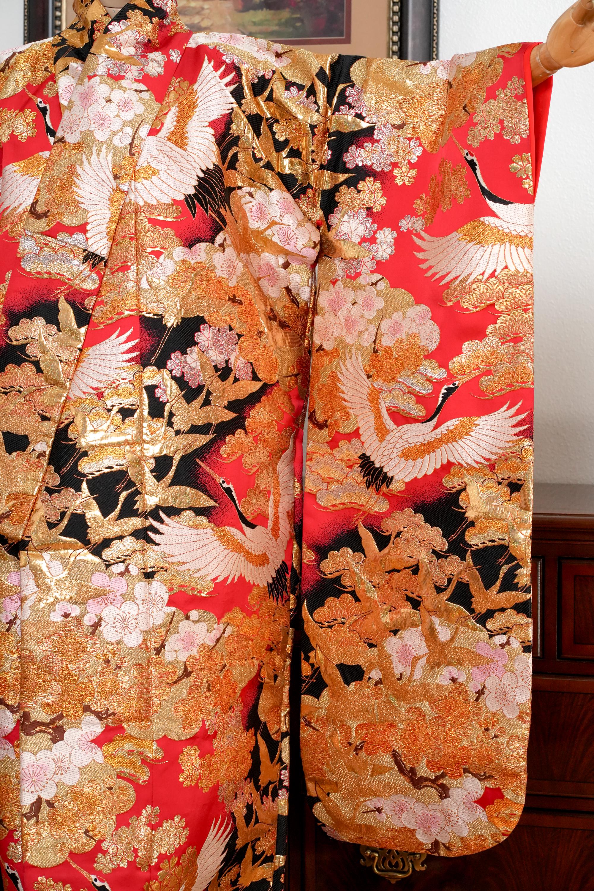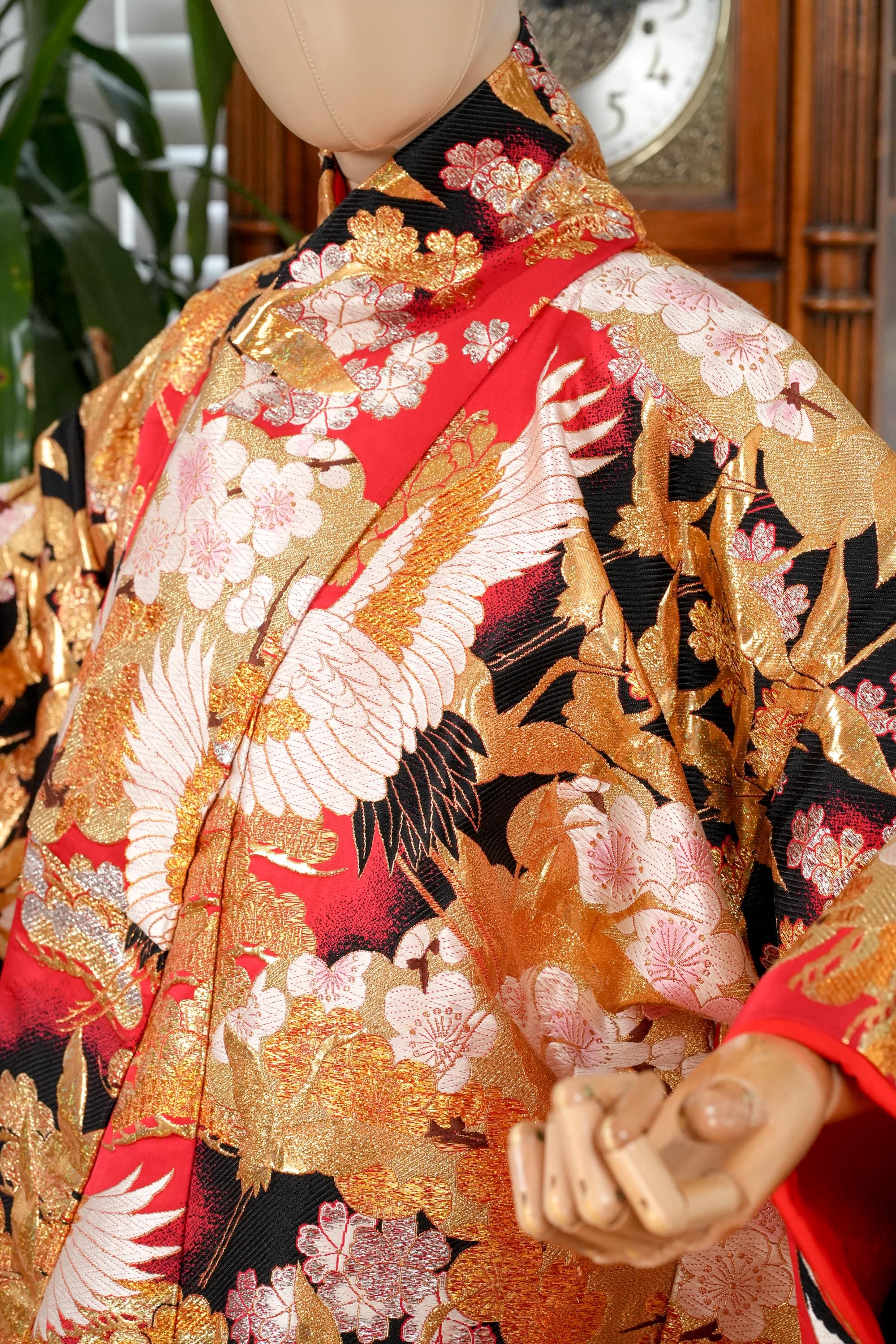 Uchikake is a bridal kimono worn at Japanese traditional wedding ceremony. It is thickly padded, stylishly designed with rich patterns and generally weighs quite heavy. Uchikake is the most luxurious Kimono of all and it comes with extended length and heavily padded hem. Uchikake is normally worn over Kakeshita as an outer wedding Kimono.