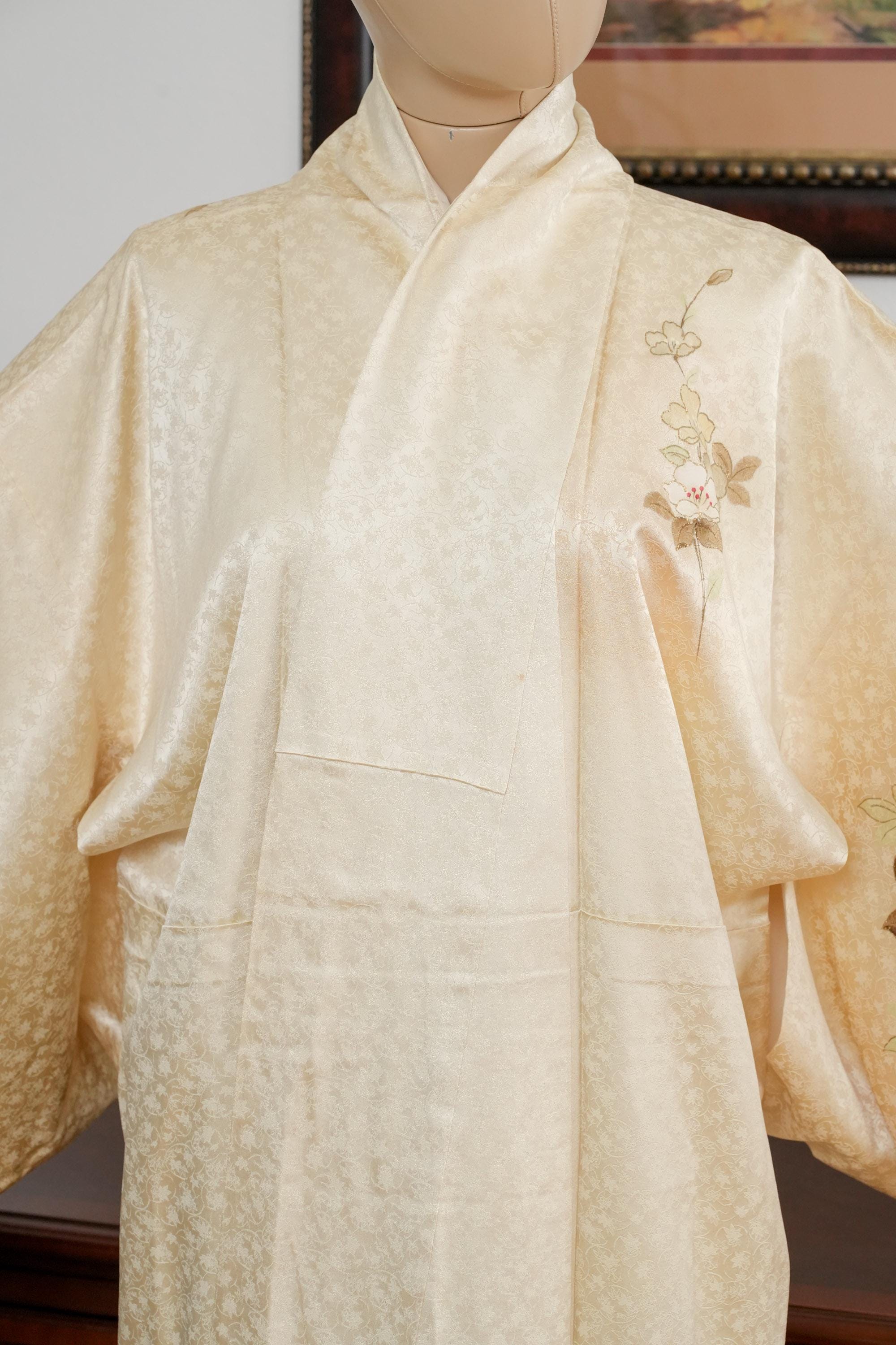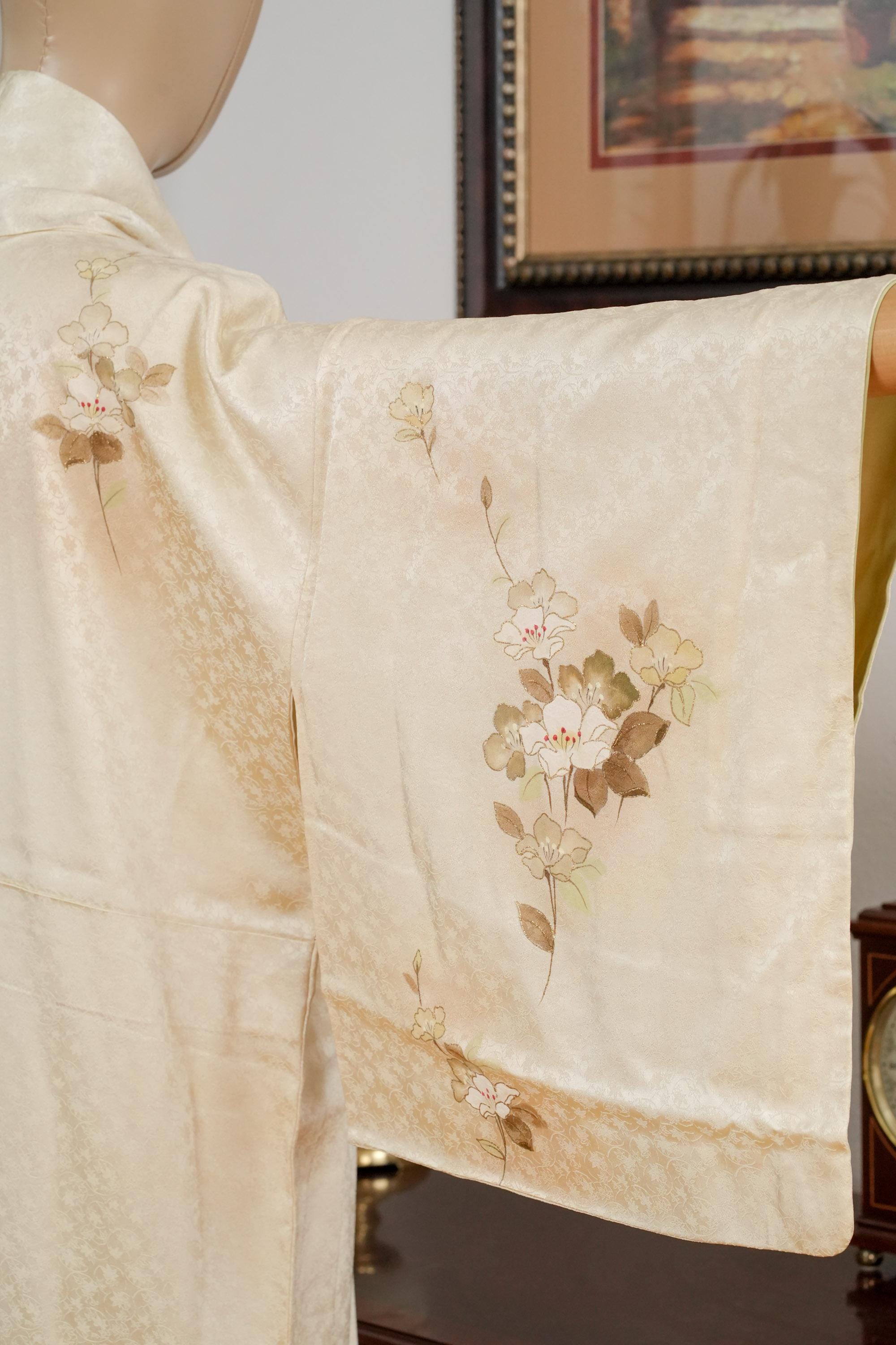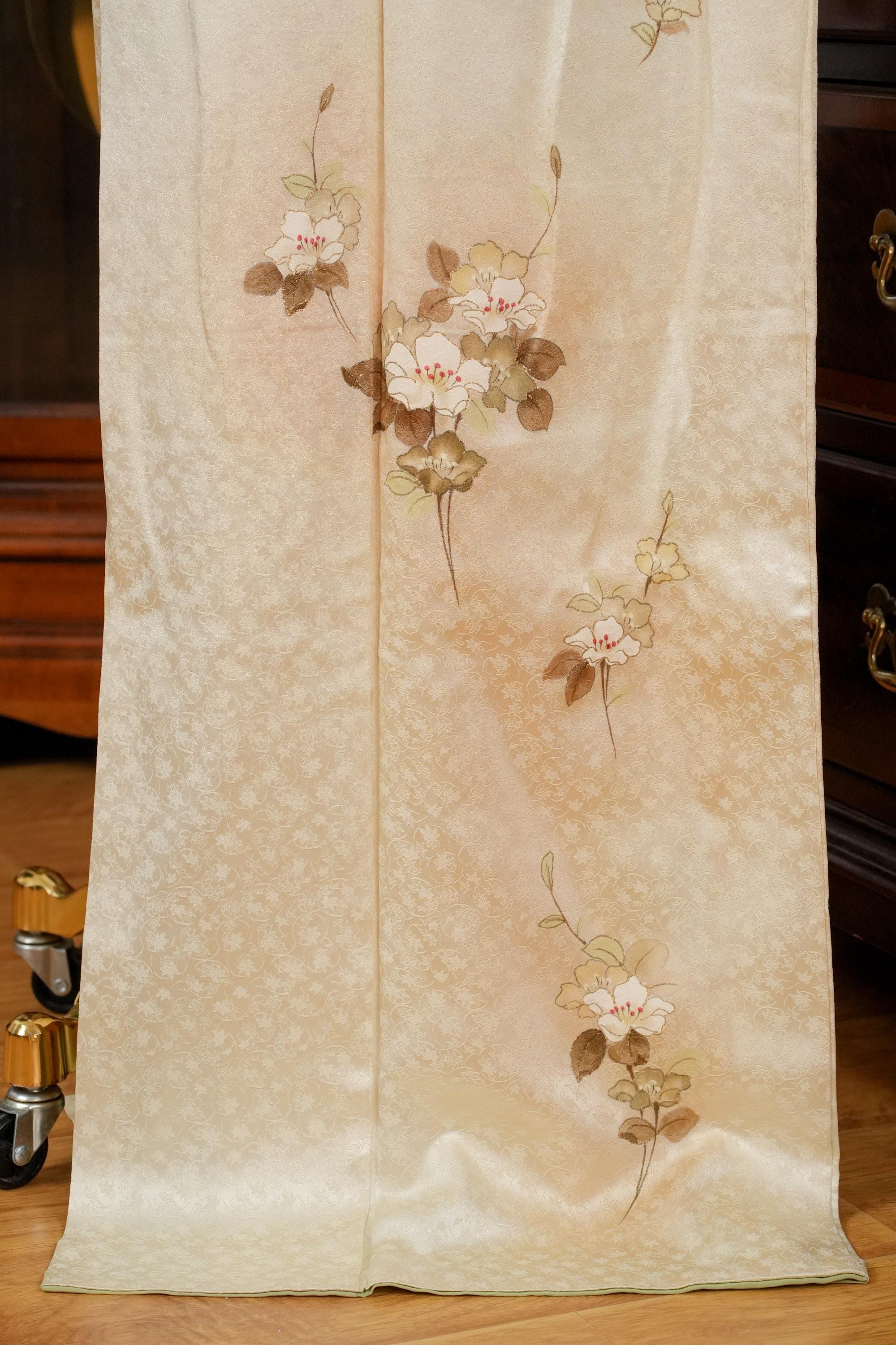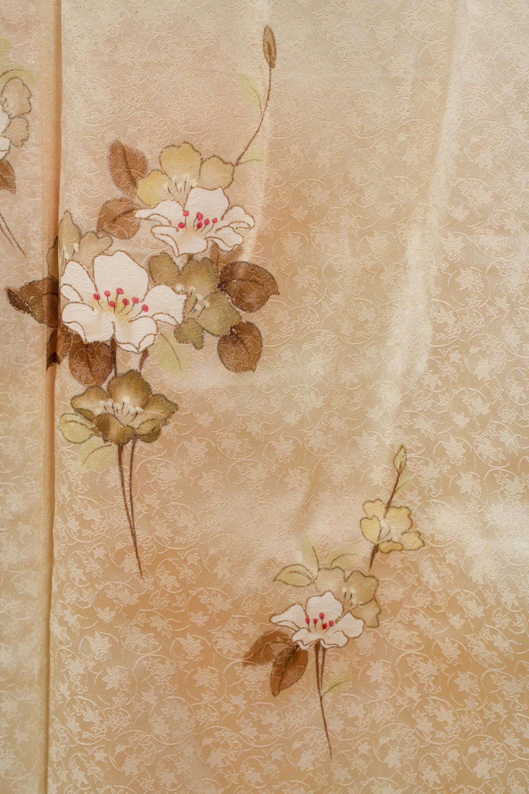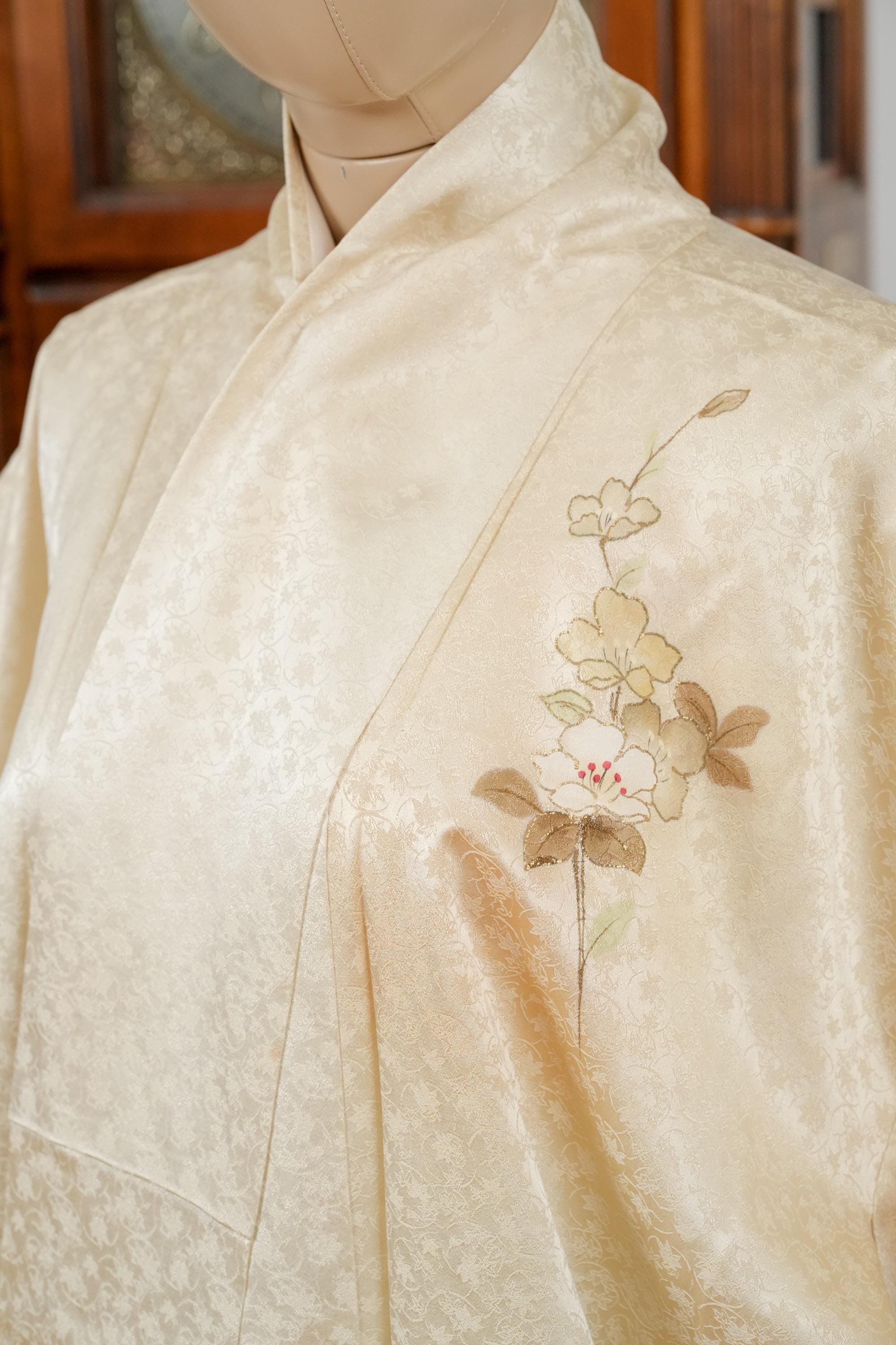 Homongi is a high-class formal Kimono for official visits that became very popular in Meiji period among upper-class females. It is commonly worn as a festive garment for ceremonies and parties by both married and unmarried women. Linked patterns on the chest, shoulder, sleeves and family crests are distinct characteristics of Homongi Kimono.