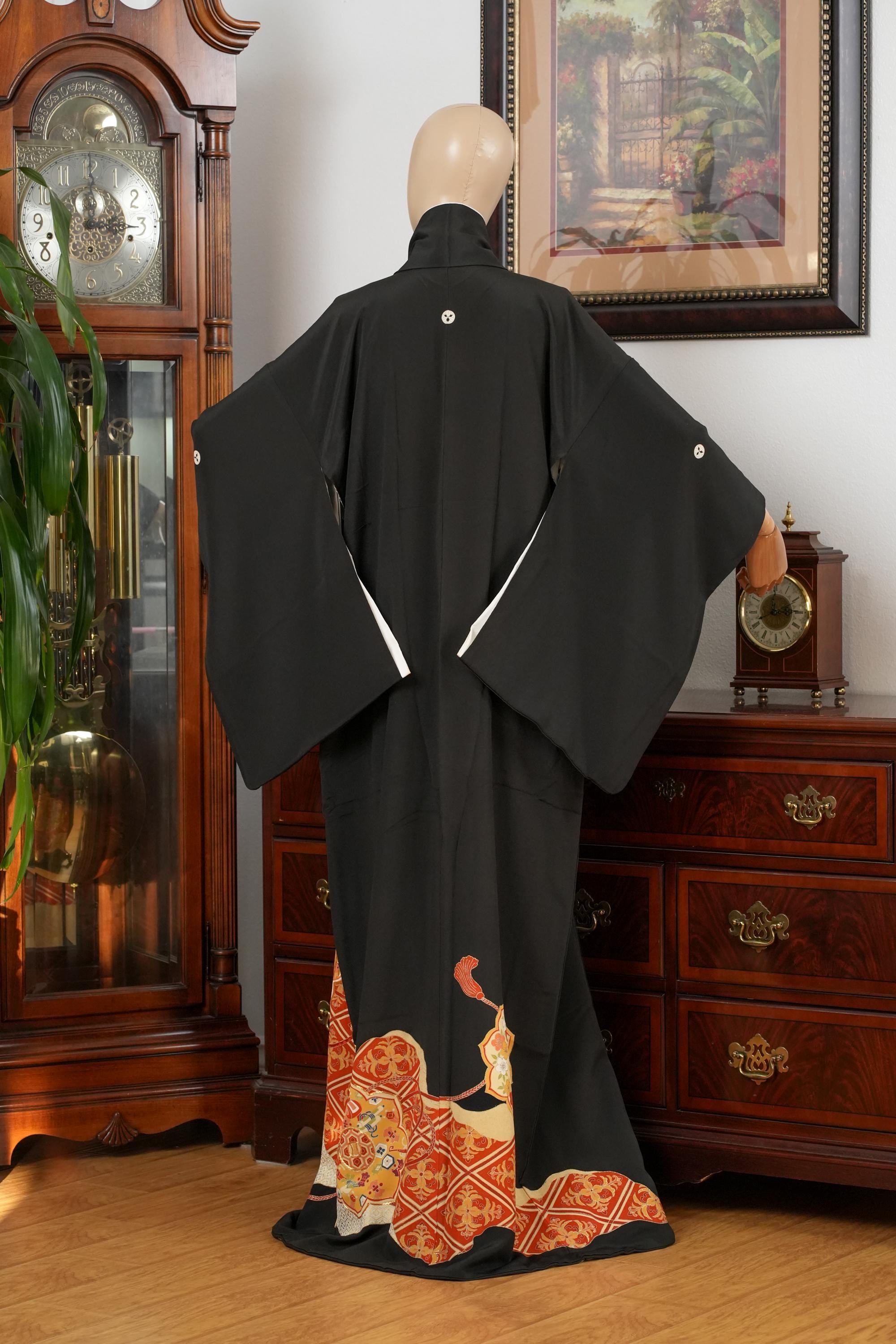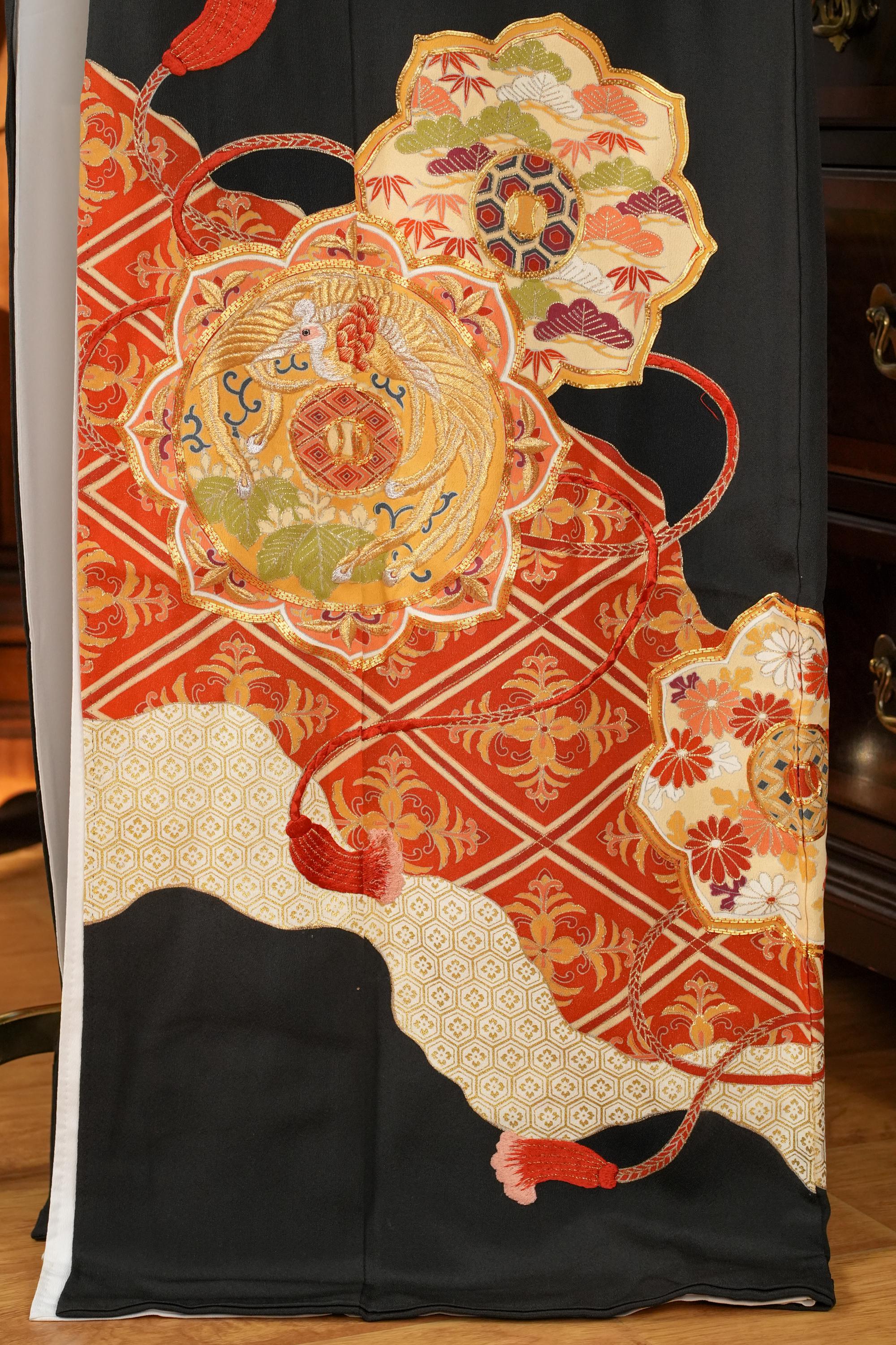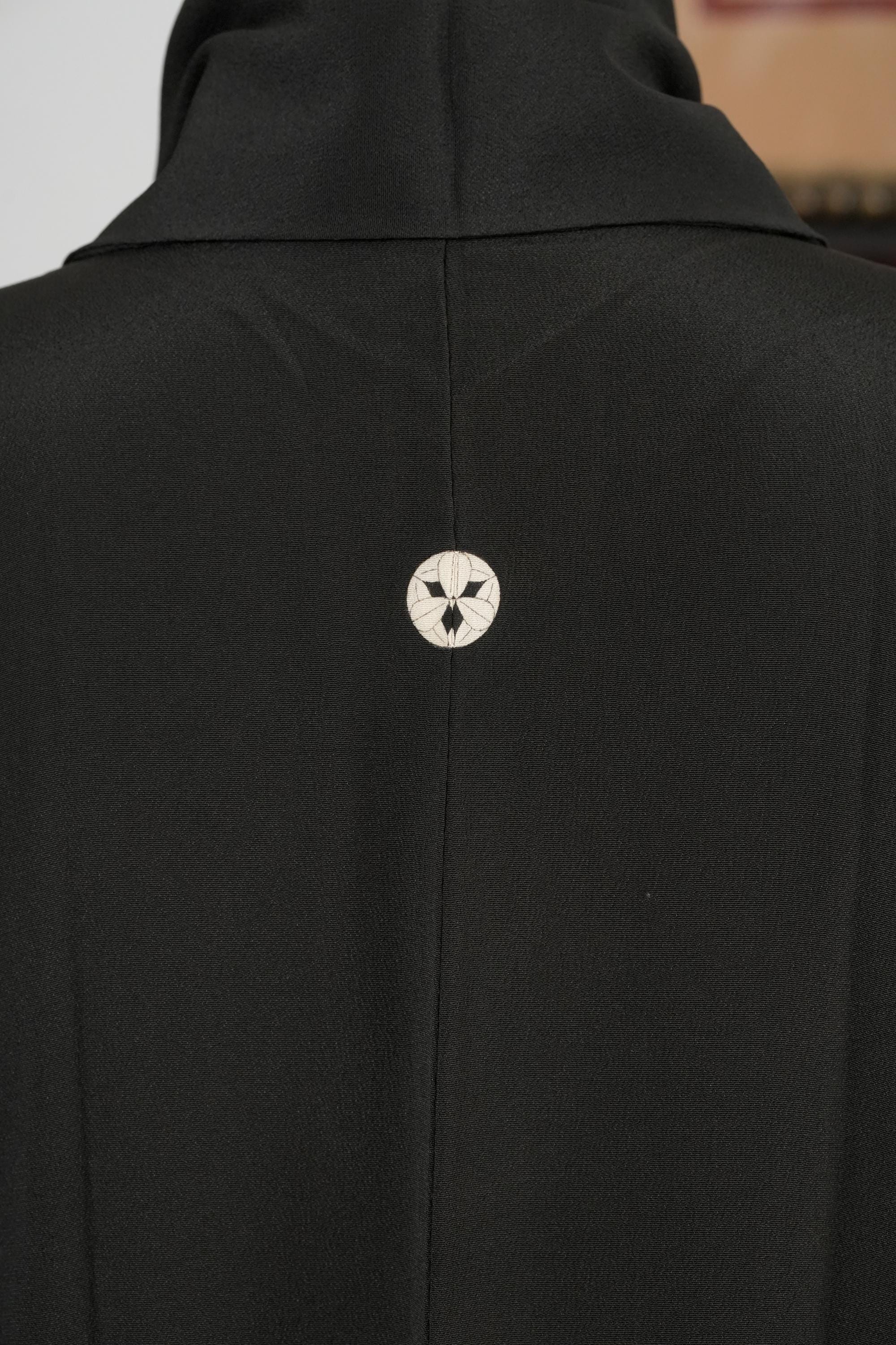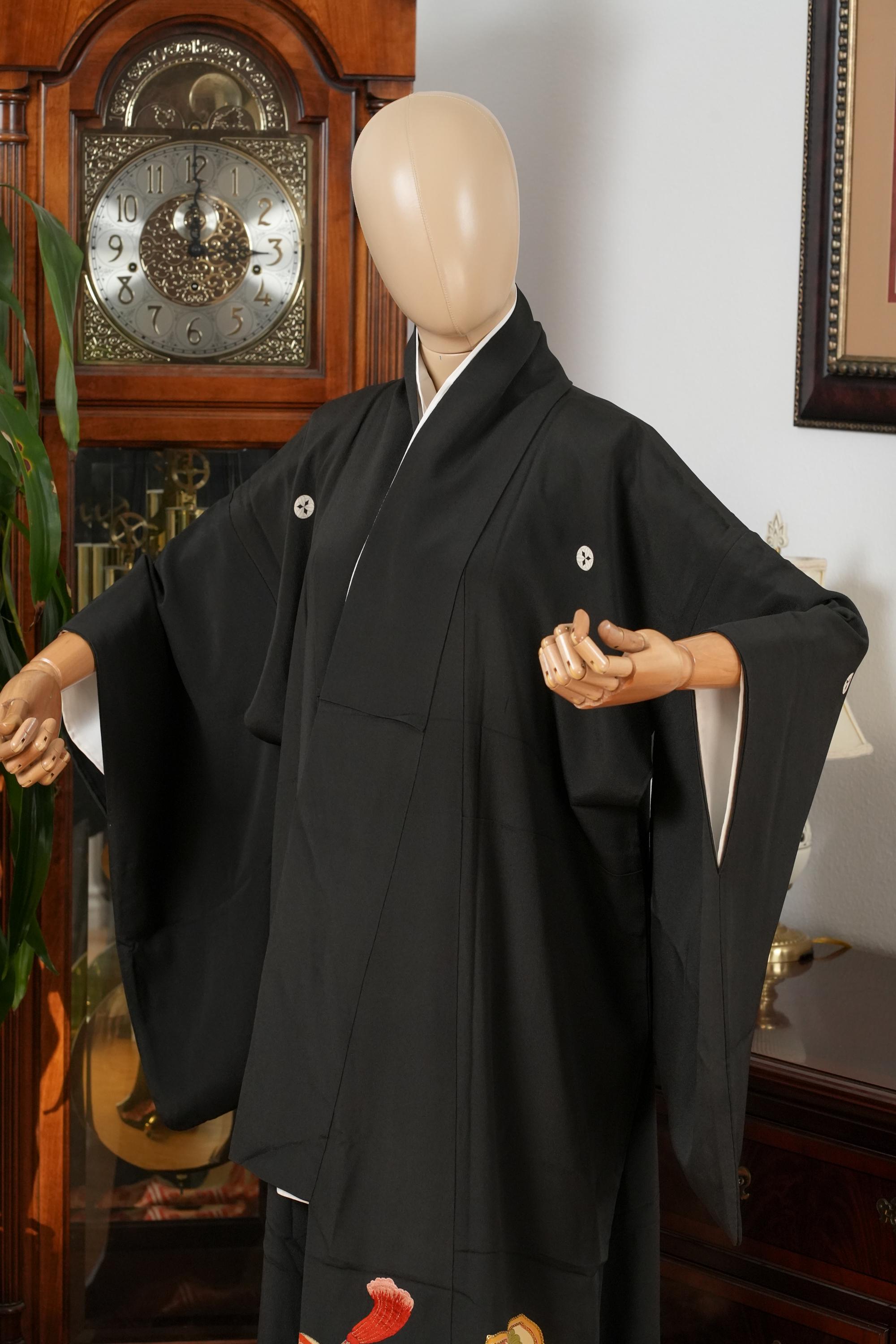 Tomesode is the most formal, high class Kimono for all ceremonies and occasions. Black ones are worn by married women and colored ones are worn by both married and unmarried women. Distinct characteristics of Tomesode are family crests and surrounding patterns around the hem. Numbers of family crests specify formality and rank.