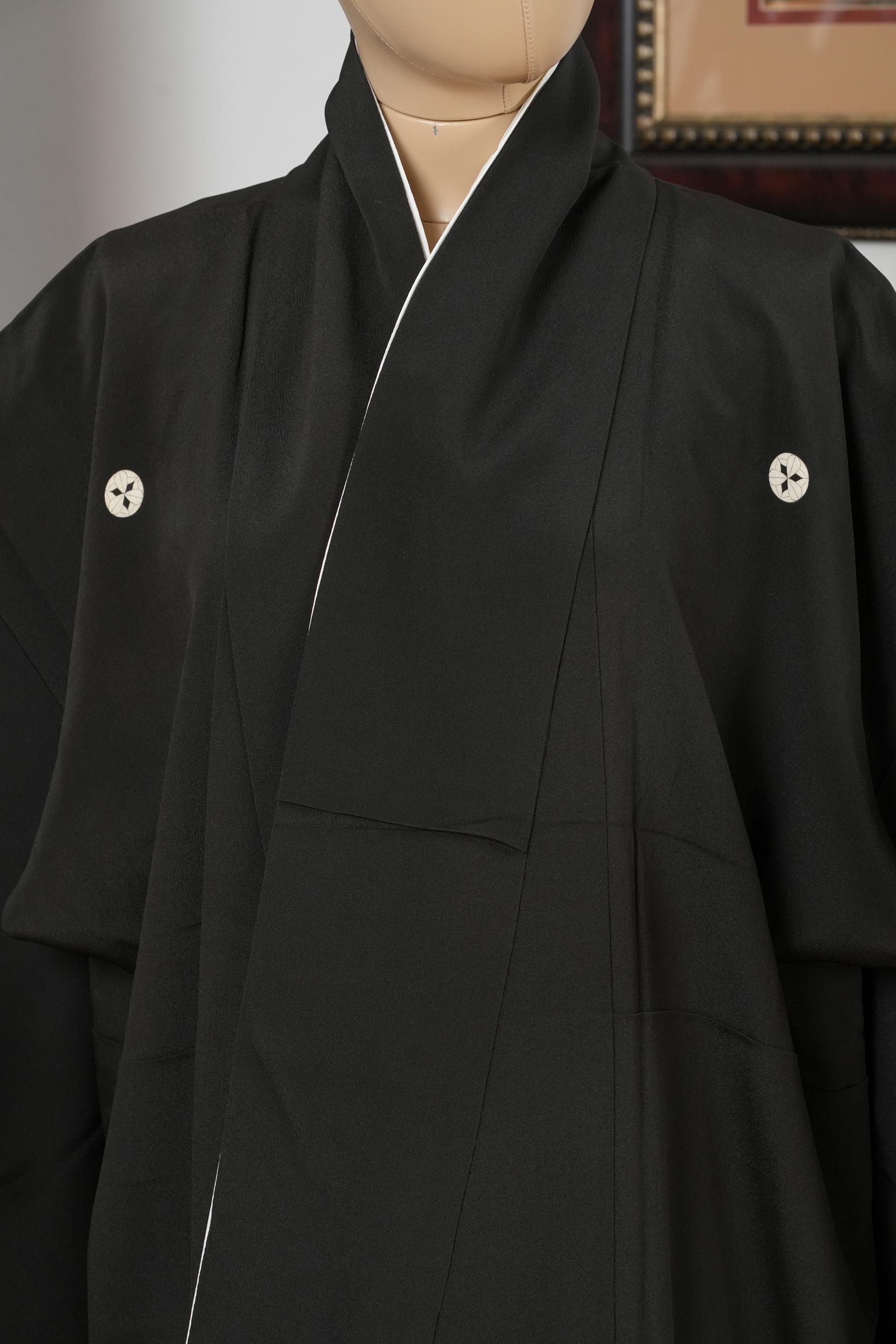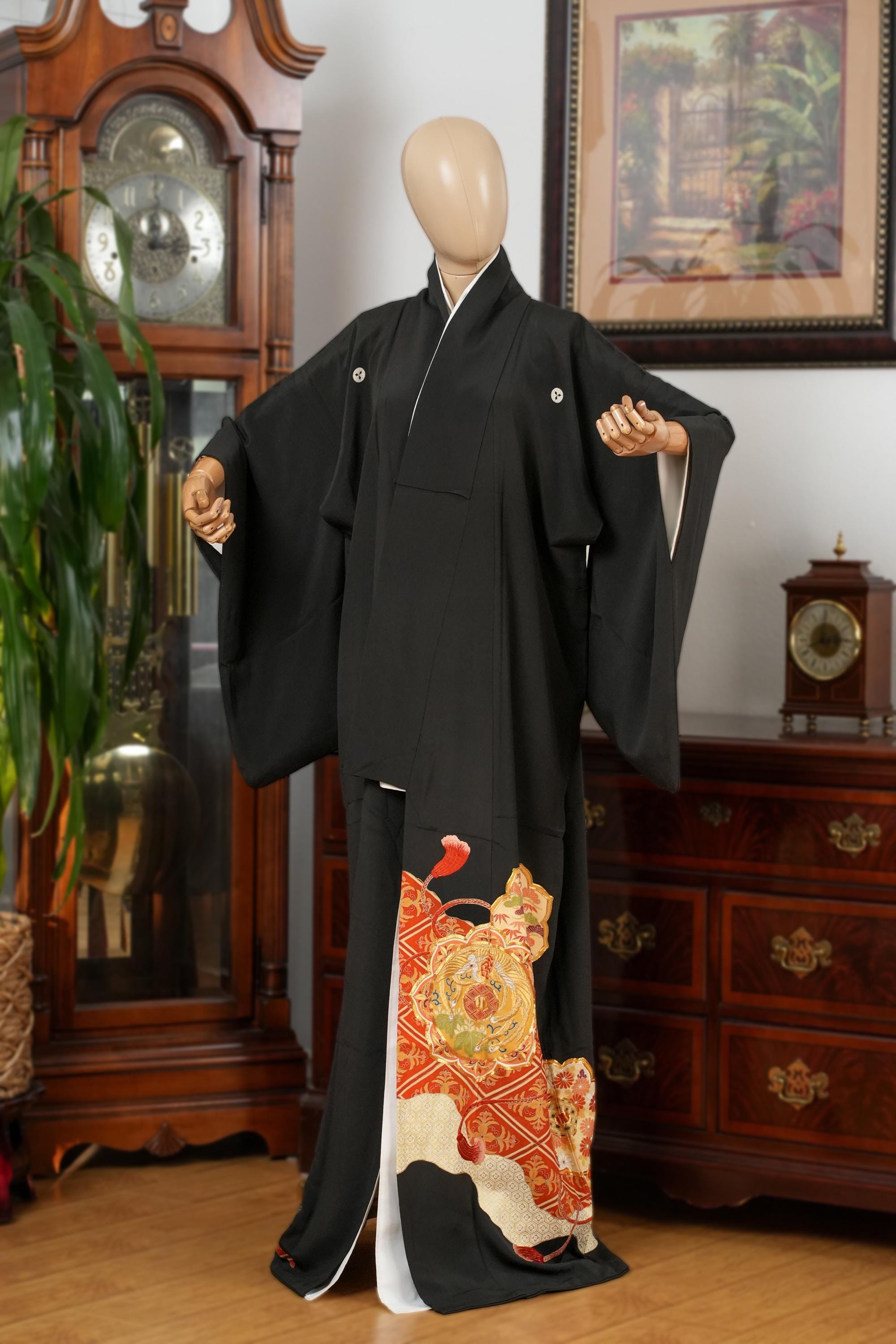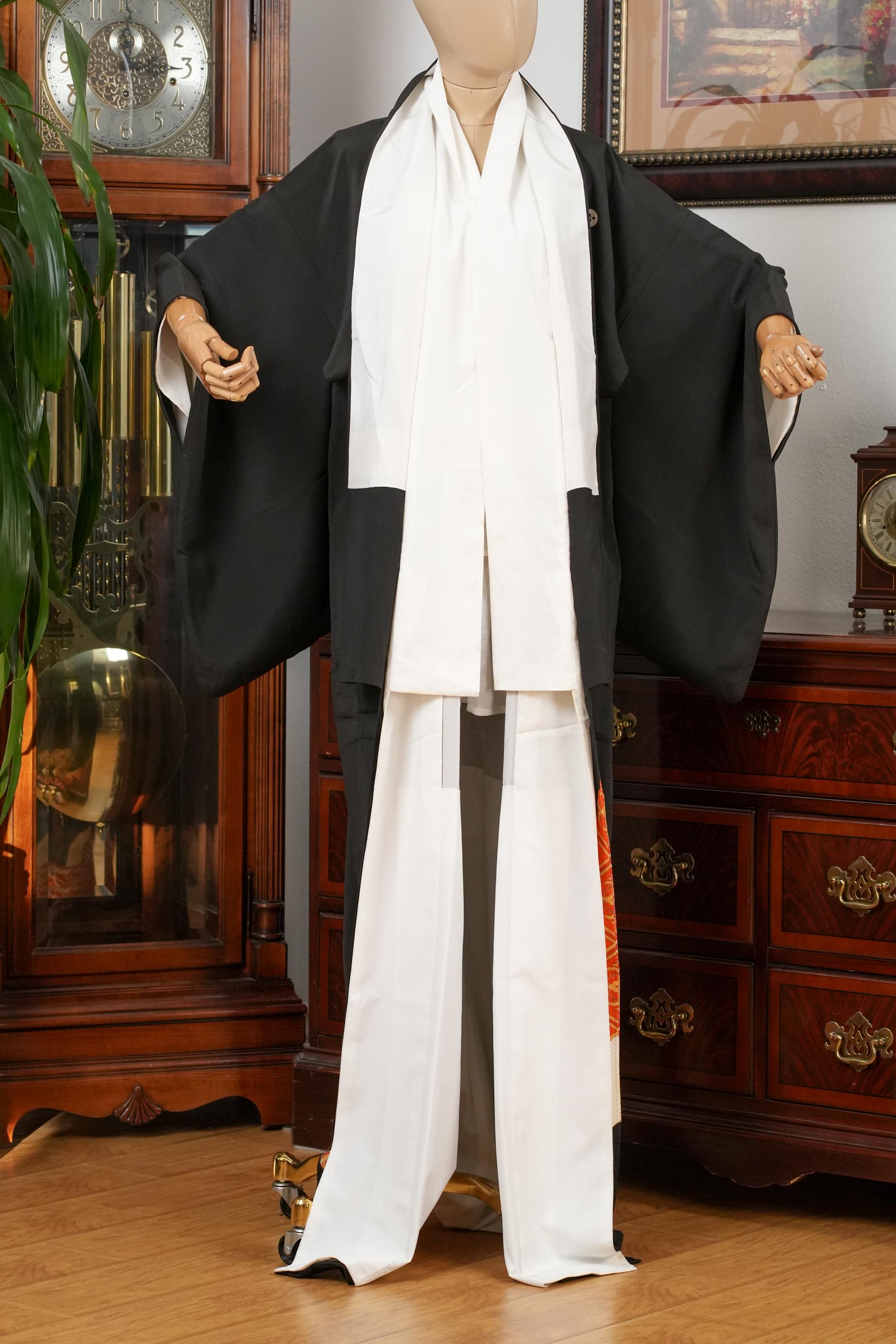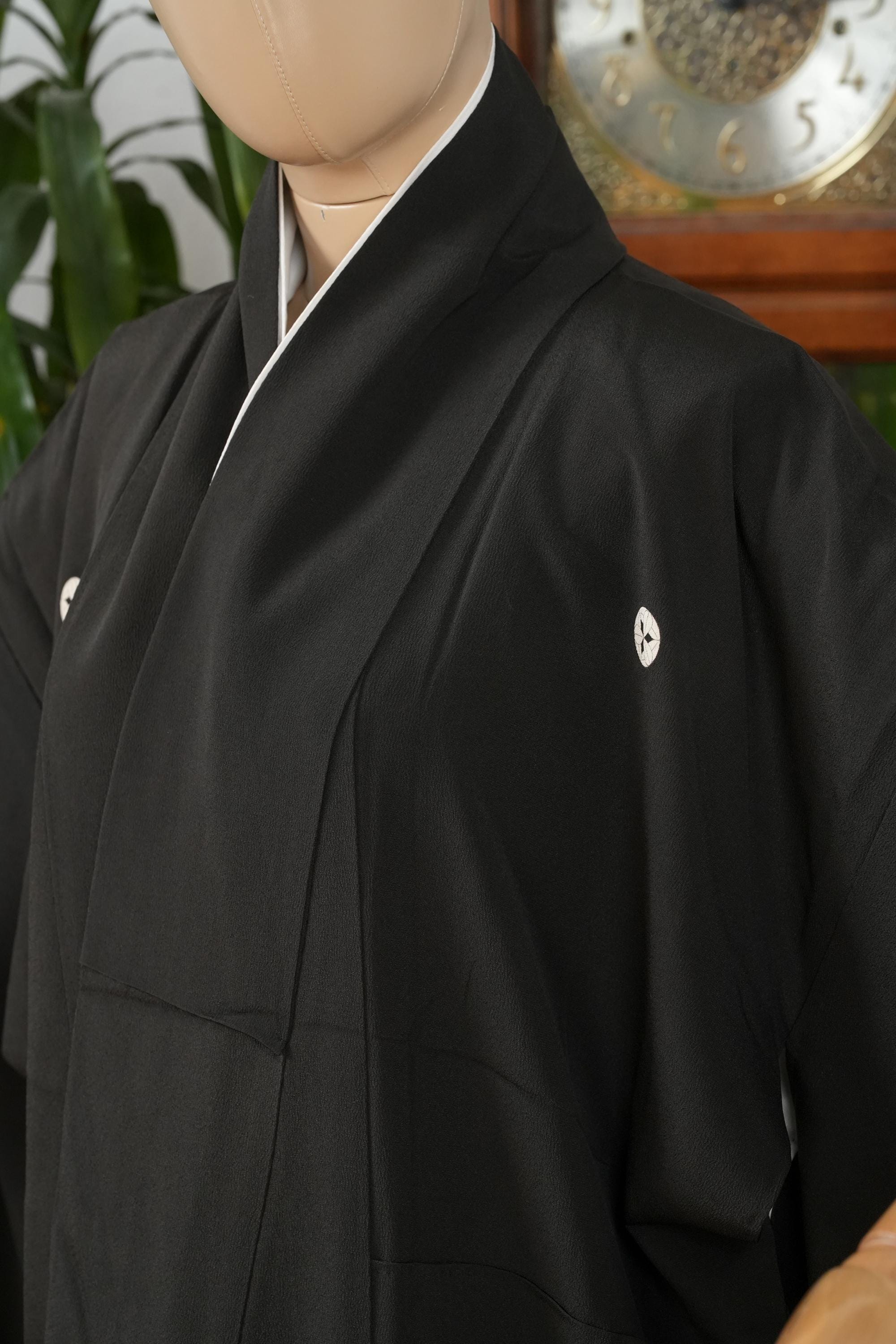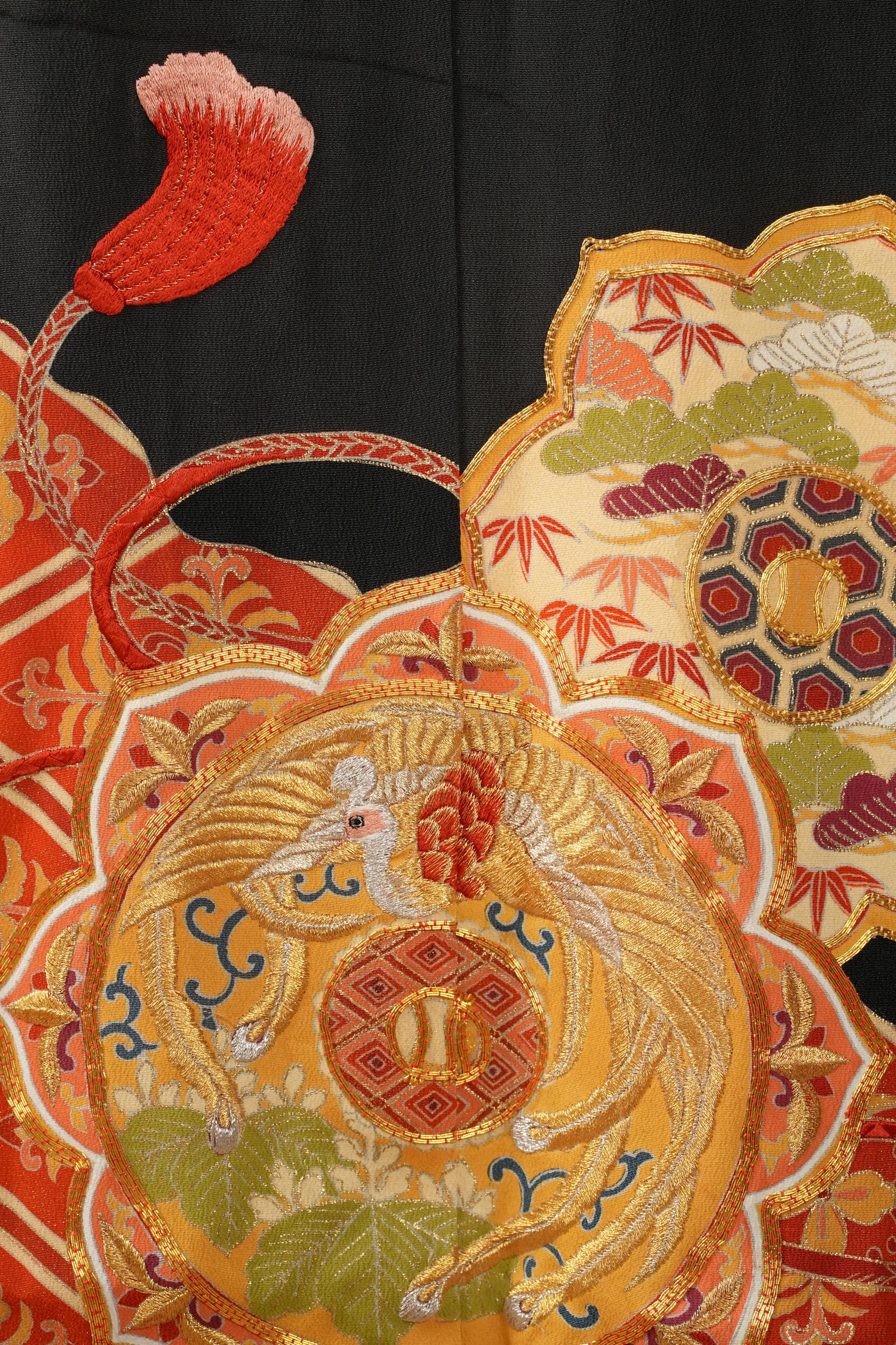 Tomesode is the most formal, high class Kimono for all ceremonies and occasions. Black ones are worn by married women and colored ones are worn by both married and unmarried women. Distinct characteristics of Tomesode are family crests and surrounding patterns around the hem. Numbers of family crests specify formality and rank.