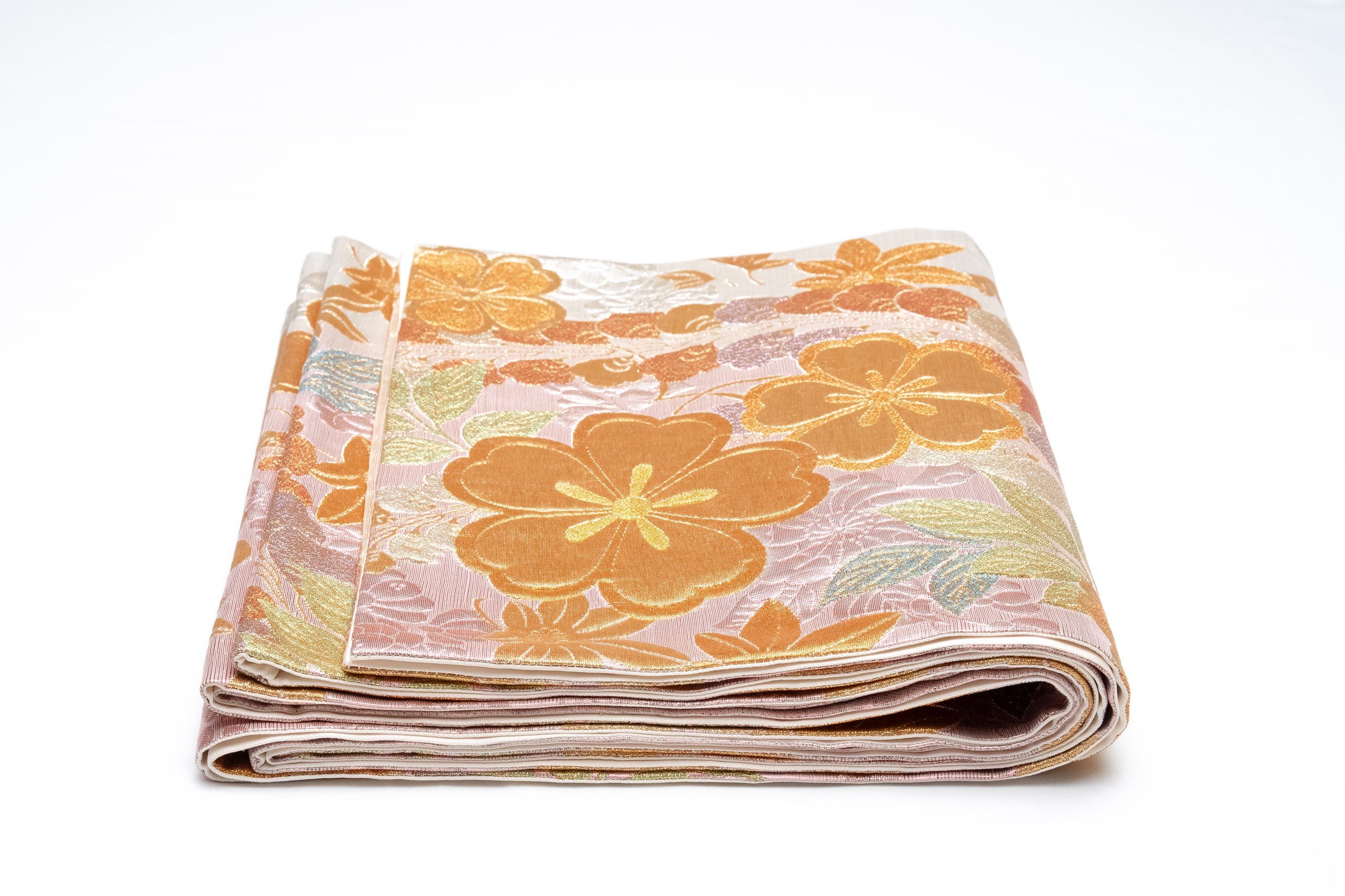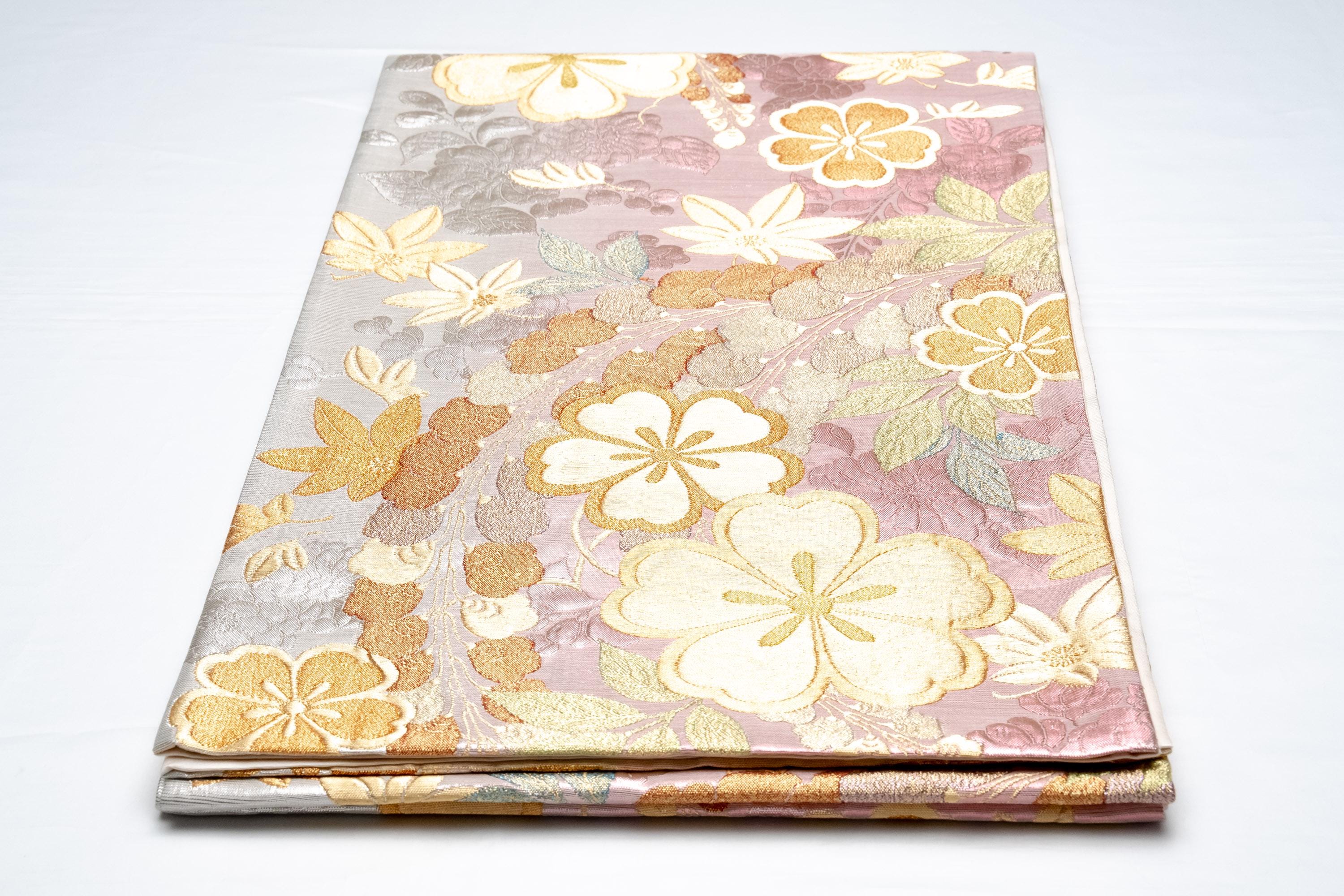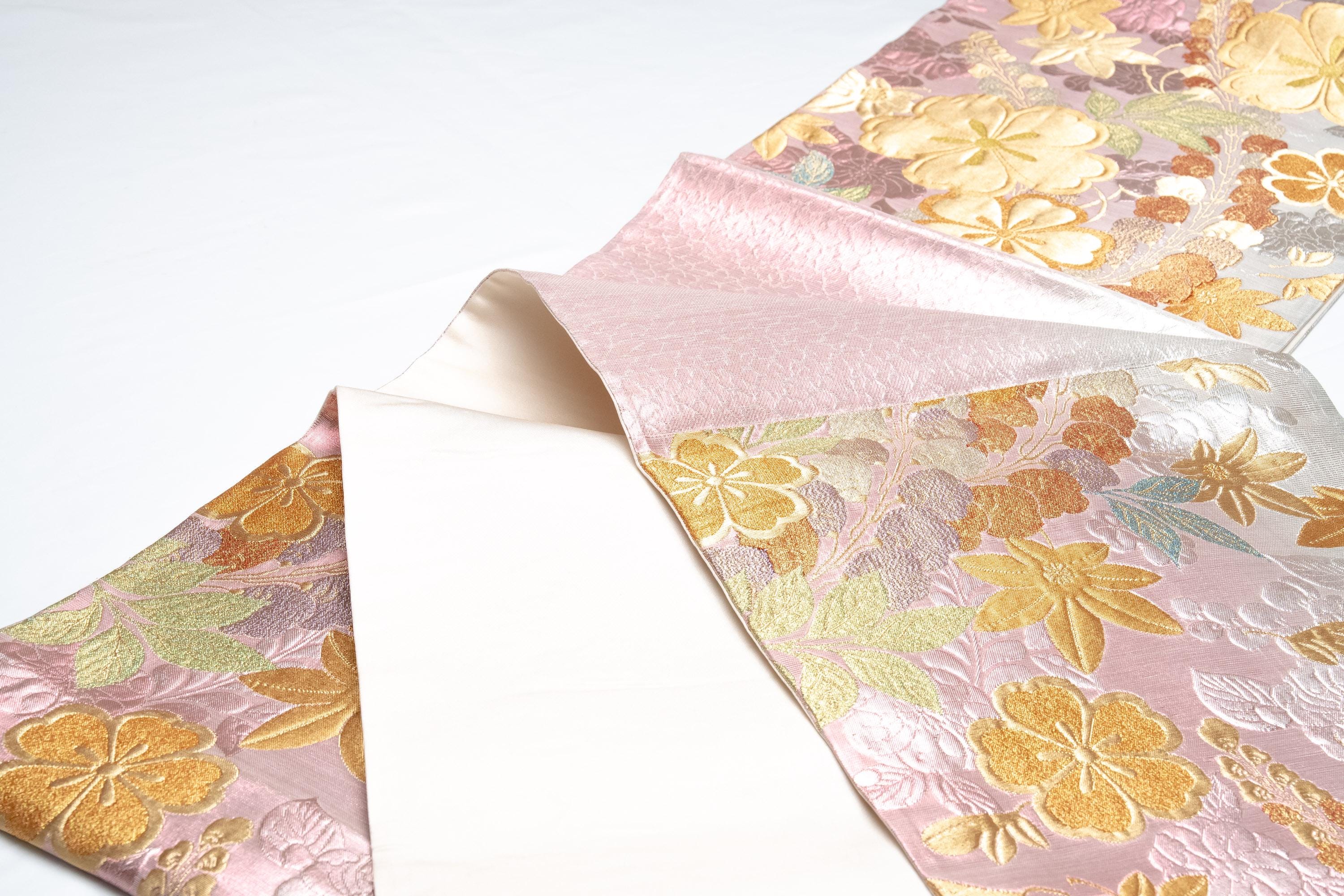 Fukuro Obi is a full-size sash belt that wraps around the torso in women's formal Kimono wearing. It is wider, longer and heavier than other informal Obis and serves the purpose of keeping the Kimono front closed securely, drawing up excess fabric to adjust the length of Kimono, and decorative expressions.