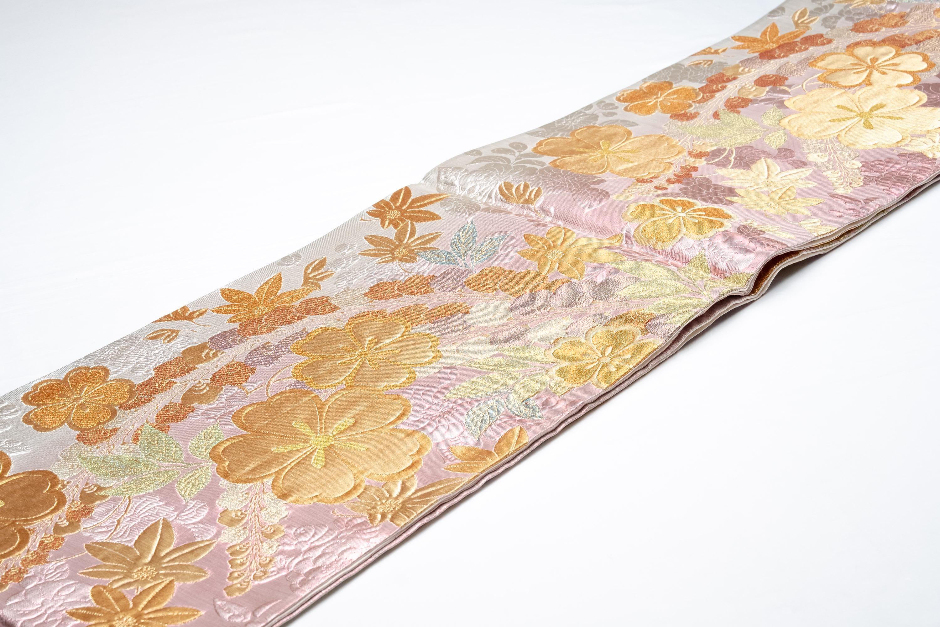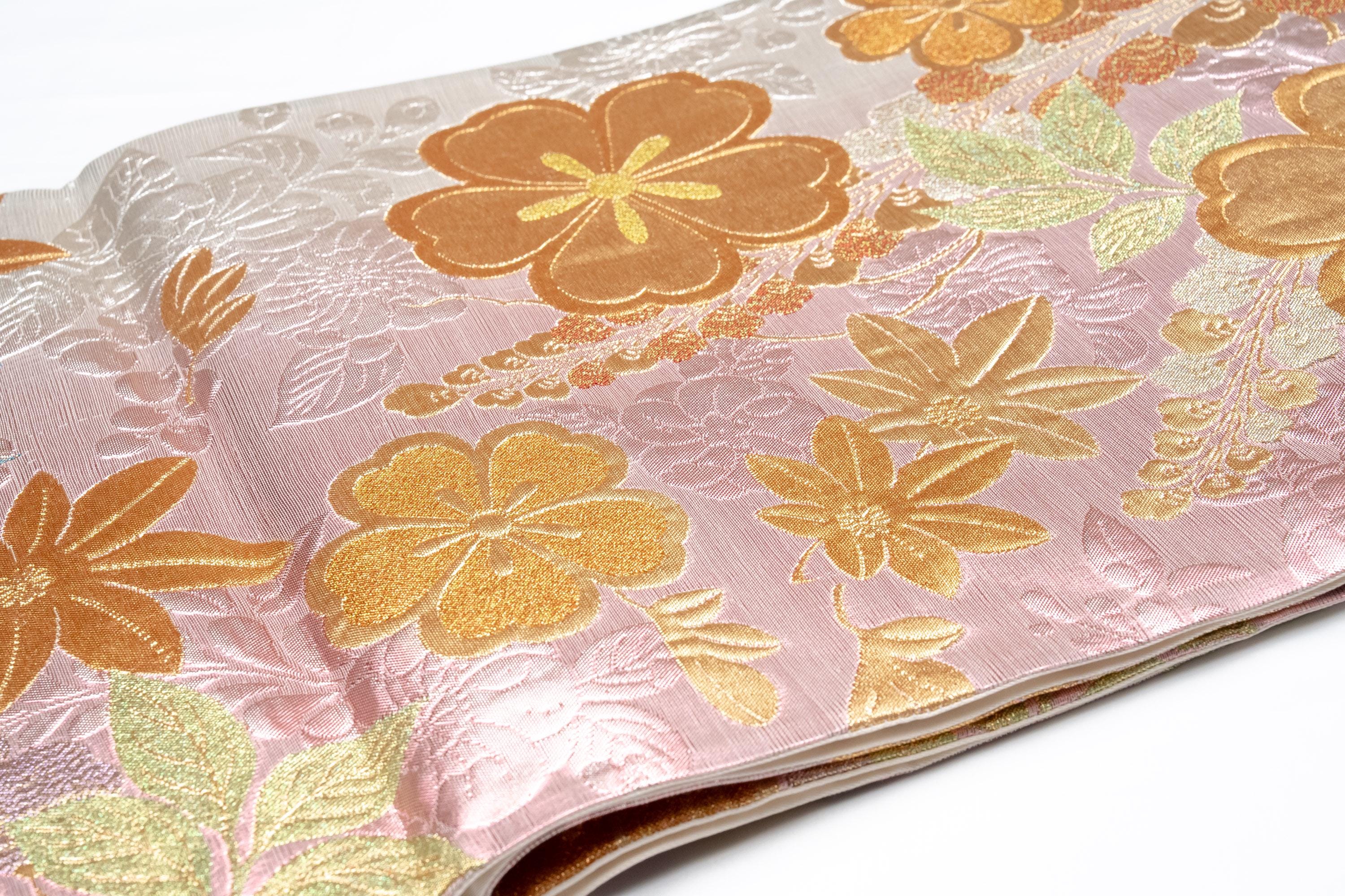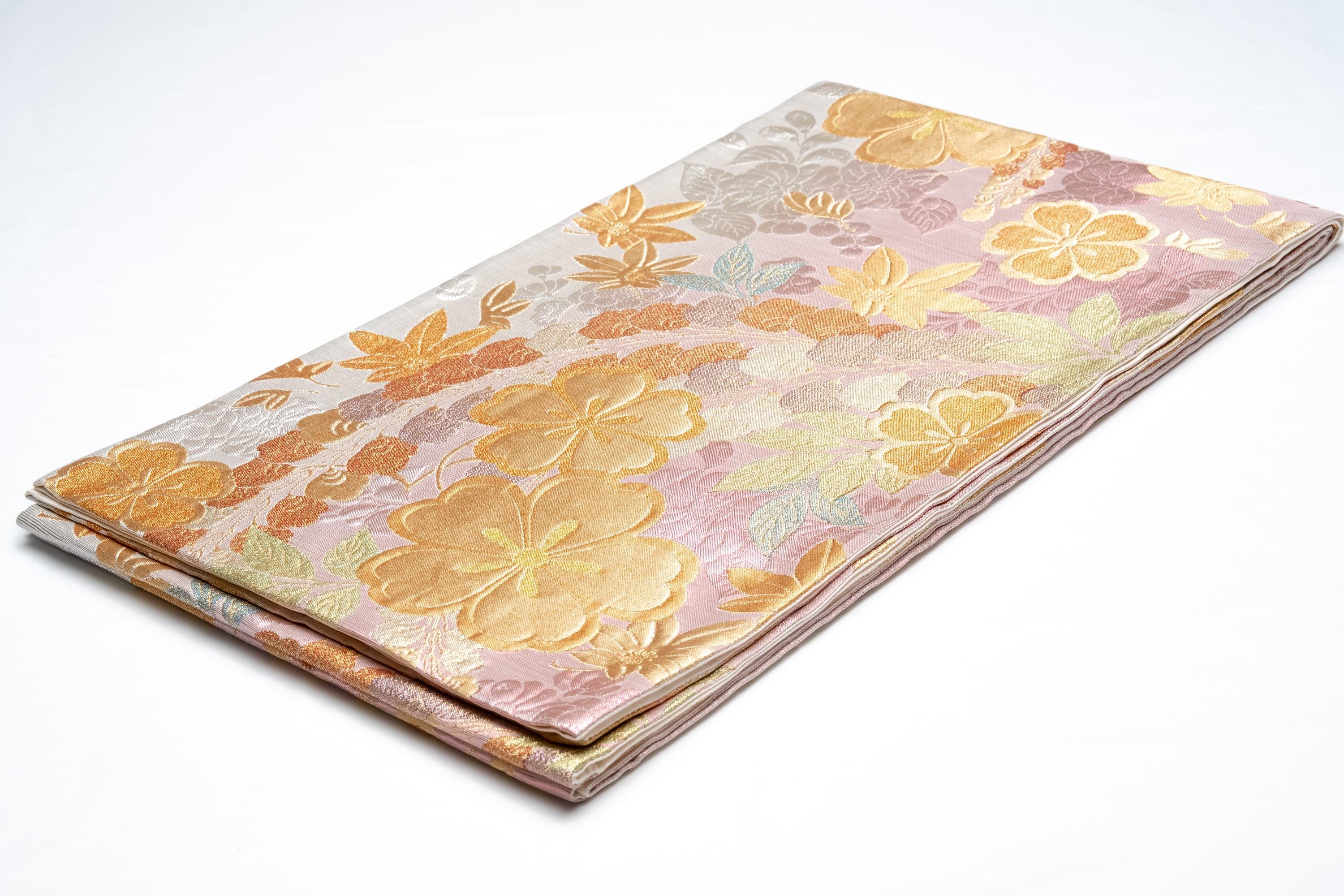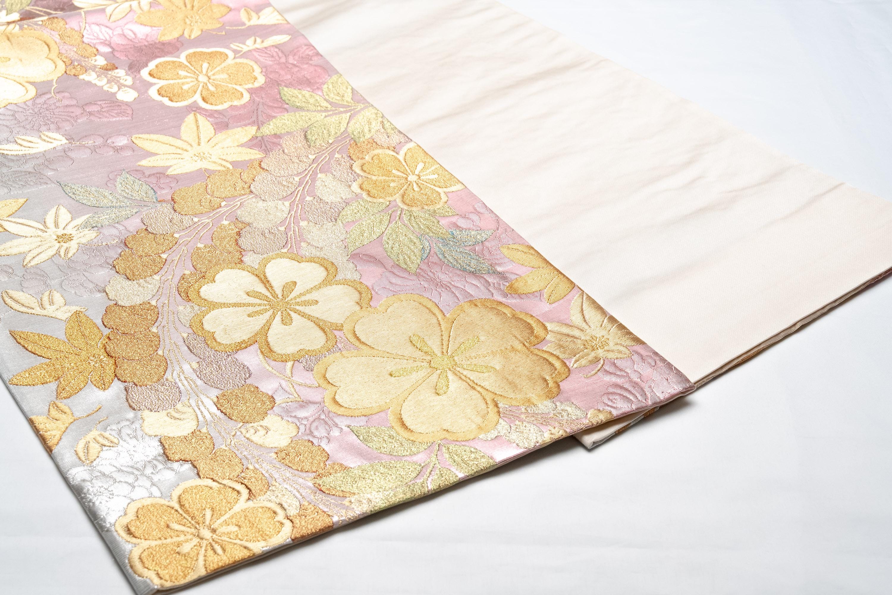 Fukuro Obi is a full-size sash belt that wraps around the torso in women's formal Kimono wearing. It is wider, longer and heavier than other informal Obis and serves the purpose of keeping the Kimono front closed securely, drawing up excess fabric to adjust the length of Kimono, and decorative expressions.