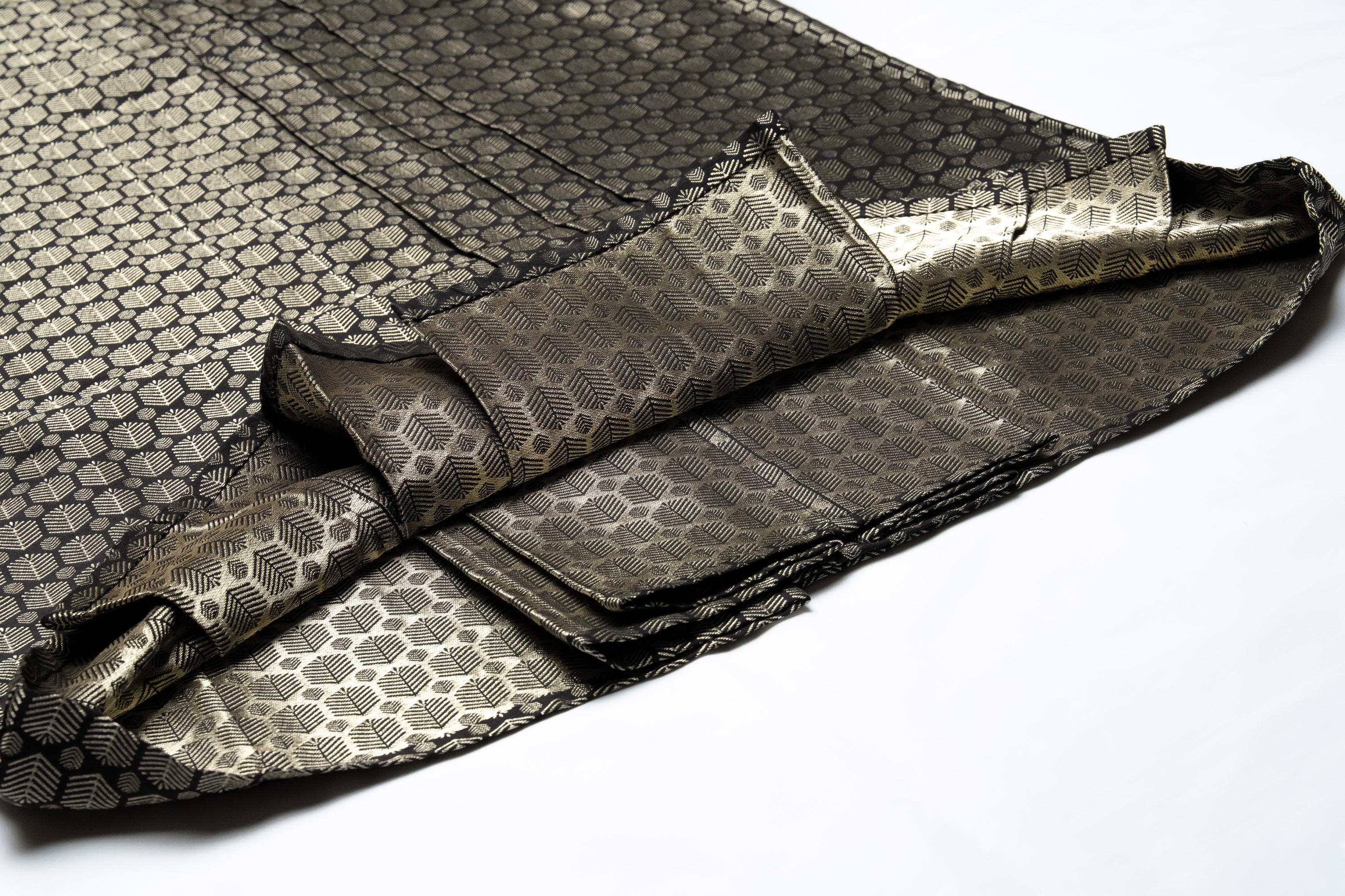 Hakama are wide-legged pants with formal elegance that are typically worn over a kimono or other traditional Japanese garments. Andon Hakama, known as “lantern hakama,” are the skirt type Hakama that features pleats that open outwards, resembling a lantern. Andon Hakama are normally worn for formal occasions, ceremonies, or martial arts demonstrations by men and women equally, while Umanori Hakama are commonly worn by women.