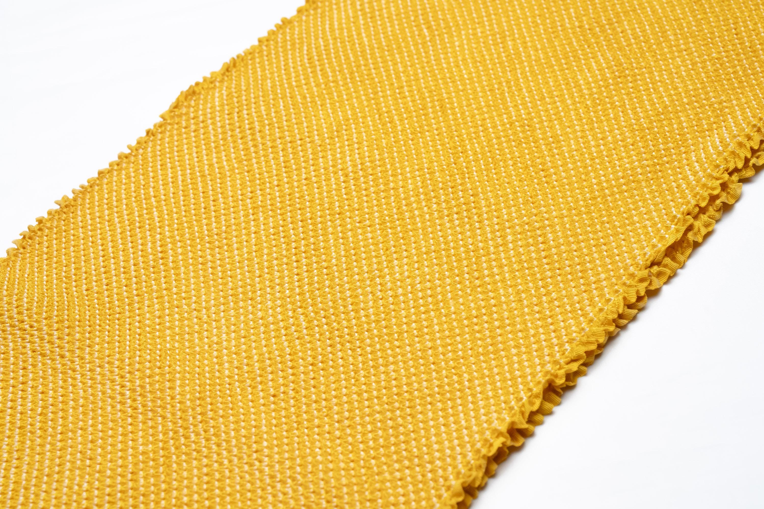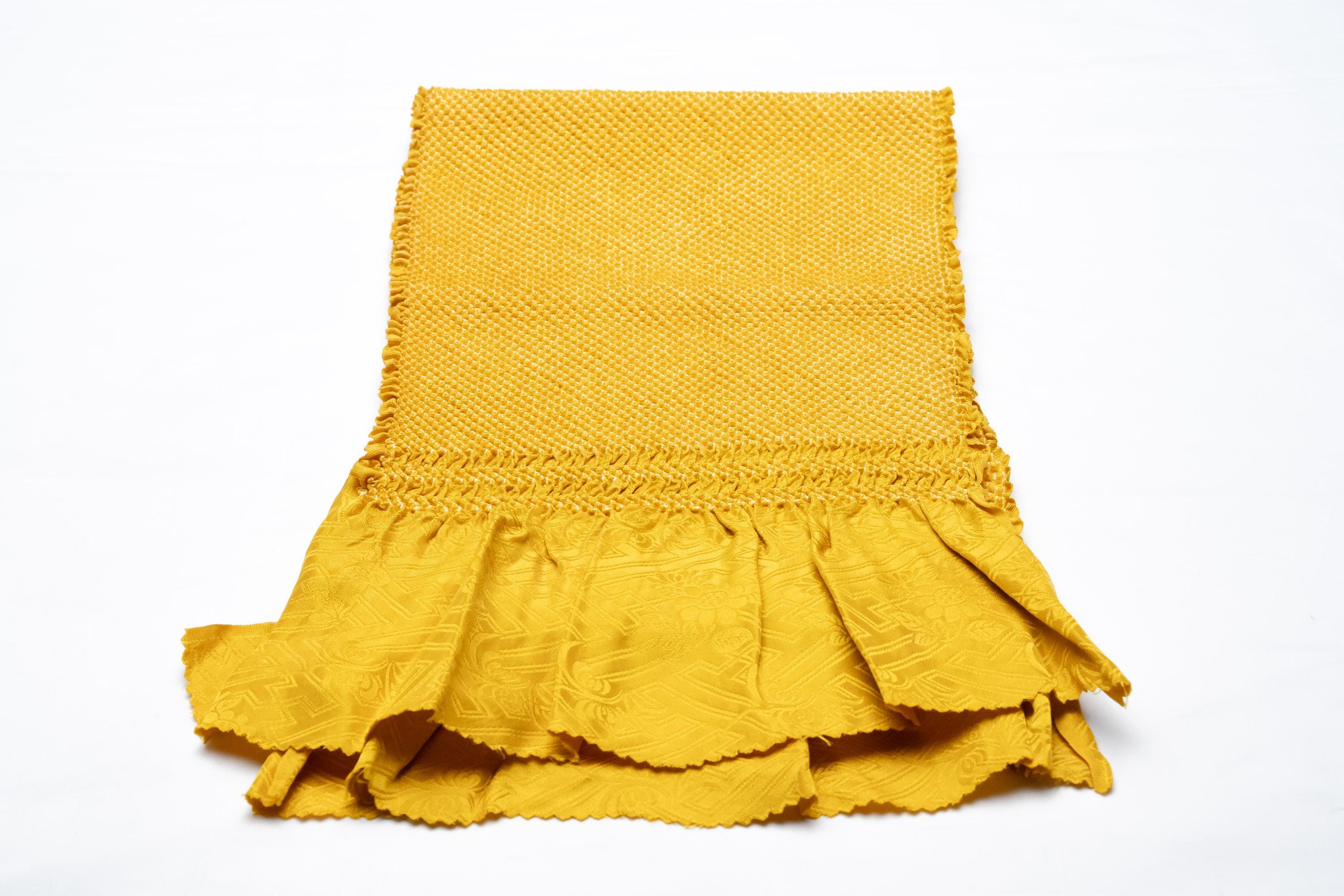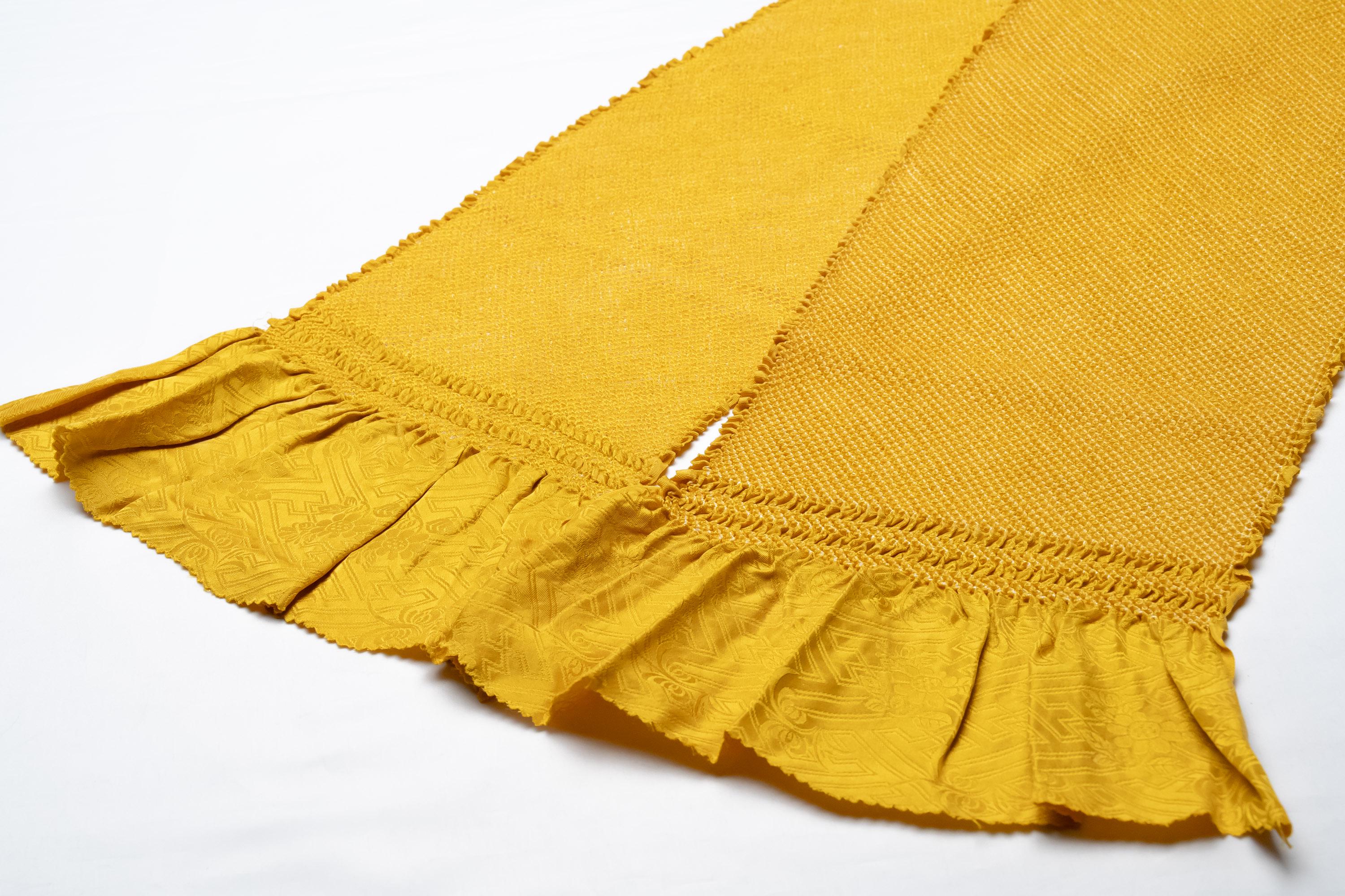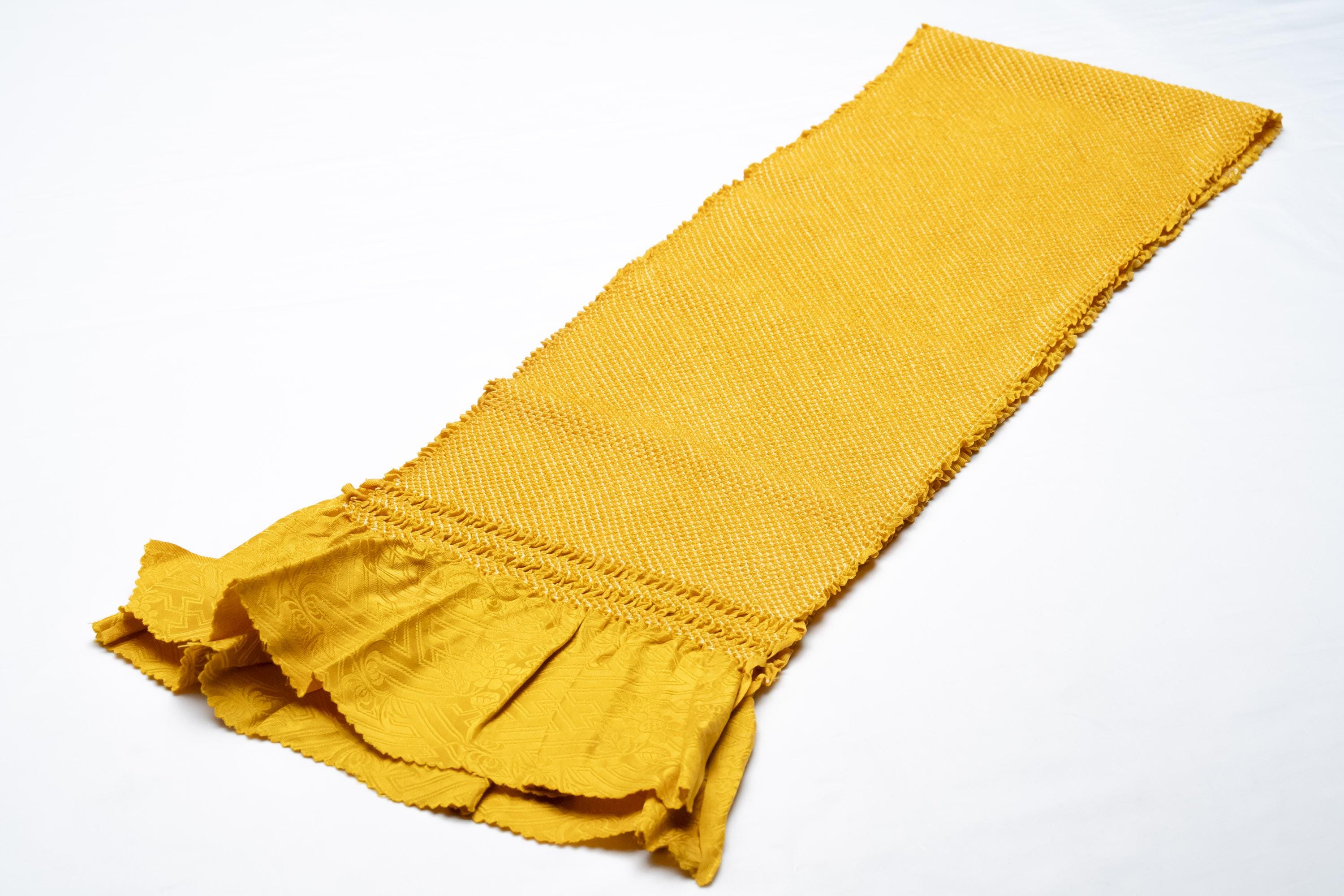 Obiage is a decorative and functional elastic fabric that is being worn above the Obi. It serves the purpose of covering/keeping ObiMakura in place and helping to secure the upper part of Obi knot. Obiage are broadly divided into two different looks/characteristics, a thin scarf-like flat fabric type which are then subdivided into Rinzu, Chirimen, Kinsha and Mofuku, and a thicker scrunchy-like more elastic fabric type which is Shibori.
