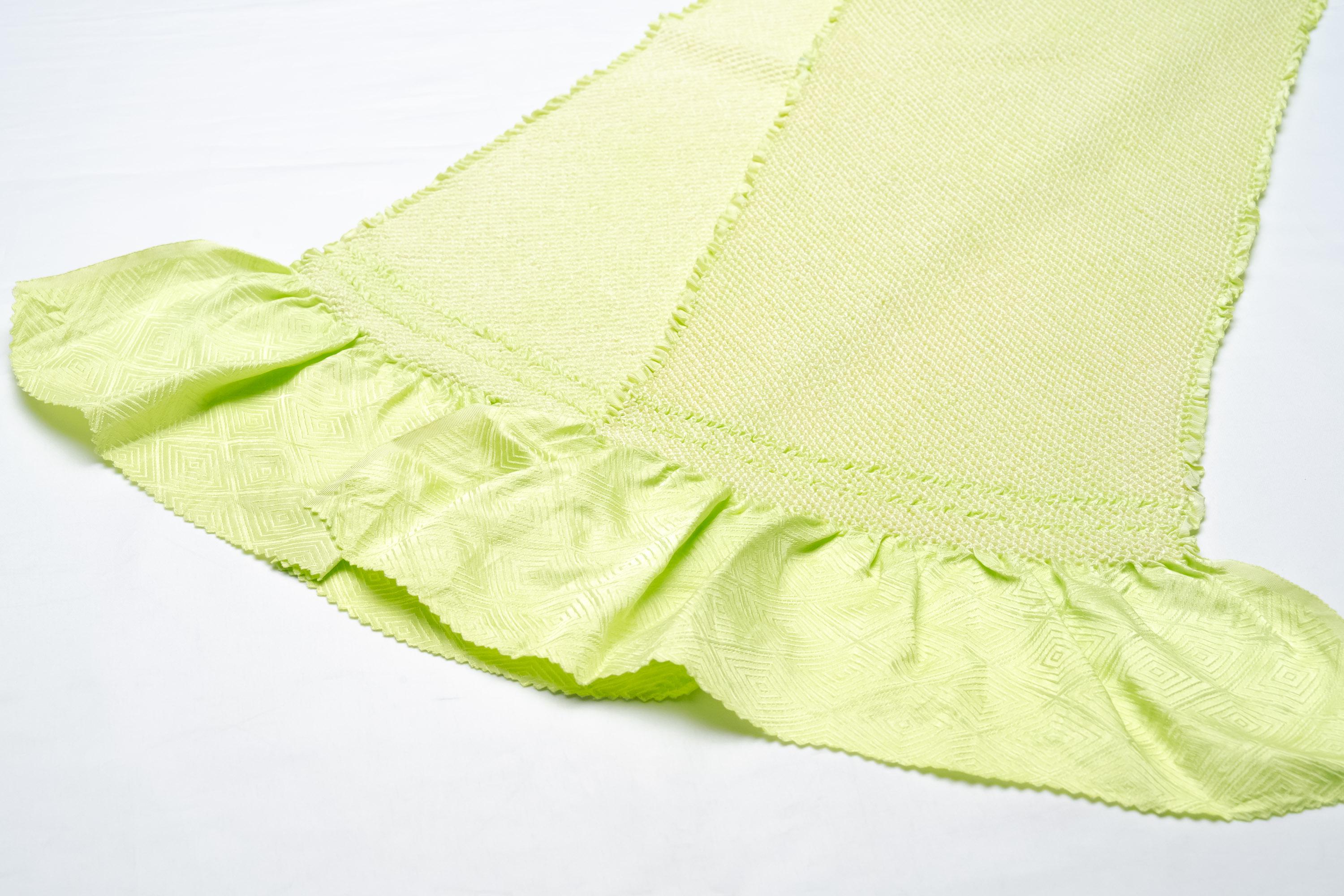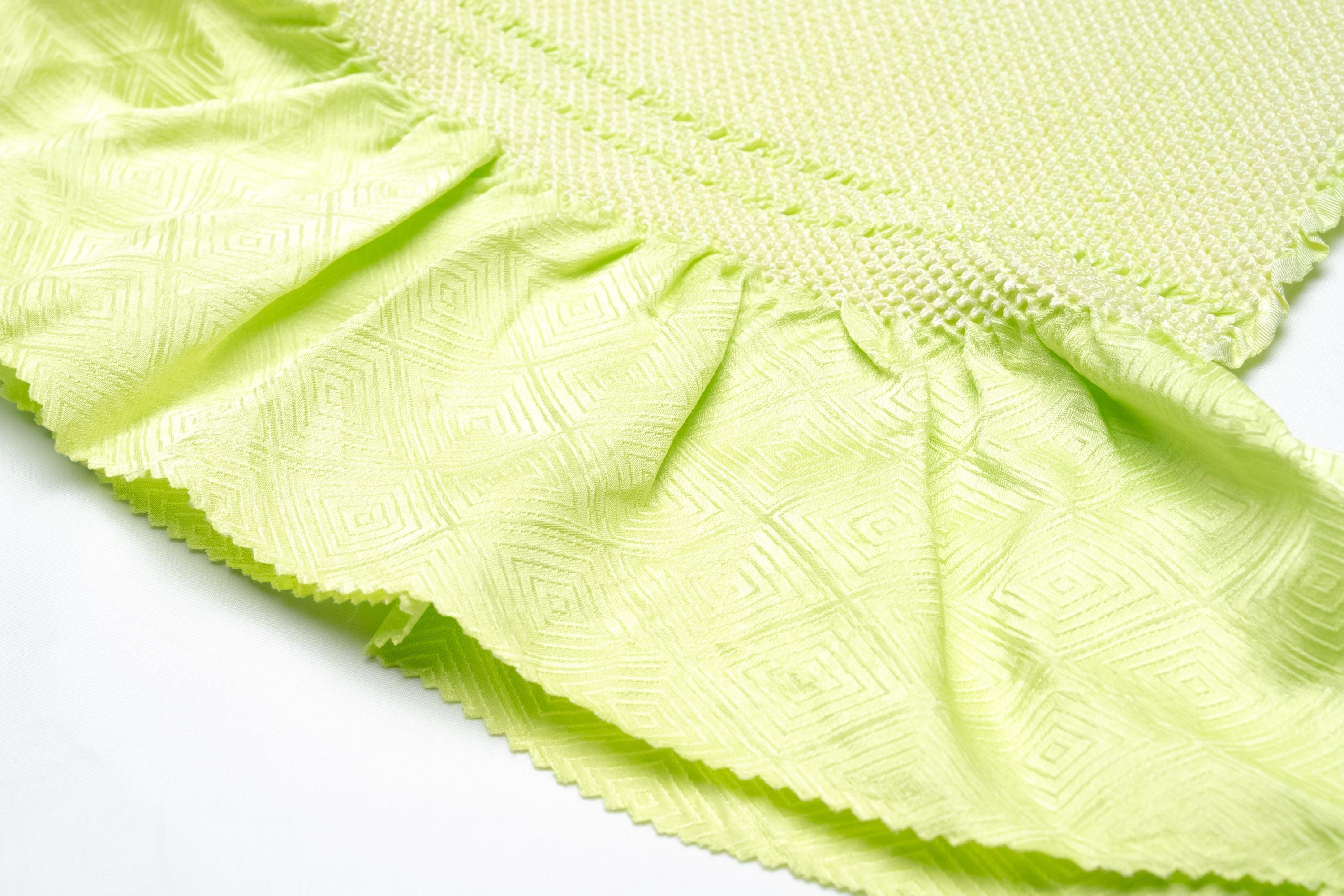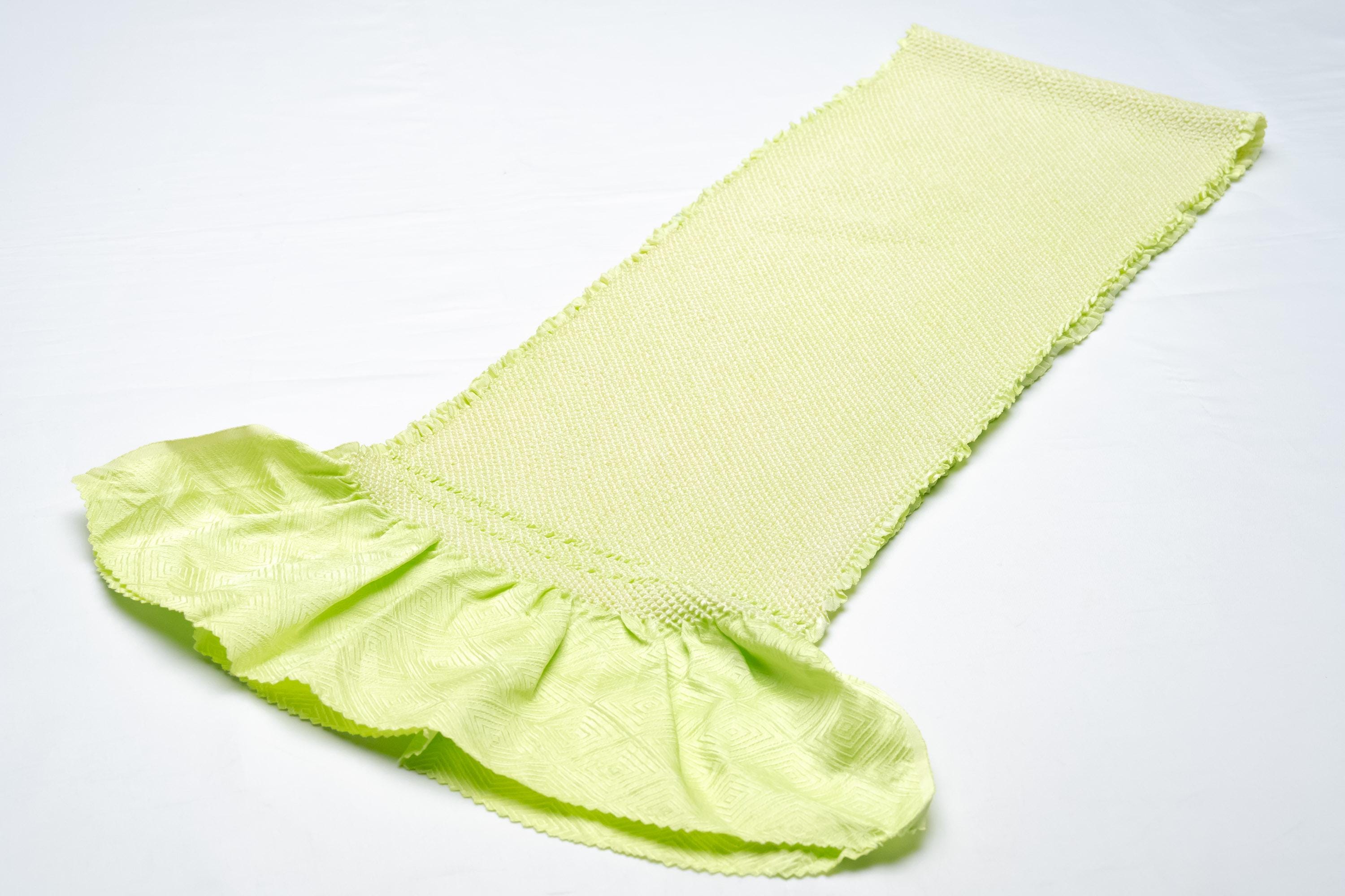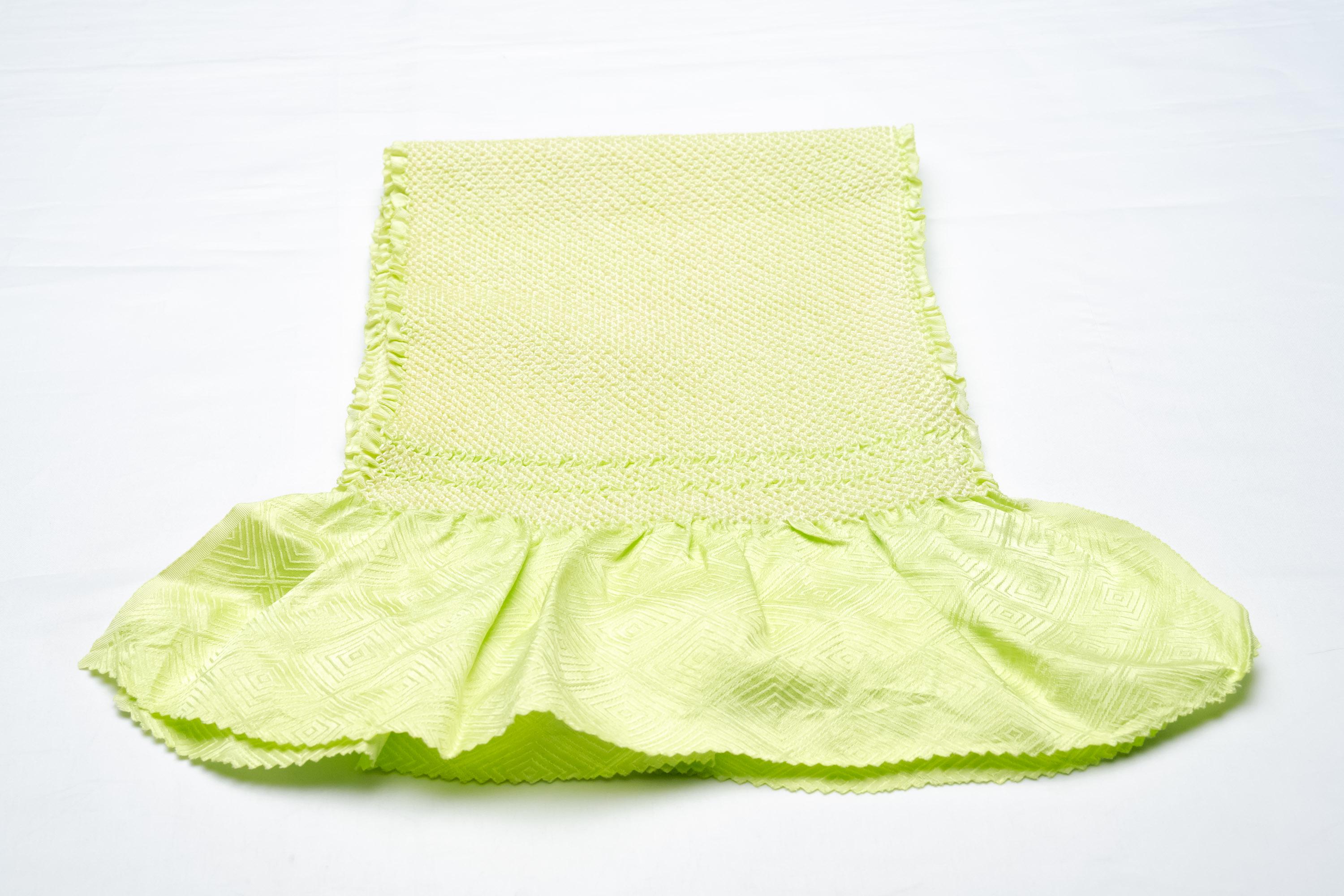 Obiage is a decorative and functional elastic fabric that is being worn above the Obi. It serves the purpose of covering/keeping ObiMakura in place and helping to secure the upper part of Obi knot. Obiage are broadly divided into two different looks/characteristics, a thin scarf-like flat fabric type which are then subdivided into Rinzu, Chirimen, Kinsha and Mofuku, and a thicker scrunchy-like more elastic fabric type which is Shibori.