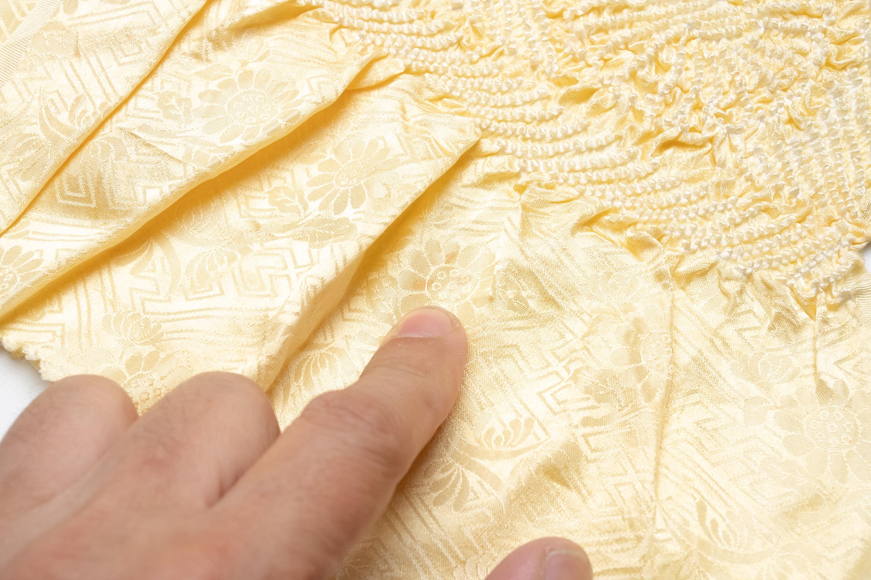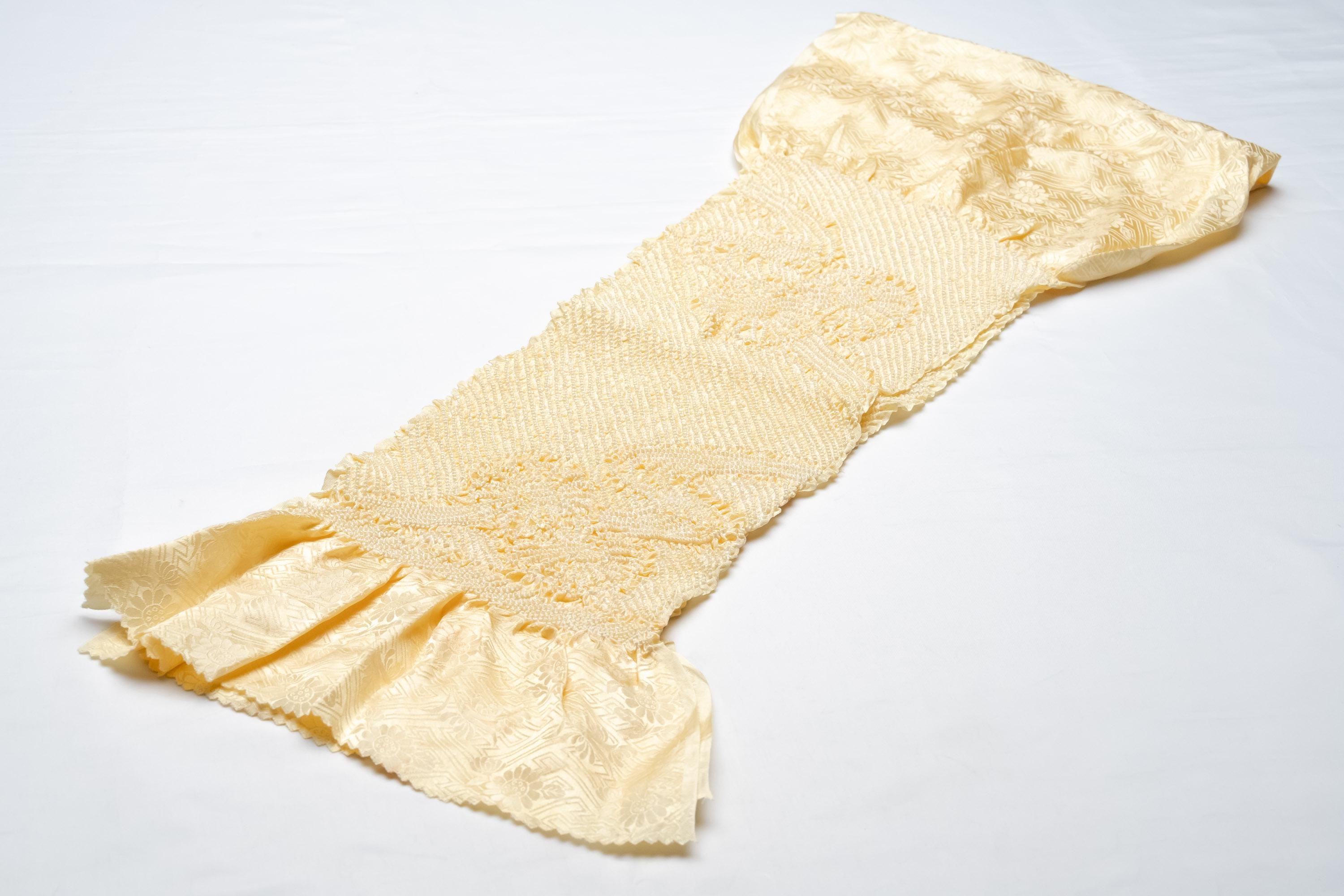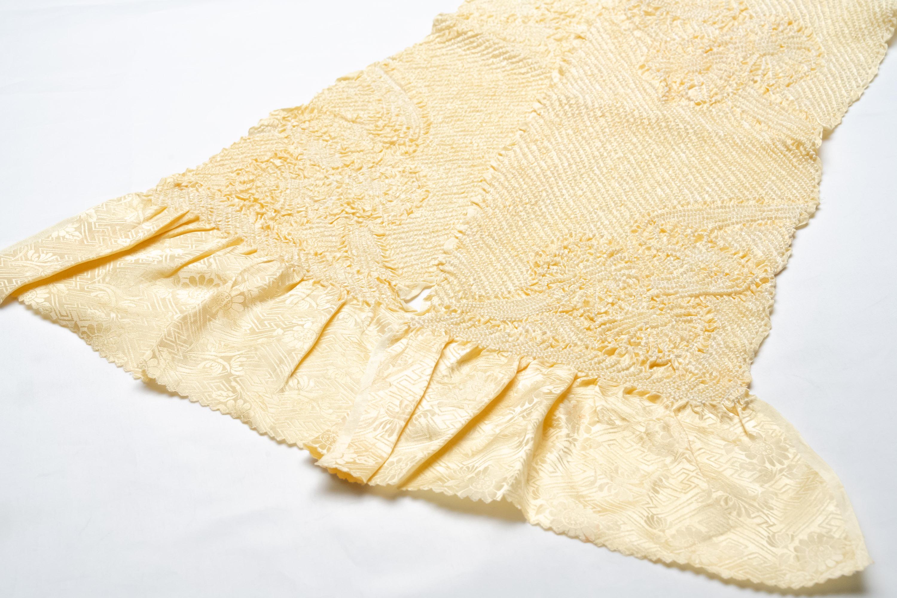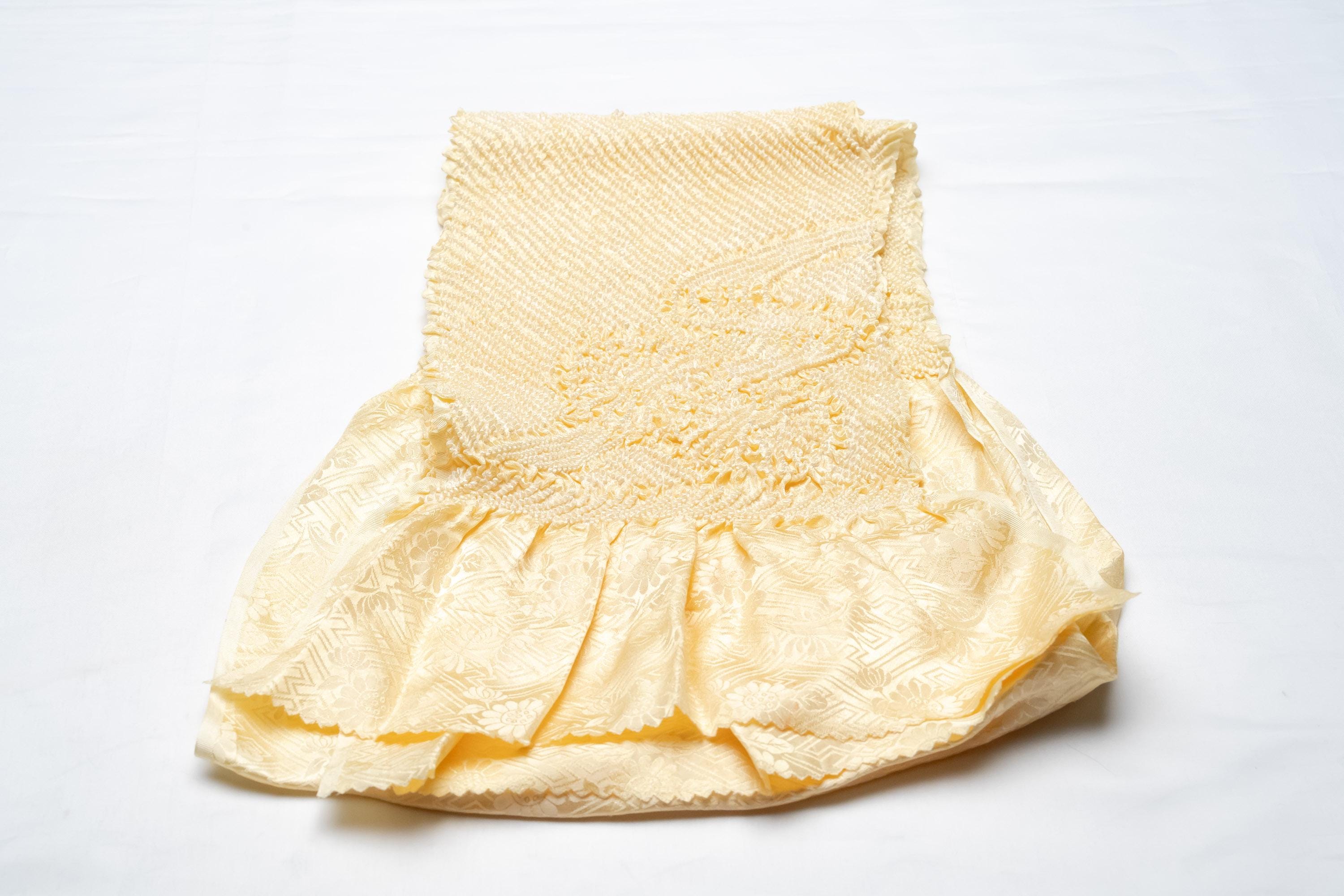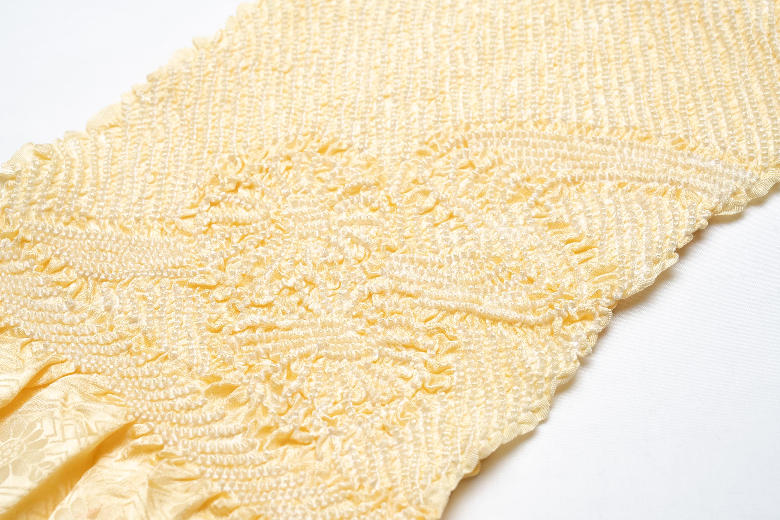Obiage is a decorative and functional elastic fabric that is being worn above the Obi. It serves the purpose of covering/keeping ObiMakura in place and helping to secure the upper part of Obi knot. Obiage are broadly divided into two different looks/characteristics, a thin scarf-like flat fabric type which are then subdivided into Rinzu, Chirimen, Kinsha and Mofuku, and a thicker scrunchy-like more elastic fabric type which is Shibori.