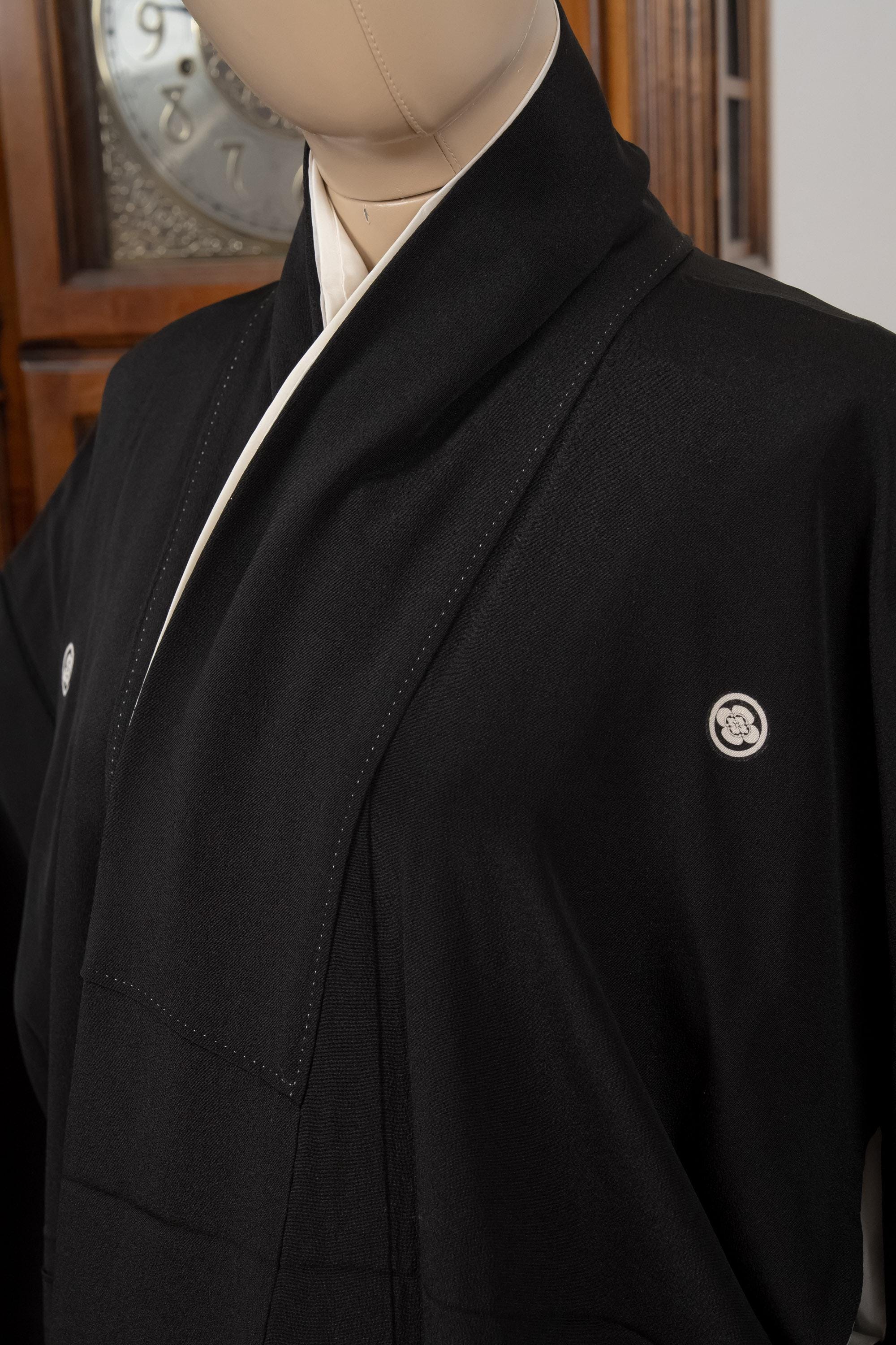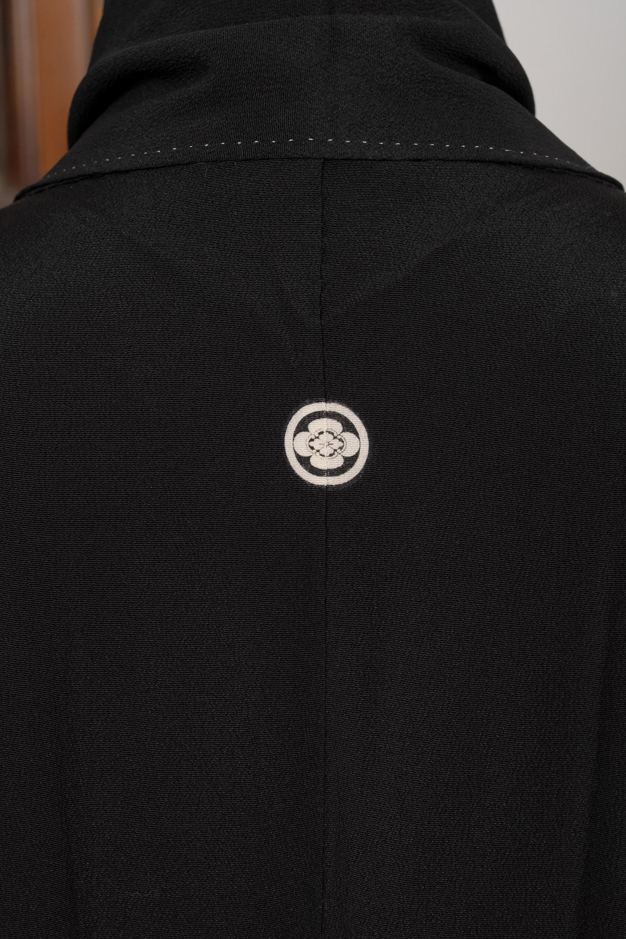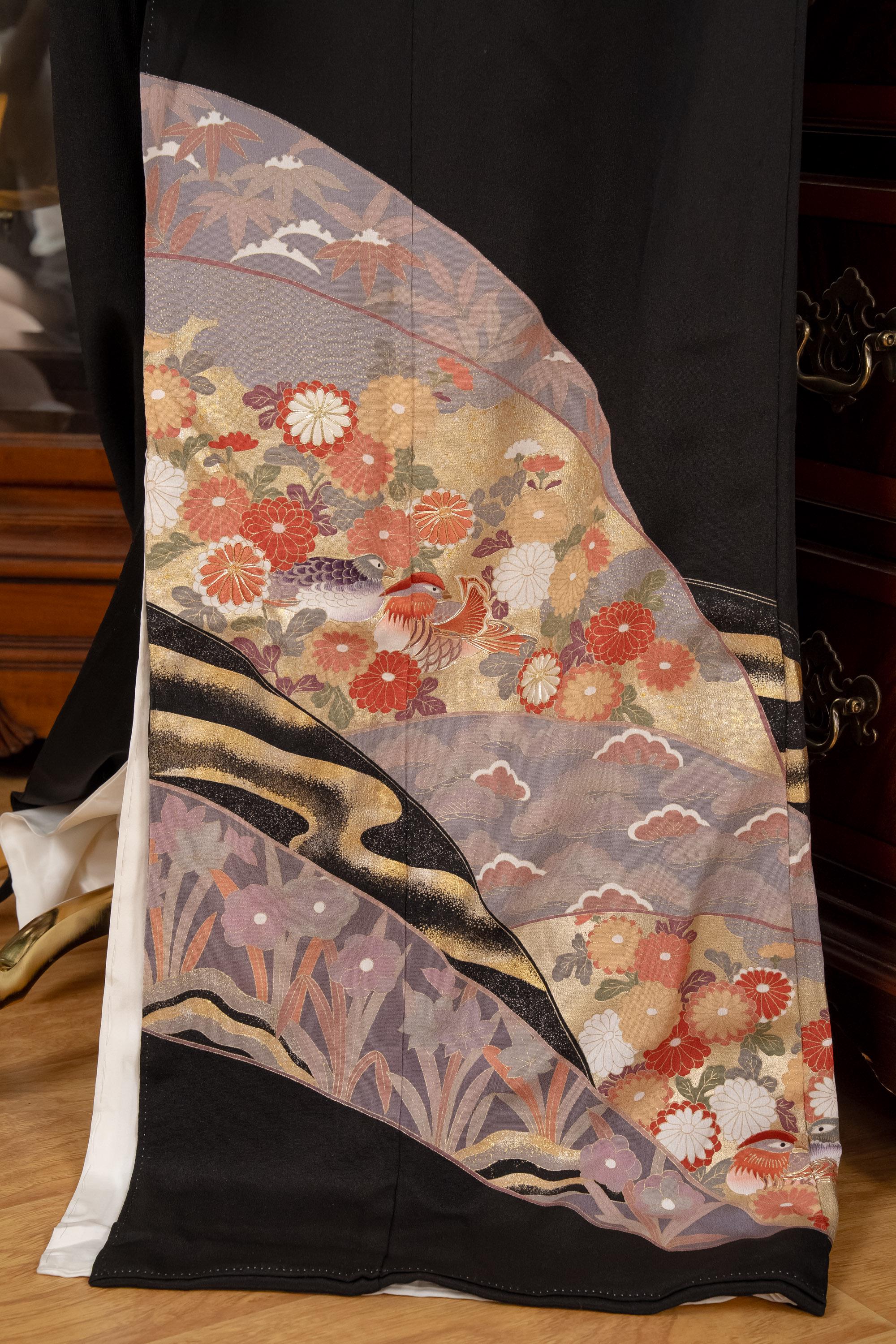 Tomesode is the most formal, high class Kimono for all ceremonies and occasions. Black ones are worn by married women and colored ones are worn by both married and unmarried women. Distinct characteristics of Tomesode are family crests and surrounding patterns around the hem. Numbers of family crests specify formality and rank.