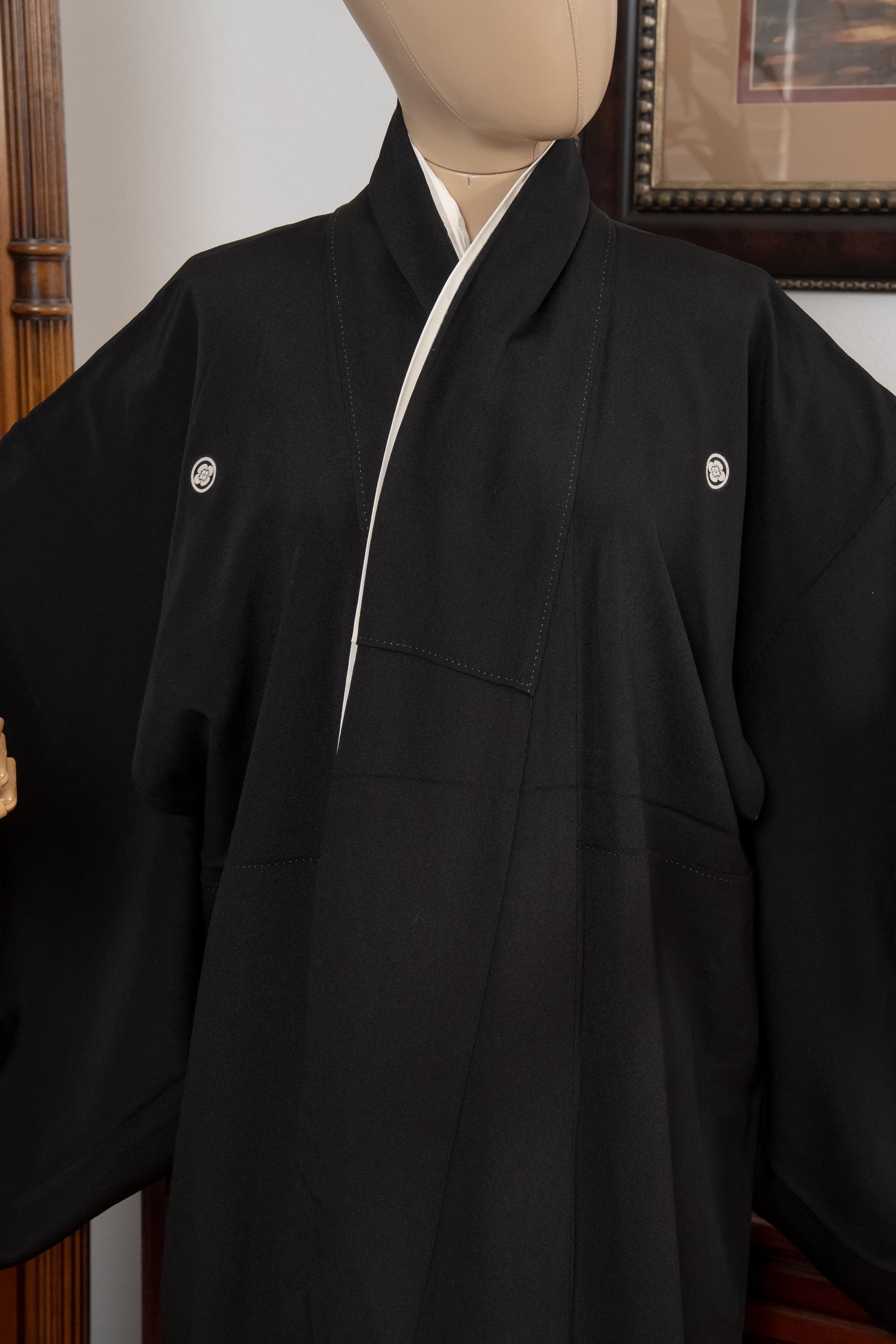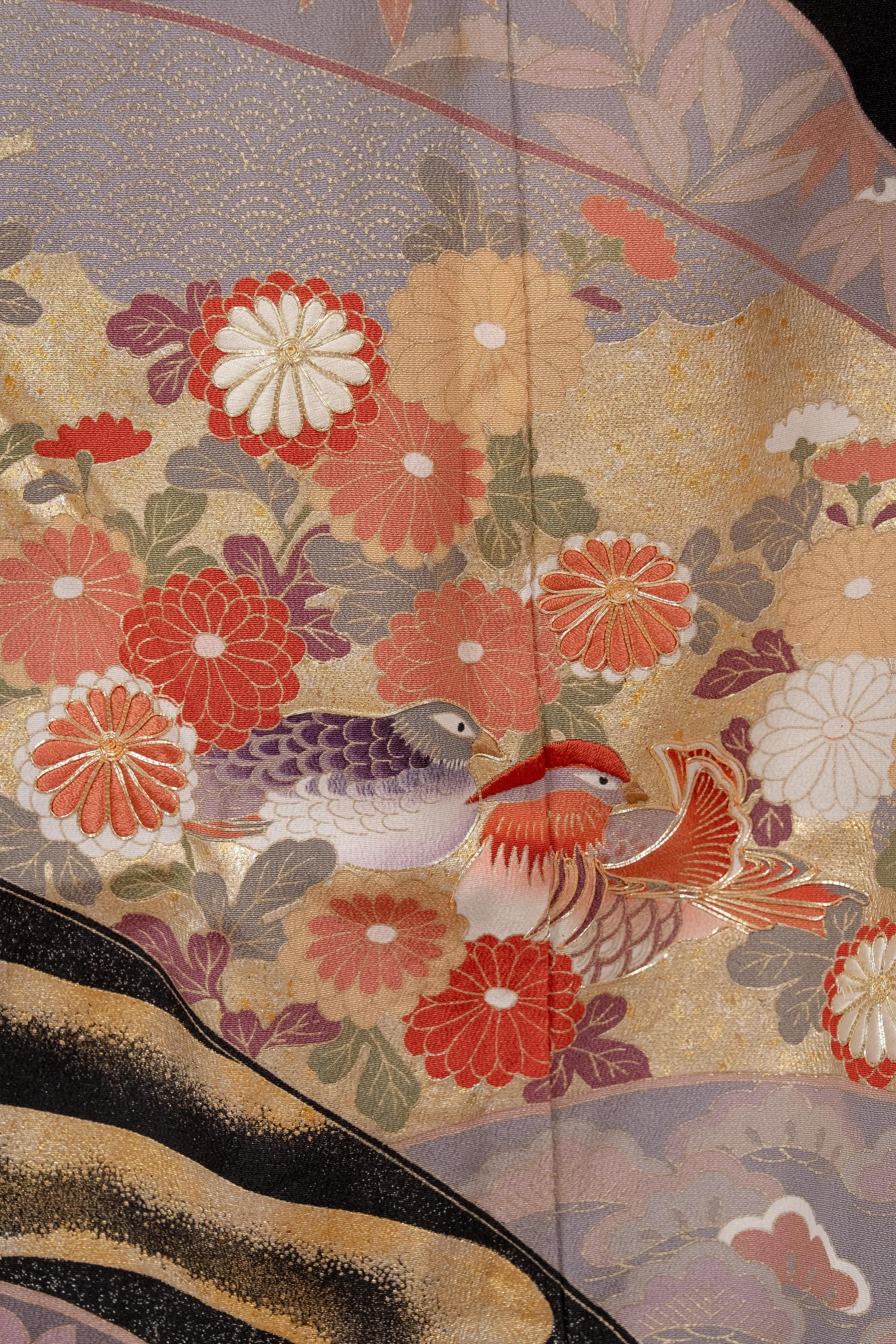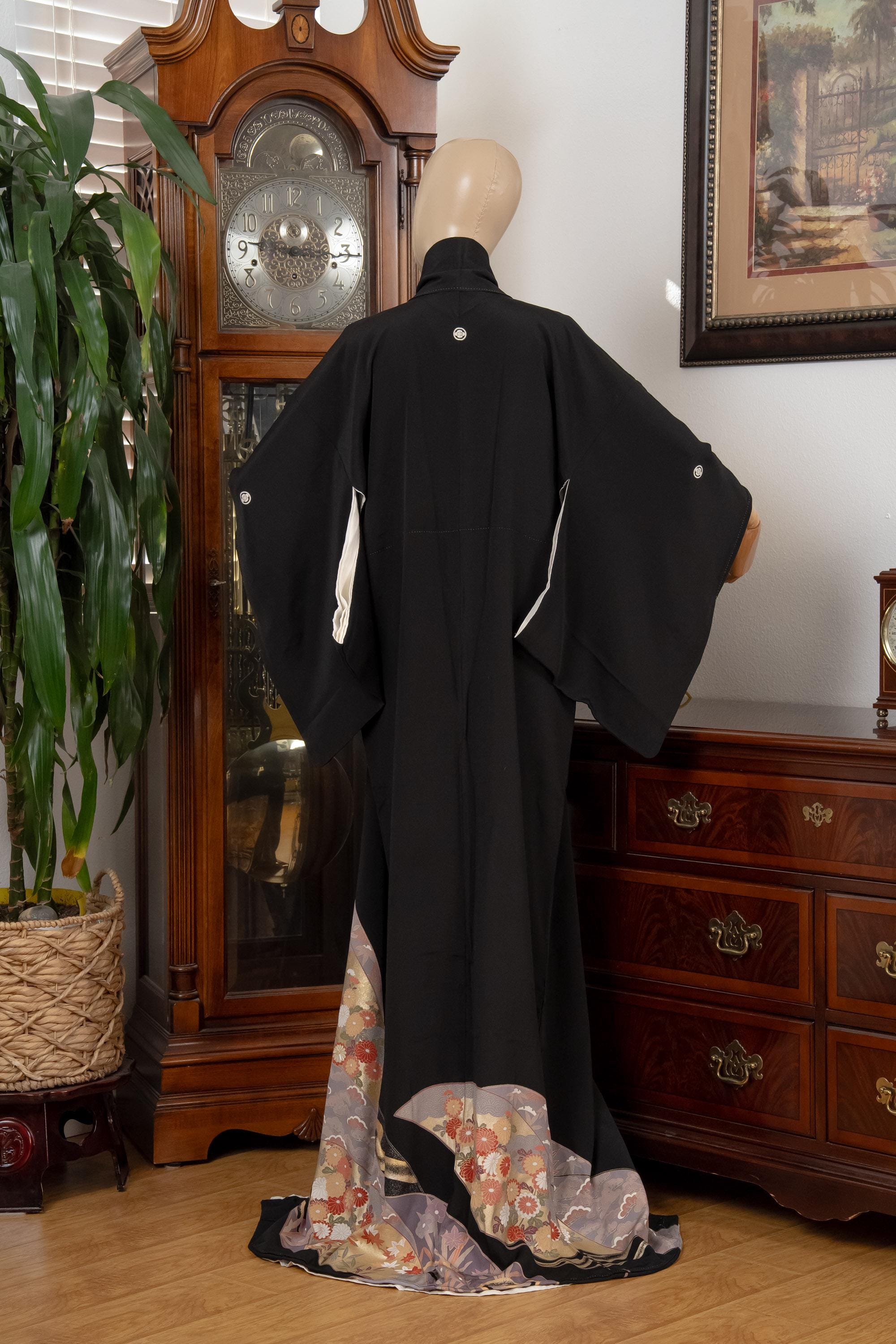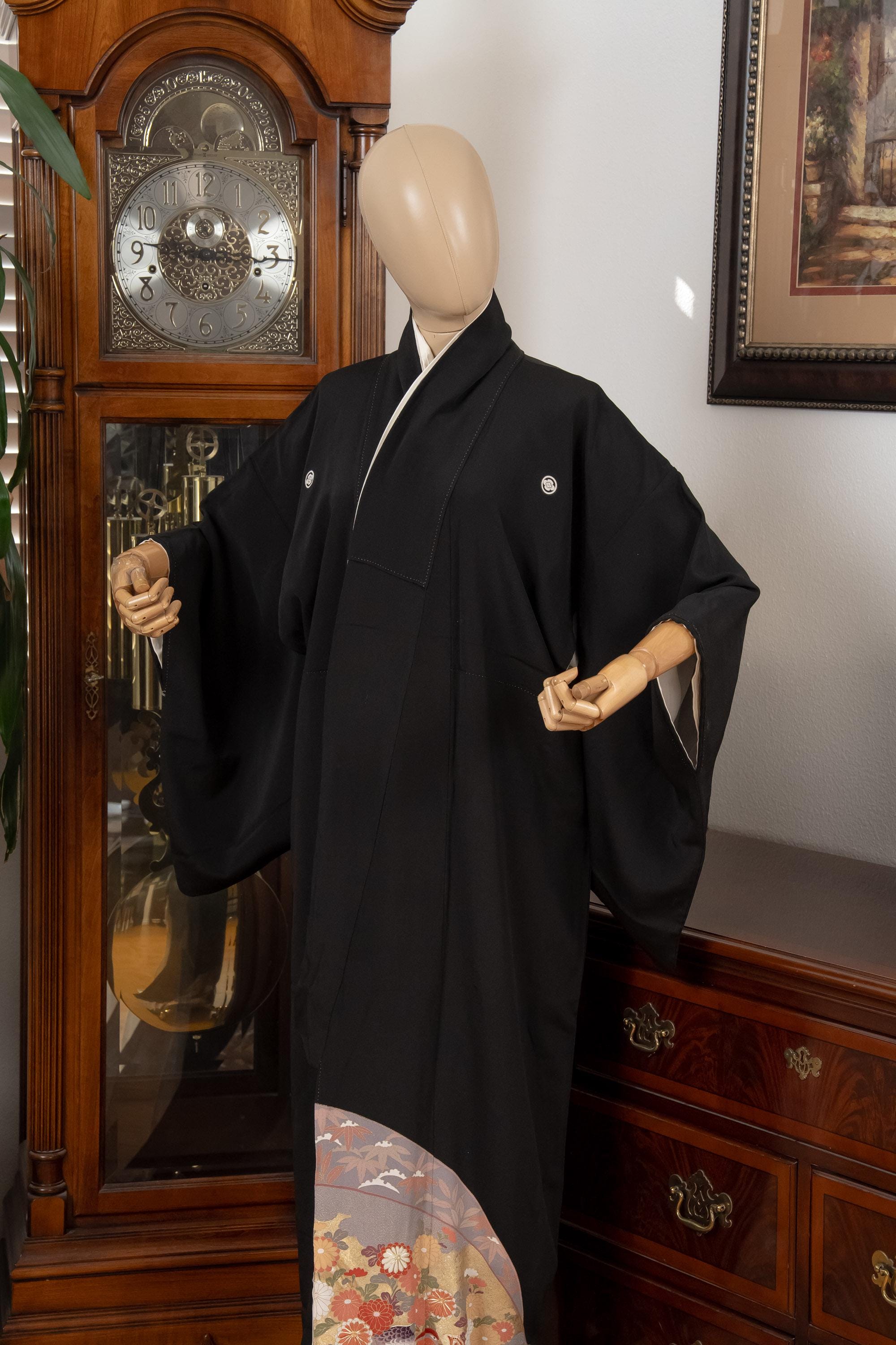 Tomesode is the most formal, high class Kimono for all ceremonies and occasions. Black ones are worn by married women and colored ones are worn by both married and unmarried women. Distinct characteristics of Tomesode are family crests and surrounding patterns around the hem. Numbers of family crests specify formality and rank.