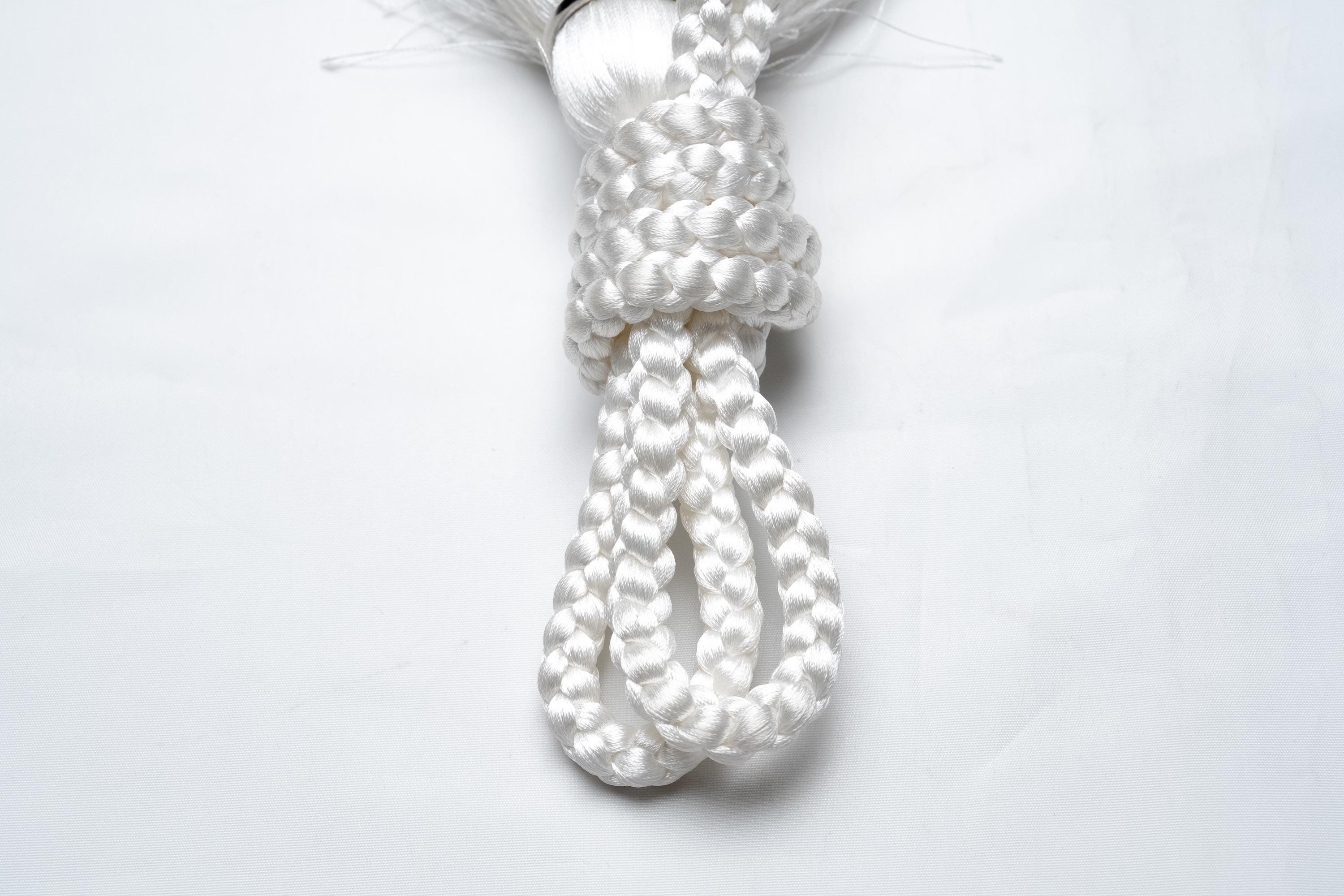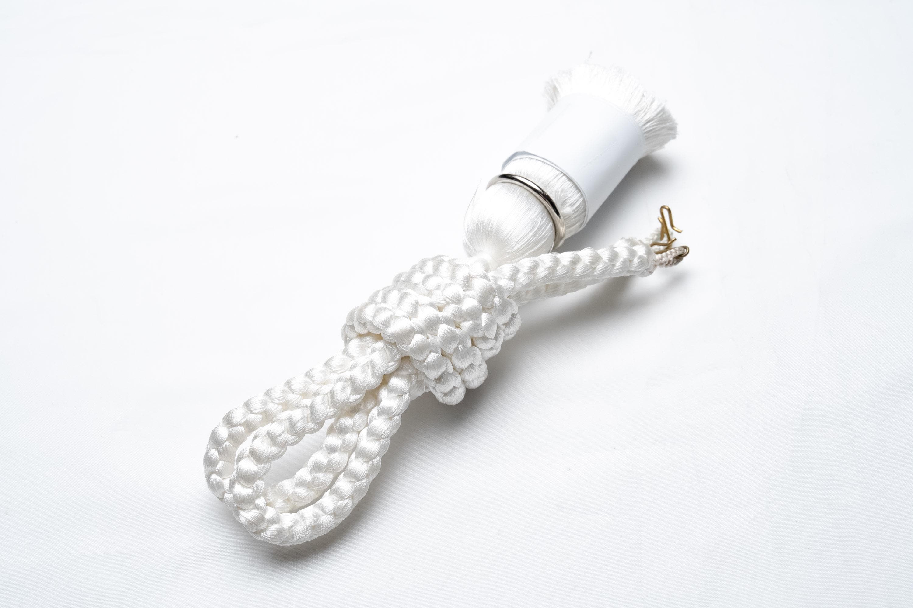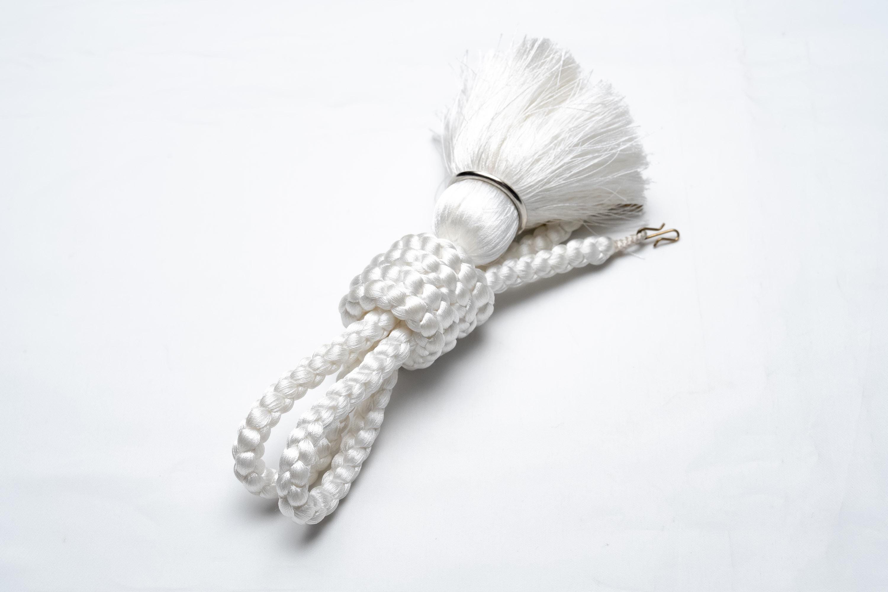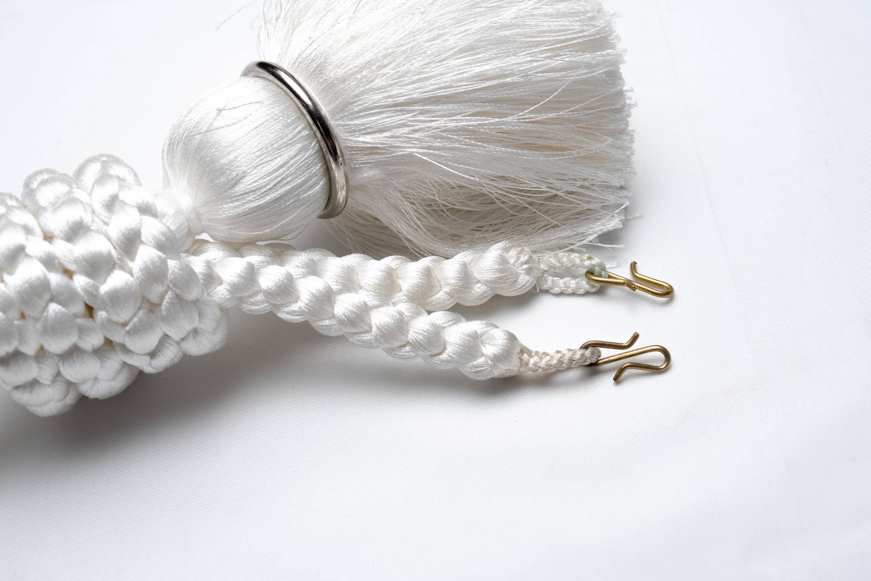 Haorihimos are short, woven cords being attached to inside seam of Haori collar as a formal accessory. They generally come with hooks on ends of the cord that will hang on to the loops on each side of Haori collar making a floating tassel decoration in the center.