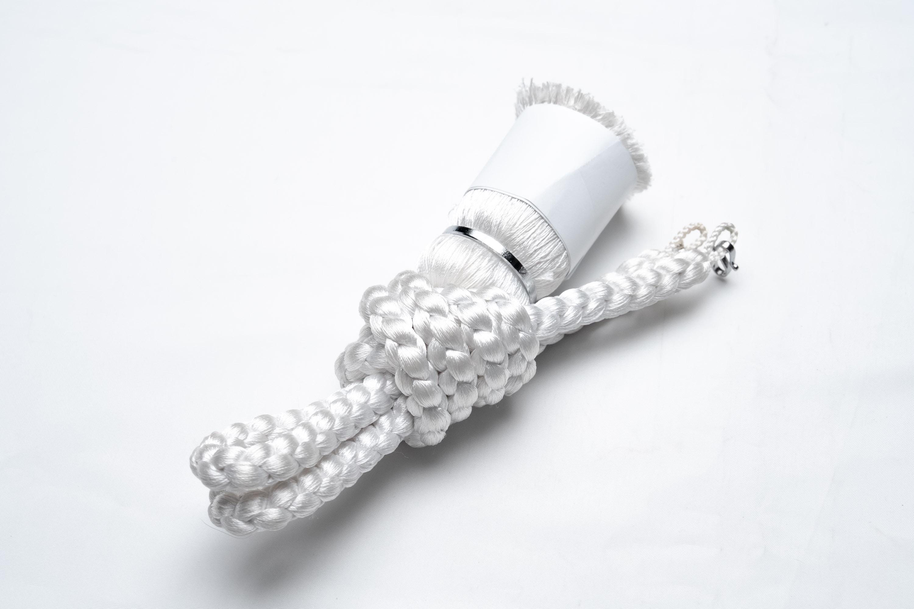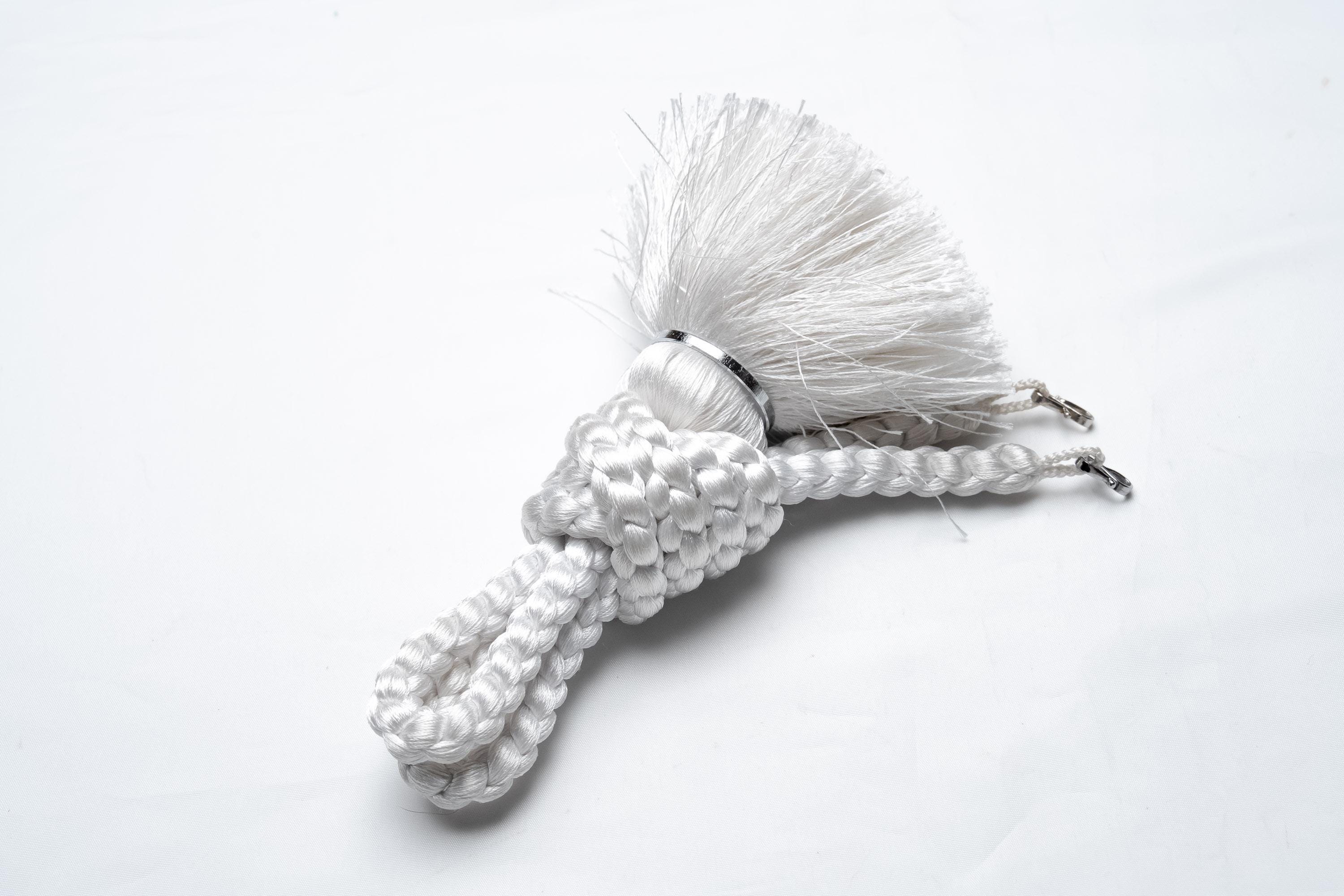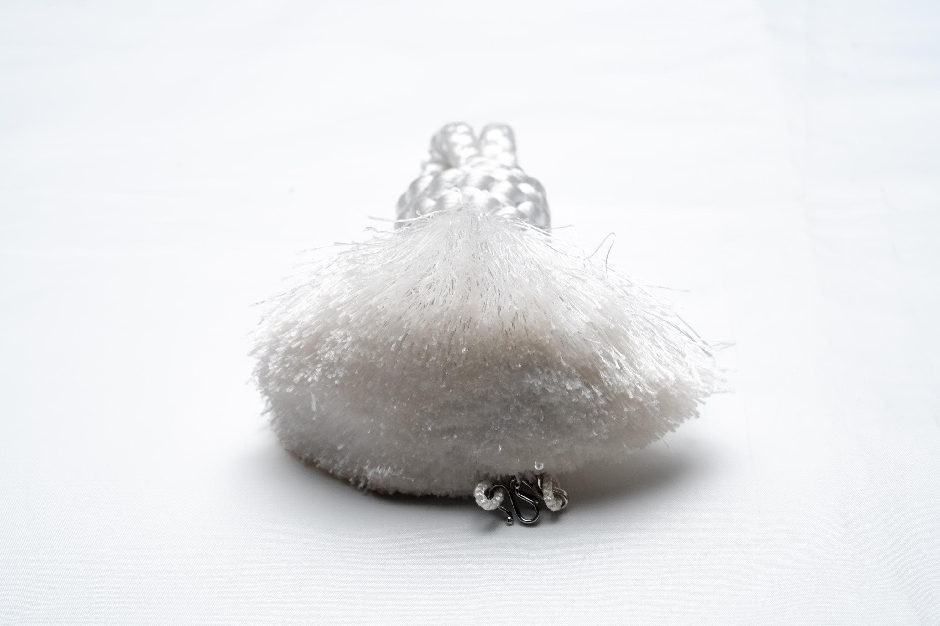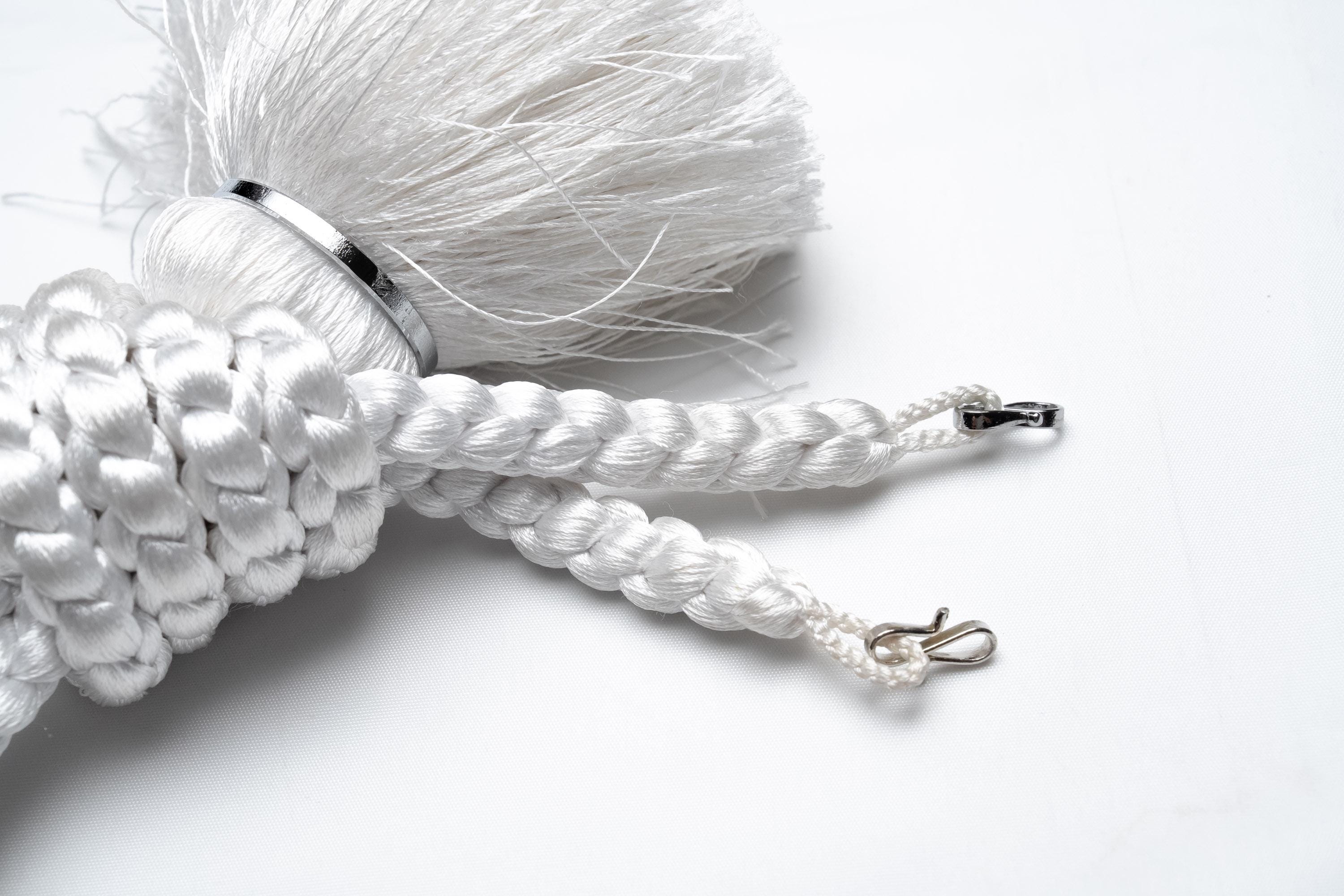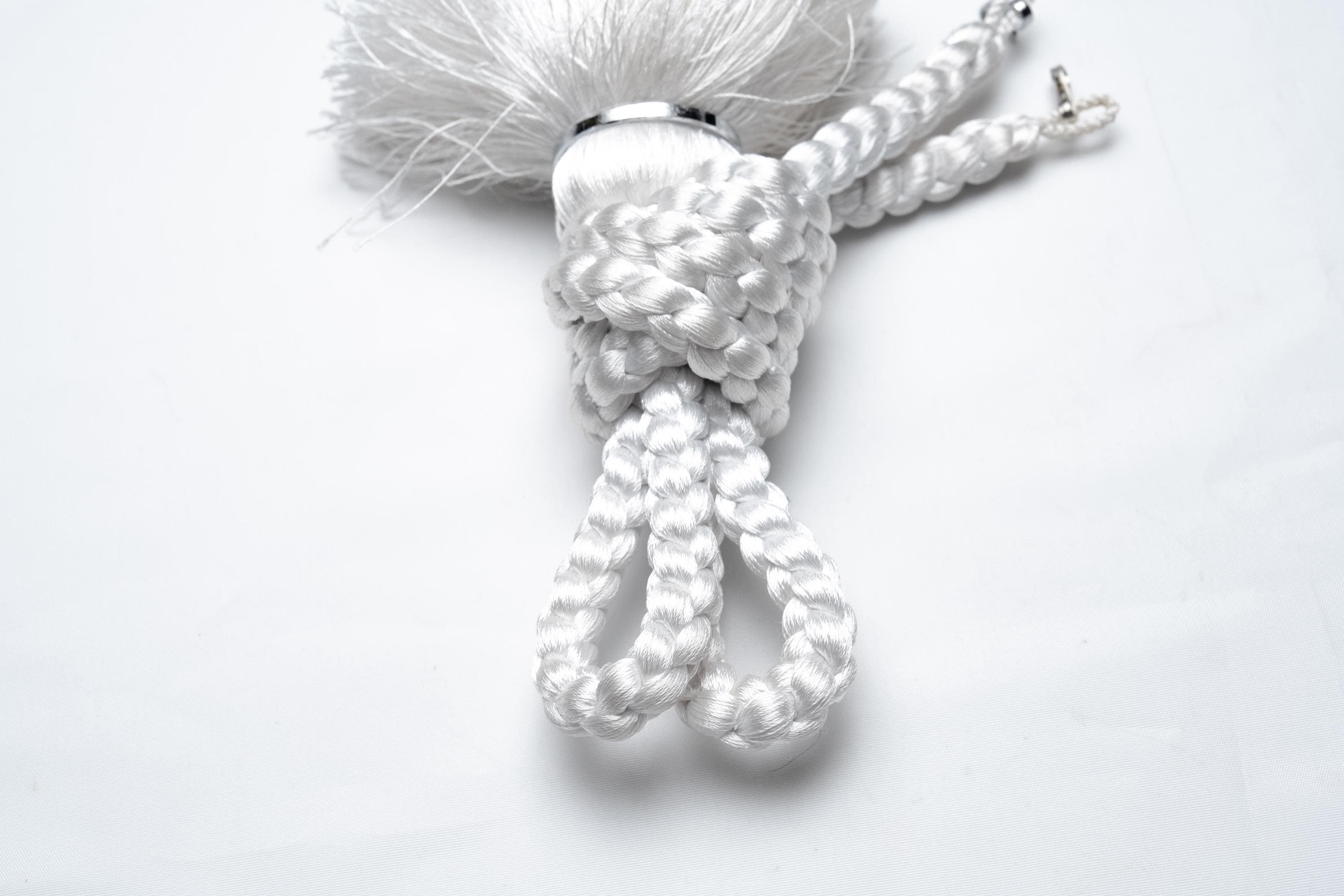 Haorihimos are short, woven cords being attached to inside seam of Haori collar as a formal accessory. They generally come with hooks on ends of the cord that will hang on to the loops on each side of Haori collar making a floating tassel decoration in the center.