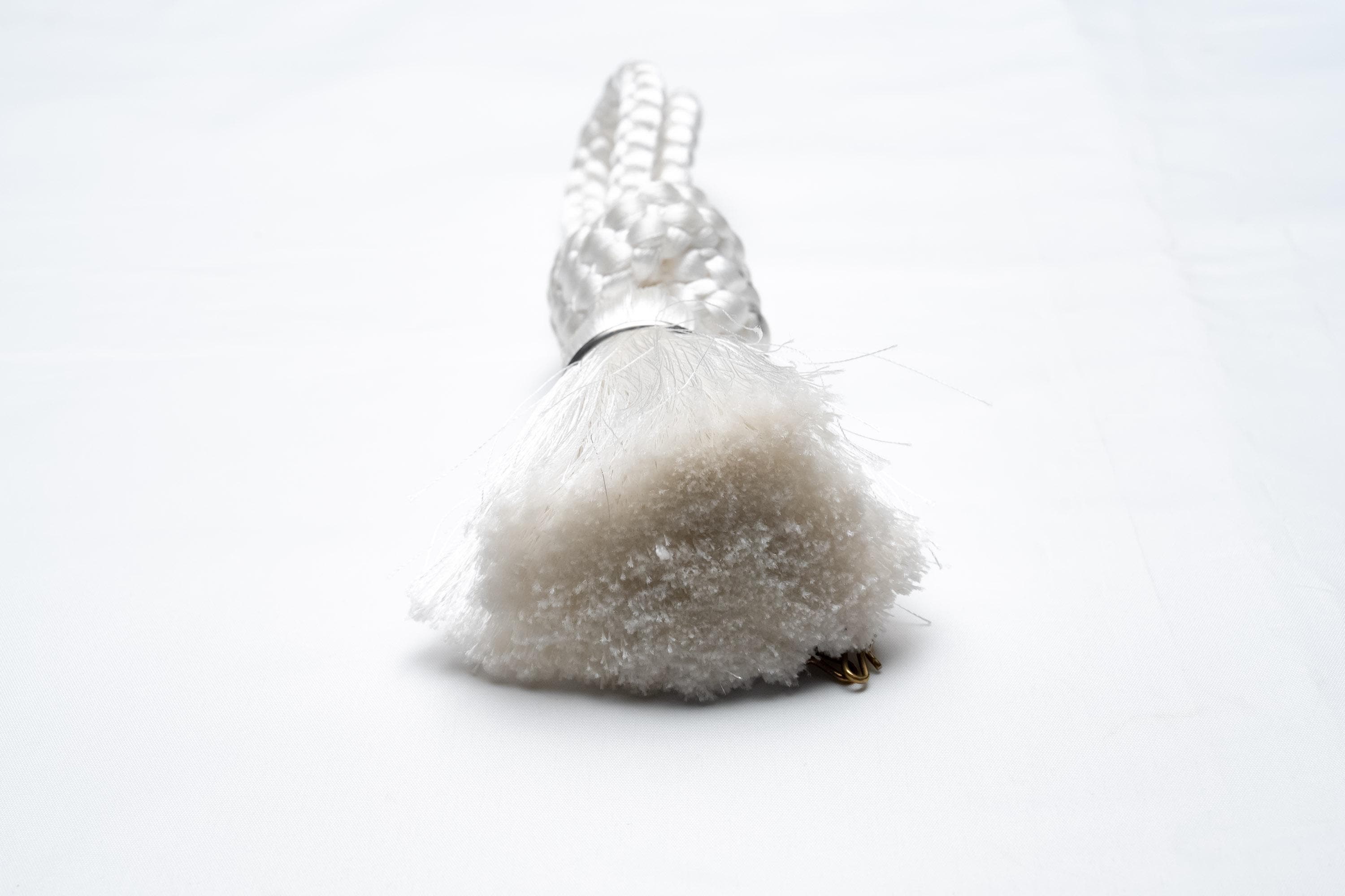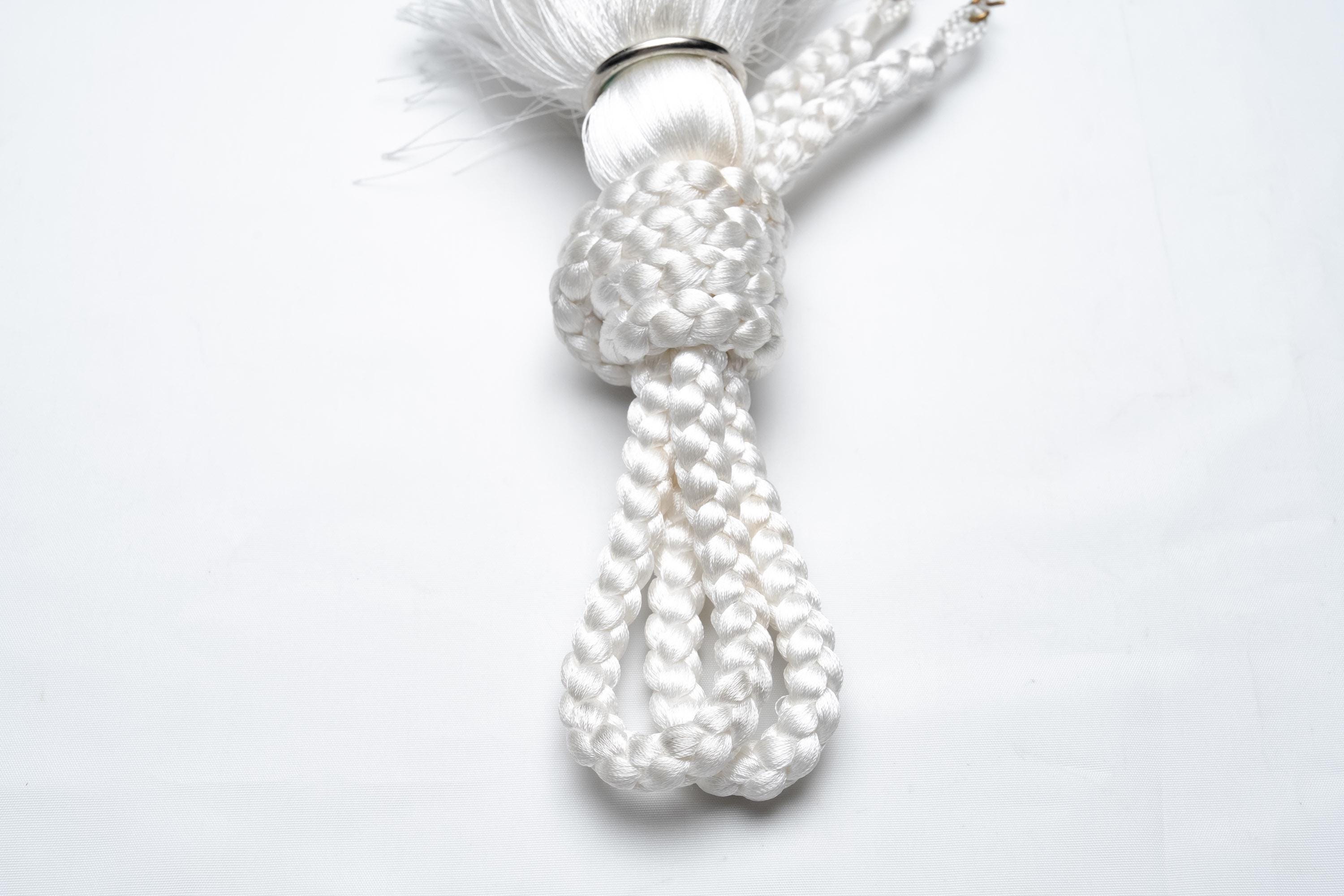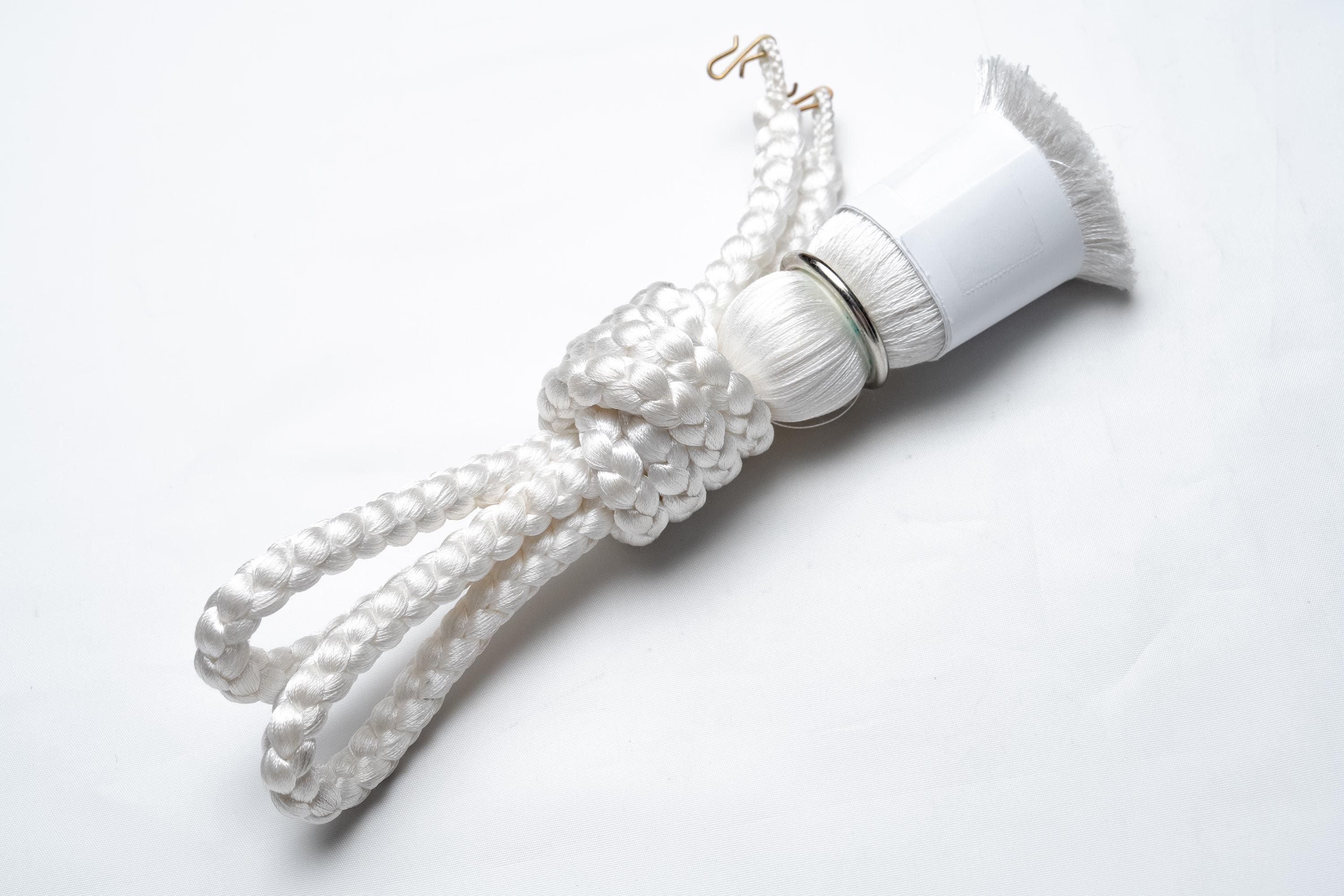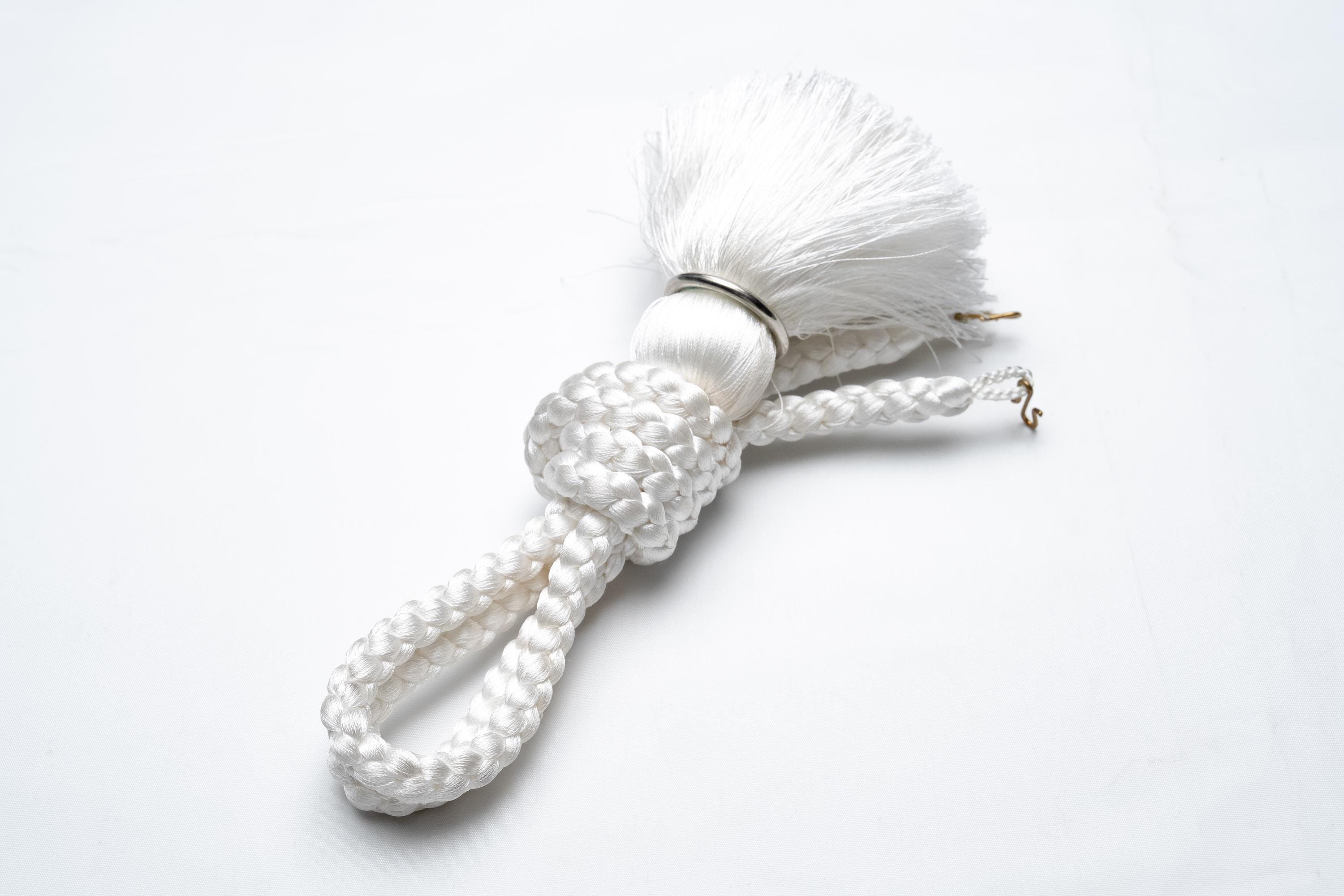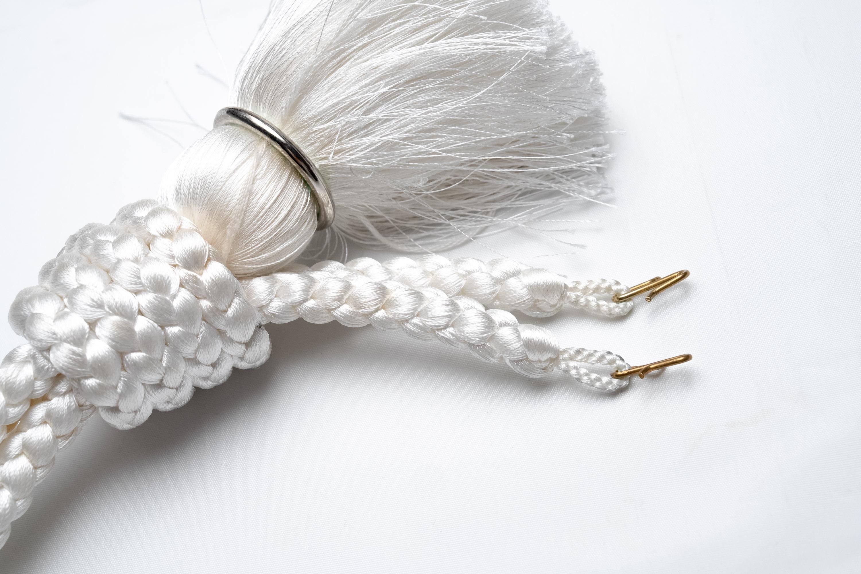 Haorihimos are short, woven cords being attached to inside seam of Haori collar as a formal accessory. They generally come with hooks on ends of the cord that will hang on to the loops on each side of Haori collar making a floating tassel decoration in the center.