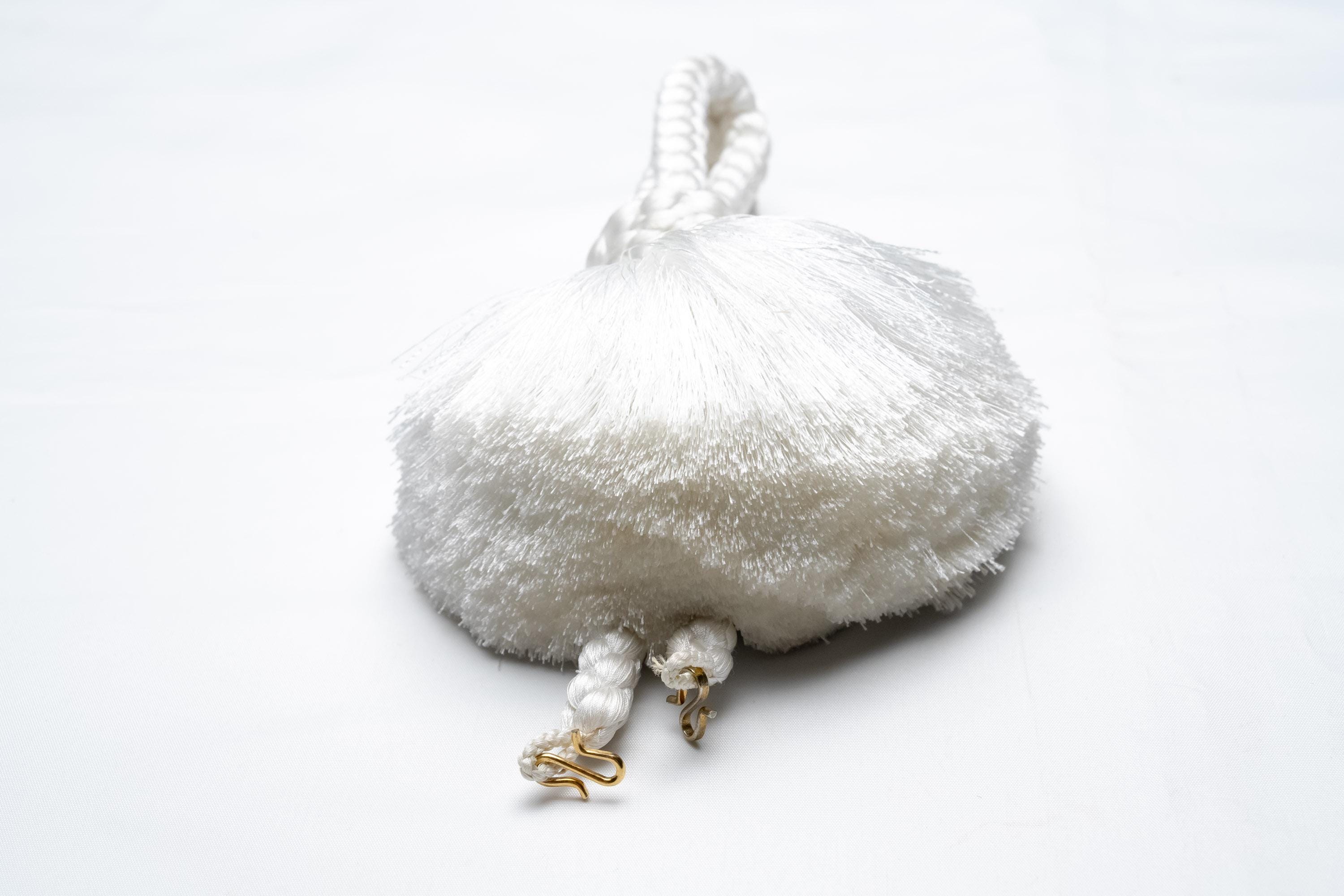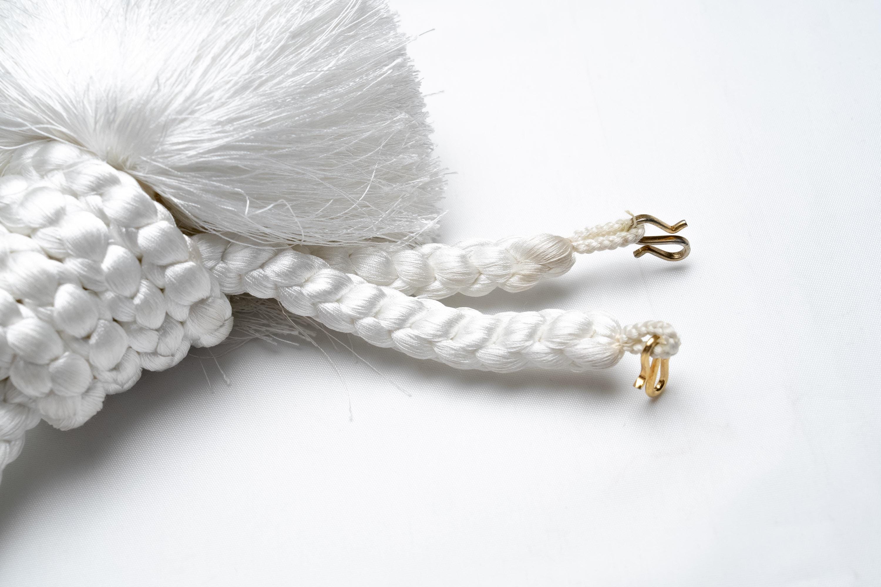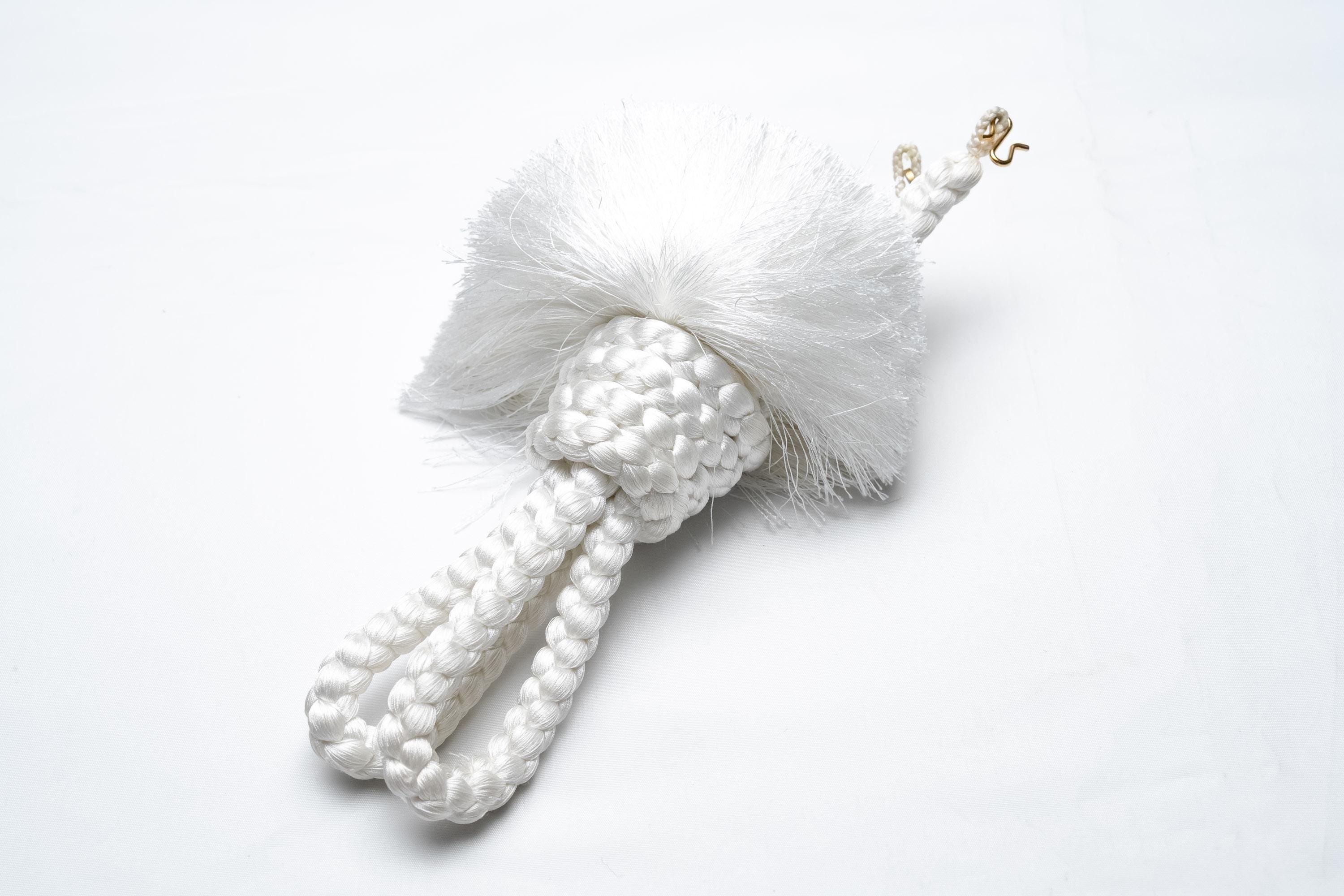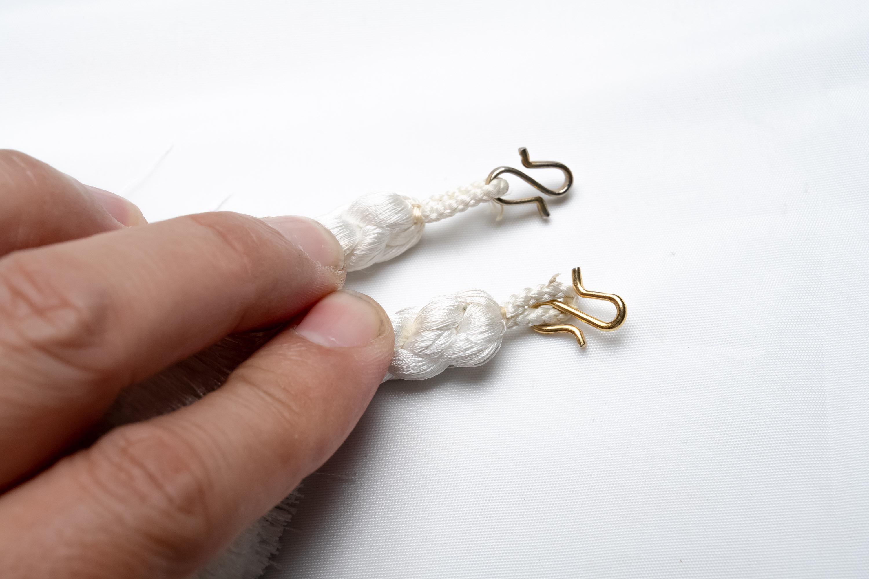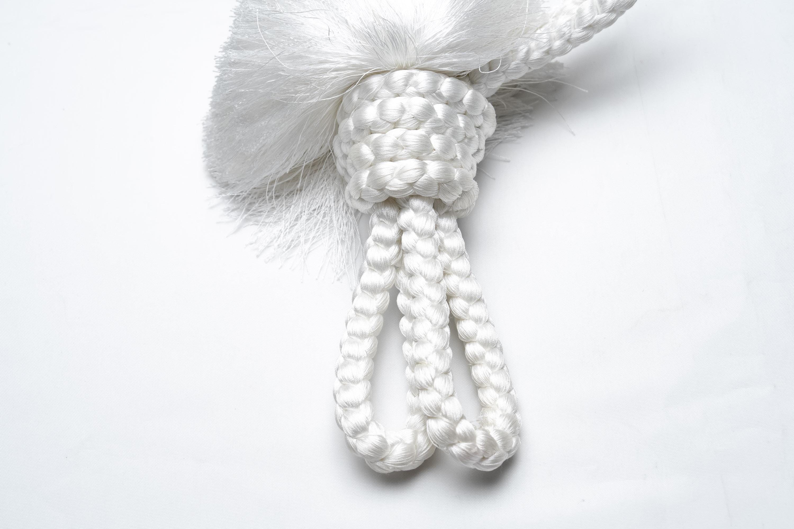 Haorihimos are short, woven cords being attached to inside seam of Haori collar as a formal accessory. They generally come with hooks on ends of the cord that will hang on to the loops on each side of Haori collar making a floating tassel decoration in the center.