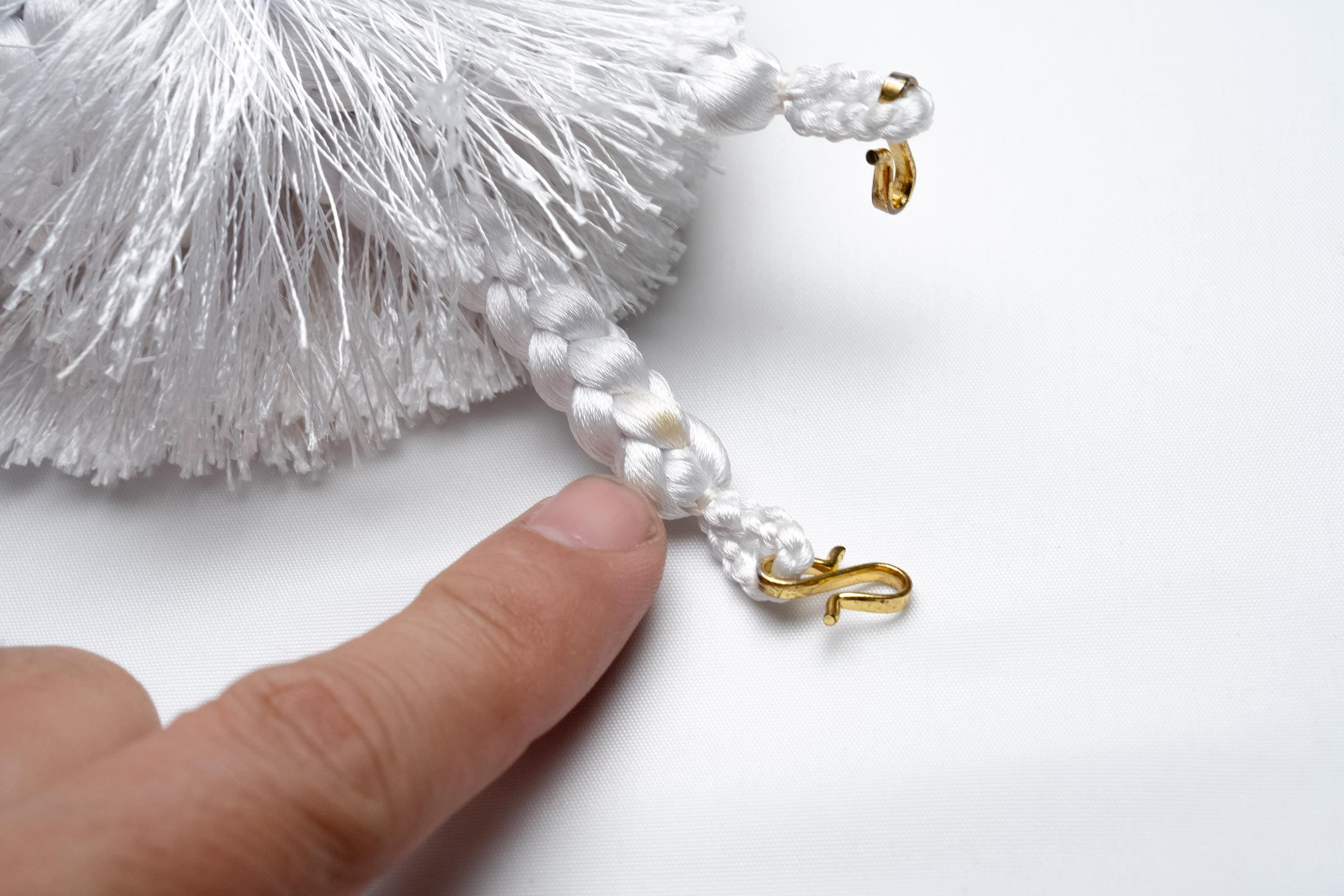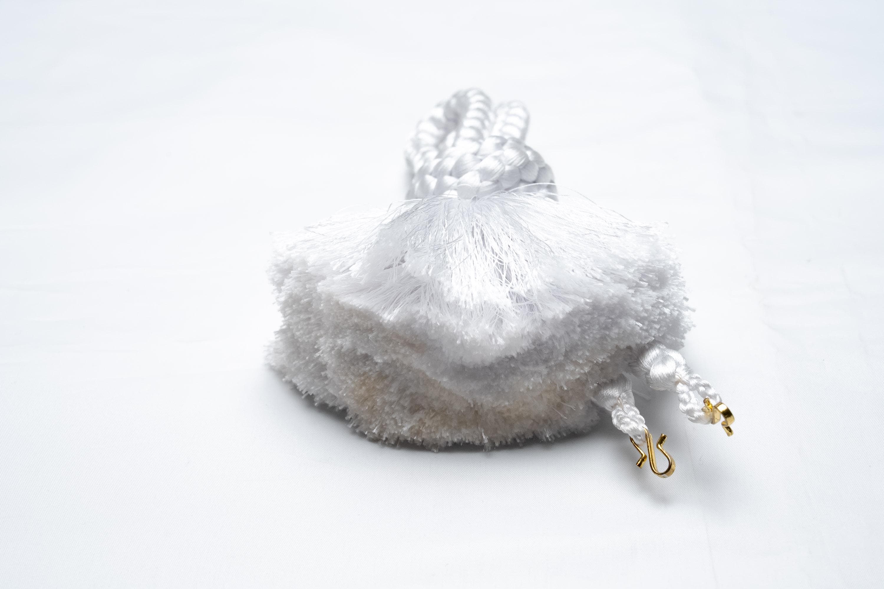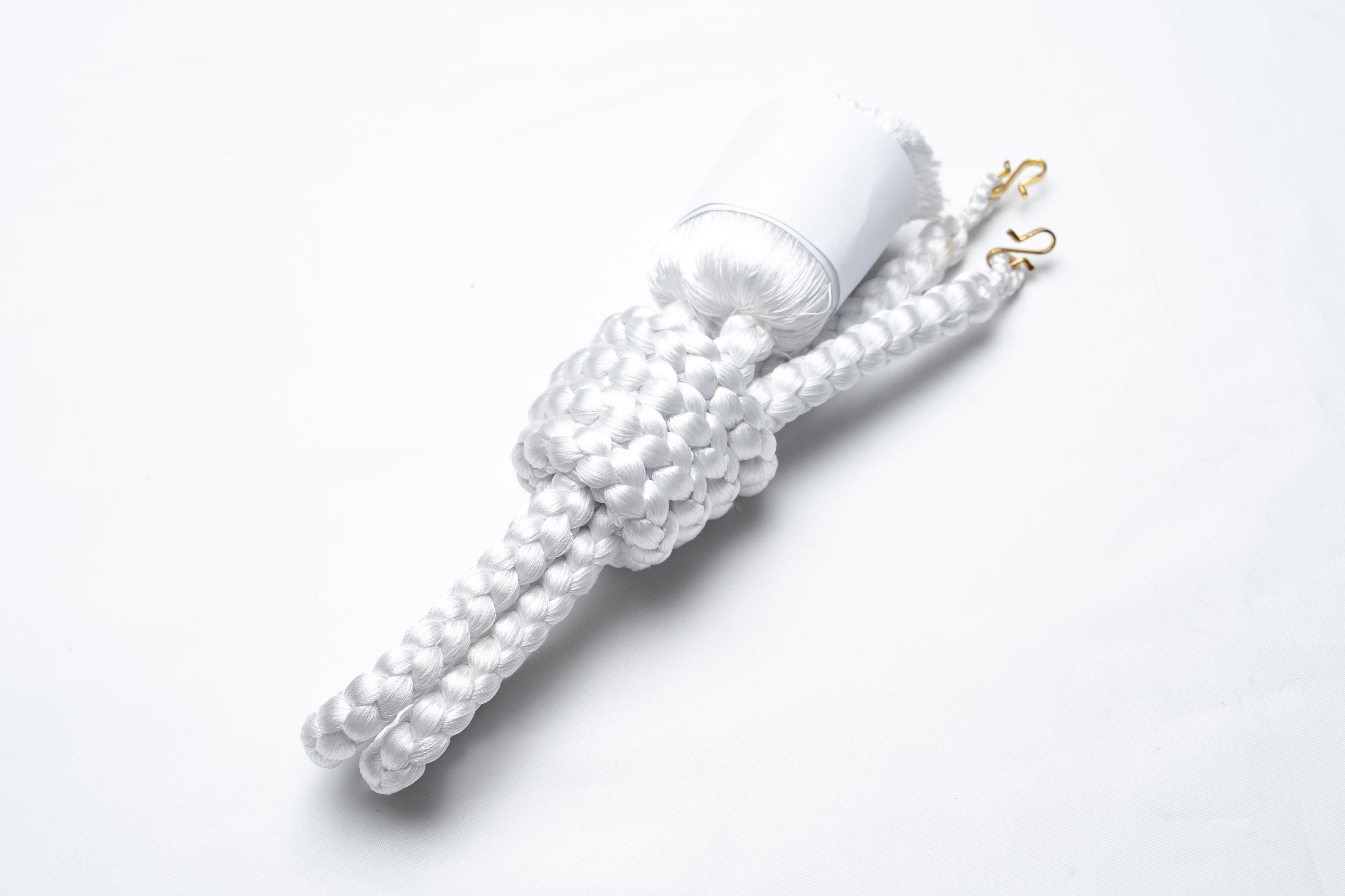 Haorihimos are short, woven cords being attached to inside seam of Haori collar as a formal accessory. They generally come with hooks on ends of the cord that will hang on to the loops on each side of Haori collar making a floating tassel decoration in the center.