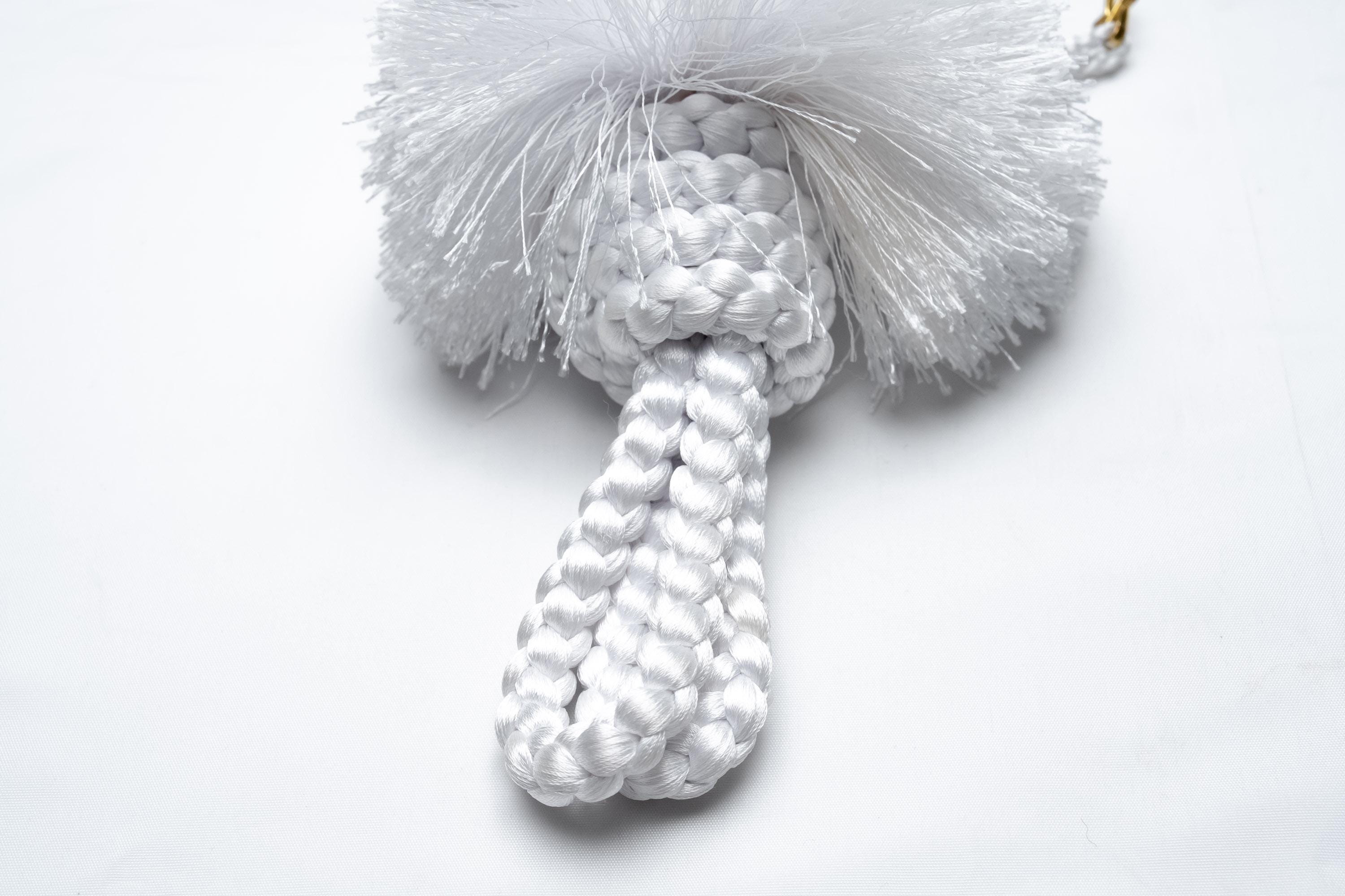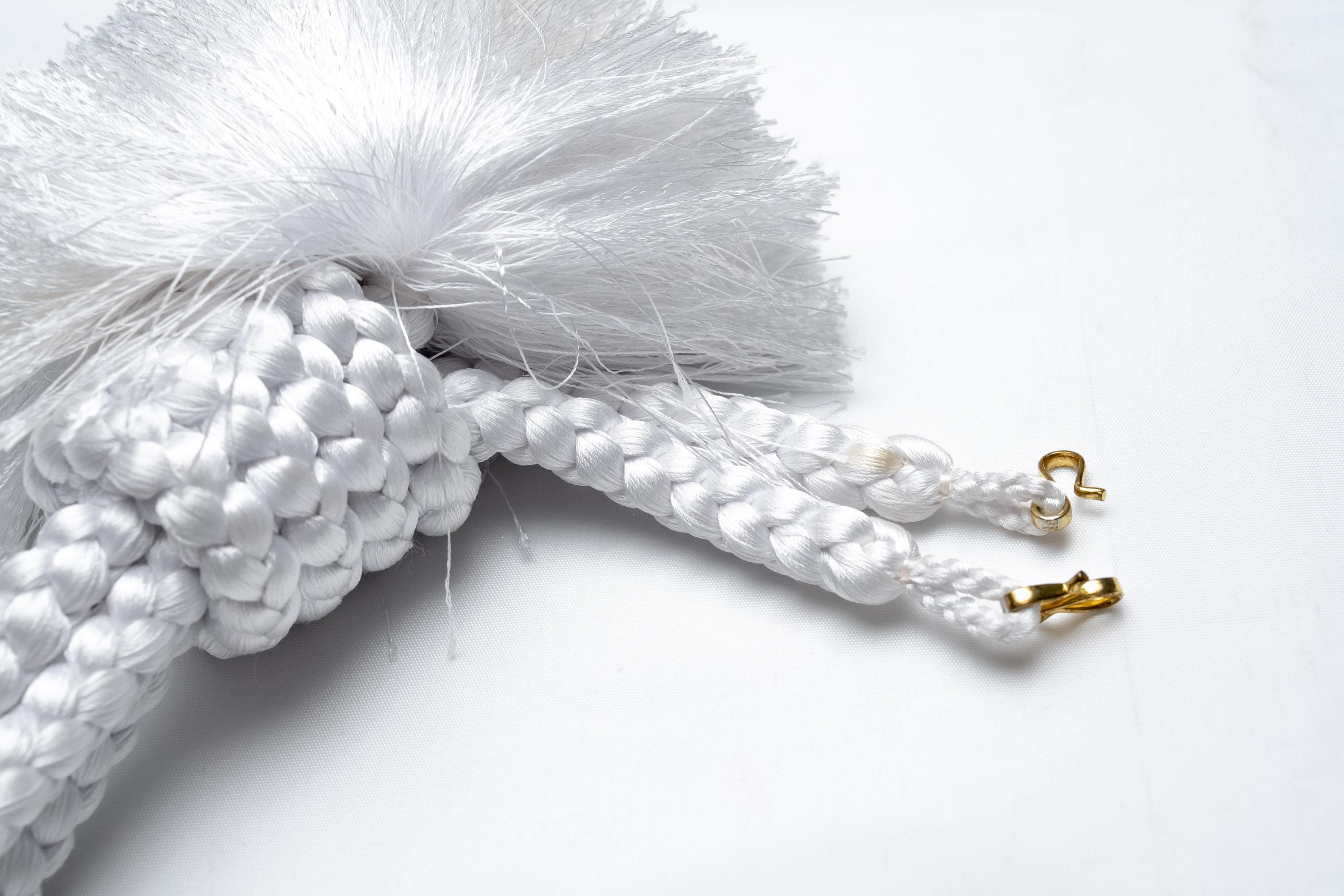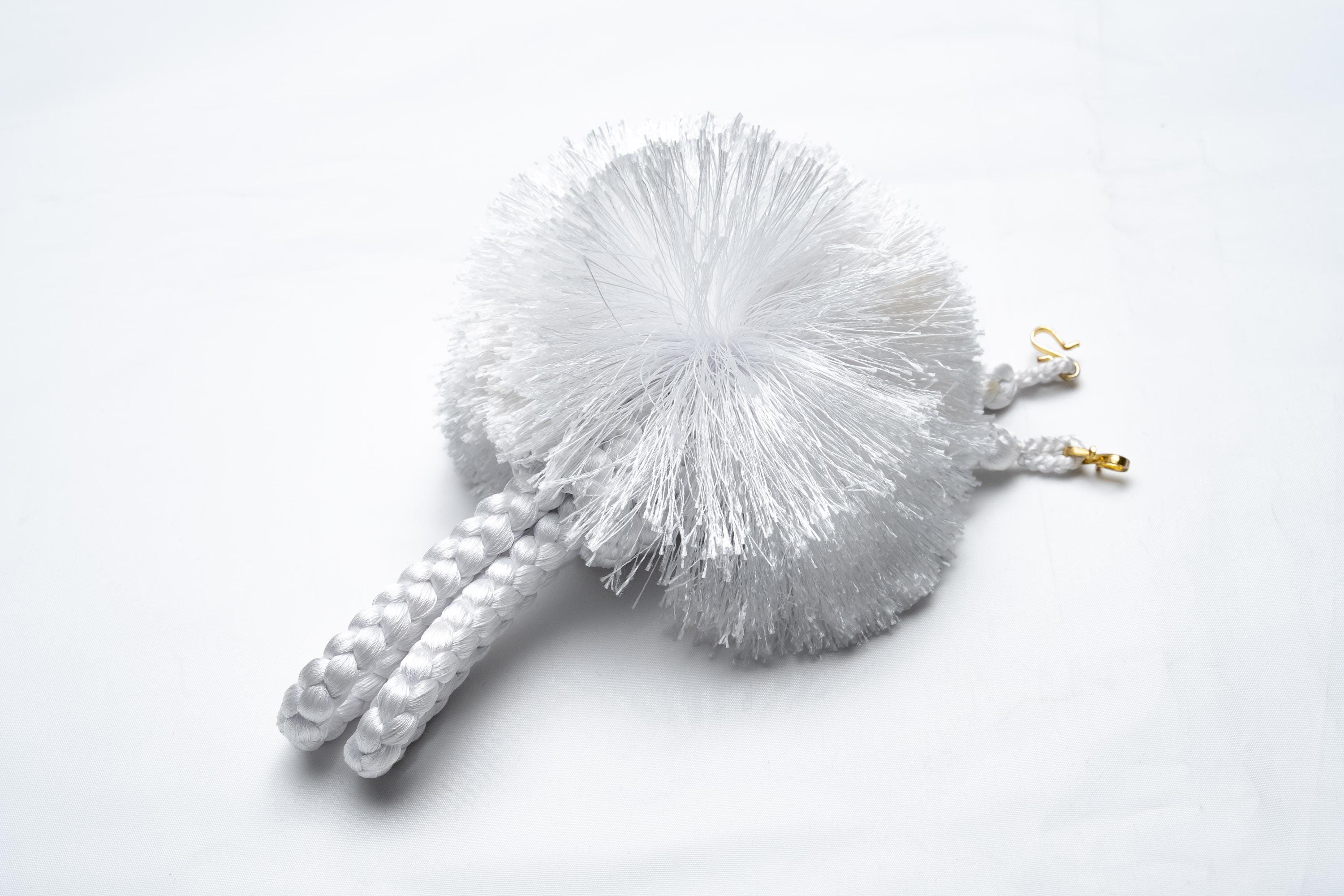 Haorihimos are short, woven cords being attached to inside seam of Haori collar as a formal accessory. They generally come with hooks on ends of the cord that will hang on to the loops on each side of Haori collar making a floating tassel decoration in the center.
