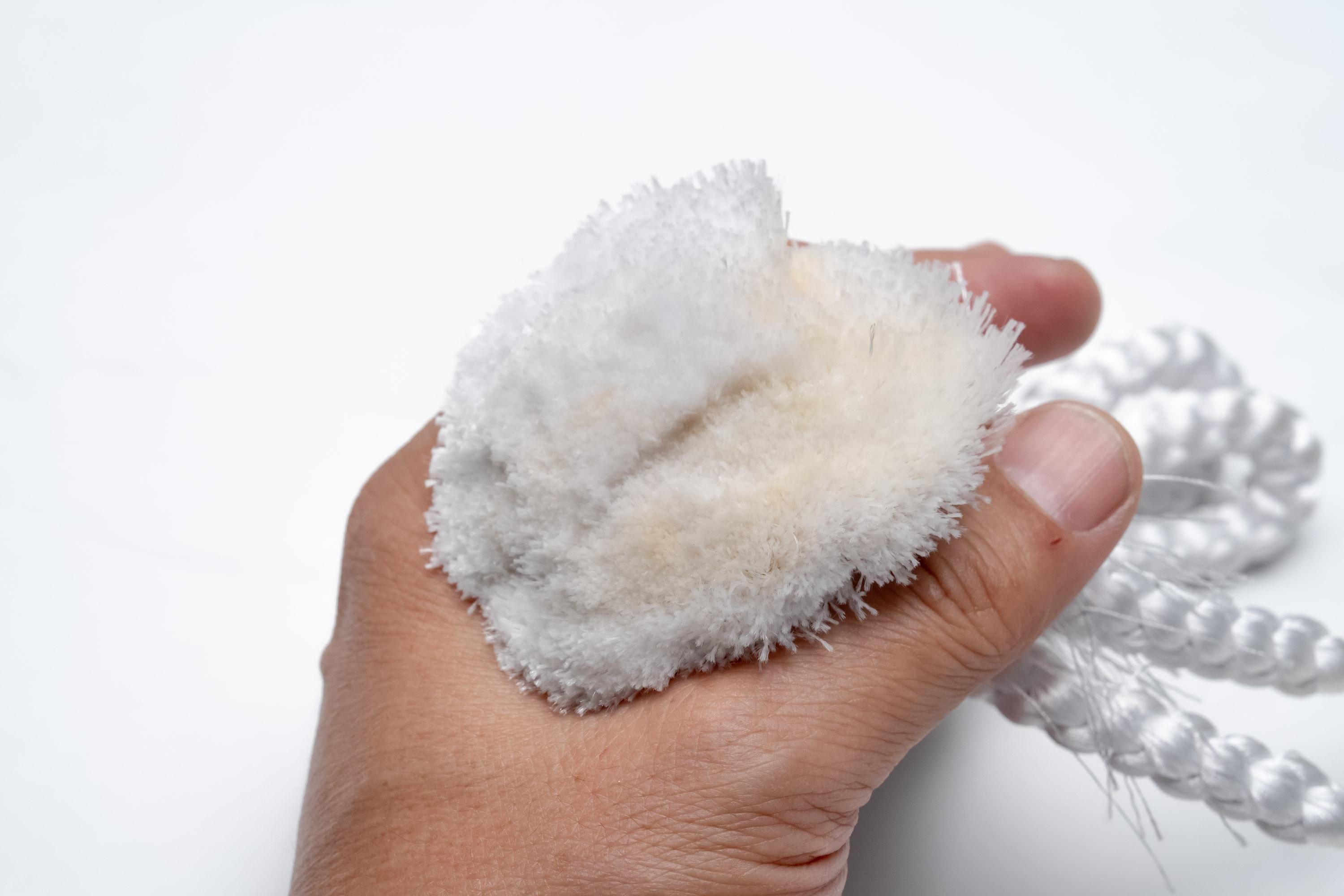 NOTE: Visible discoloration on the top of tassles. One stain spot near the hook.