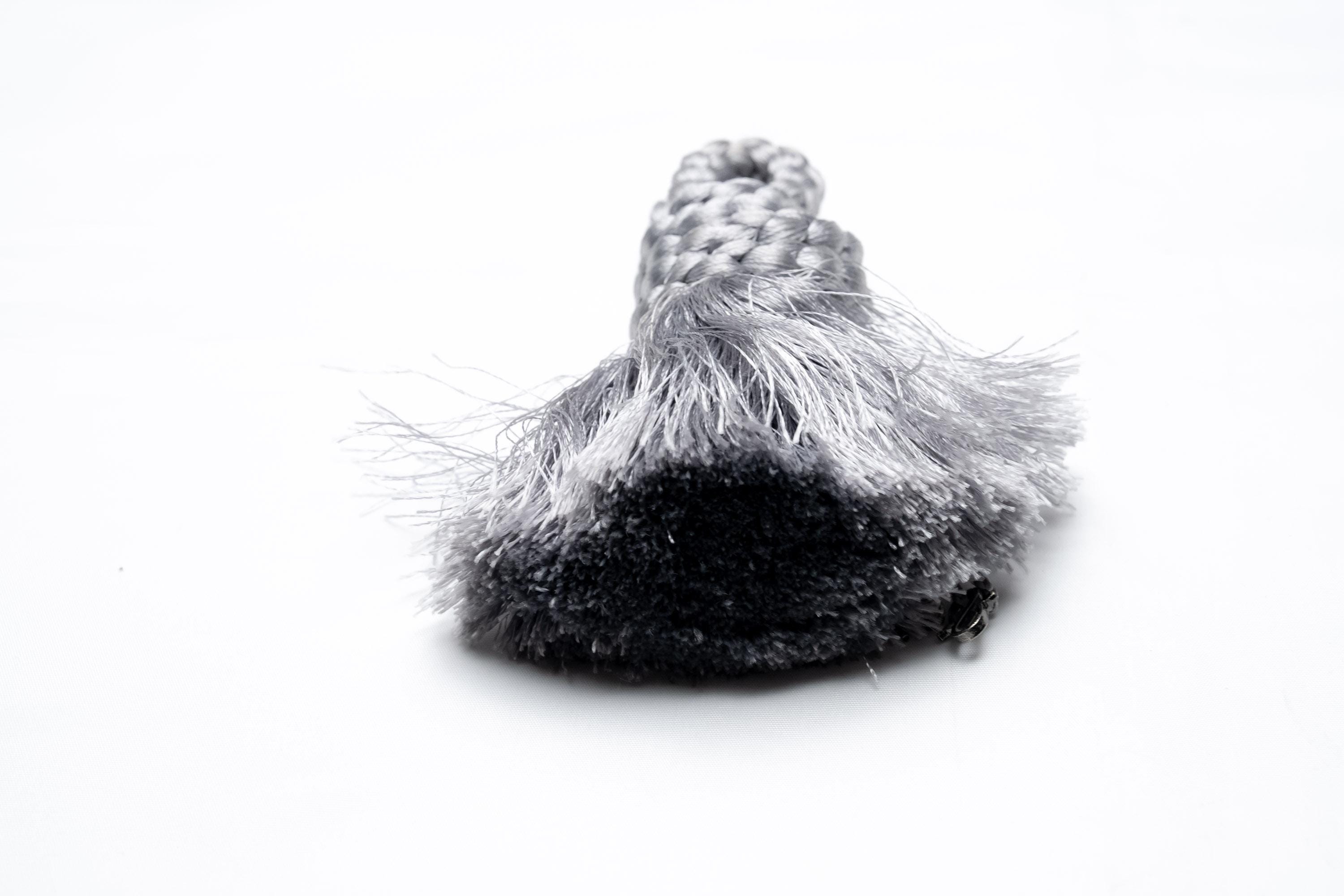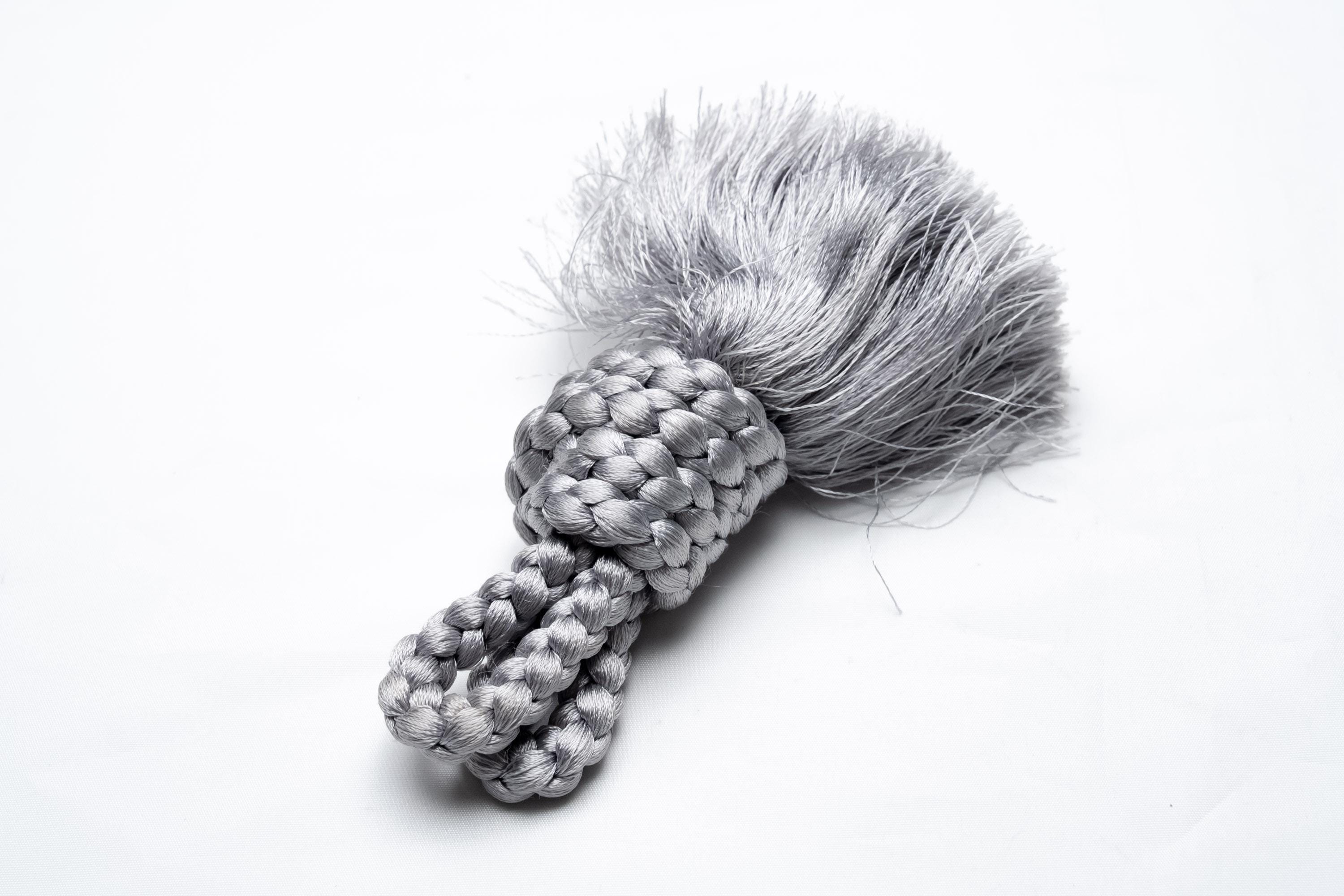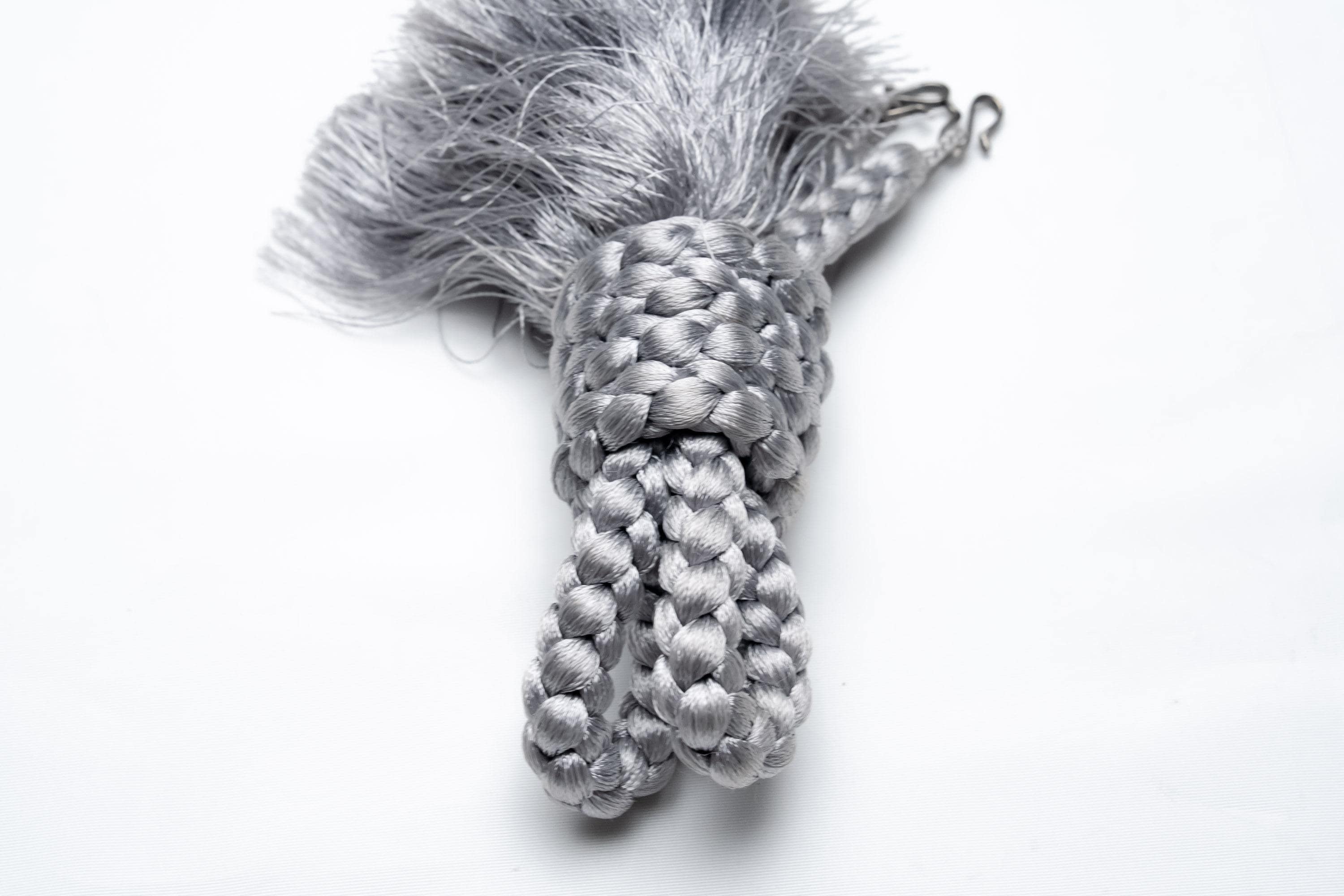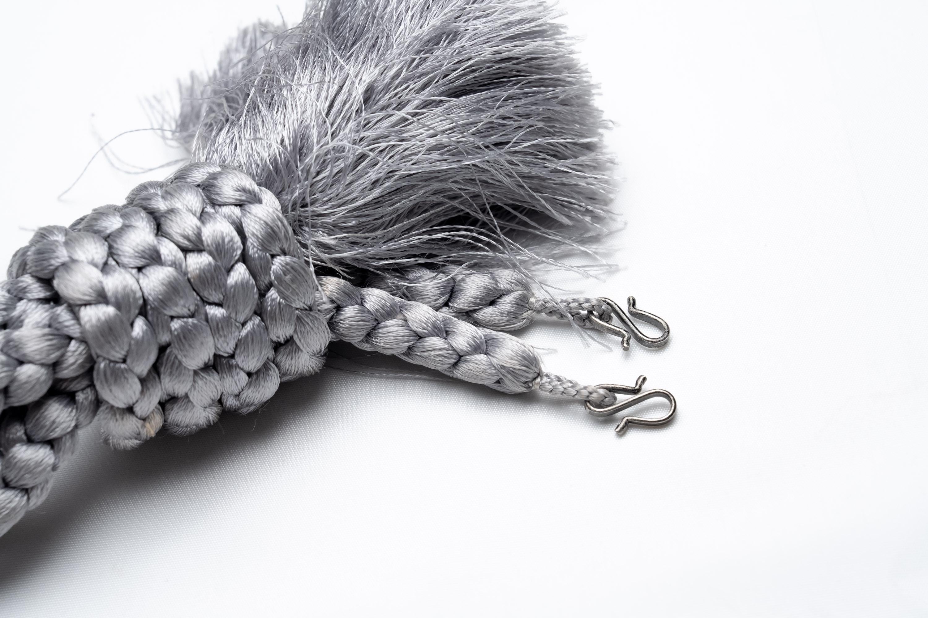 Haorihimos are short, woven cords being attached to inside seam of Haori collar as a formal accessory. They generally come with hooks on ends of the cord that will hang on to the loops on each side of Haori collar making a floating tassel decoration in the center.