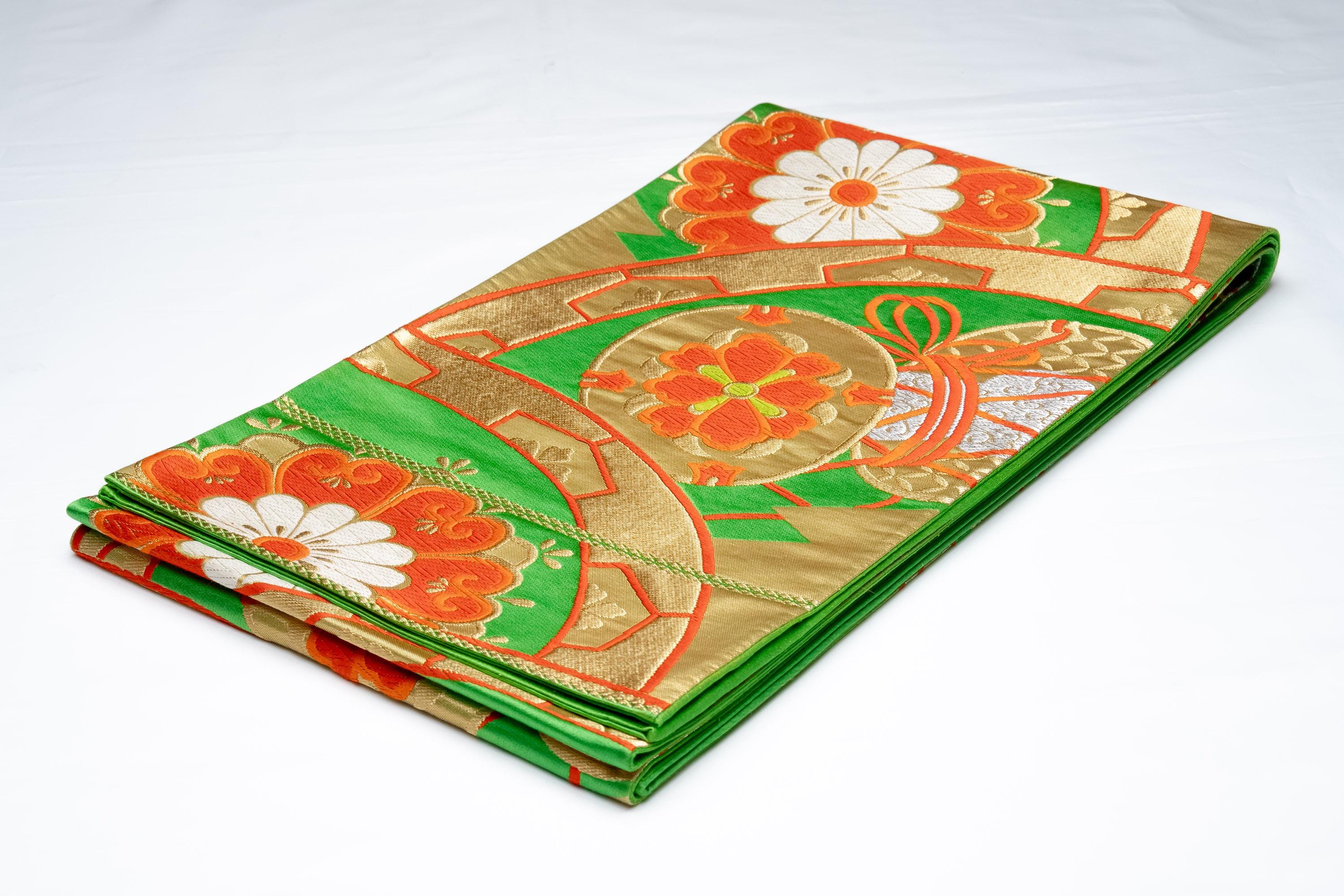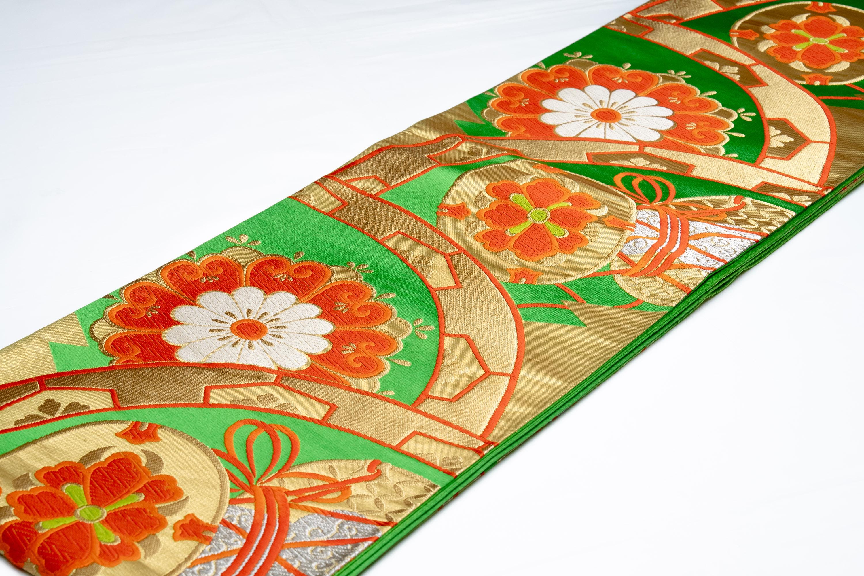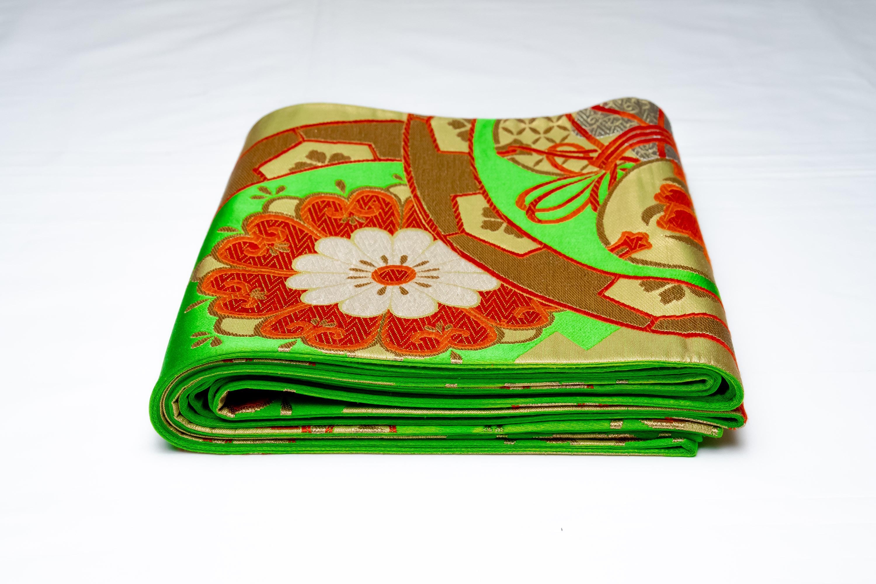 Fukuro Obi is a full-size sash belt that wraps around the torso in women's formal Kimono wearing. It is wider, longer and heavier than other informal Obis and serves the purpose of keeping the Kimono front closed securely, drawing up excess fabric to adjust the length of Kimono, and decorative expressions.