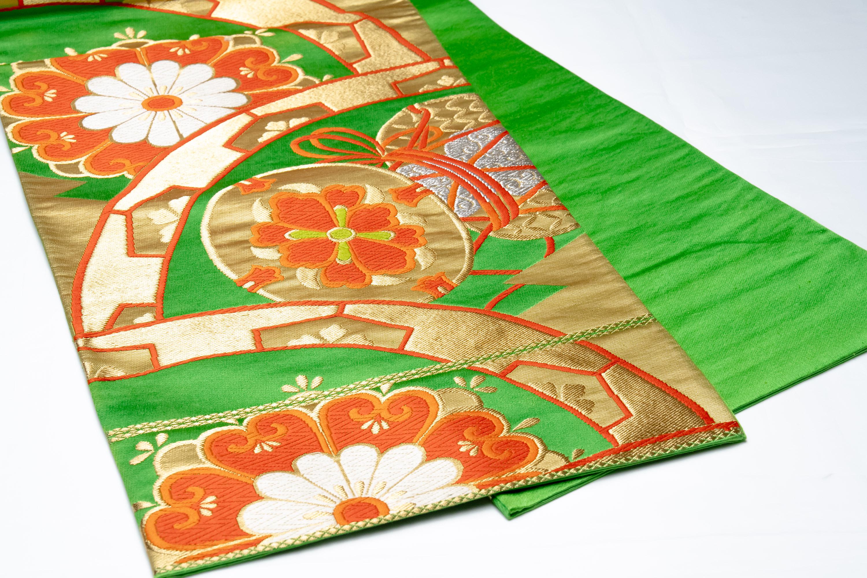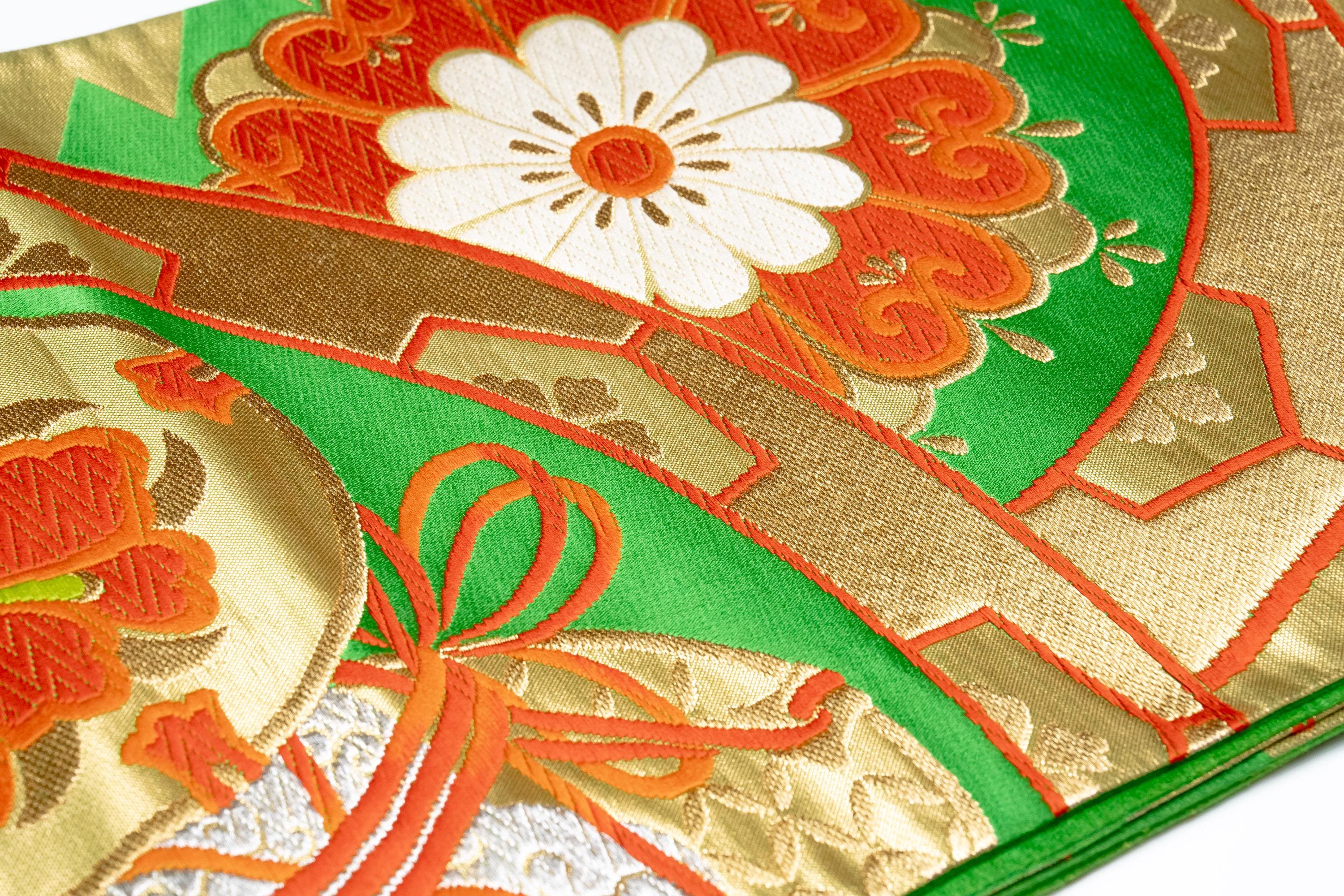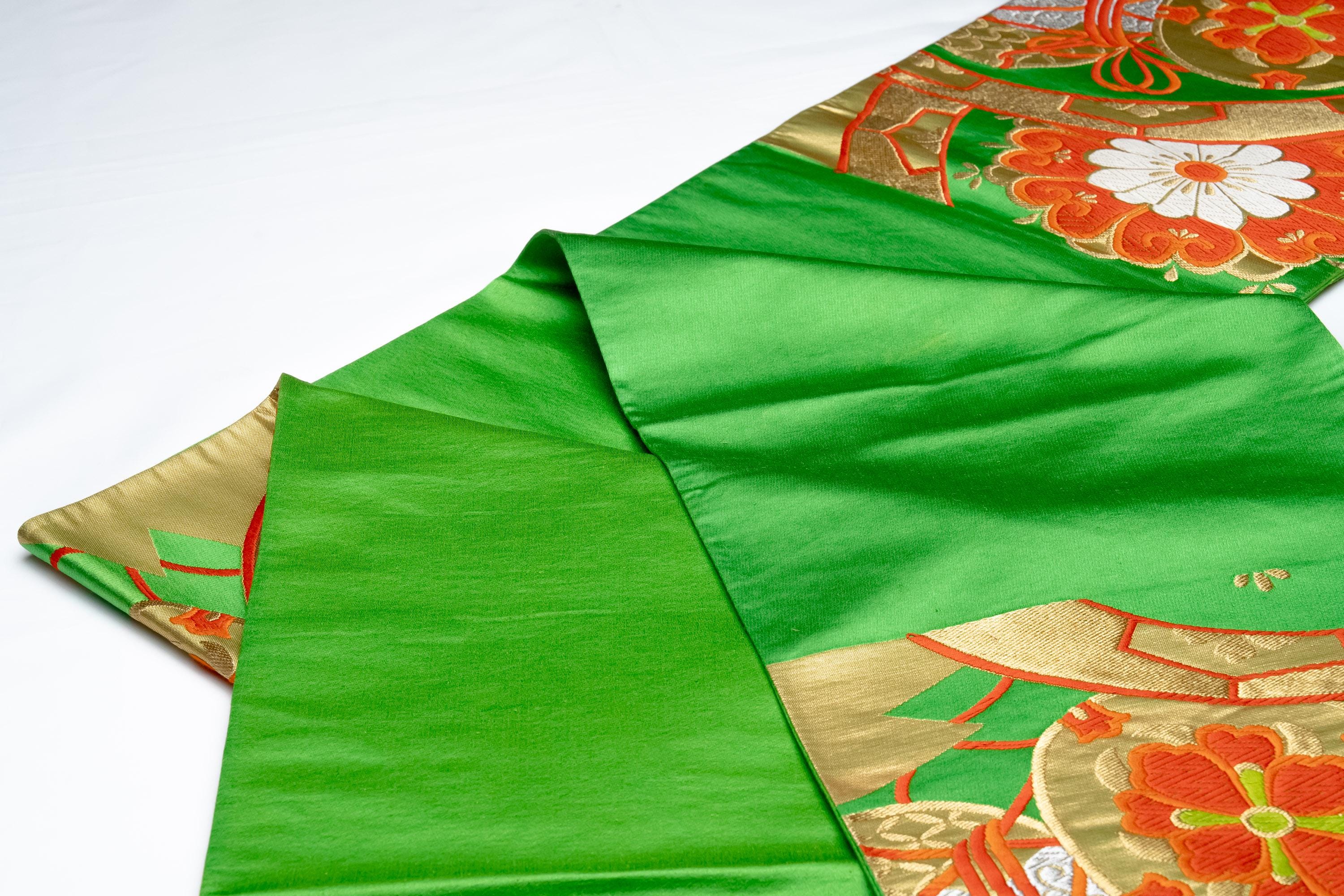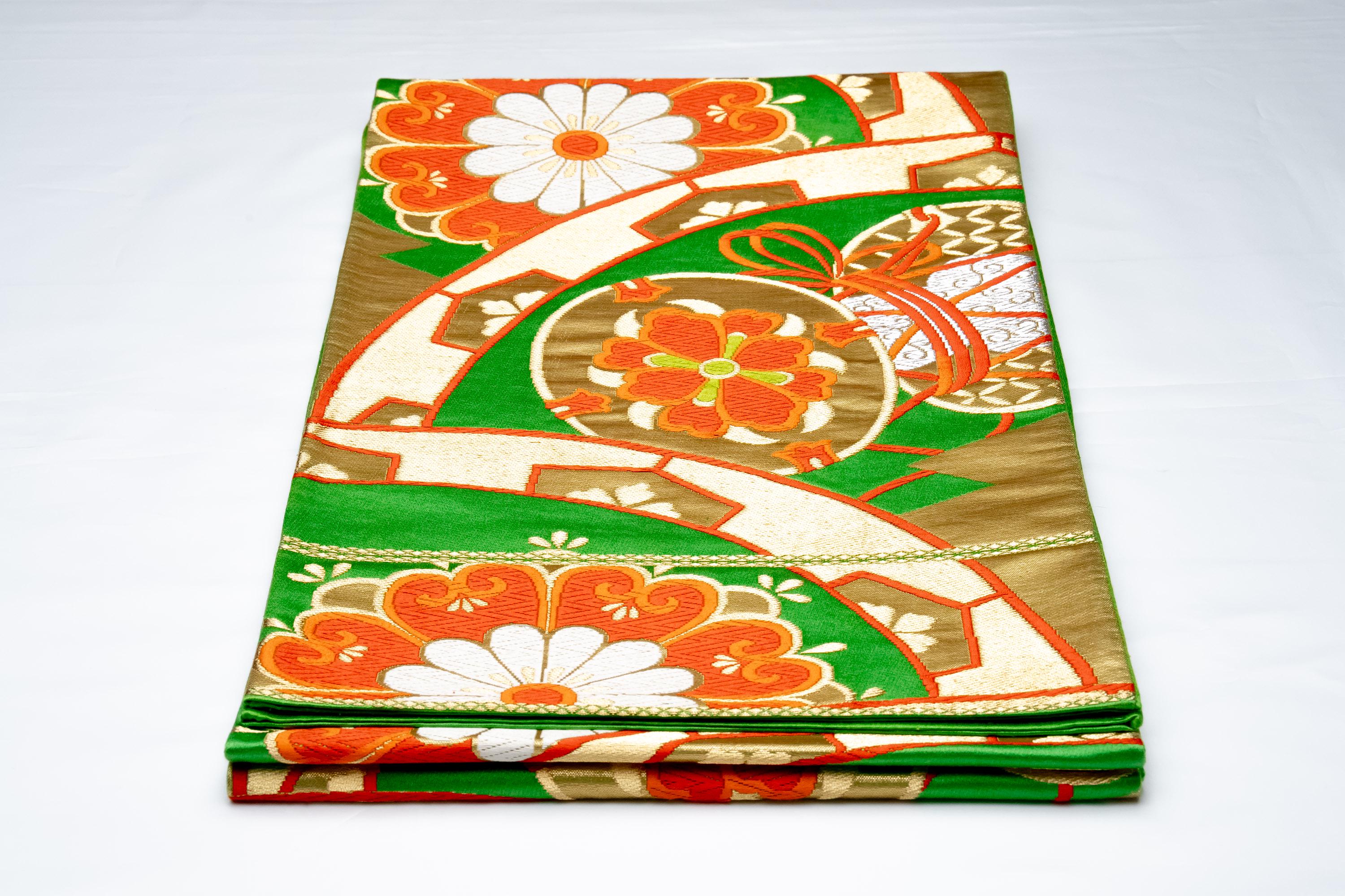 Fukuro Obi is a full-size sash belt that wraps around the torso in women's formal Kimono wearing. It is wider, longer and heavier than other informal Obis and serves the purpose of keeping the Kimono front closed securely, drawing up excess fabric to adjust the length of Kimono, and decorative expressions.