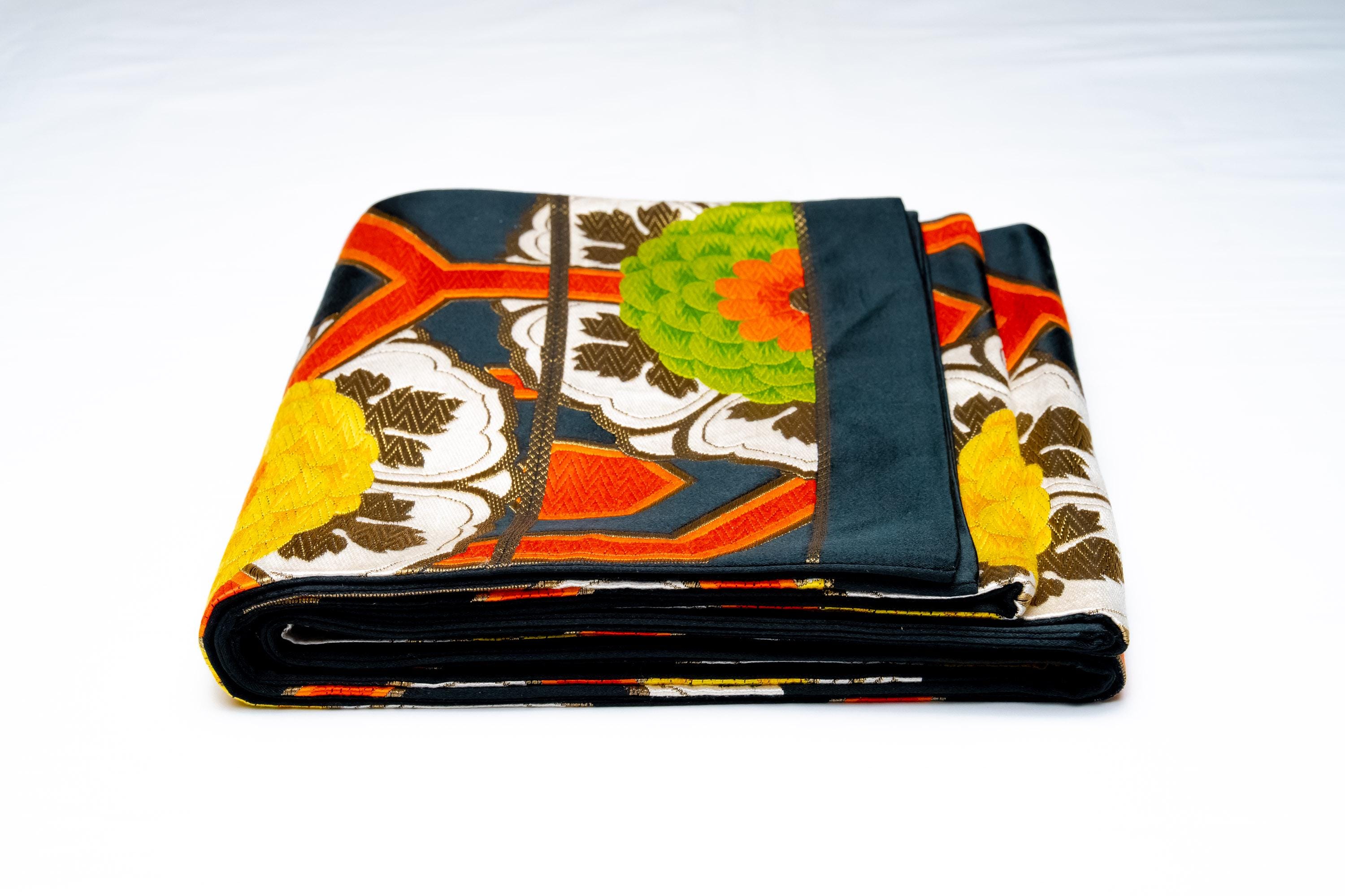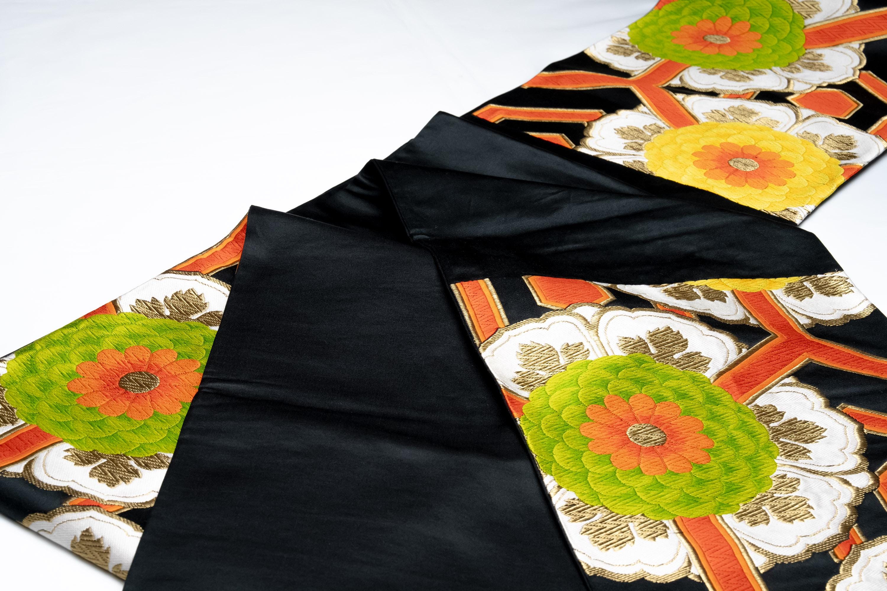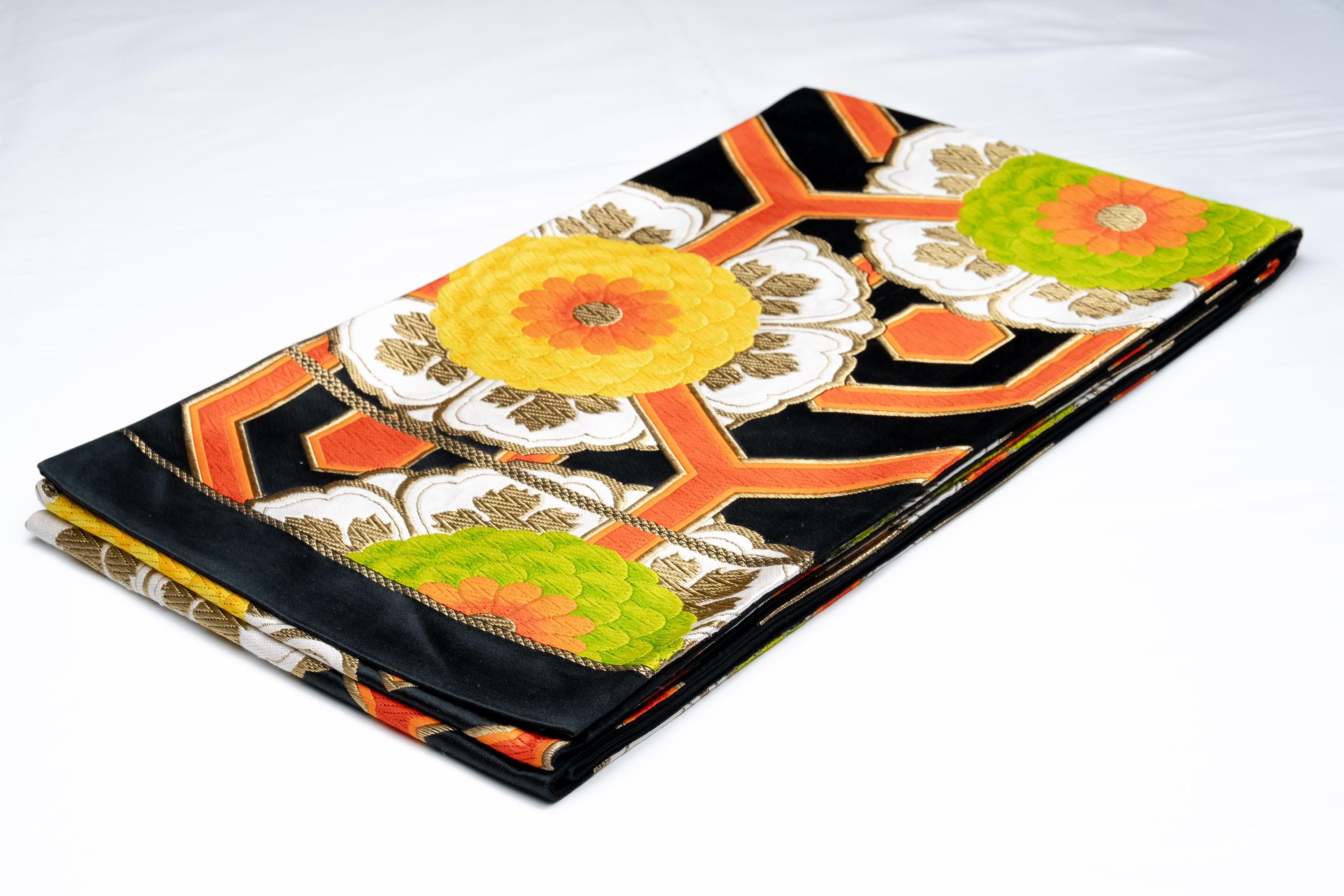 Fukuro Obi is a full-size sash belt that wraps around the torso in women's formal Kimono wearing. It is wider, longer and heavier than other informal Obis and serves the purpose of keeping the Kimono front closed securely, drawing up excess fabric to adjust the length of Kimono, and decorative expressions.