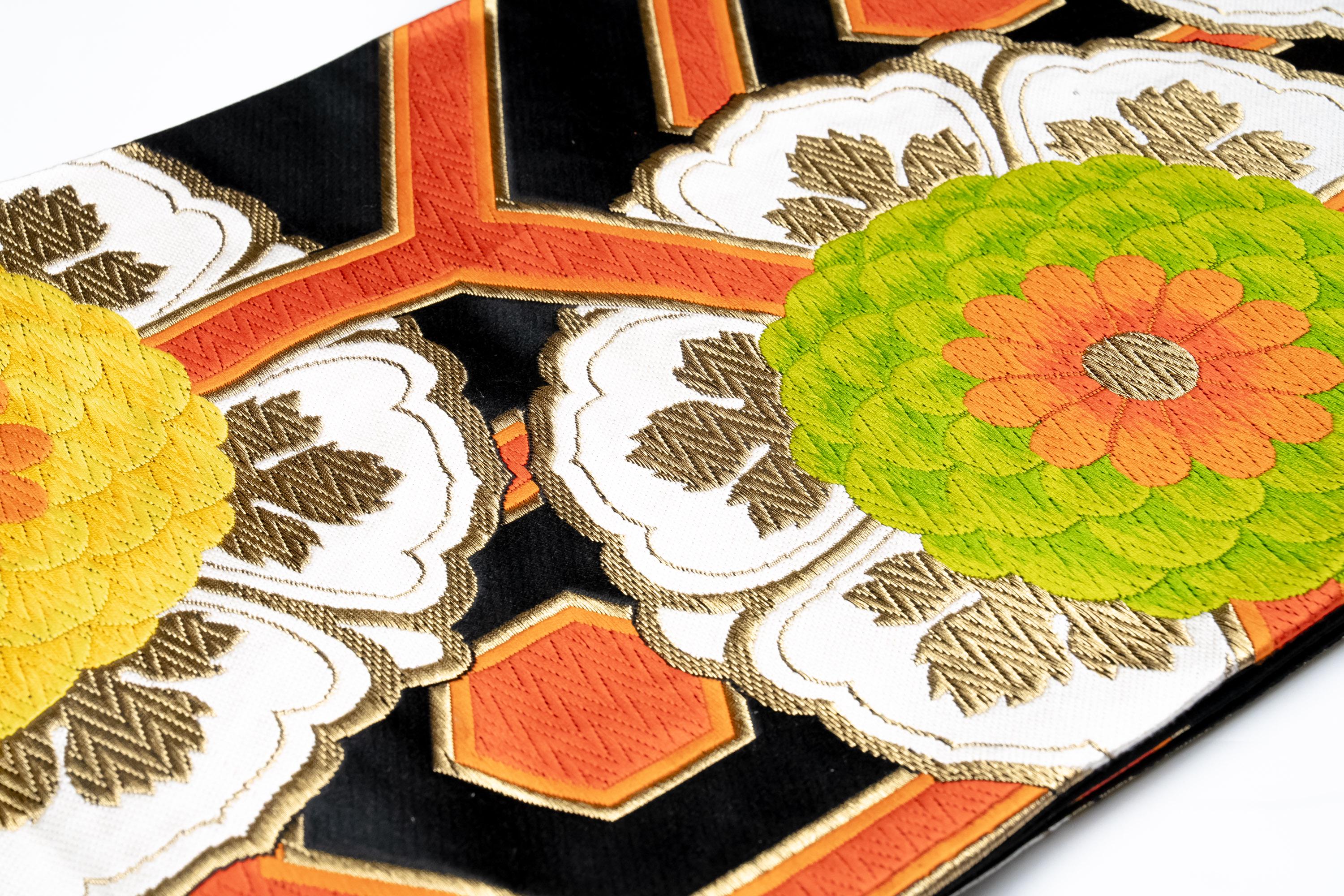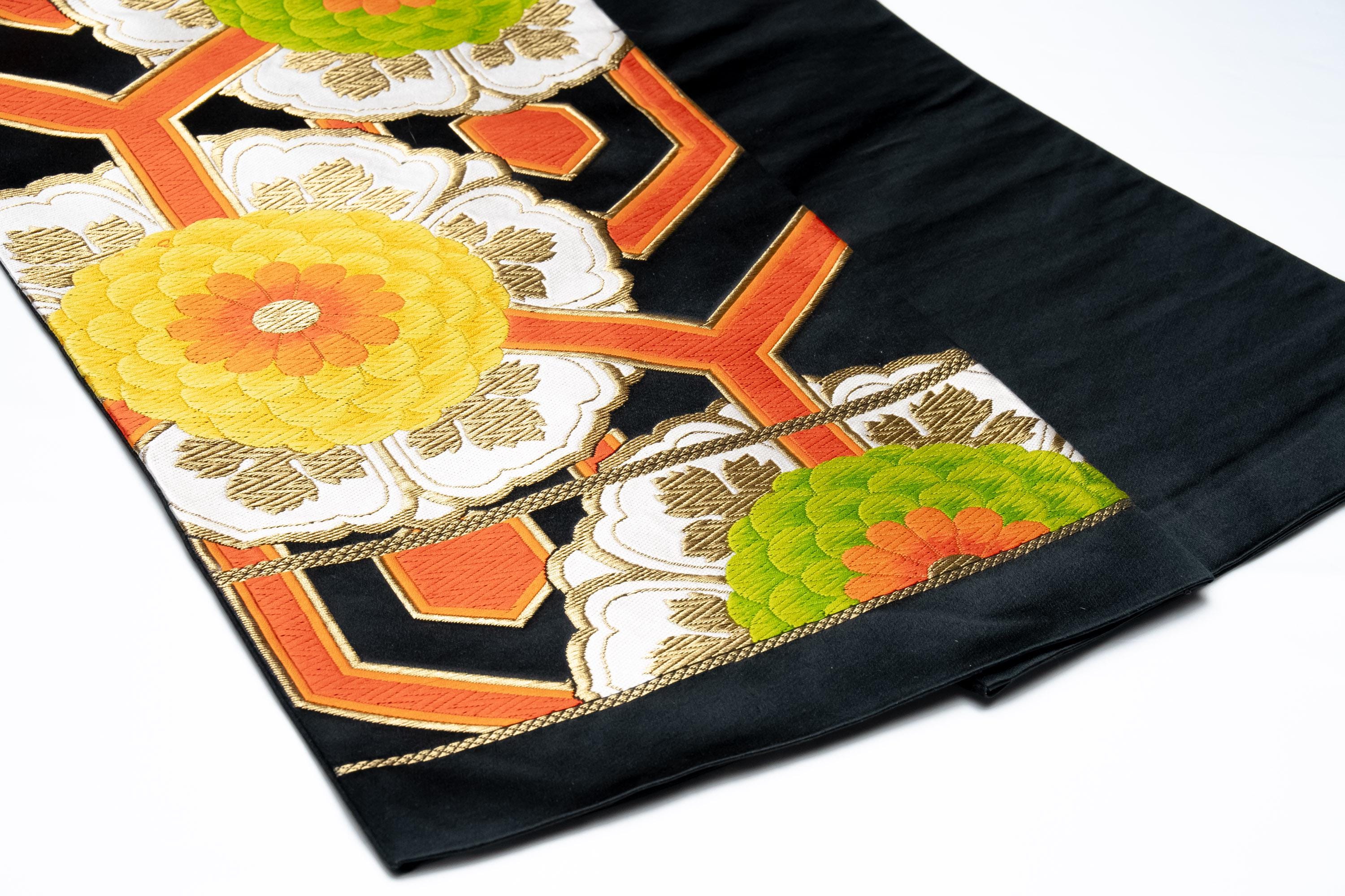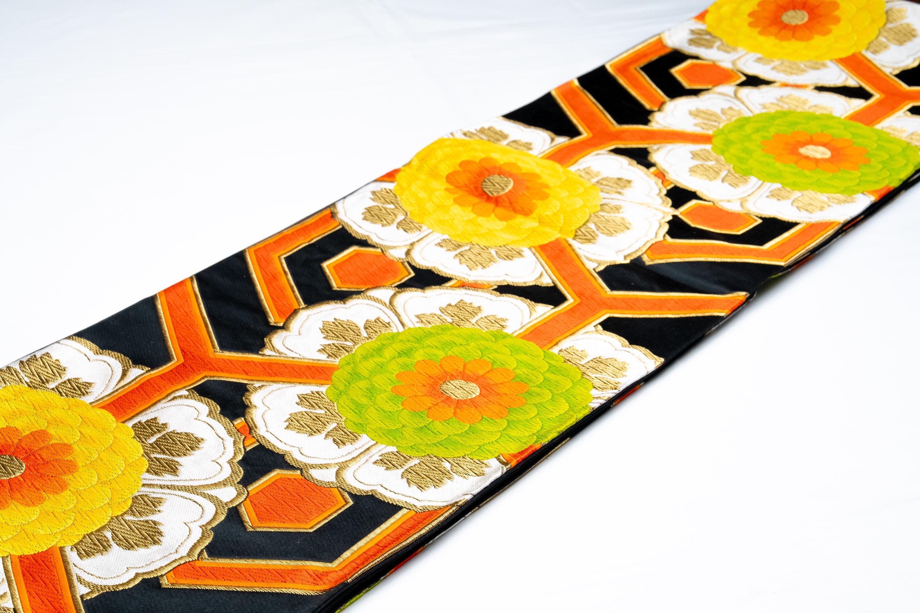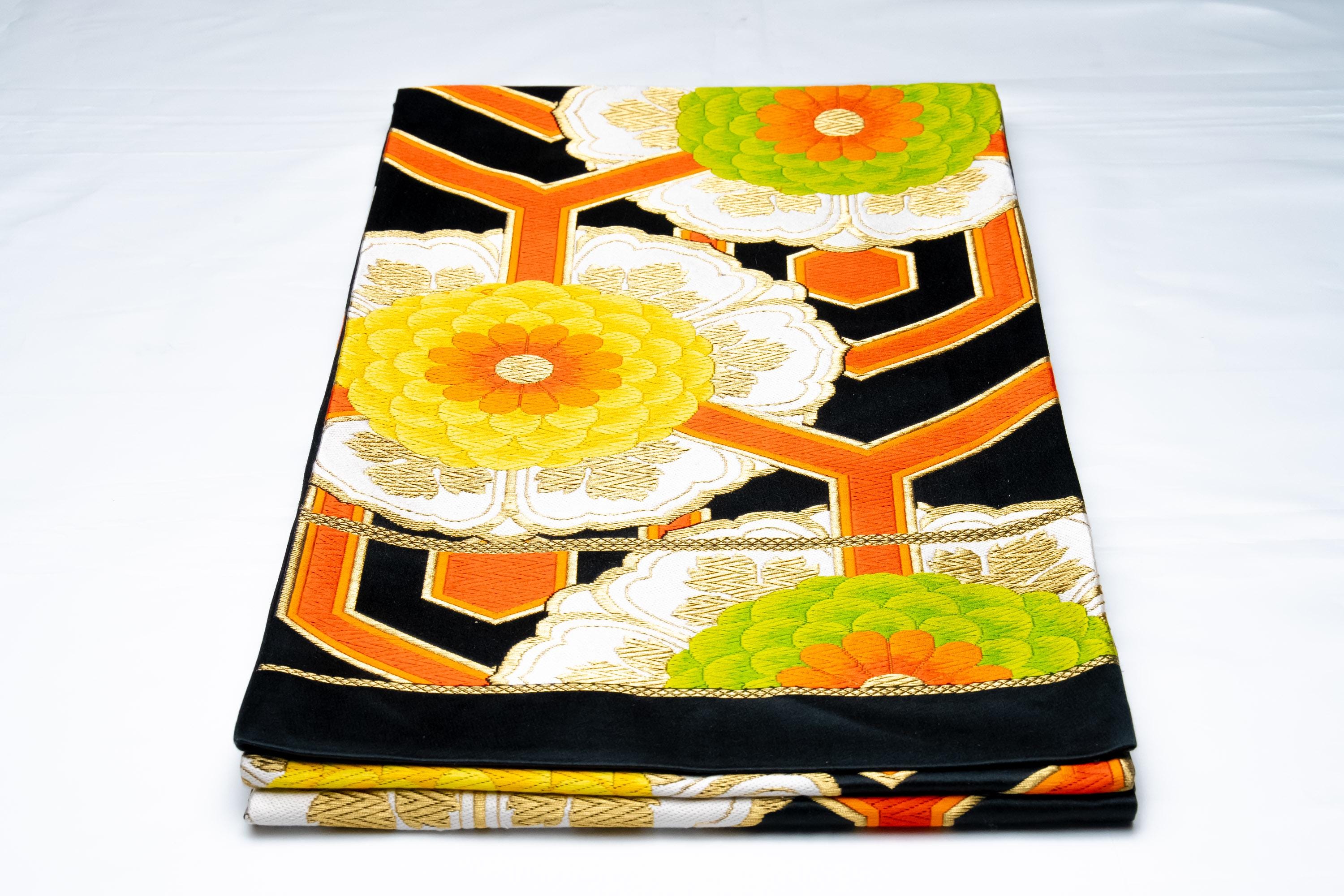 Fukuro Obi is a full-size sash belt that wraps around the torso in women's formal Kimono wearing. It is wider, longer and heavier than other informal Obis and serves the purpose of keeping the Kimono front closed securely, drawing up excess fabric to adjust the length of Kimono, and decorative expressions.