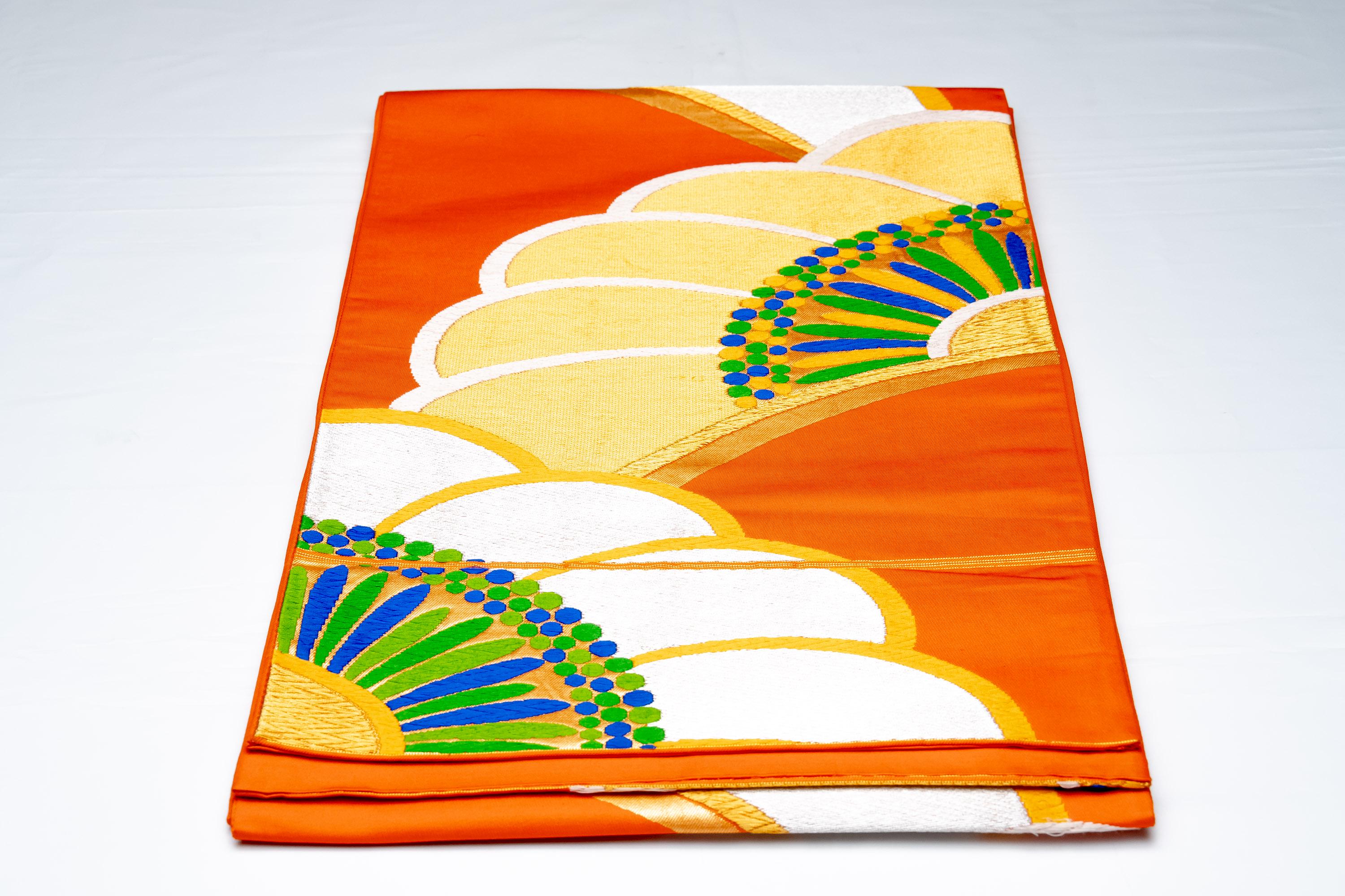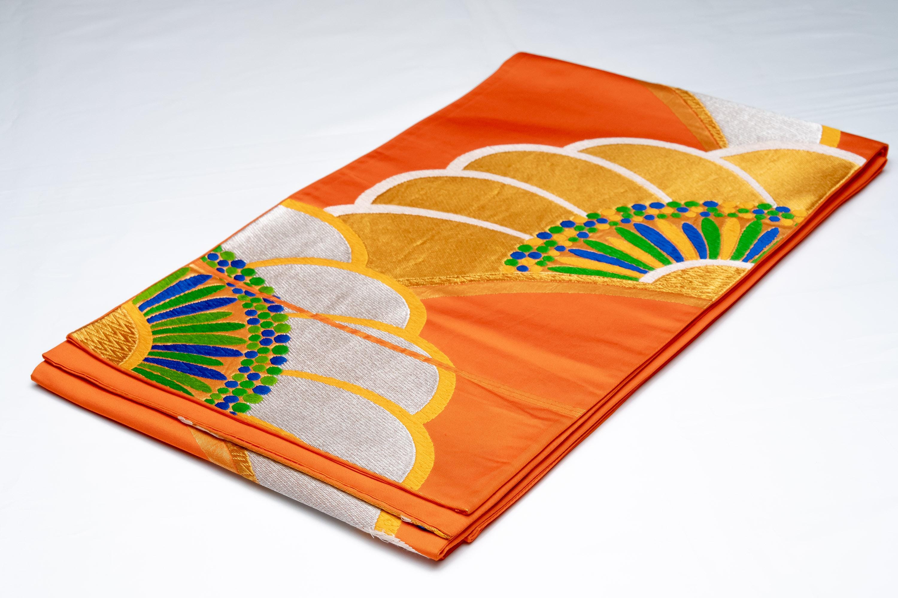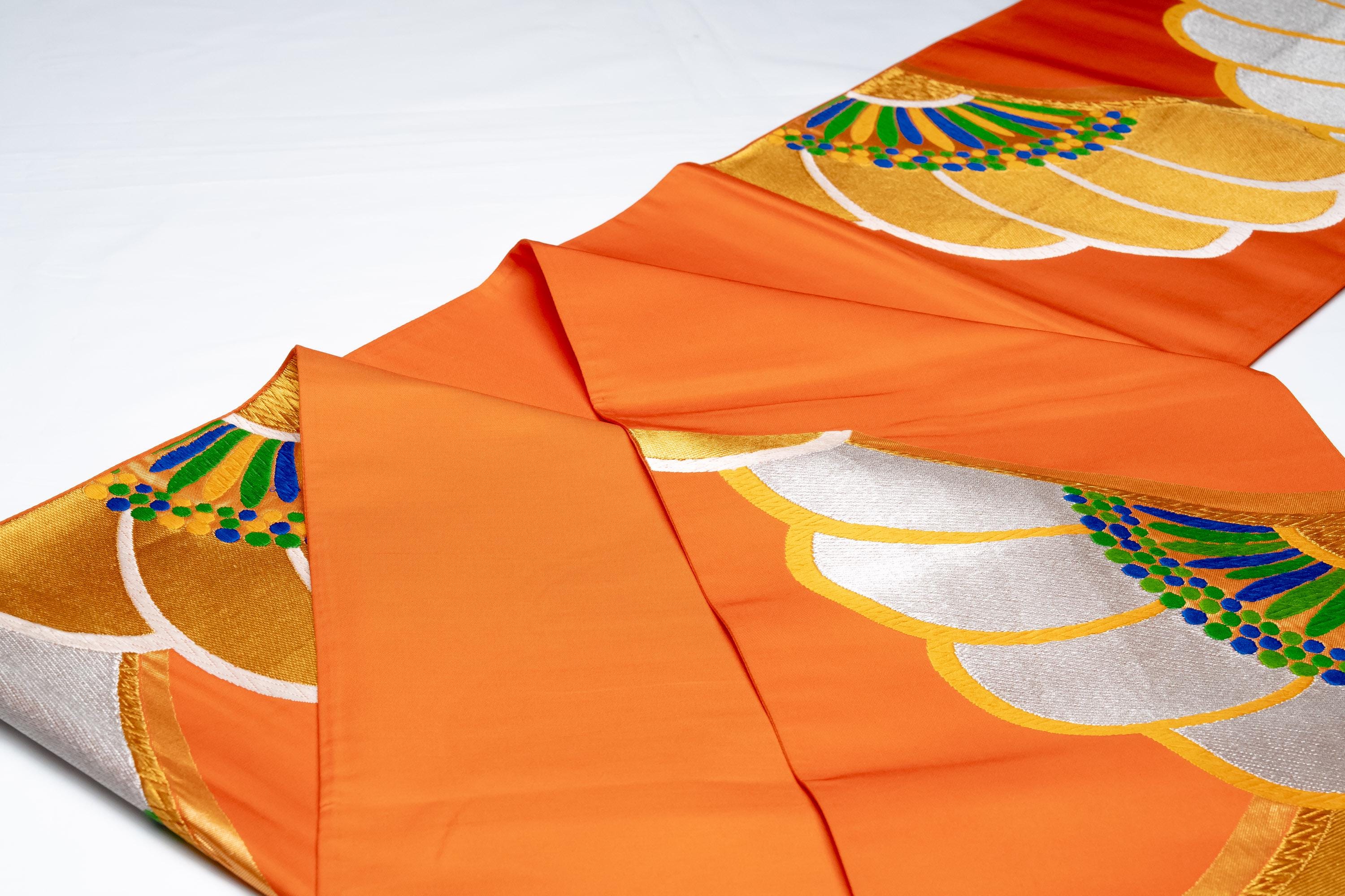 Fukuro Obi is a full-size sash belt that wraps around the torso in women's formal Kimono wearing. It is wider, longer and heavier than other informal Obis and serves the purpose of keeping the Kimono front closed securely, drawing up excess fabric to adjust the length of Kimono, and decorative expressions.