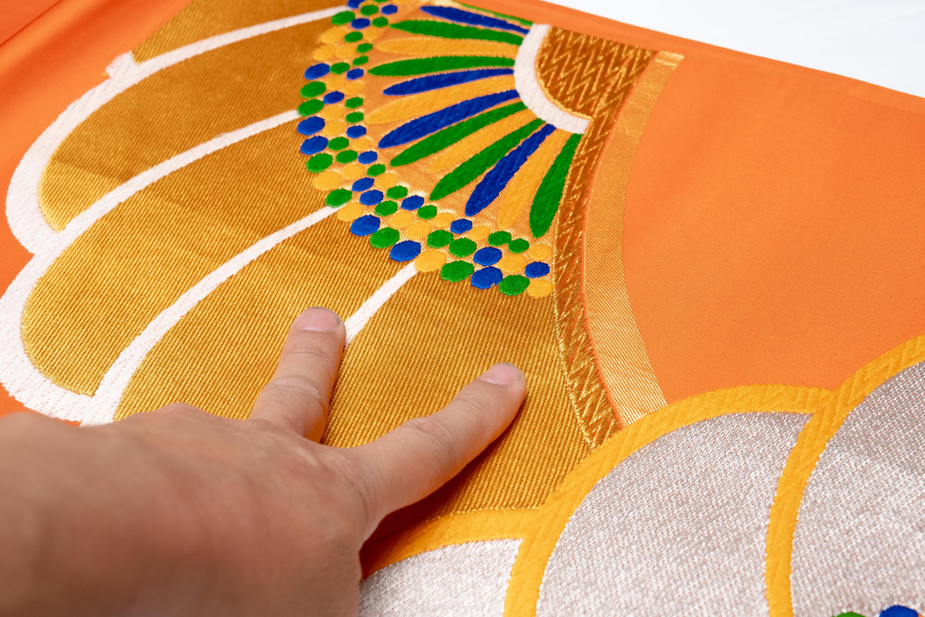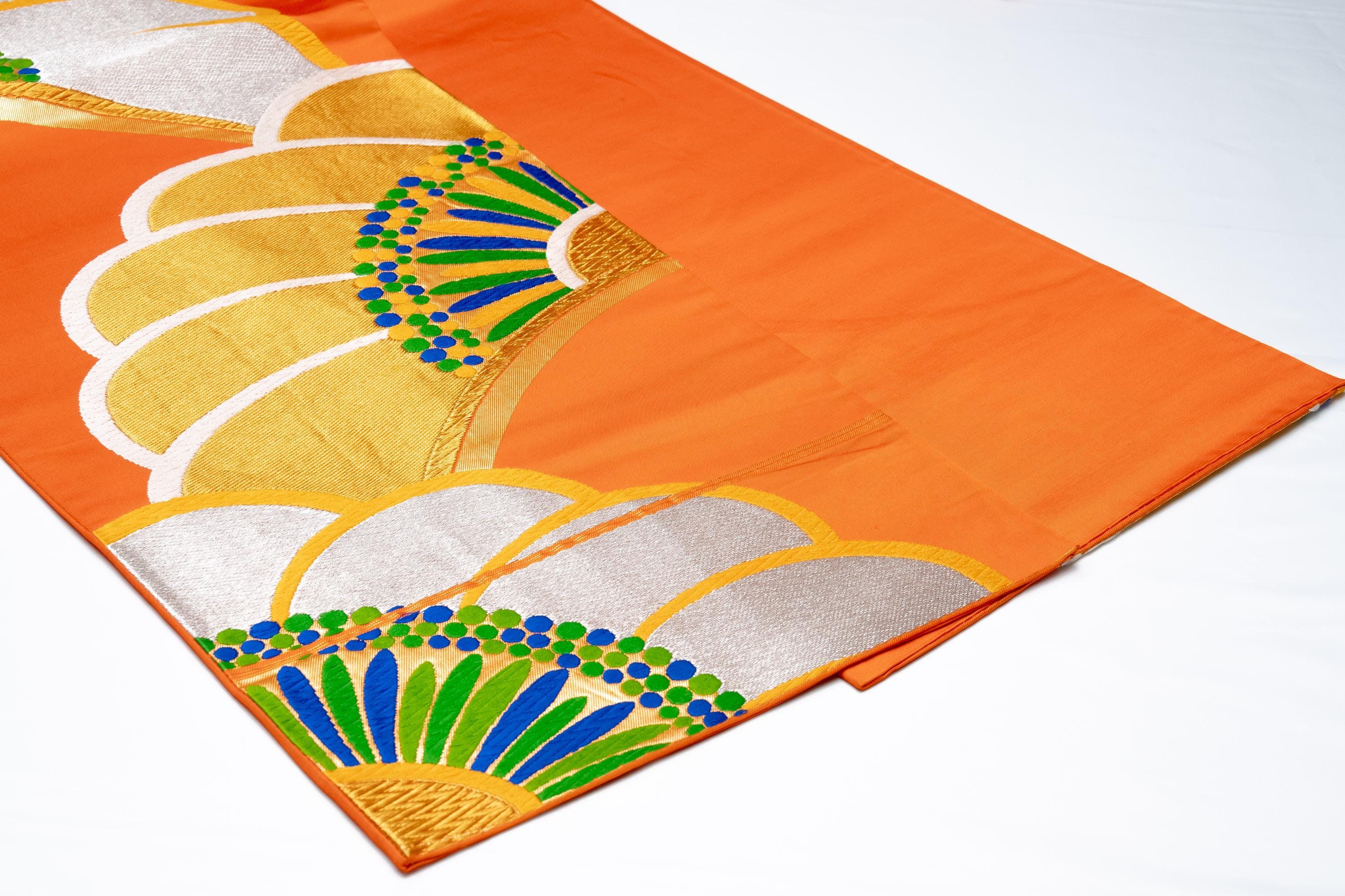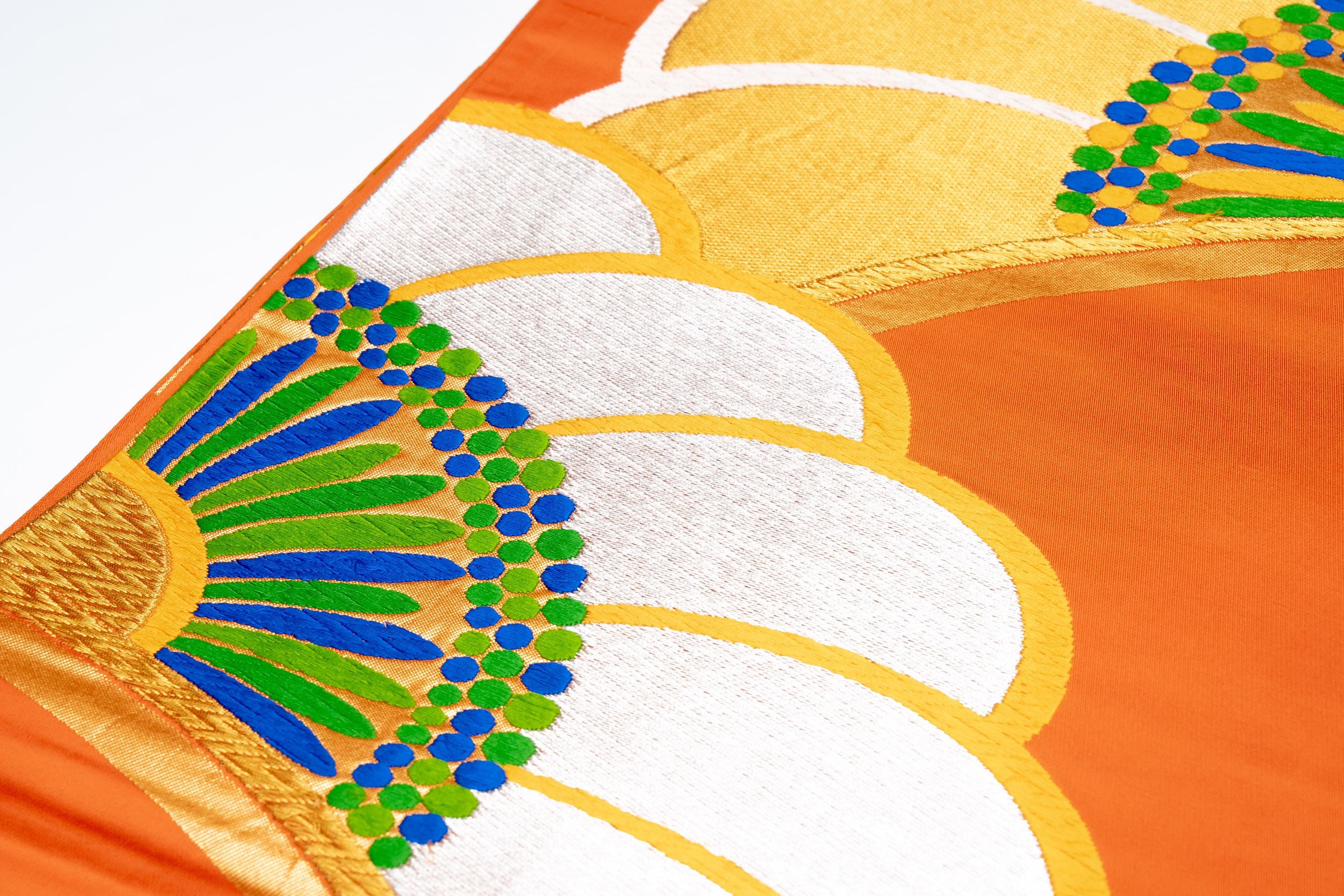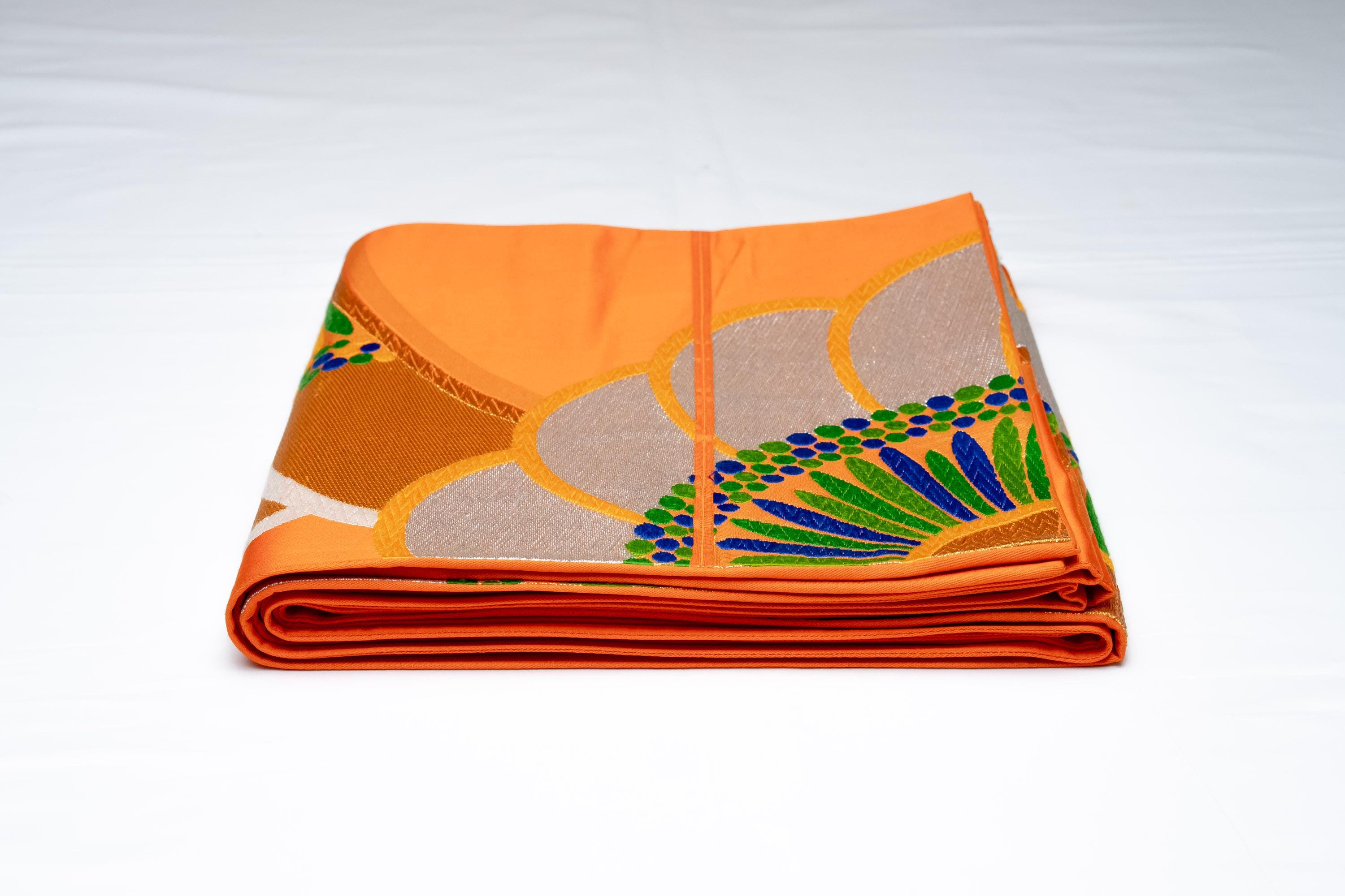 Fukuro Obi is a full-size sash belt that wraps around the torso in women's formal Kimono wearing. It is wider, longer and heavier than other informal Obis and serves the purpose of keeping the Kimono front closed securely, drawing up excess fabric to adjust the length of Kimono, and decorative expressions.