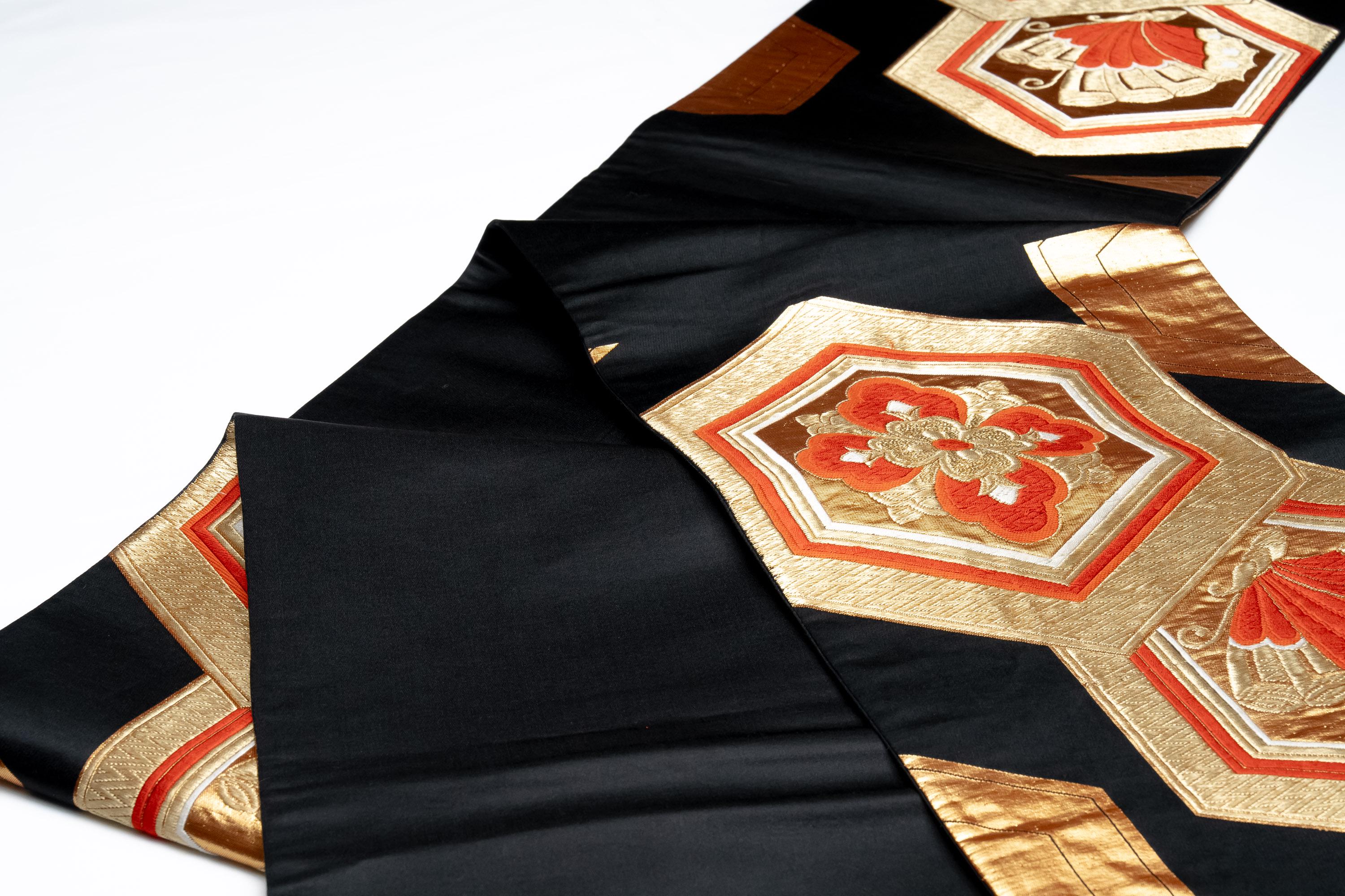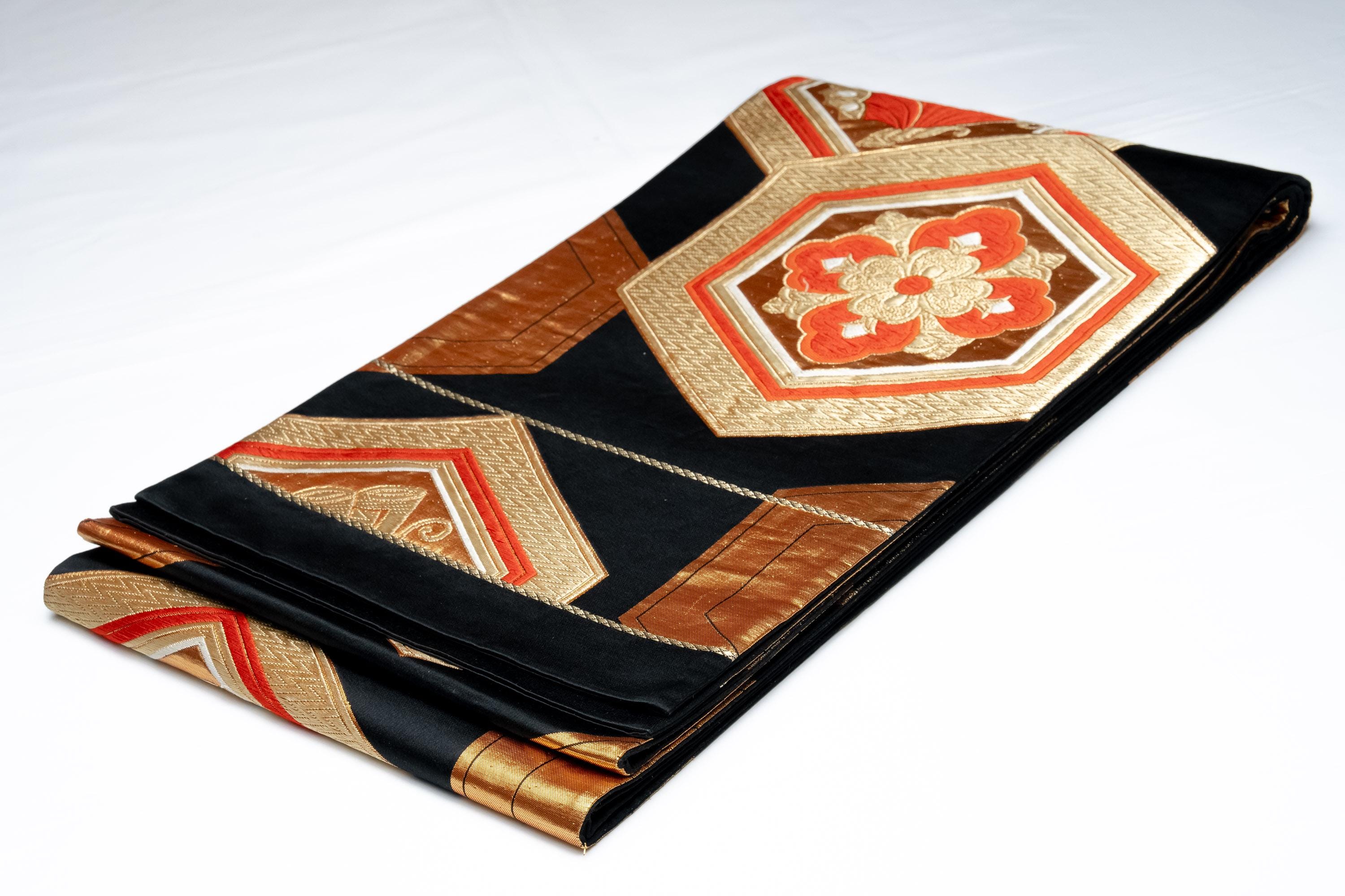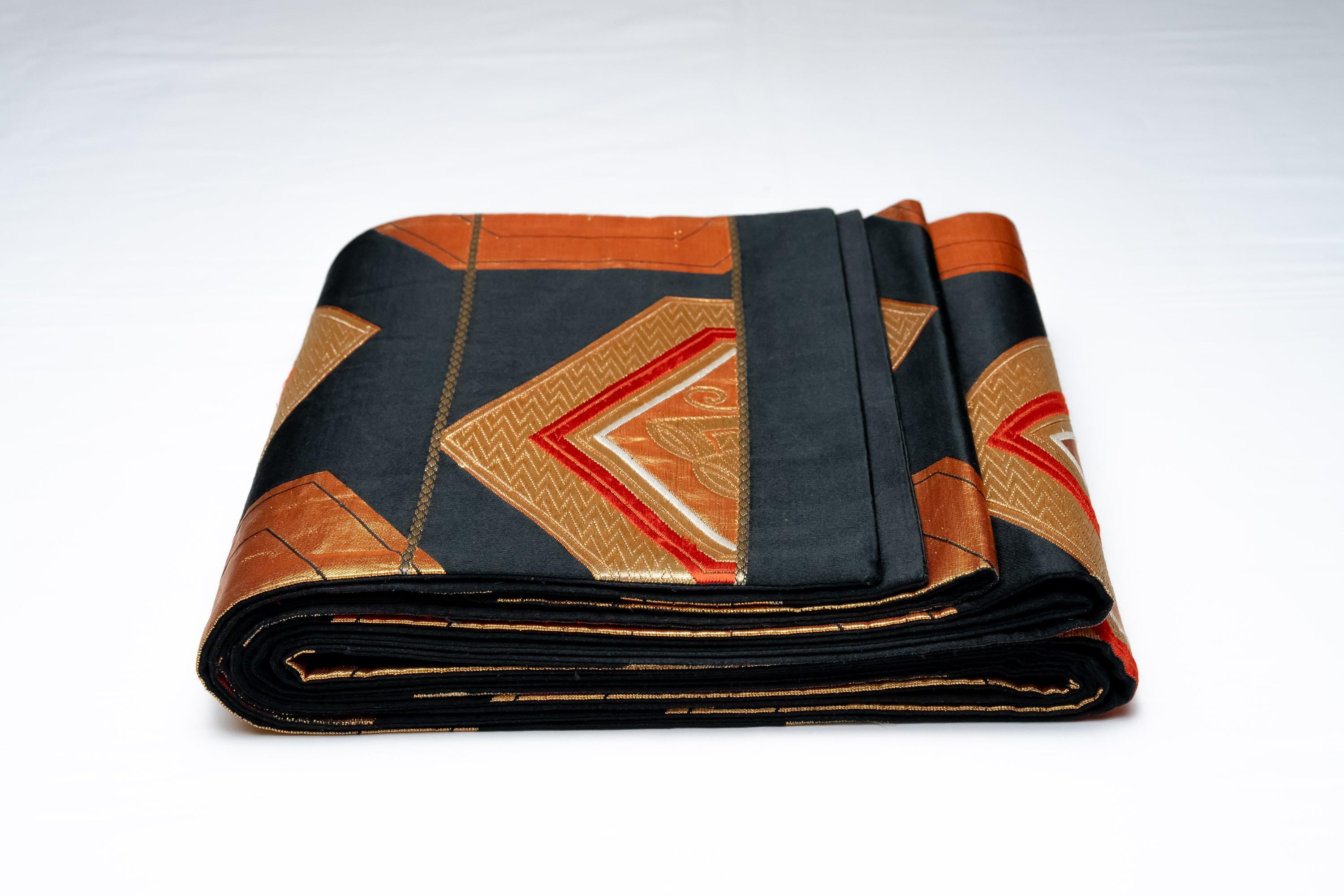 Fukuro Obi is a full-size sash belt that wraps around the torso in women's formal Kimono wearing. It is wider, longer and heavier than other informal Obis and serves the purpose of keeping the Kimono front closed securely, drawing up excess fabric to adjust the length of Kimono, and decorative expressions.