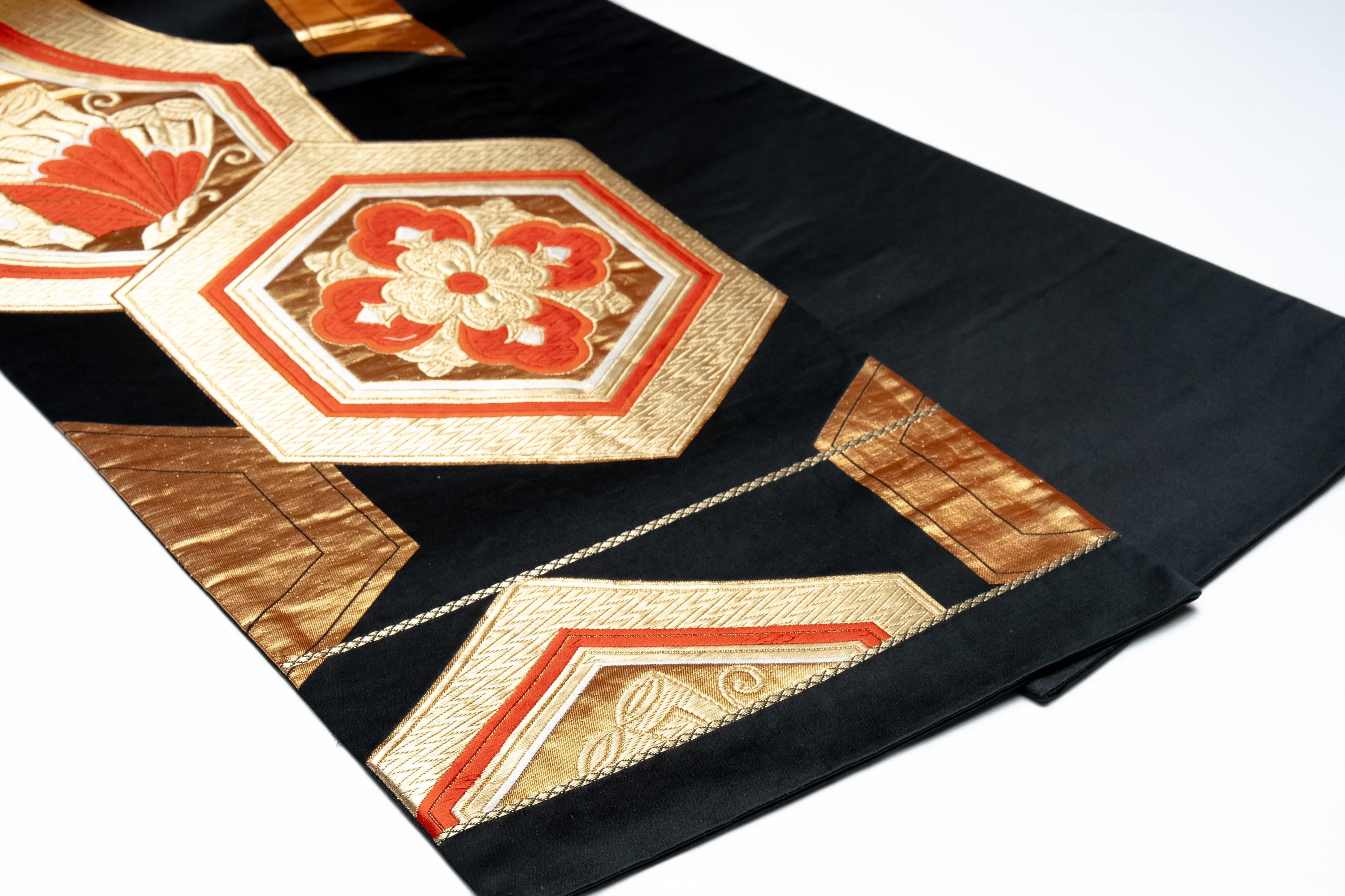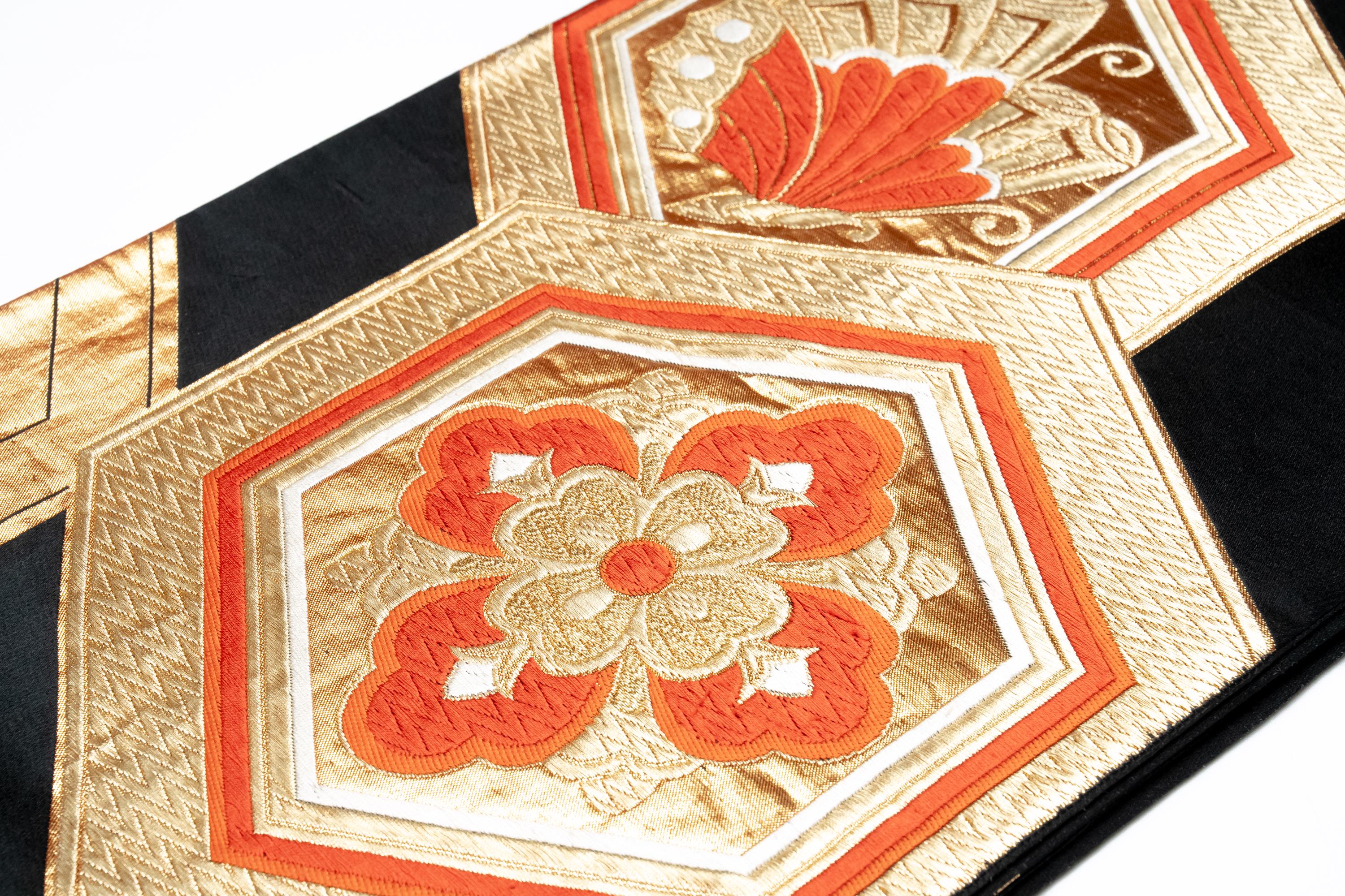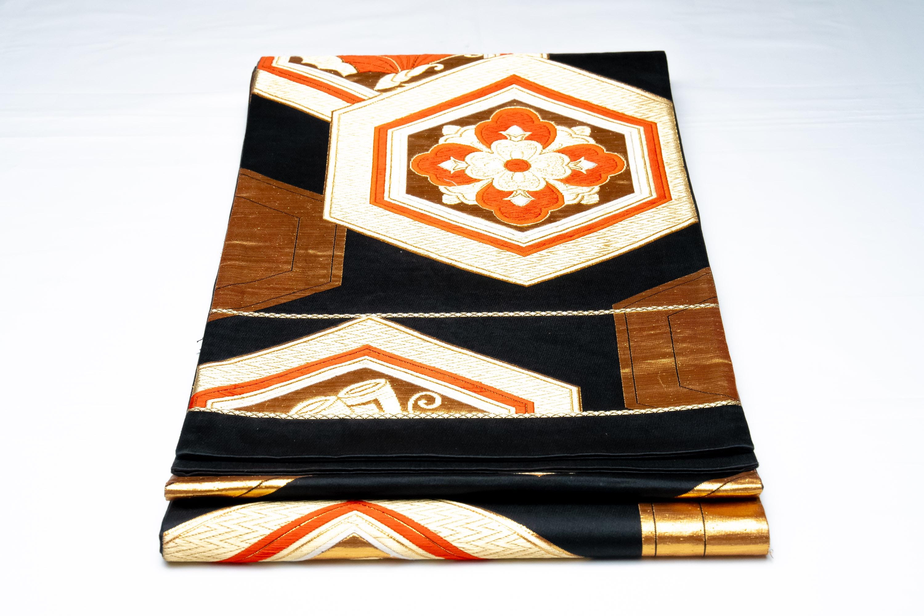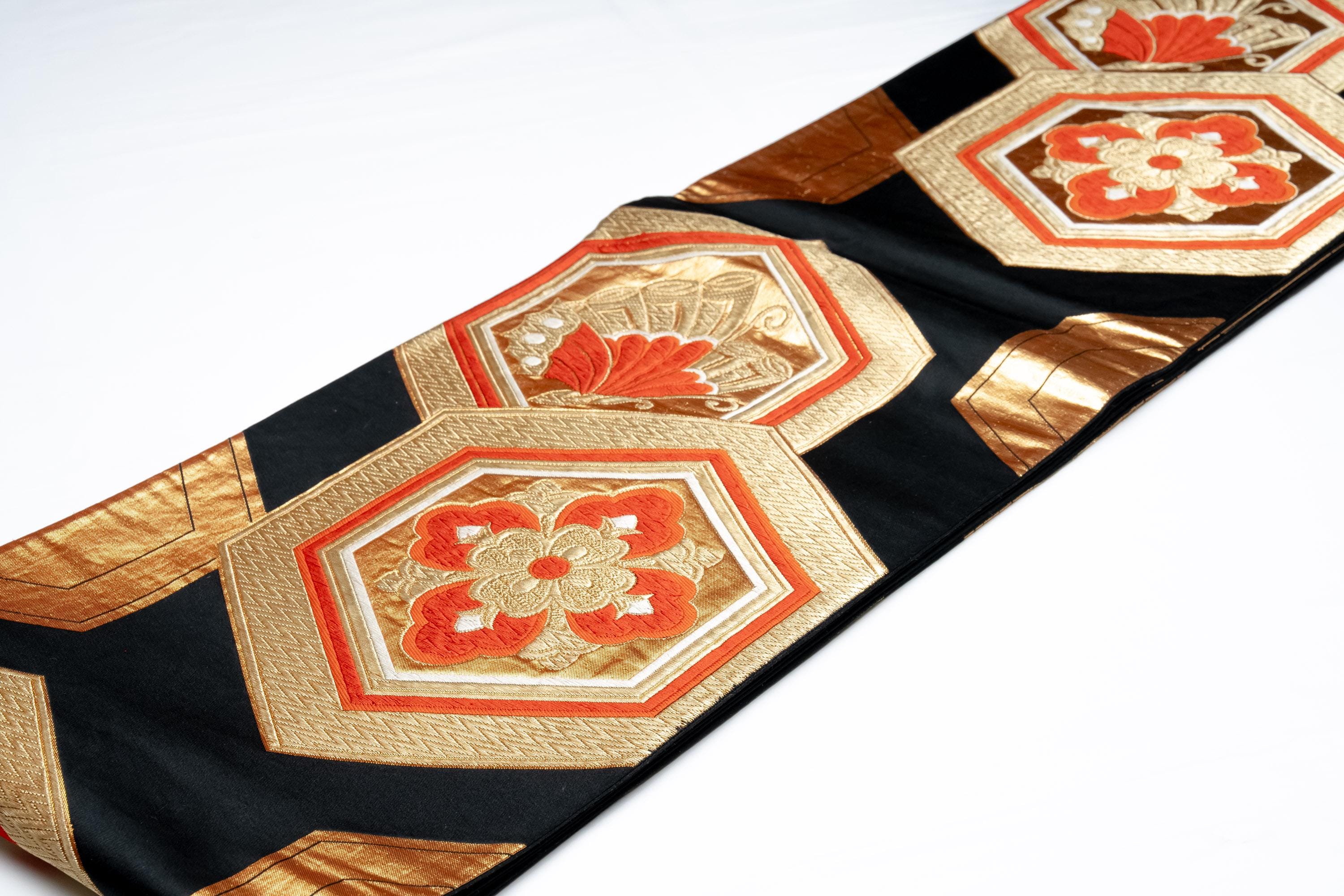 Fukuro Obi is a full-size sash belt that wraps around the torso in women's formal Kimono wearing. It is wider, longer and heavier than other informal Obis and serves the purpose of keeping the Kimono front closed securely, drawing up excess fabric to adjust the length of Kimono, and decorative expressions.