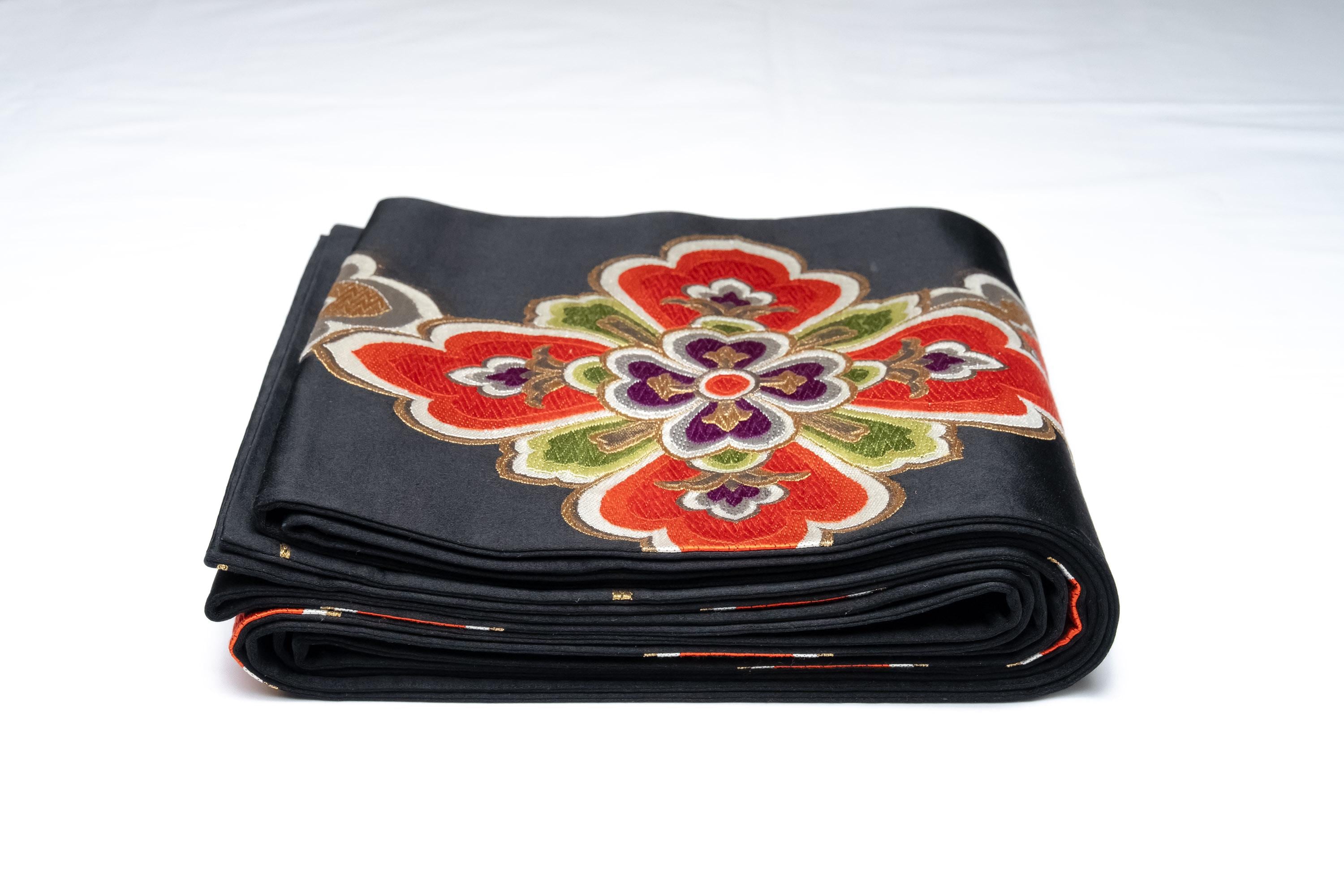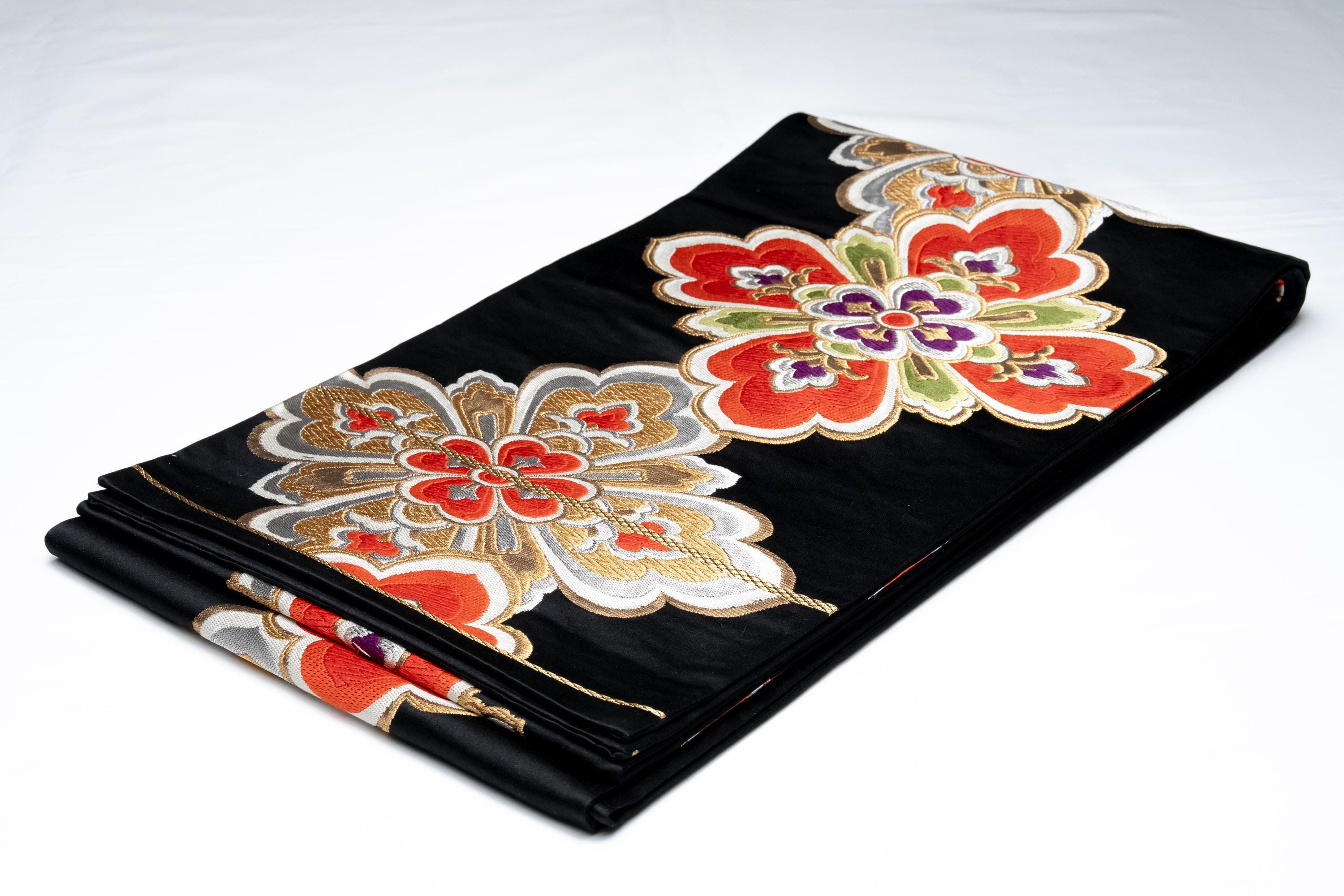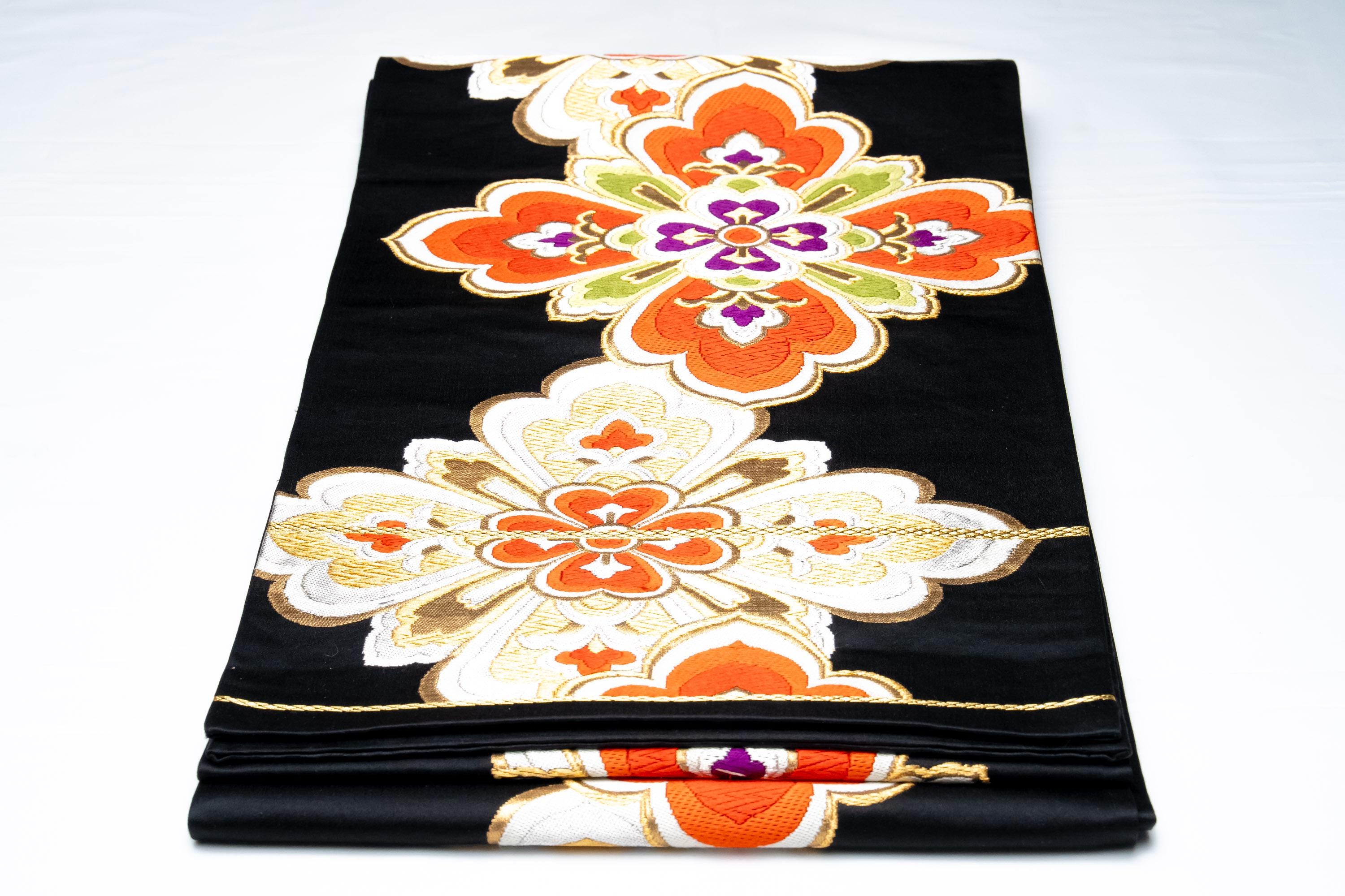 Fukuro Obi is a full-size sash belt that wraps around the torso in women's formal Kimono wearing. It is wider, longer and heavier than other informal Obis and serves the purpose of keeping the Kimono front closed securely, drawing up excess fabric to adjust the length of Kimono, and decorative expressions.