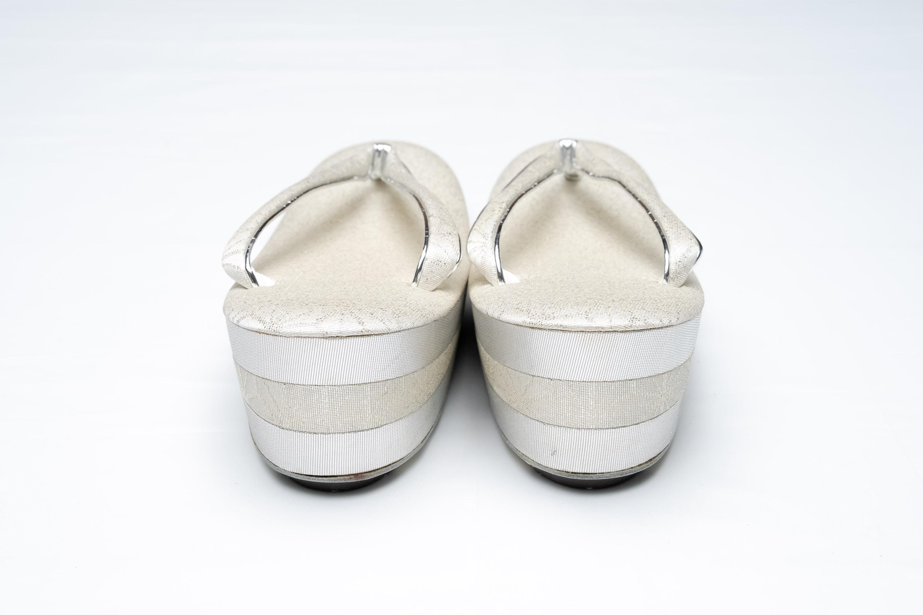 When you wear Zori with traditional Japanese formal Kimono, your heels should extend about one centimeter off the back of Zori. If your heels sit perfectly onto or shorter than the body of Zori, you might accidentally step onto the hem of your Kimono dress and/or splash mud/dirt on the back of dress.