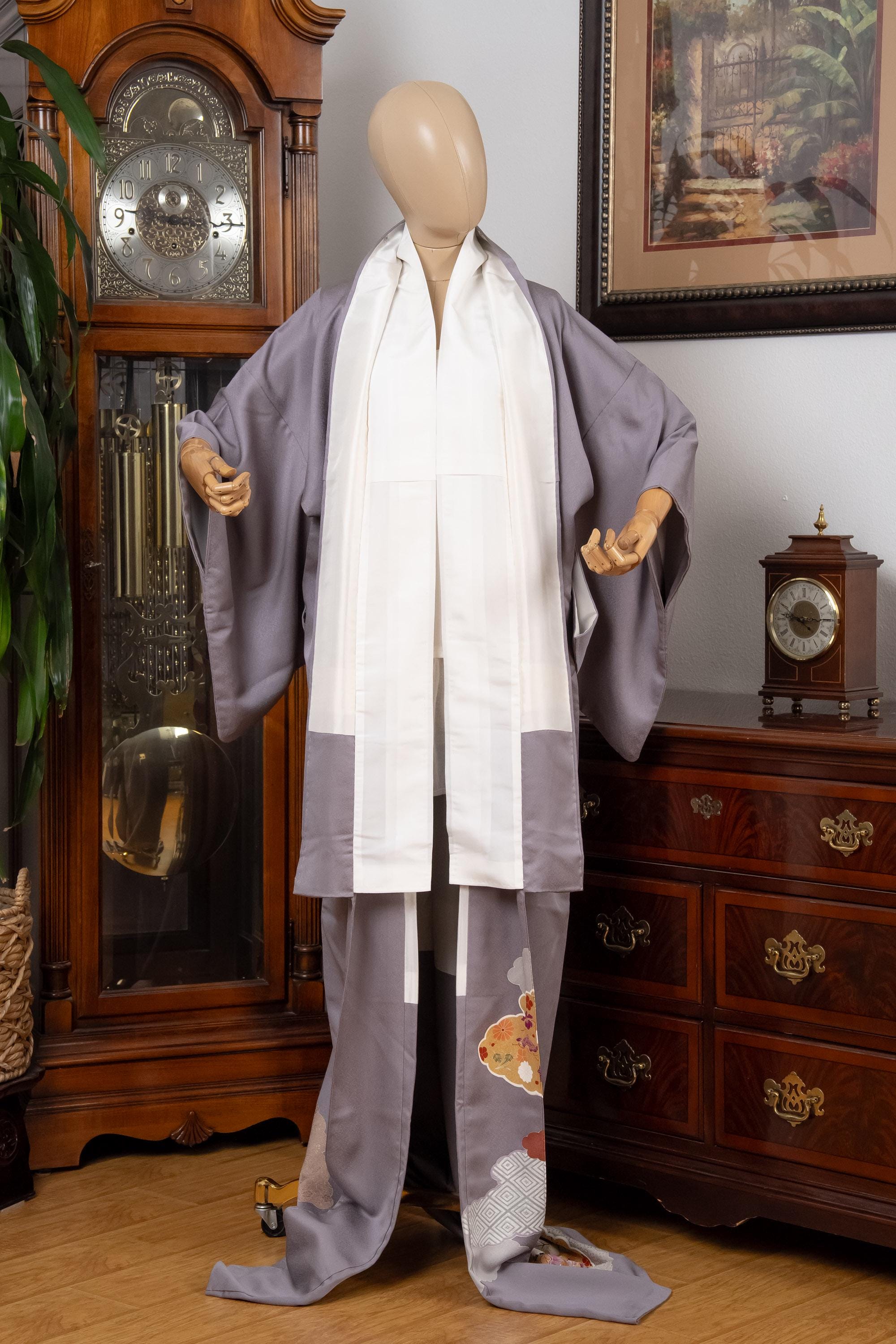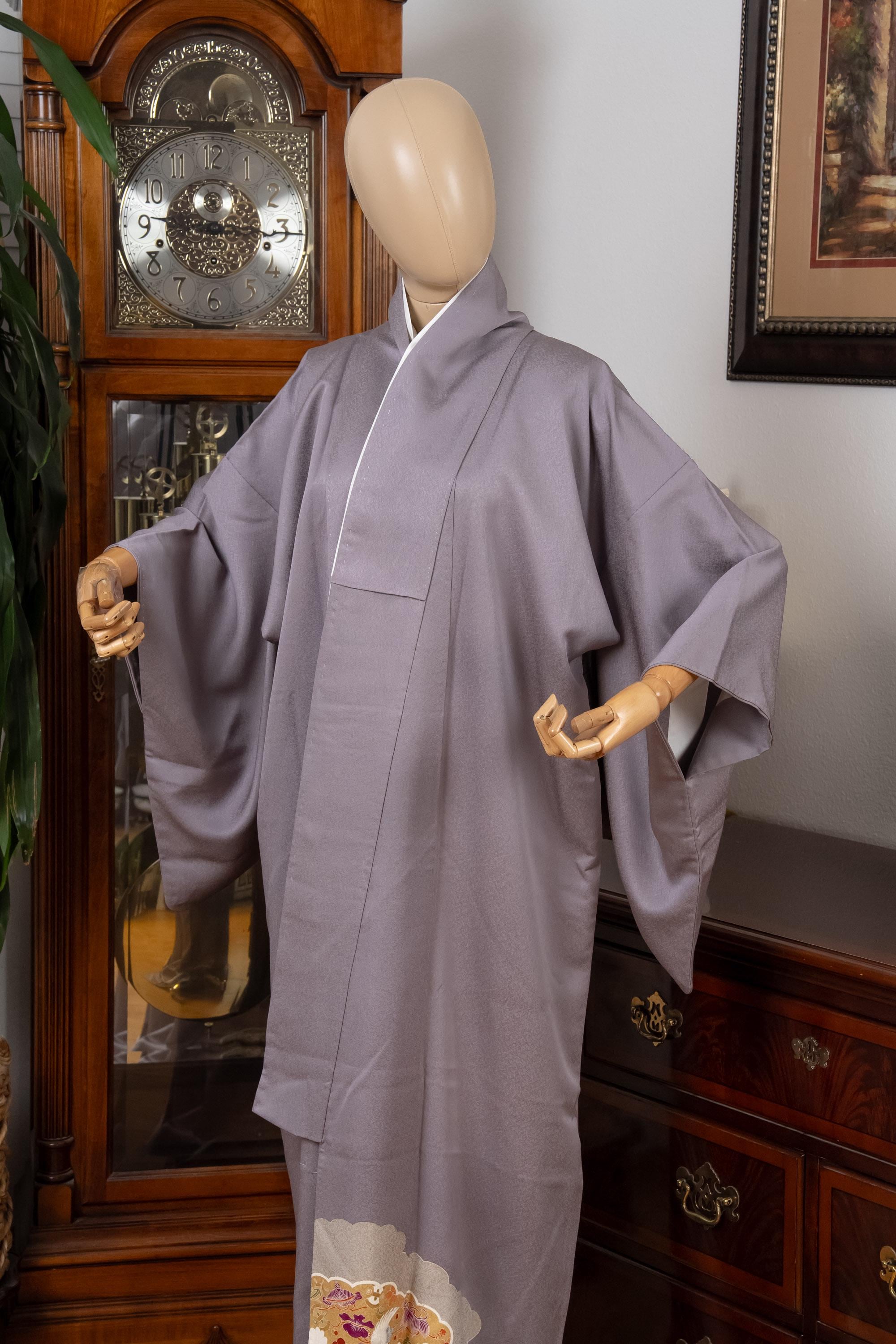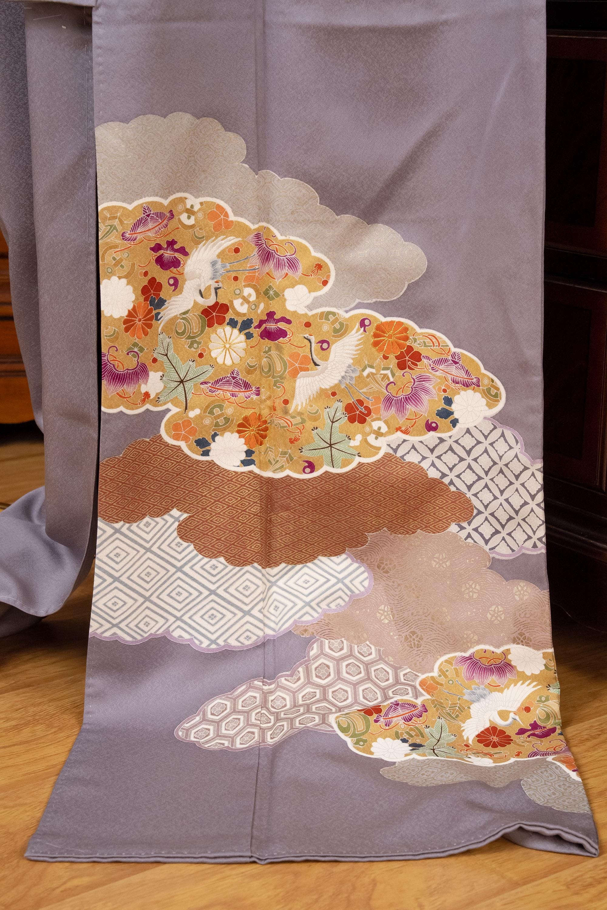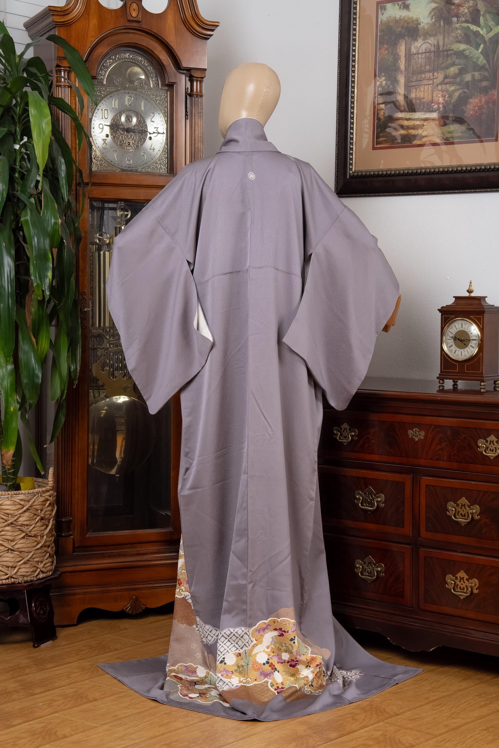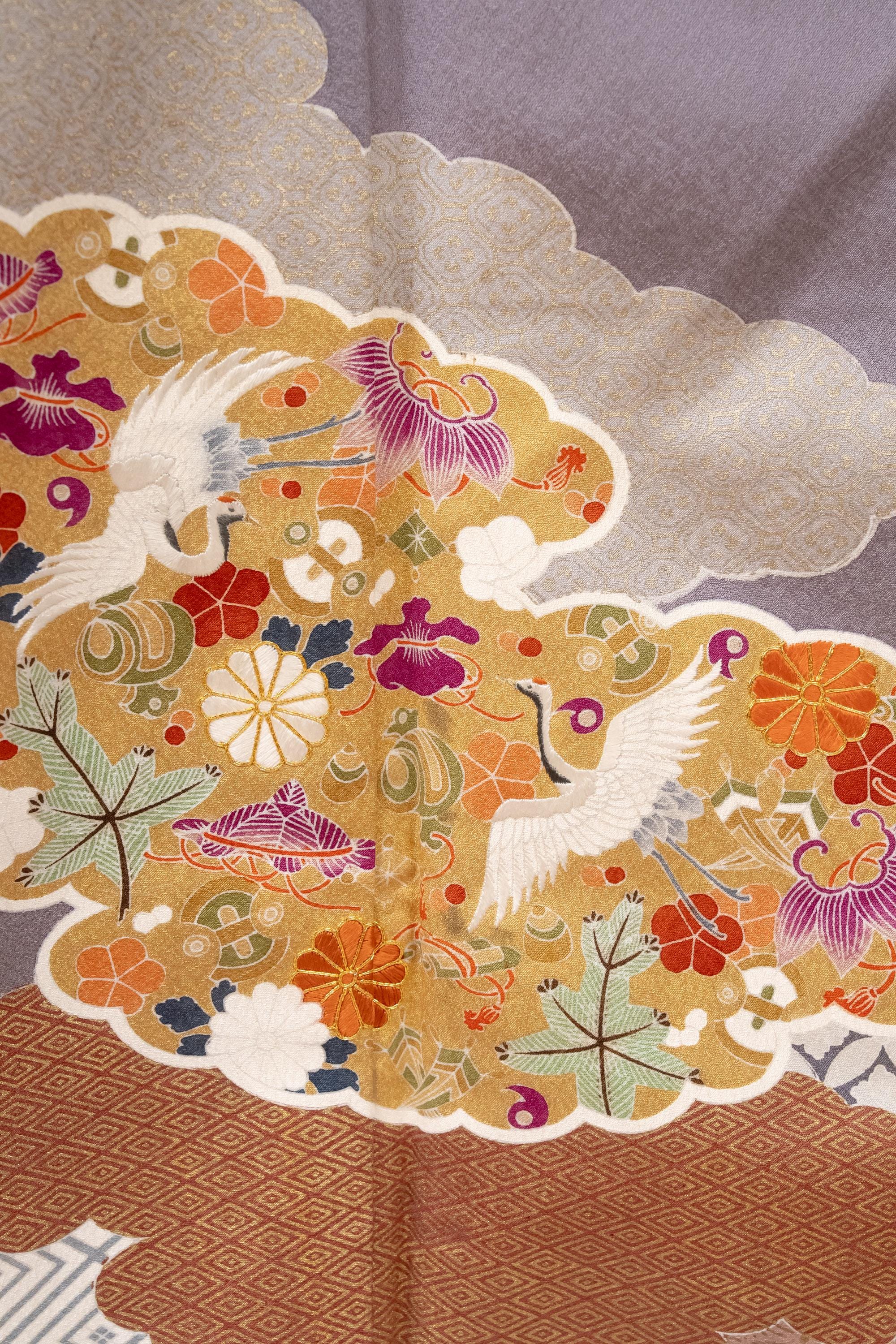 Tomesode is the most formal, high class Kimono for all ceremonies and occasions. Black ones are worn by married women and colored ones are worn by both married and unmarried women. Distinct characteristics of Tomesode are family crests and surrounding patterns around the hem. Numbers of family crests specify formality and rank.