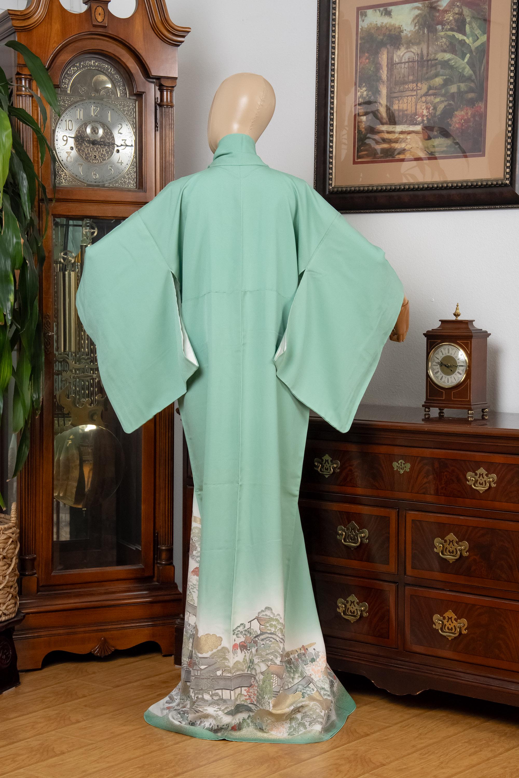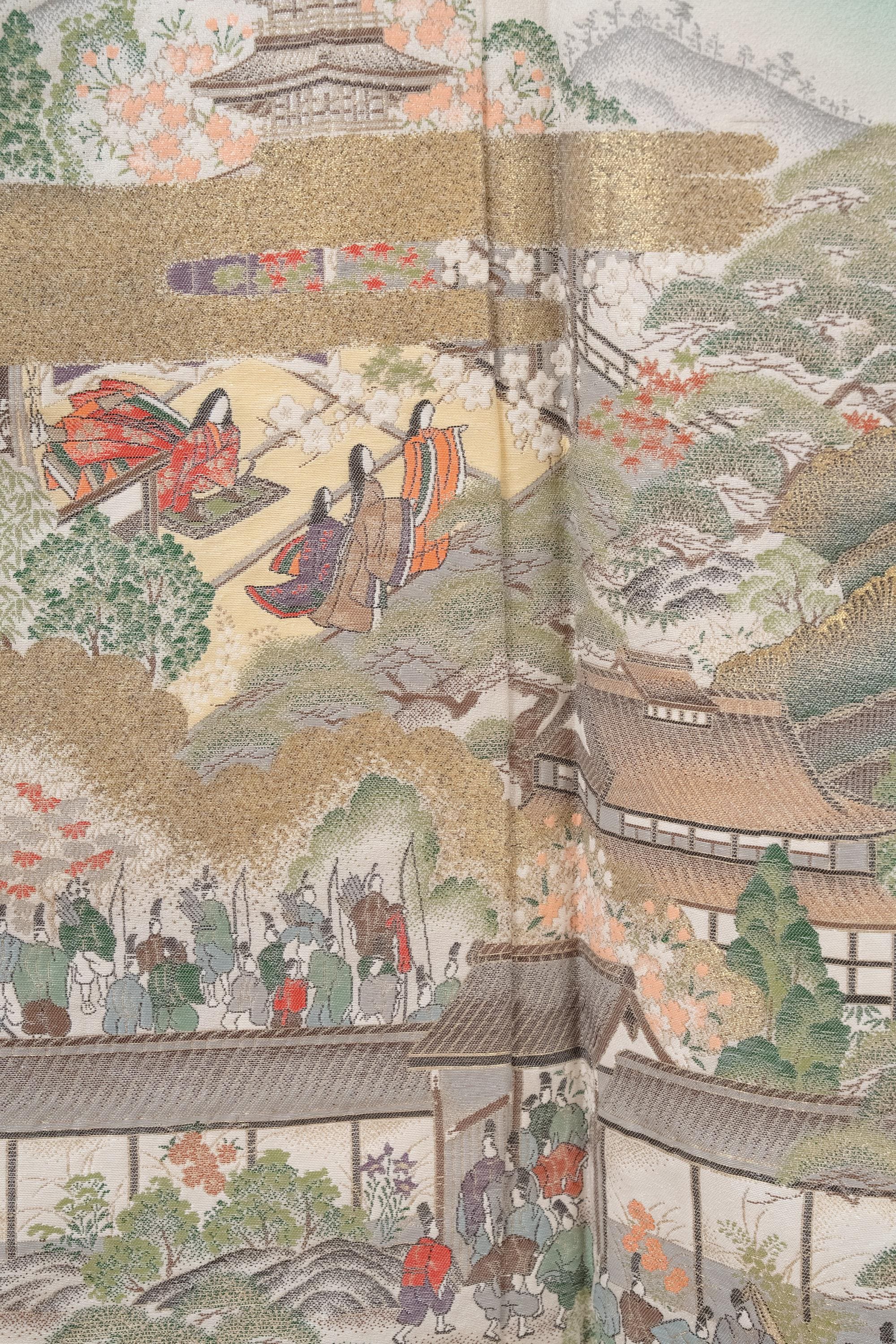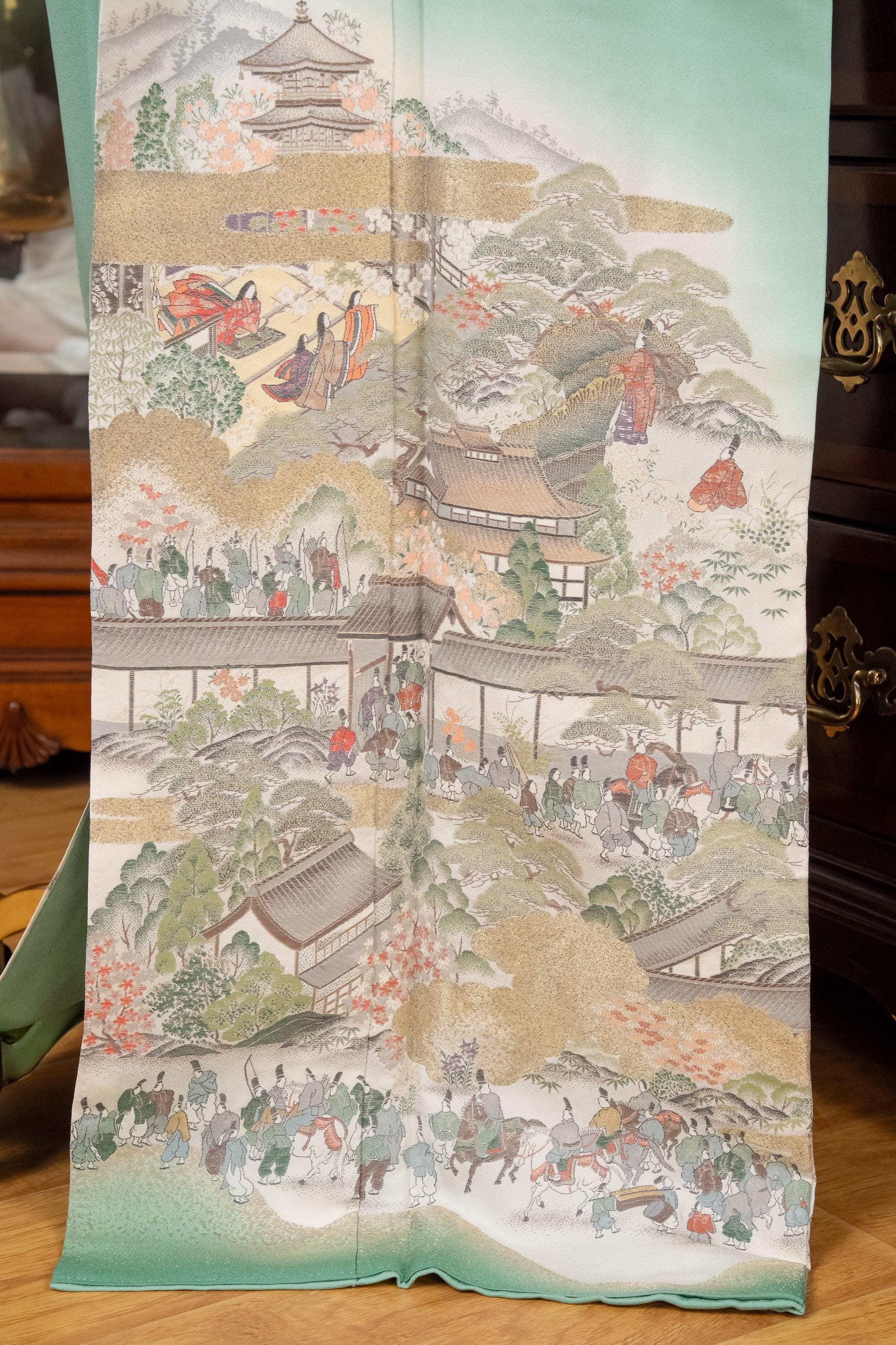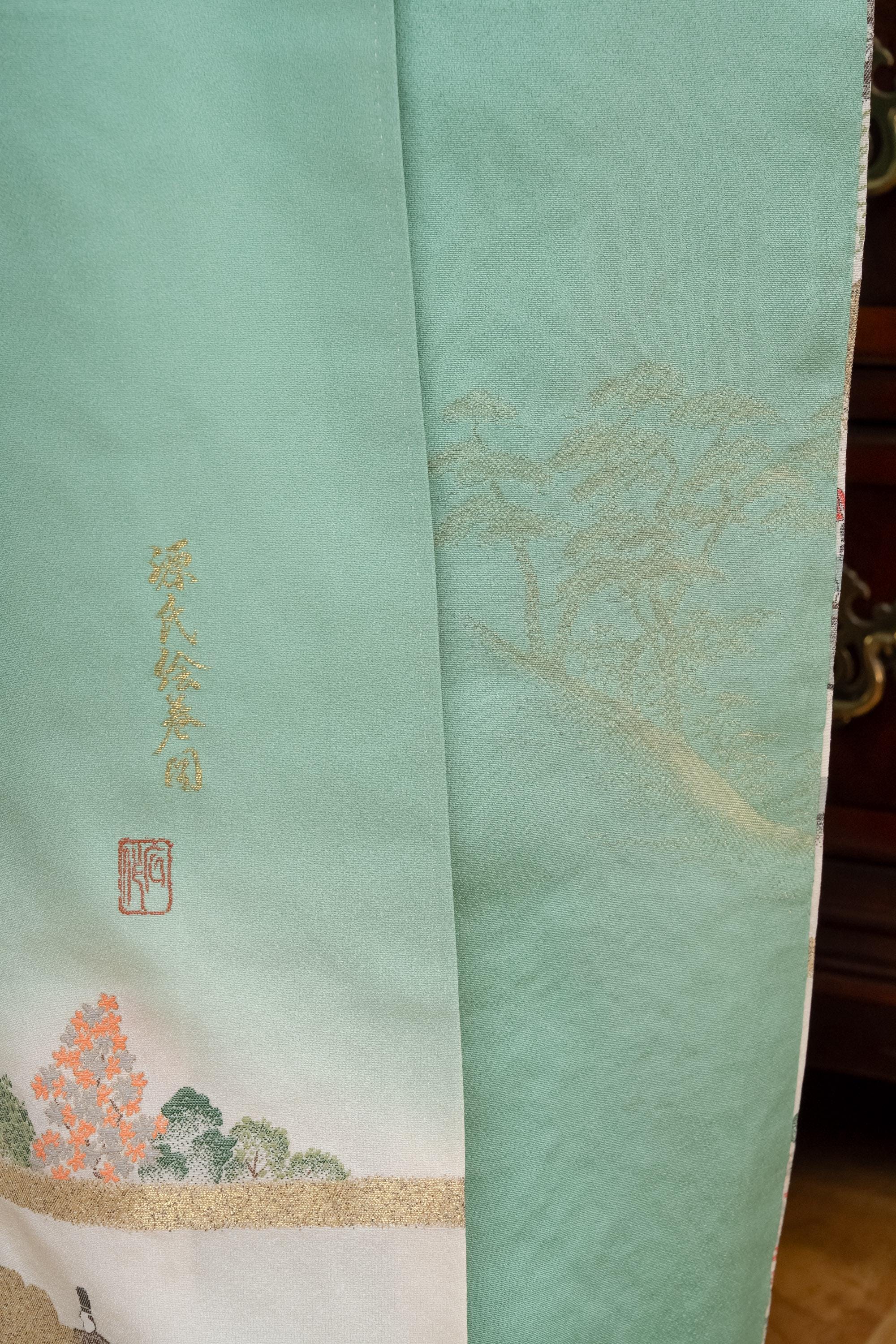 Tomesode is the most formal, high class Kimono for all ceremonies and occasions. Black ones are worn by married women and colored ones are worn by both married and unmarried women. Distinct characteristics of Tomesode are family crests and surrounding patterns around the hem. Numbers of family crests specify formality and rank.