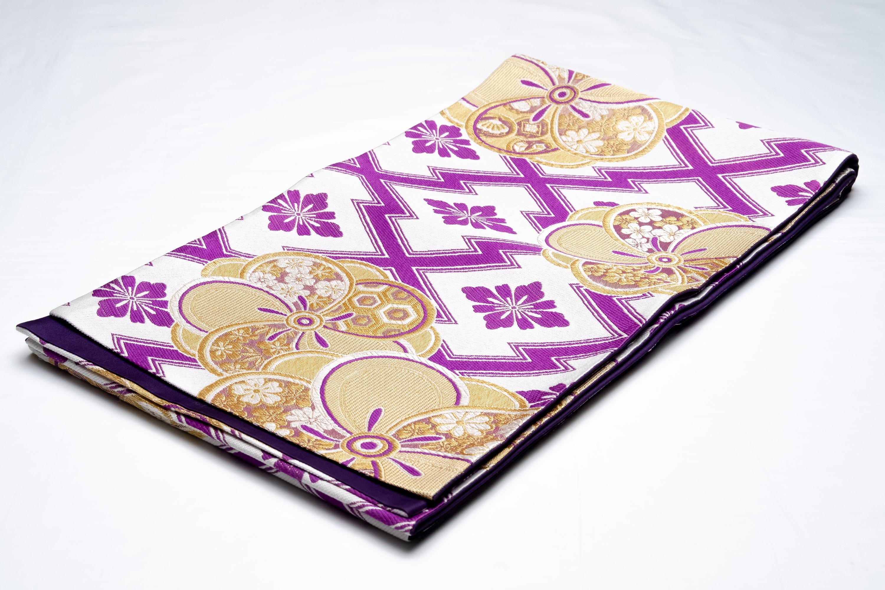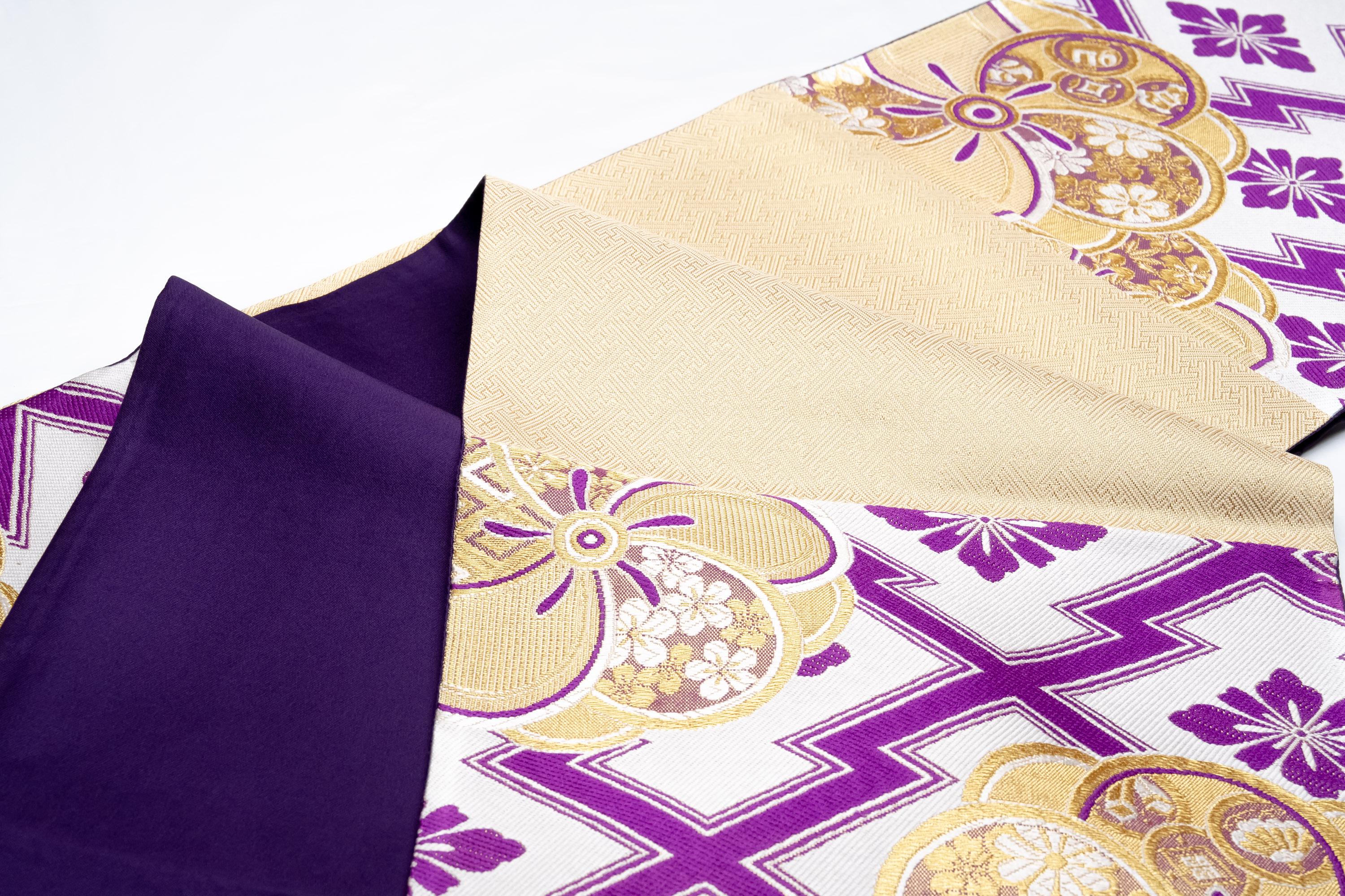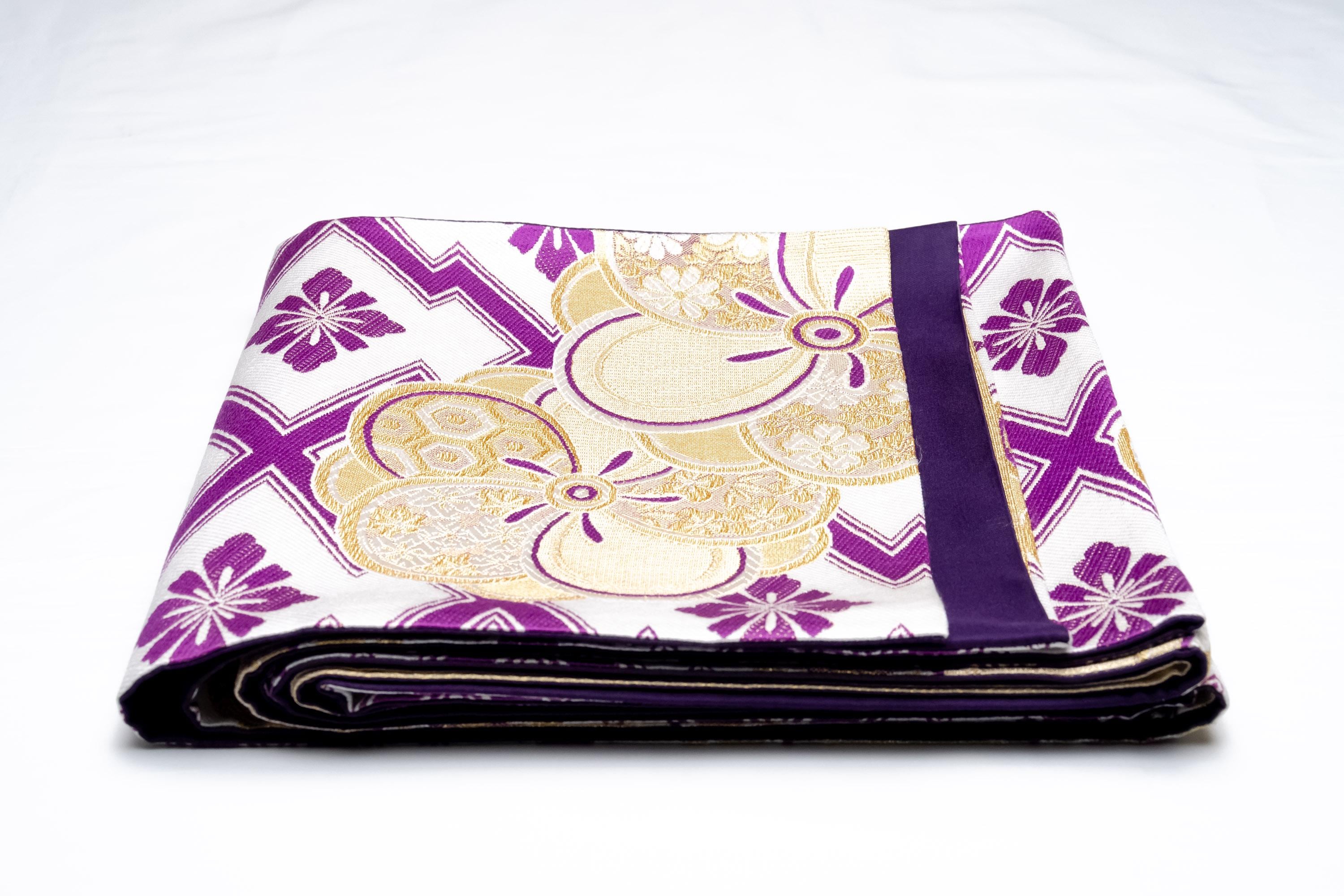 Fukuro Obi is a full-size sash belt that wraps around the torso in women's formal Kimono wearing. It is wider, longer and heavier than other informal Obis and serves the purpose of keeping the Kimono front closed securely, drawing up excess fabric to adjust the length of Kimono, and decorative expressions.