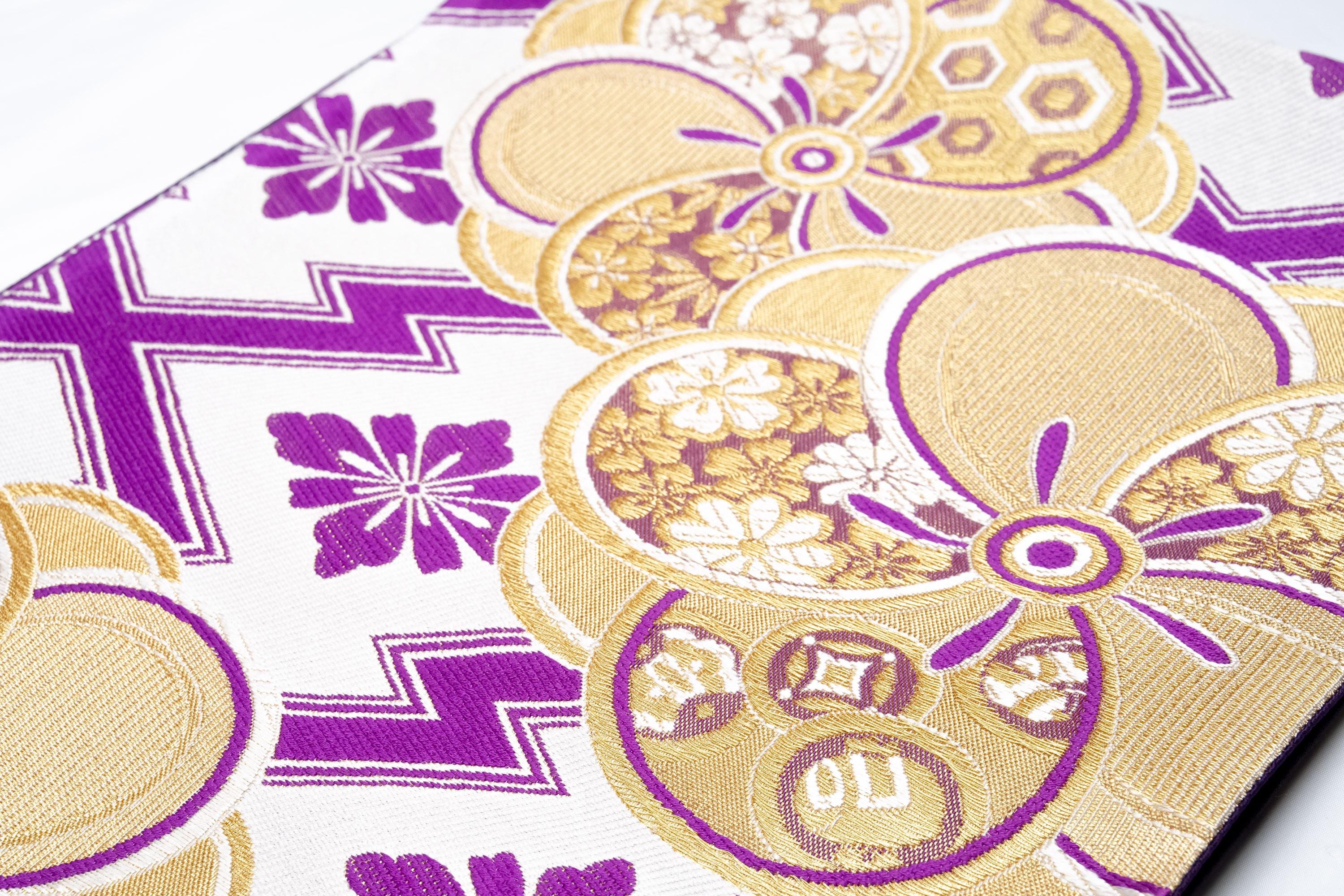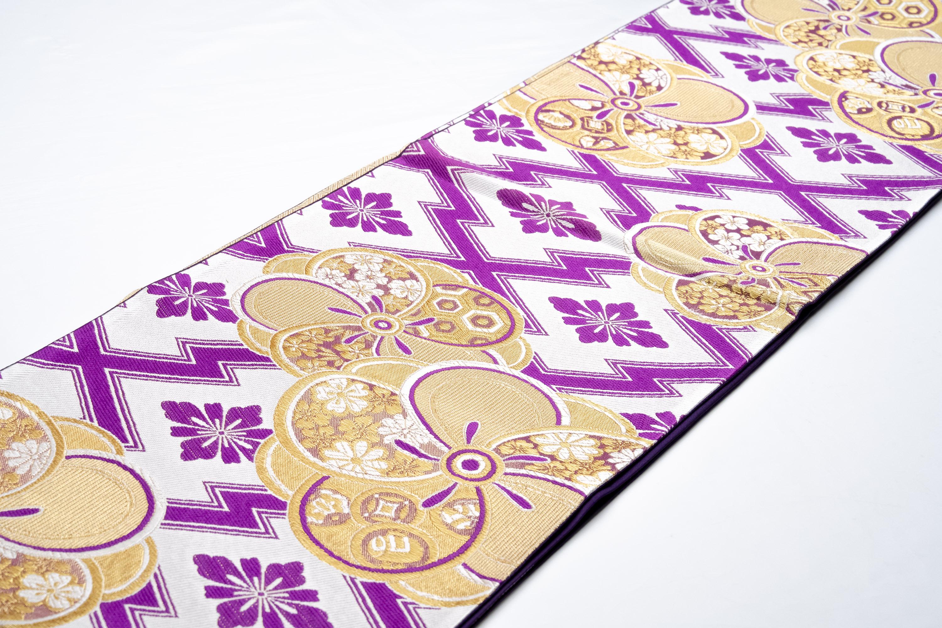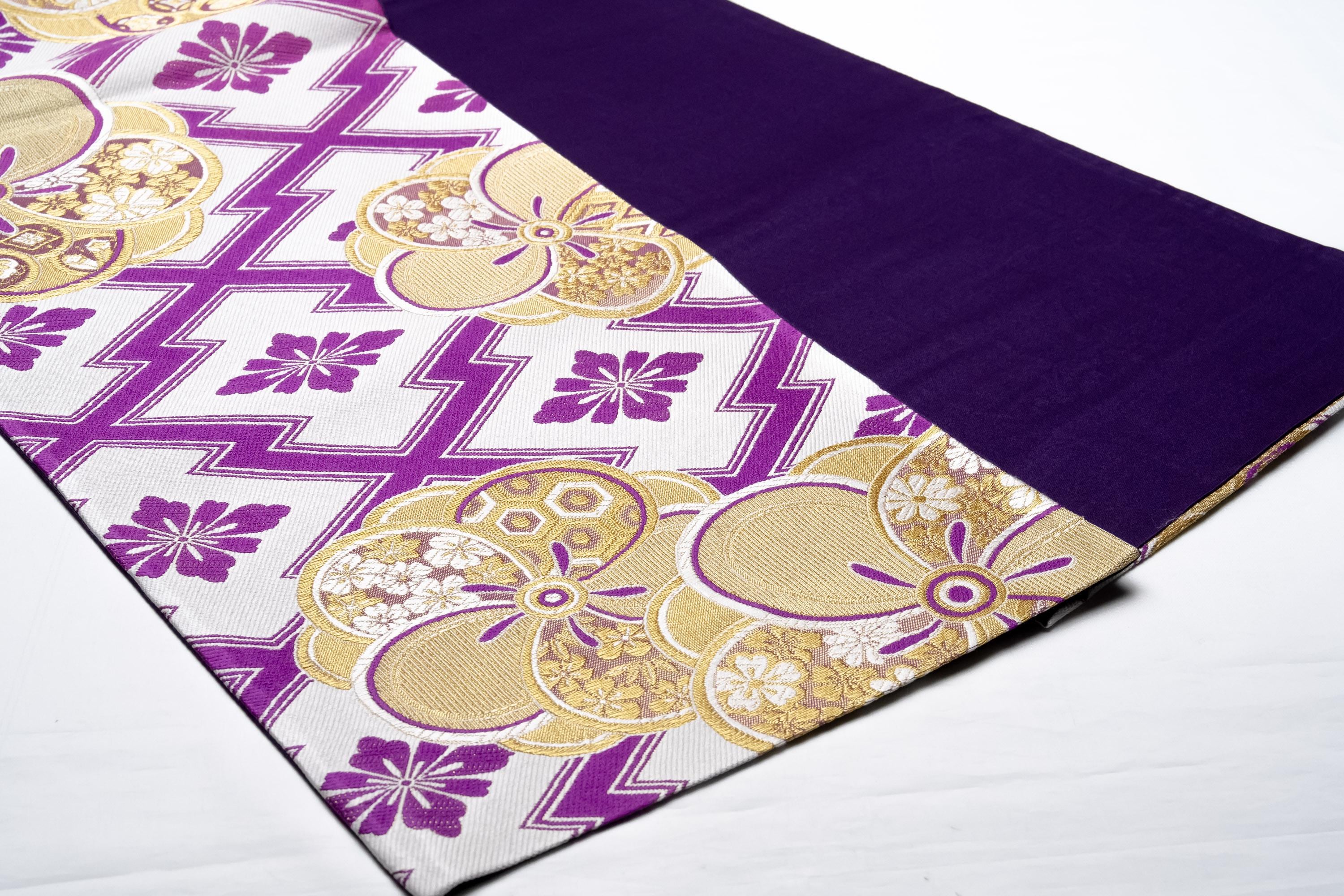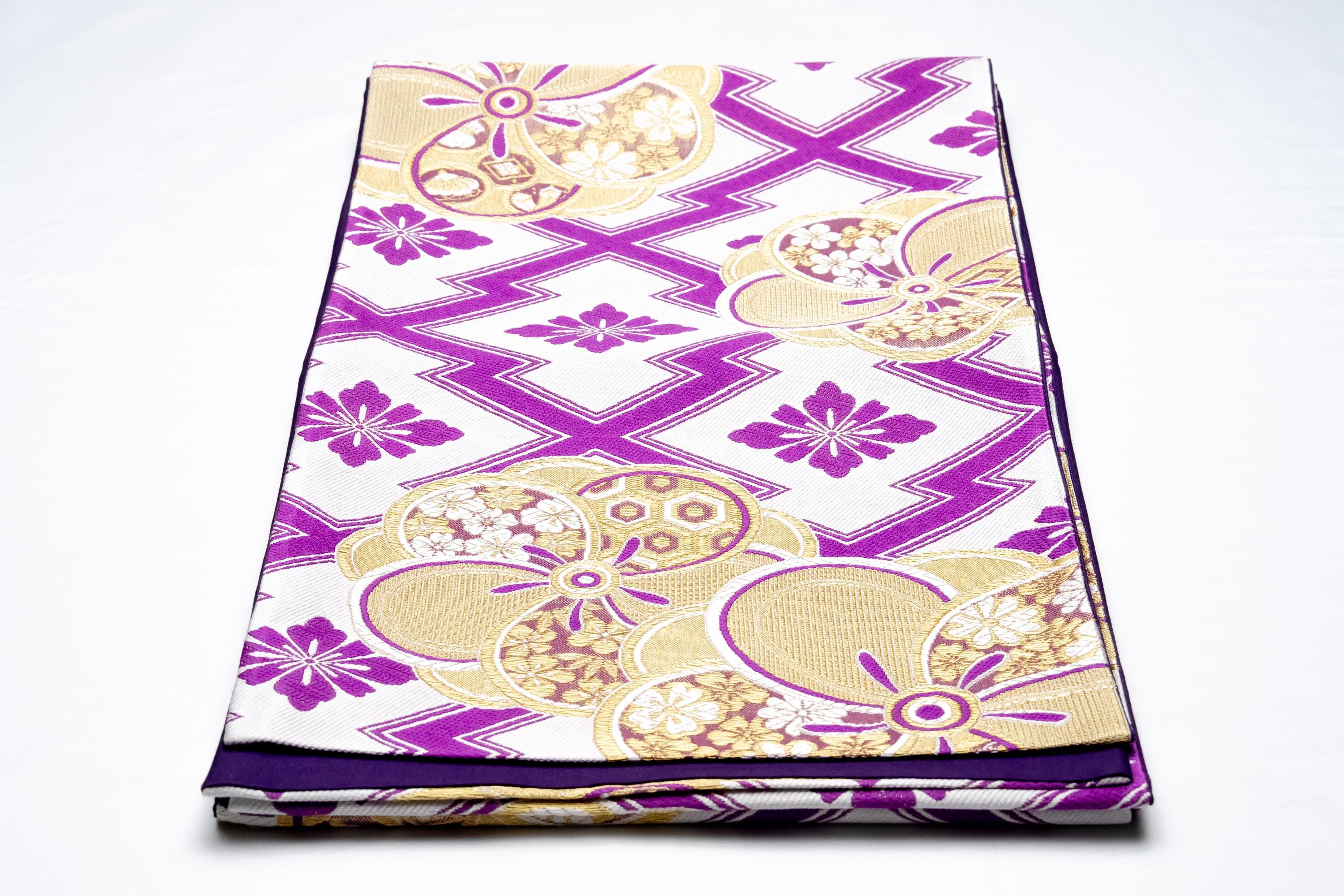 Fukuro Obi is a full-size sash belt that wraps around the torso in women's formal Kimono wearing. It is wider, longer and heavier than other informal Obis and serves the purpose of keeping the Kimono front closed securely, drawing up excess fabric to adjust the length of Kimono, and decorative expressions.