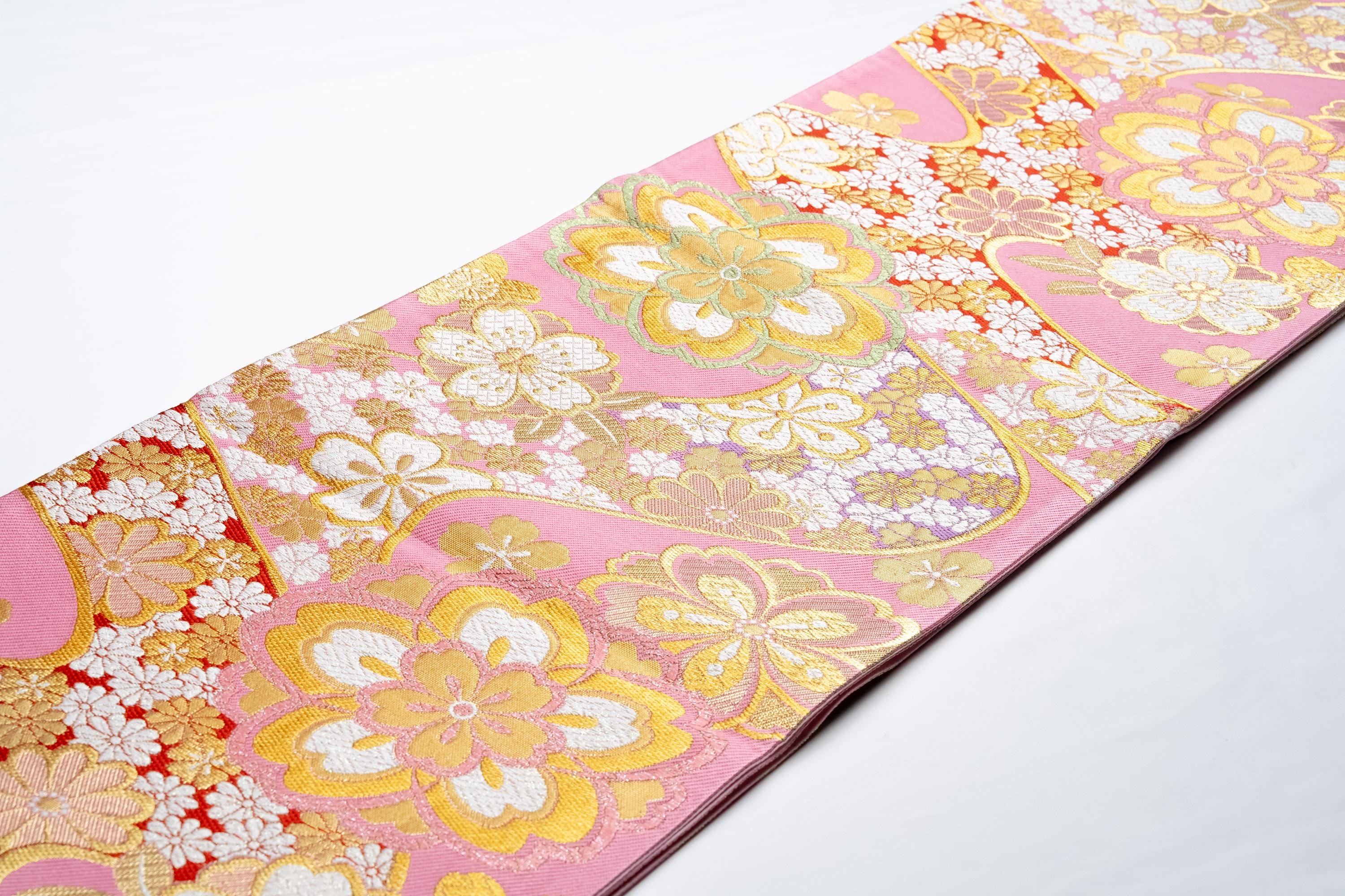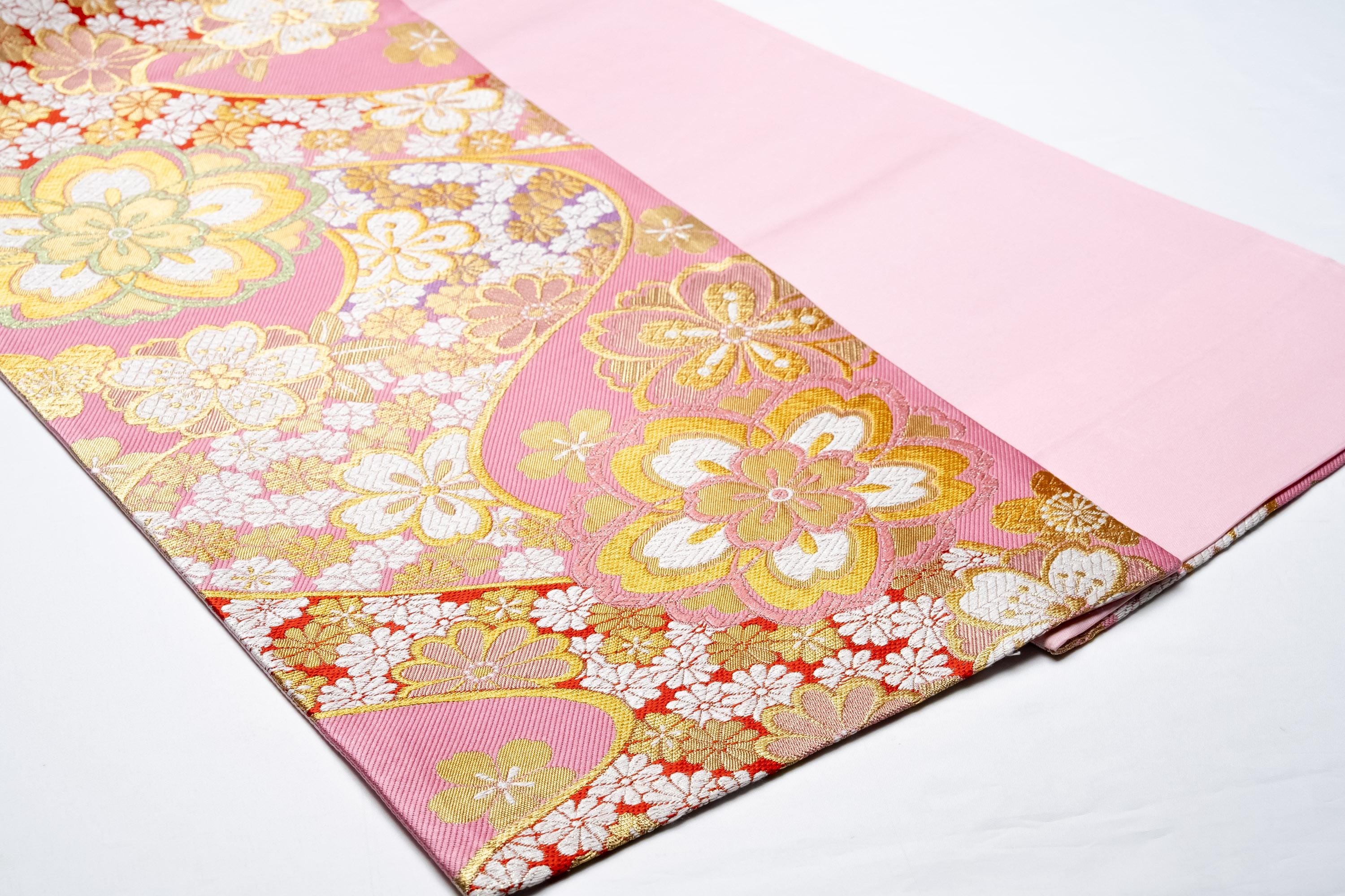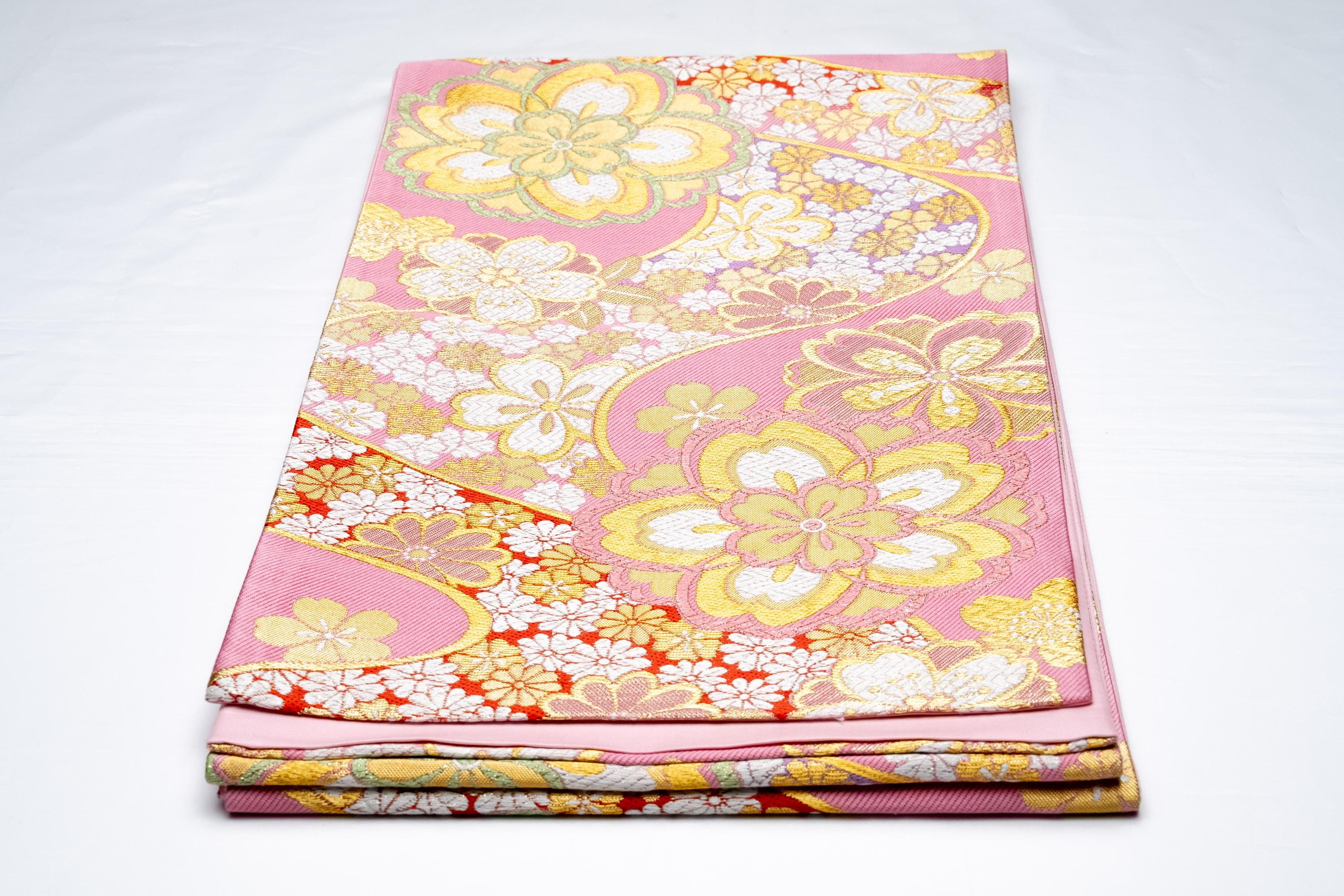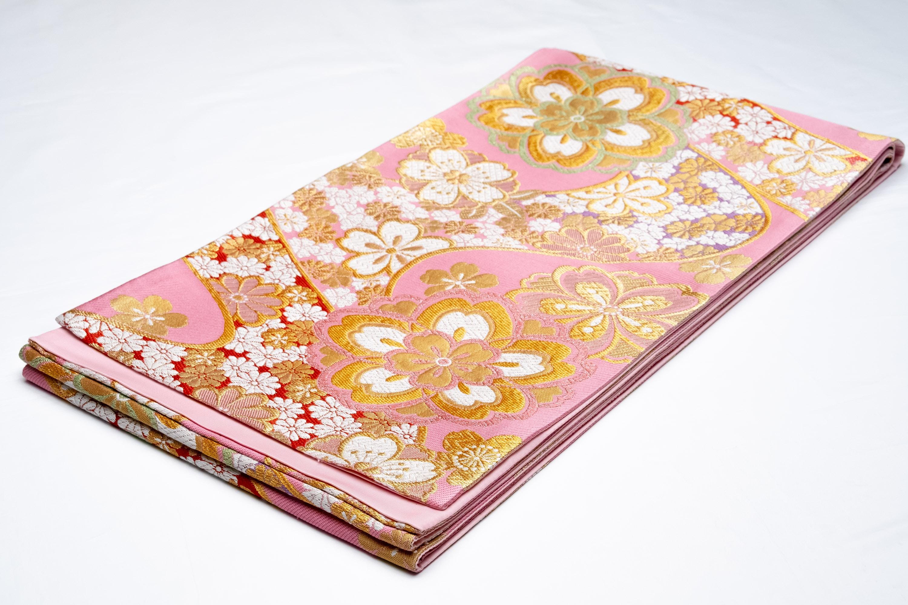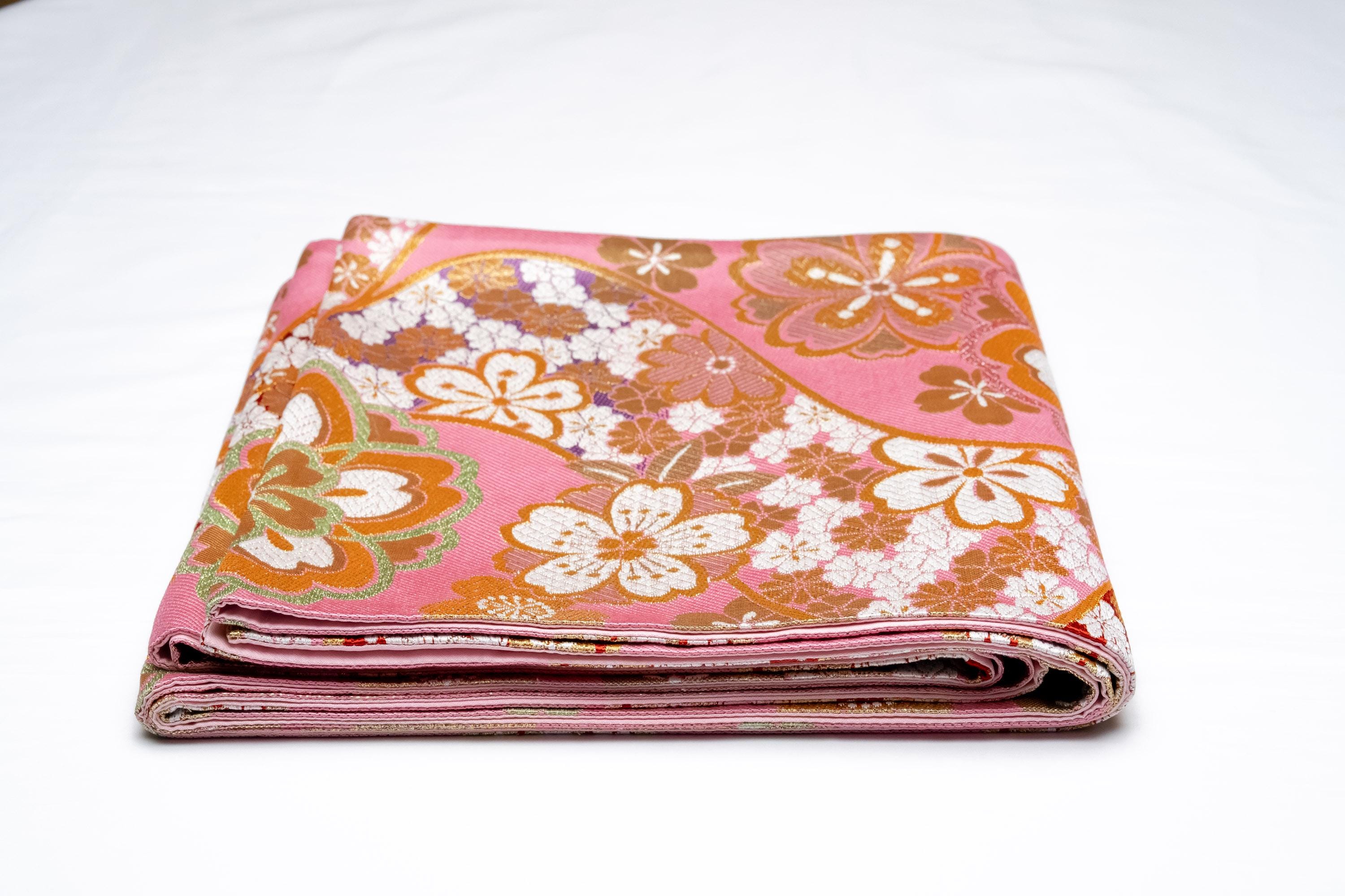 Fukuro Obi is a full-size sash belt that wraps around the torso in women's formal Kimono wearing. It is wider, longer and heavier than other informal Obis and serves the purpose of keeping the Kimono front closed securely, drawing up excess fabric to adjust the length of Kimono, and decorative expressions.