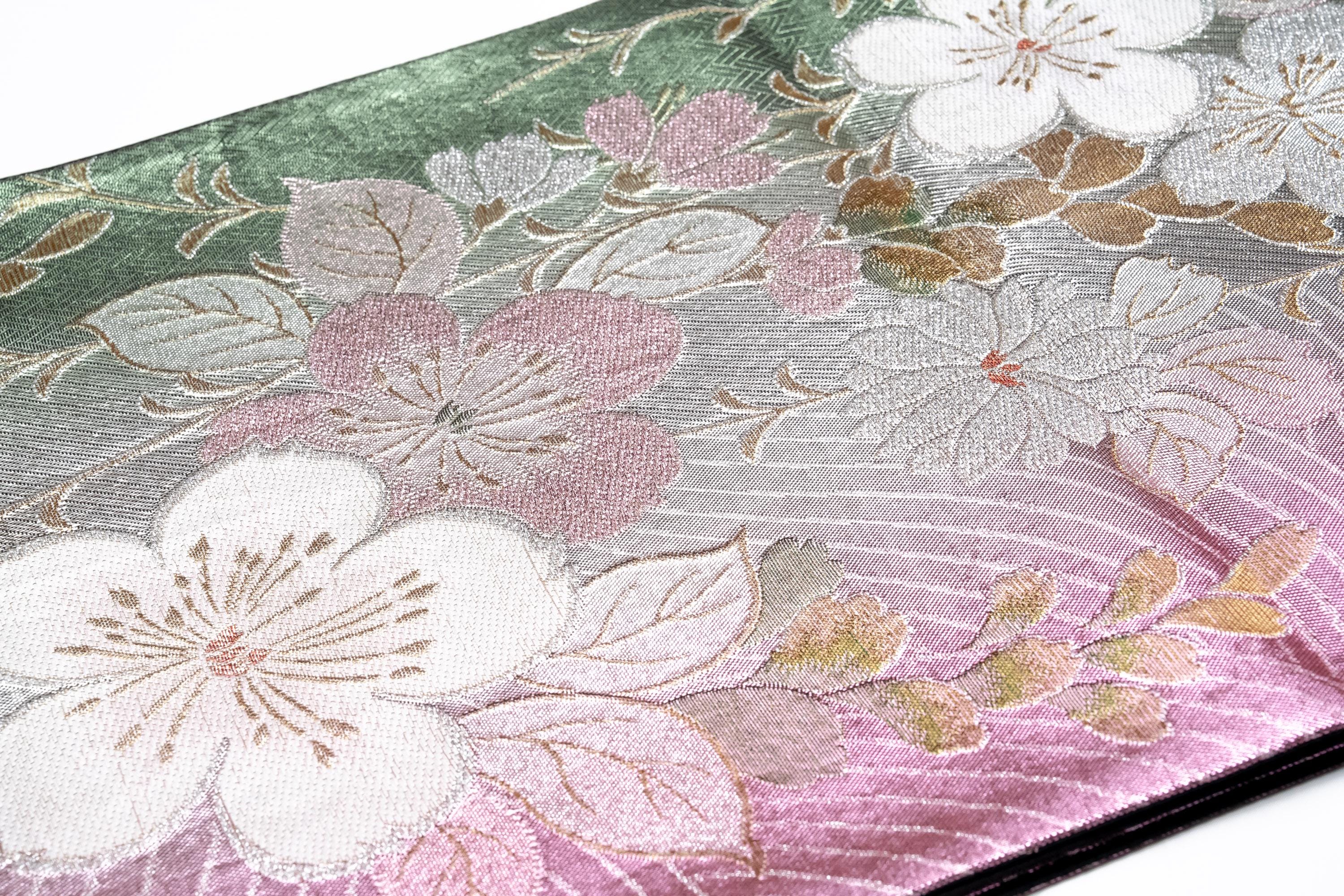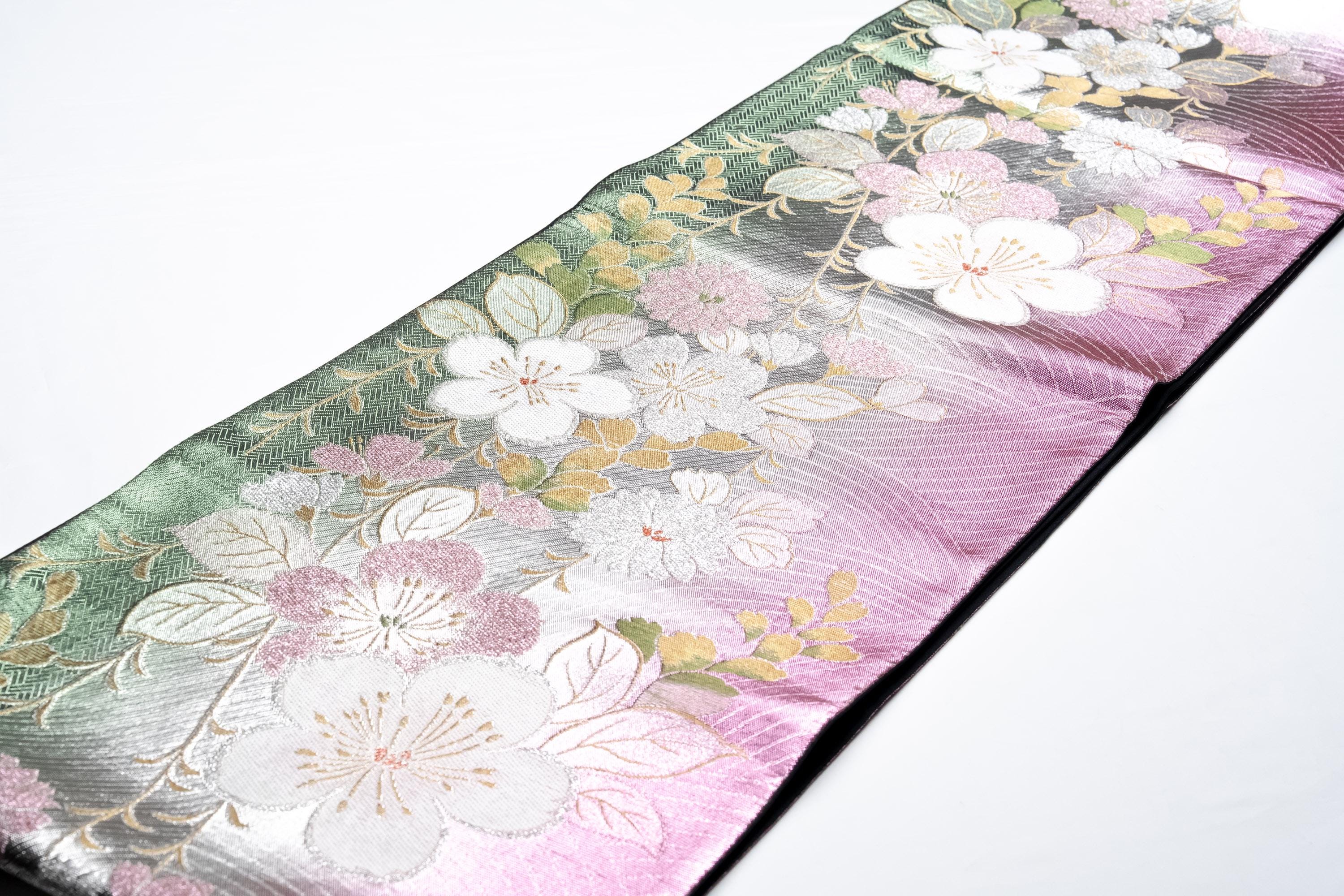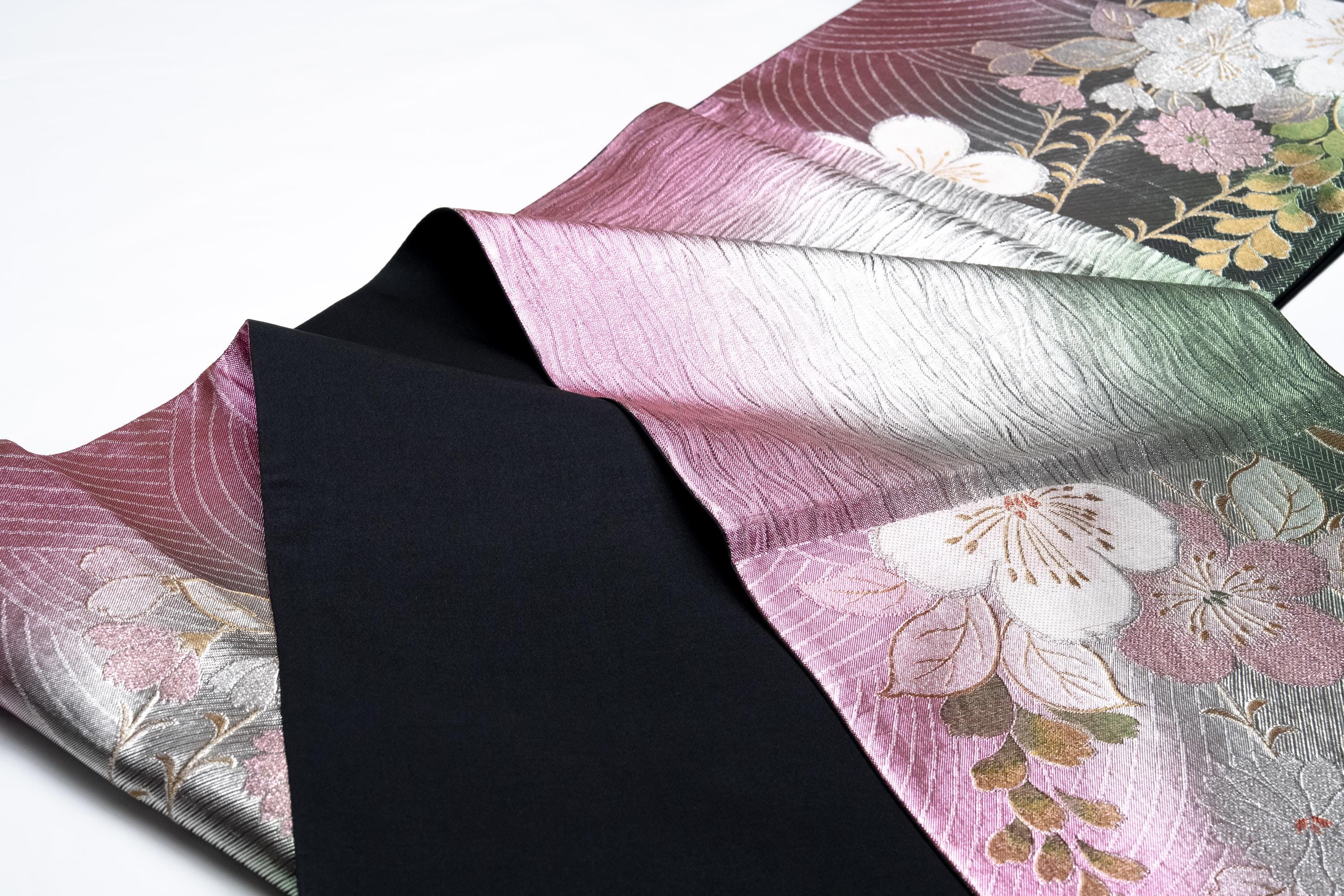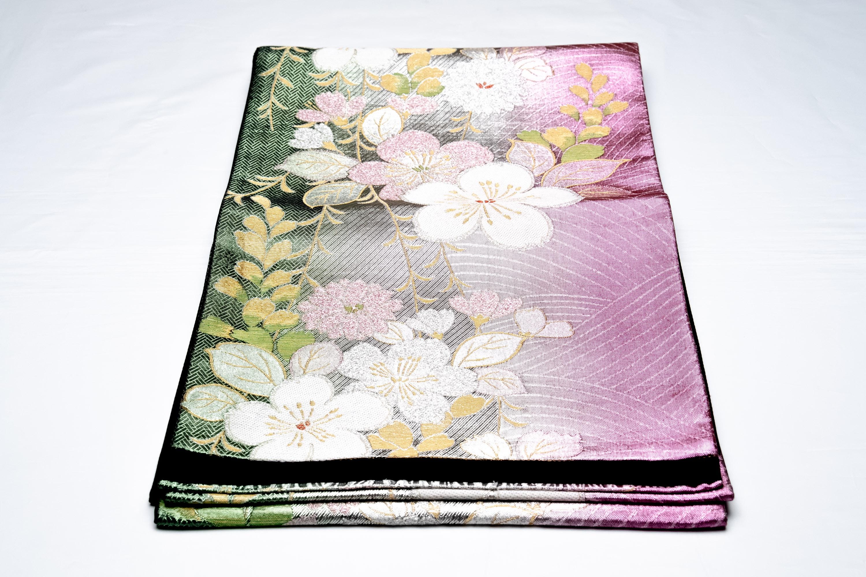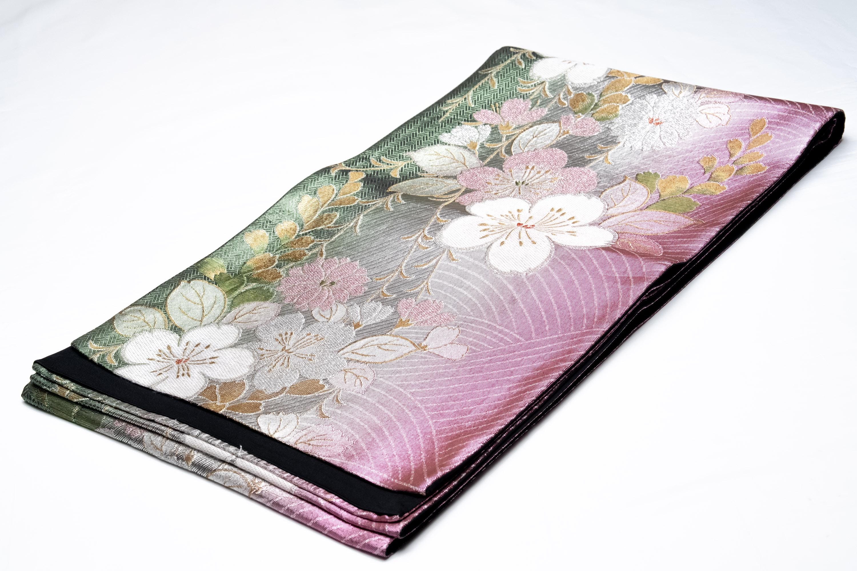Fukuro Obi is a full-size sash belt that wraps around the torso in women's formal Kimono wearing. It is wider, longer and heavier than other informal Obis and serves the purpose of keeping the Kimono front closed securely, drawing up excess fabric to adjust the length of Kimono, and decorative expressions.