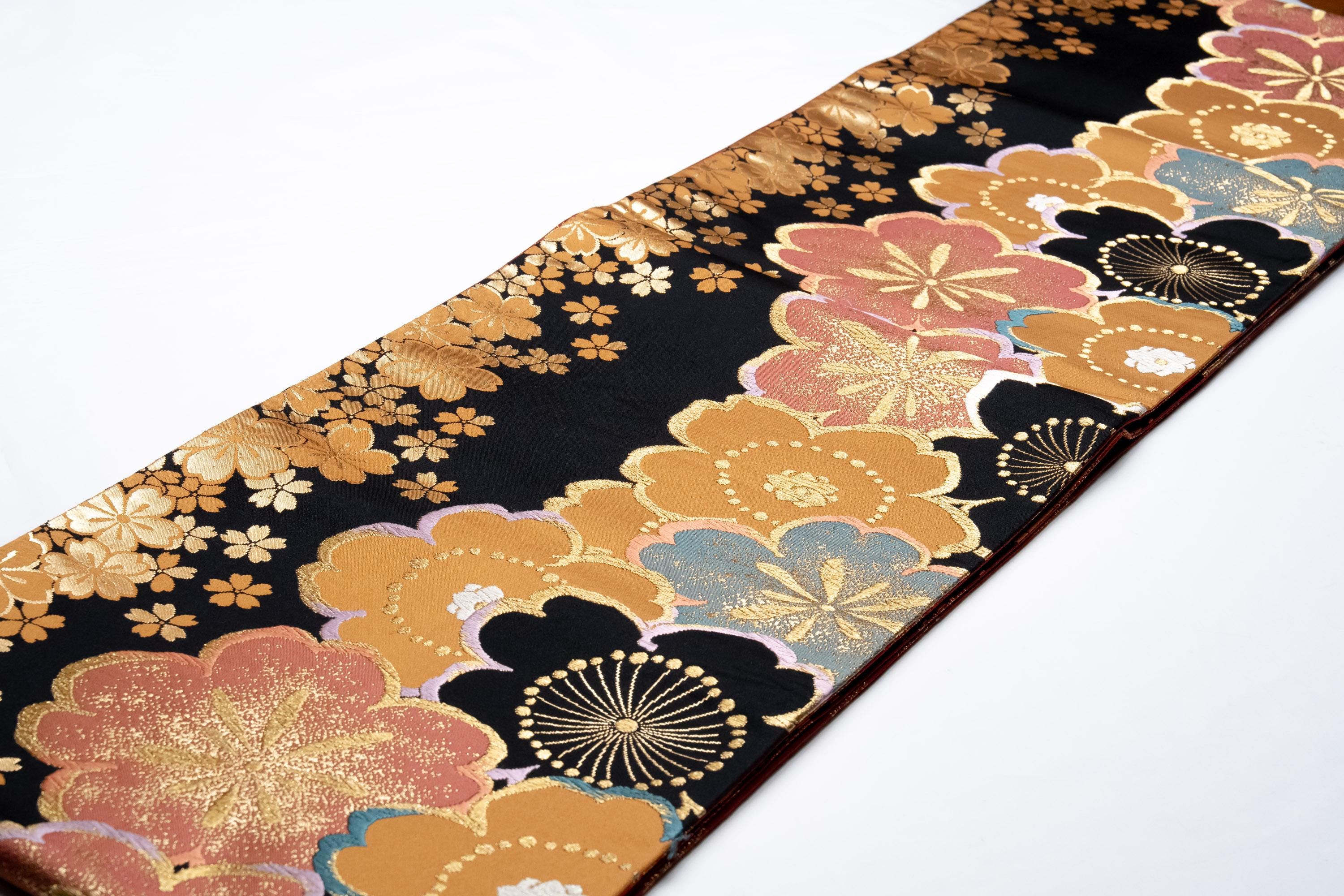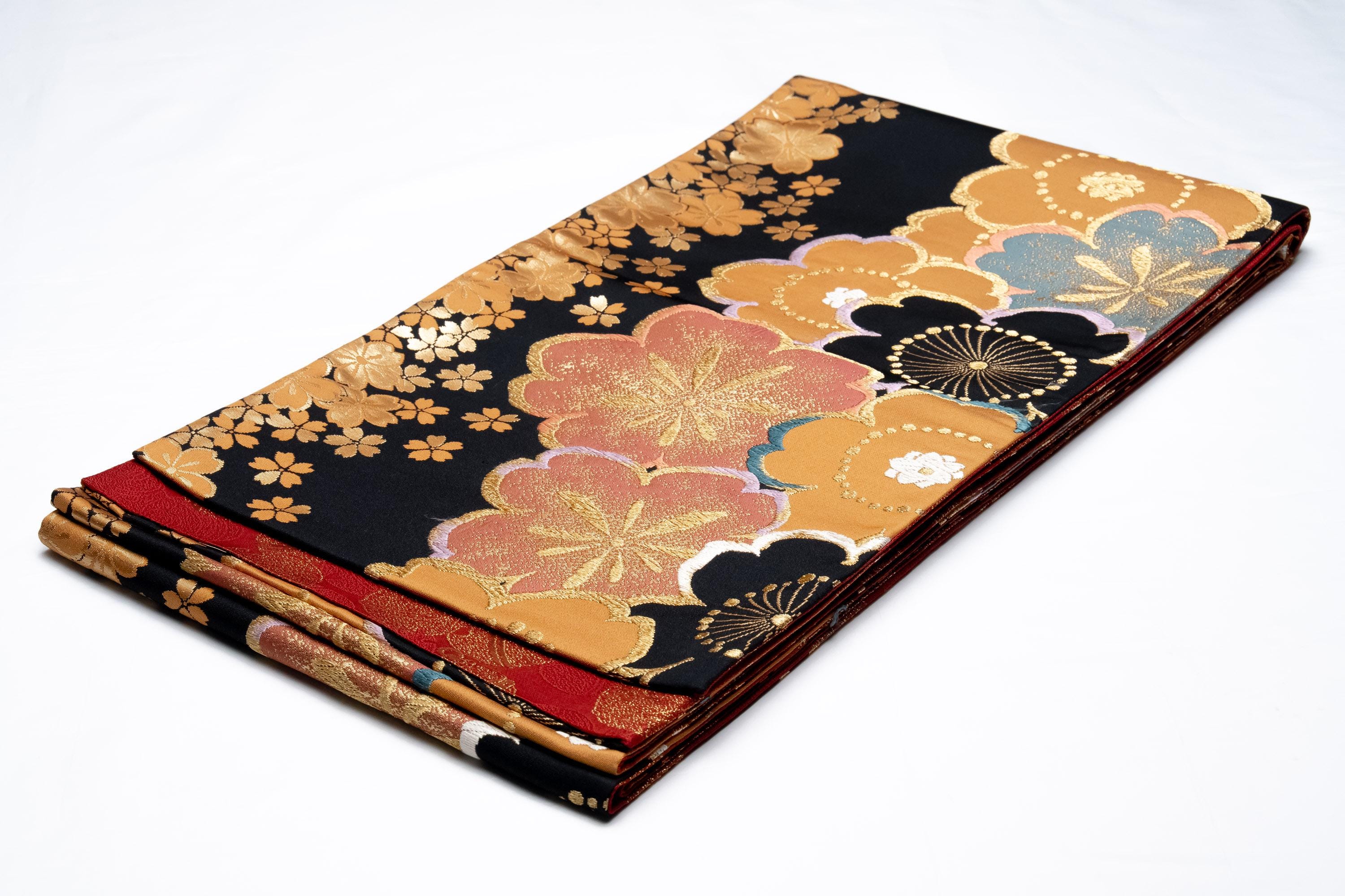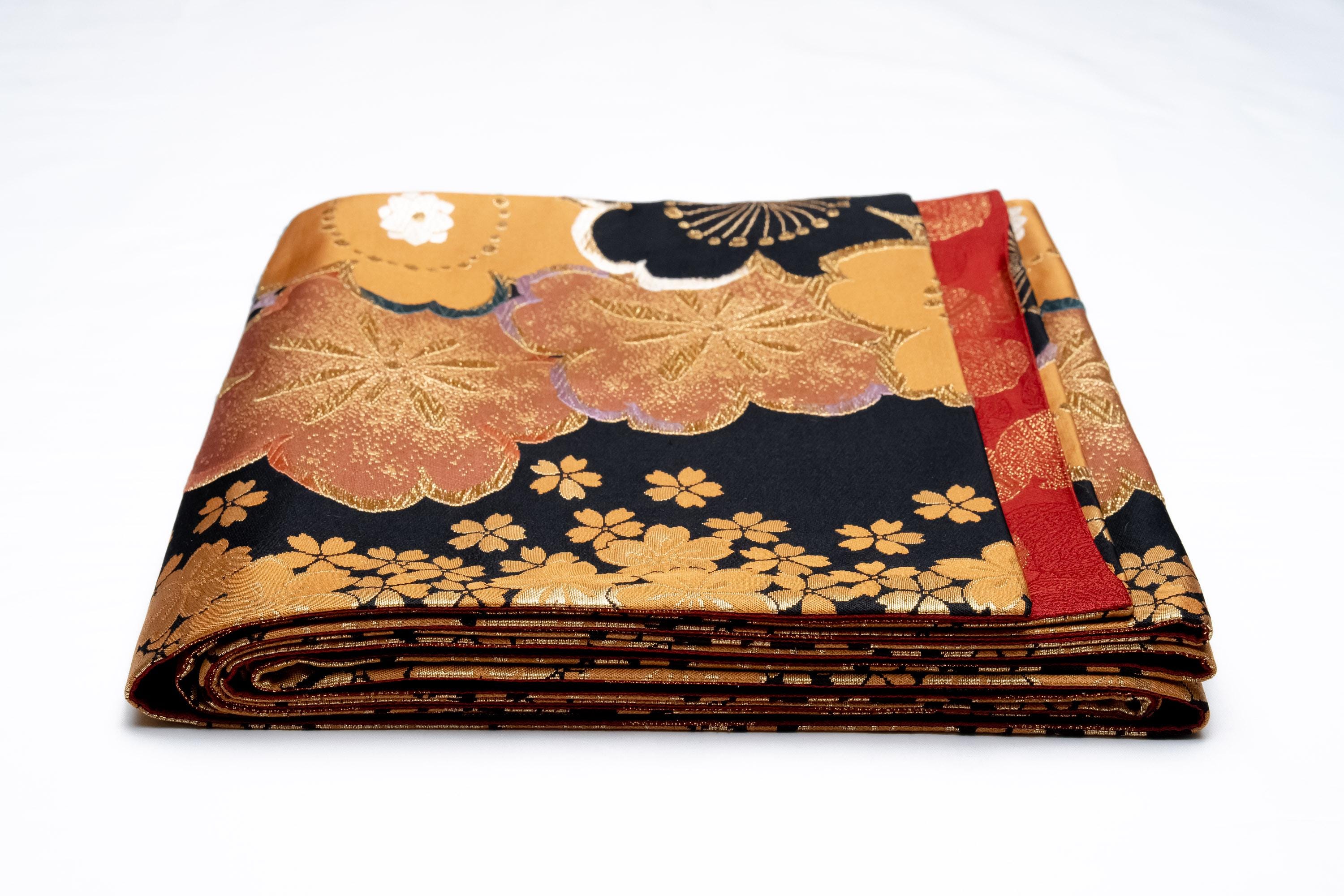 Fukuro Obi is a full-size sash belt that wraps around the torso in women's formal Kimono wearing. It is wider, longer and heavier than other informal Obis and serves the purpose of keeping the Kimono front closed securely, drawing up excess fabric to adjust the length of Kimono, and decorative expressions.
