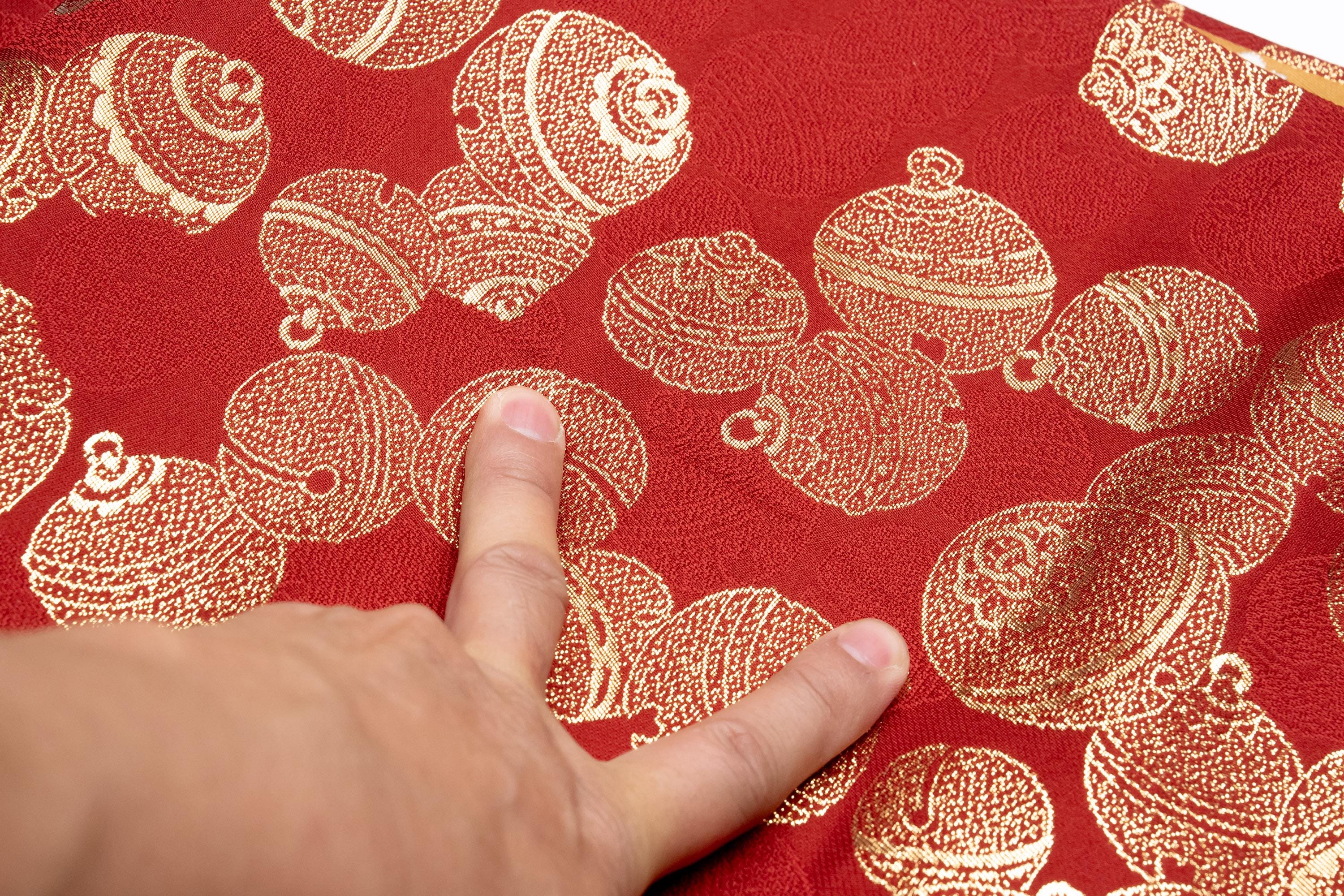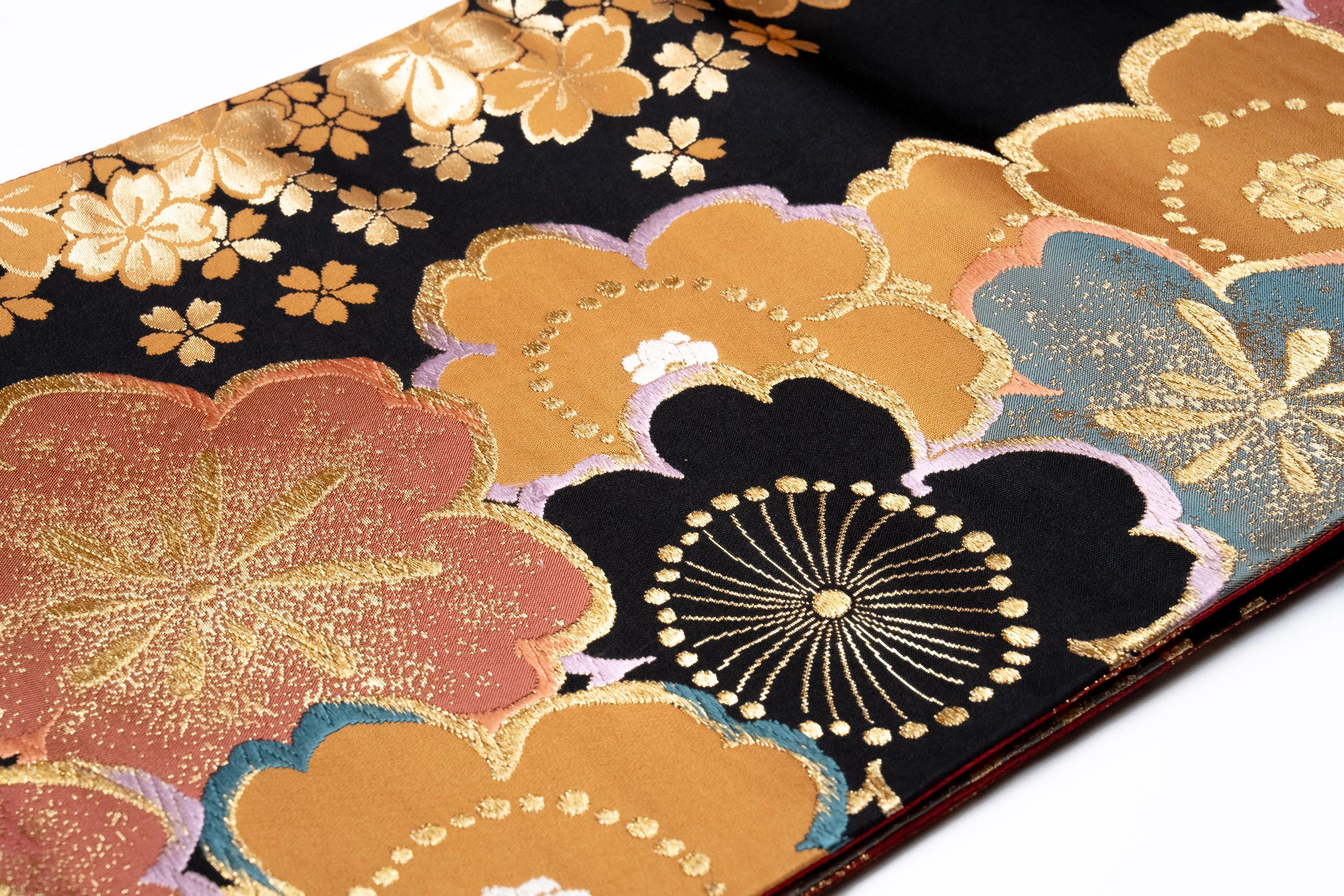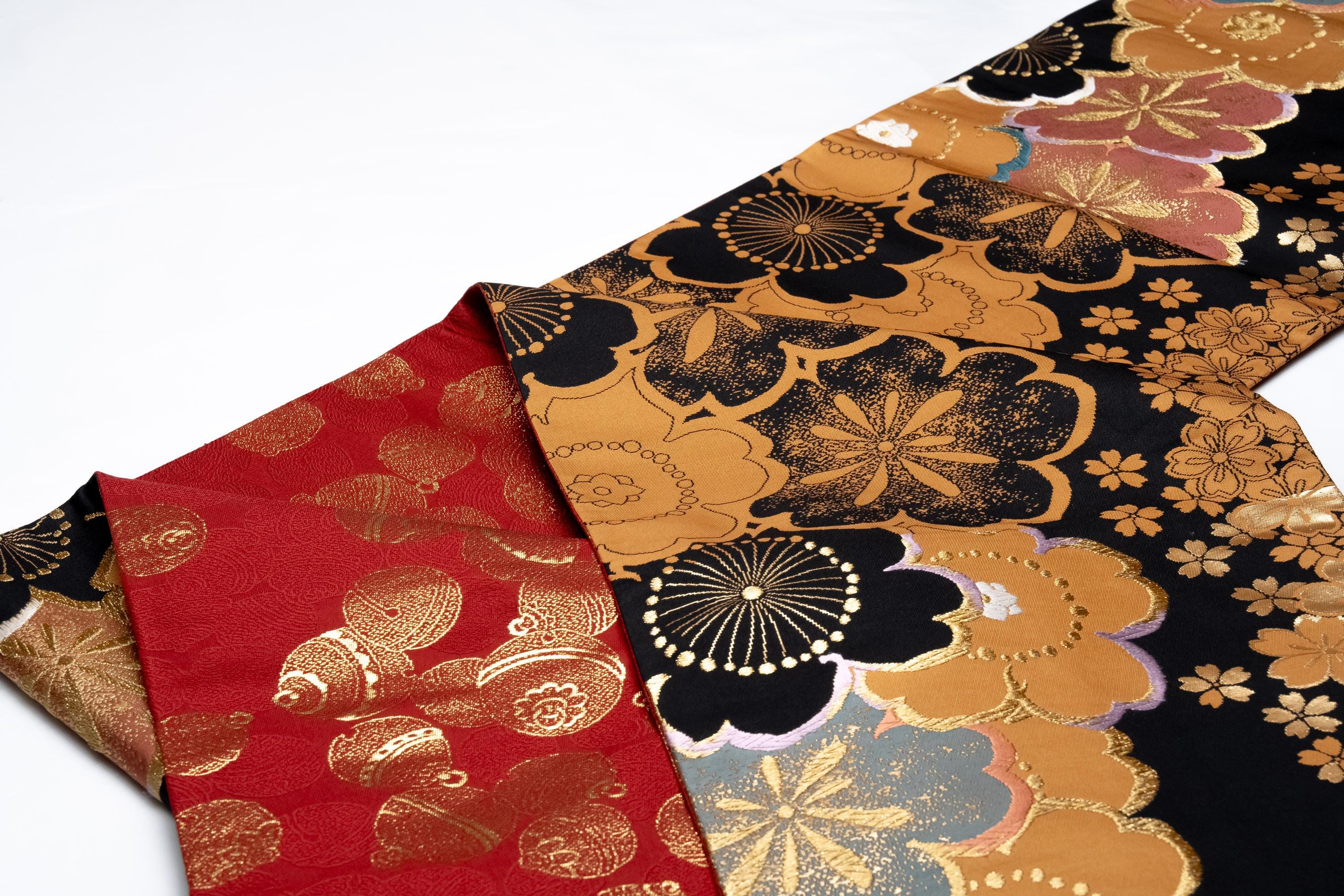 Fukuro Obi is a full-size sash belt that wraps around the torso in women's formal Kimono wearing. It is wider, longer and heavier than other informal Obis and serves the purpose of keeping the Kimono front closed securely, drawing up excess fabric to adjust the length of Kimono, and decorative expressions.