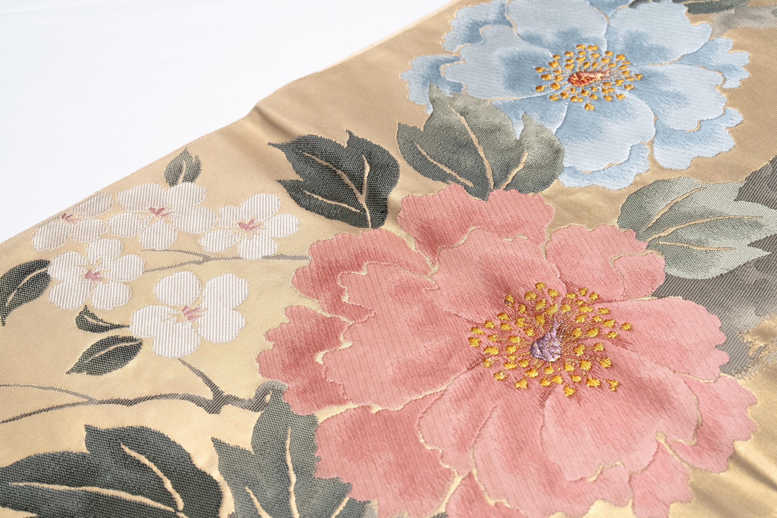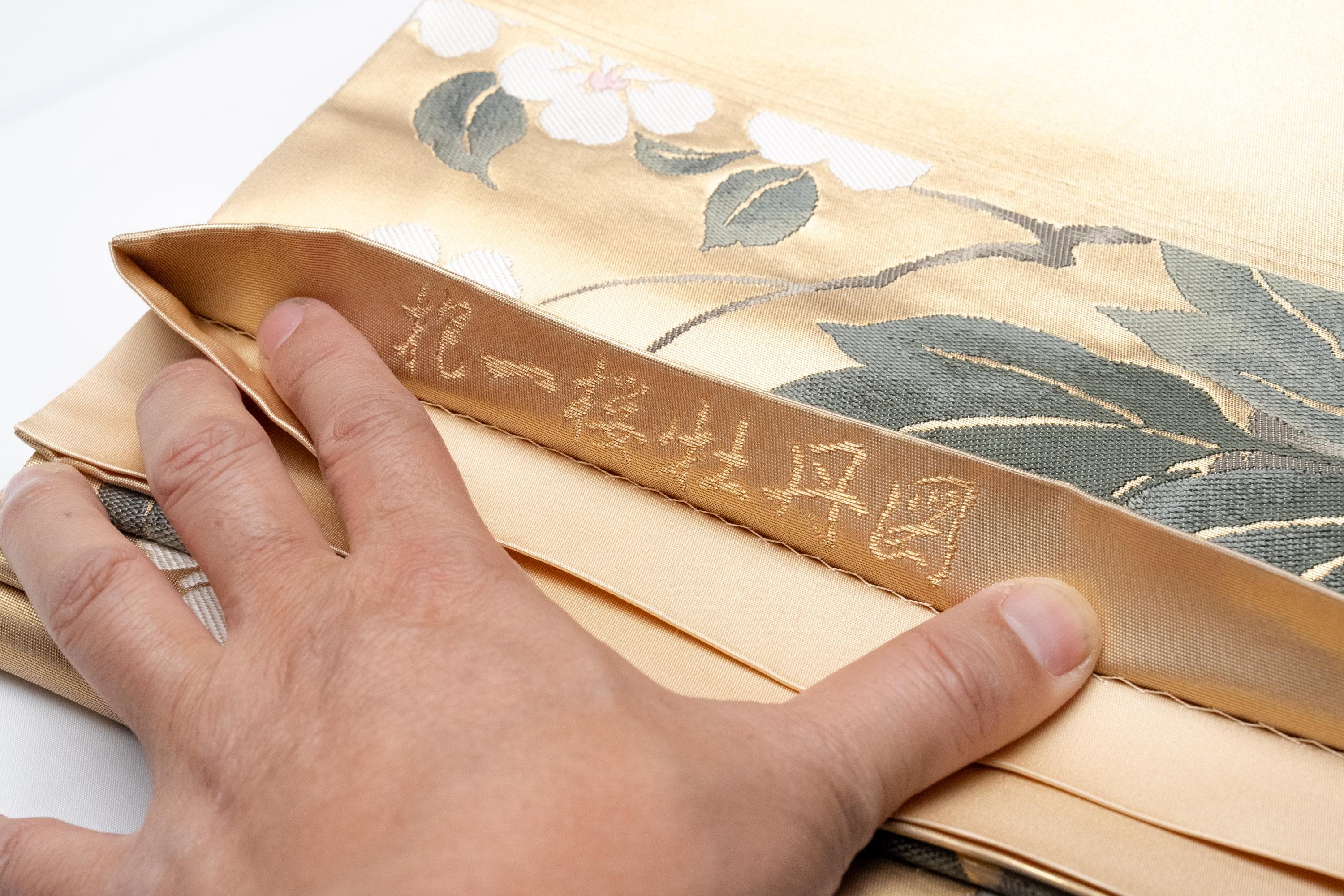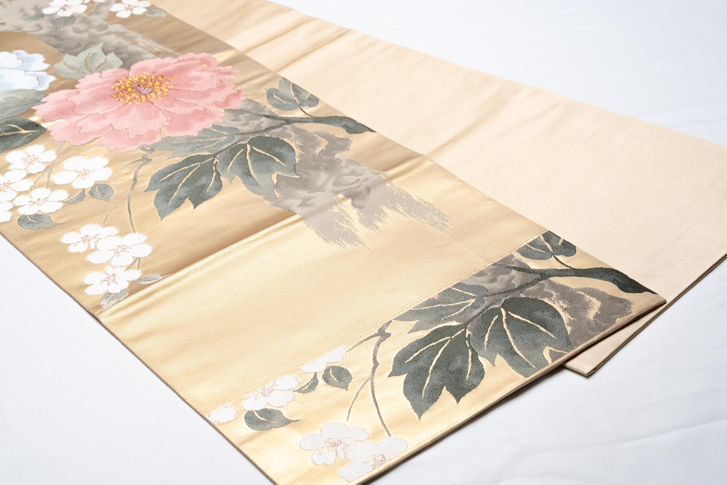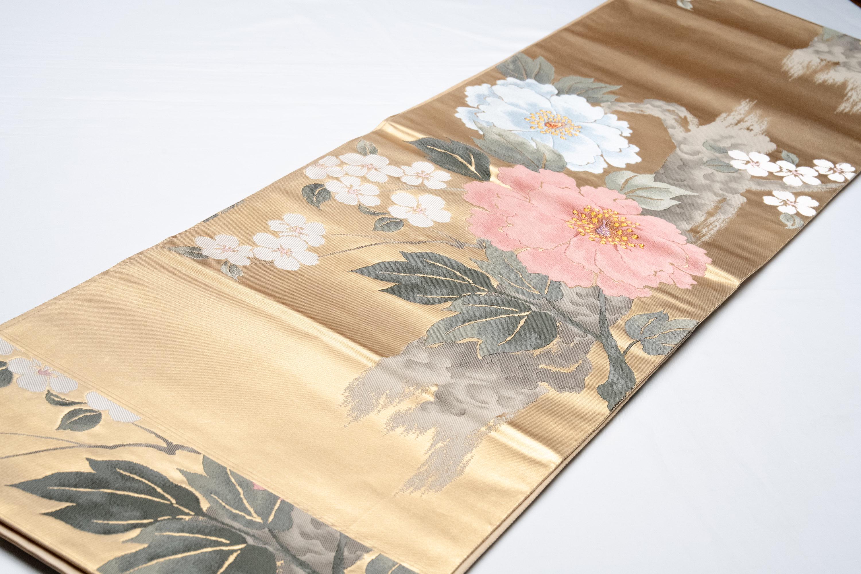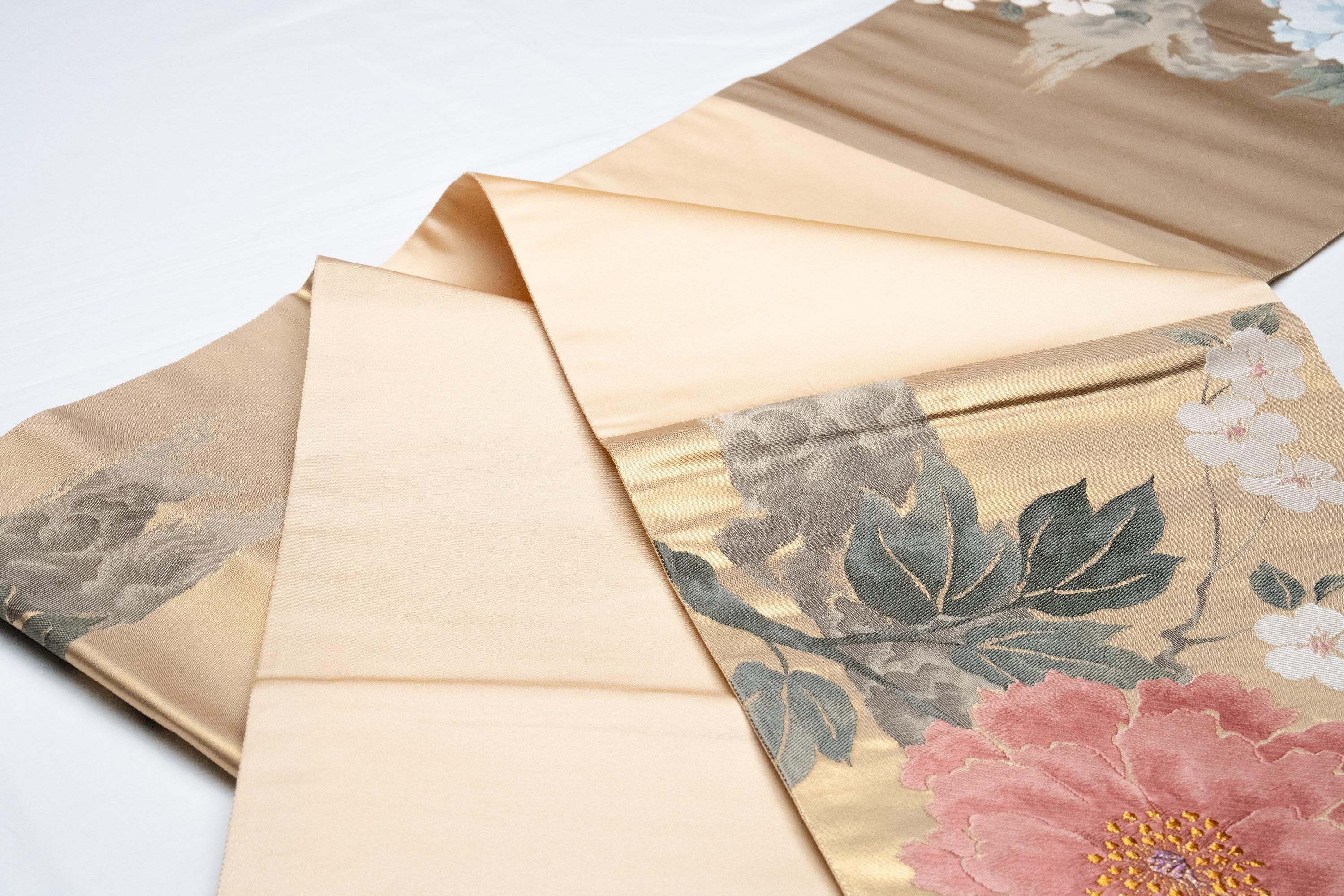 Fukuro Obi is a full-size sash belt that wraps around the torso in women's formal Kimono wearing. It is wider, longer and heavier than other informal Obis and serves the purpose of keeping the Kimono front closed securely, drawing up excess fabric to adjust the length of Kimono, and decorative expressions.