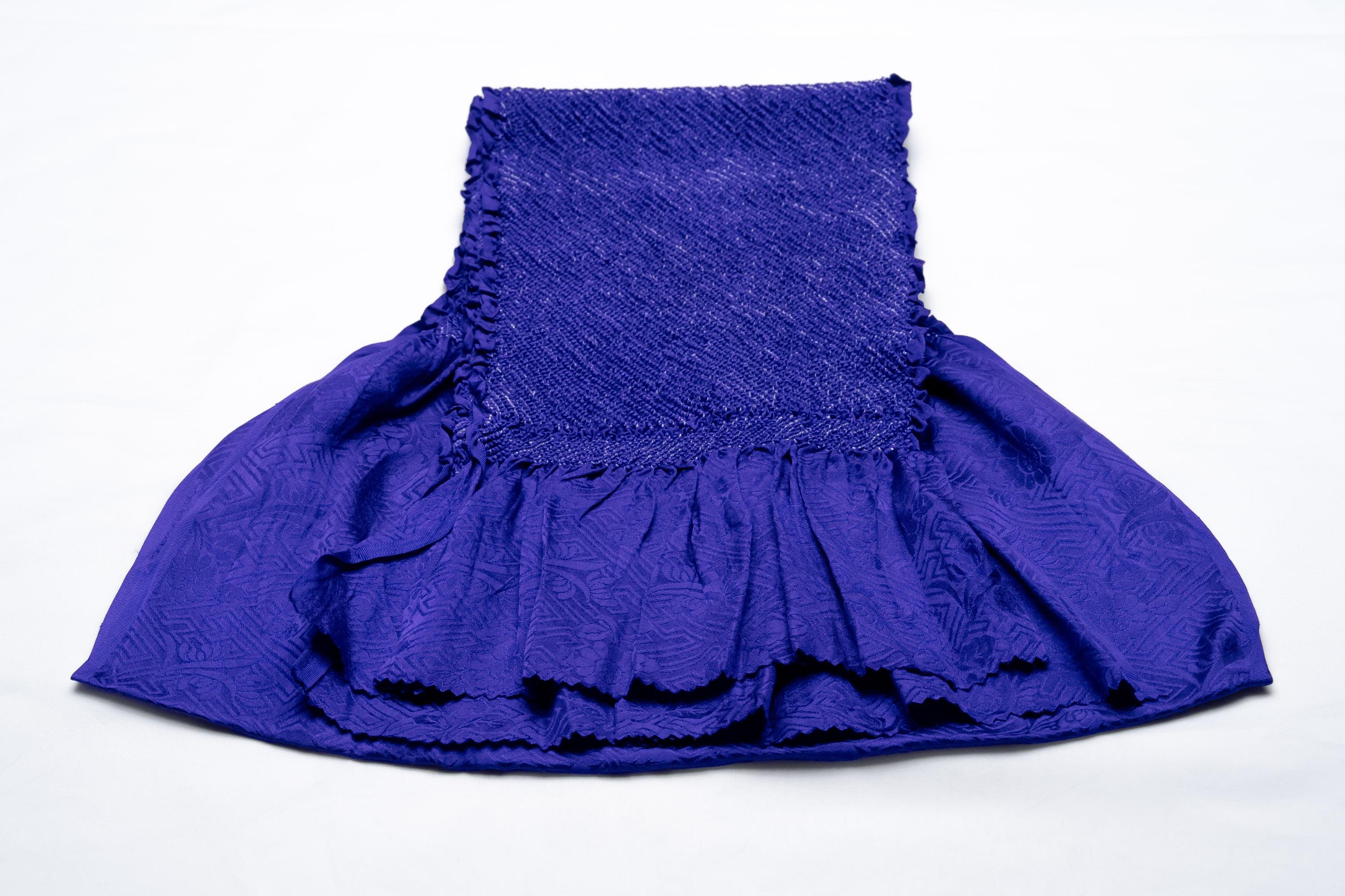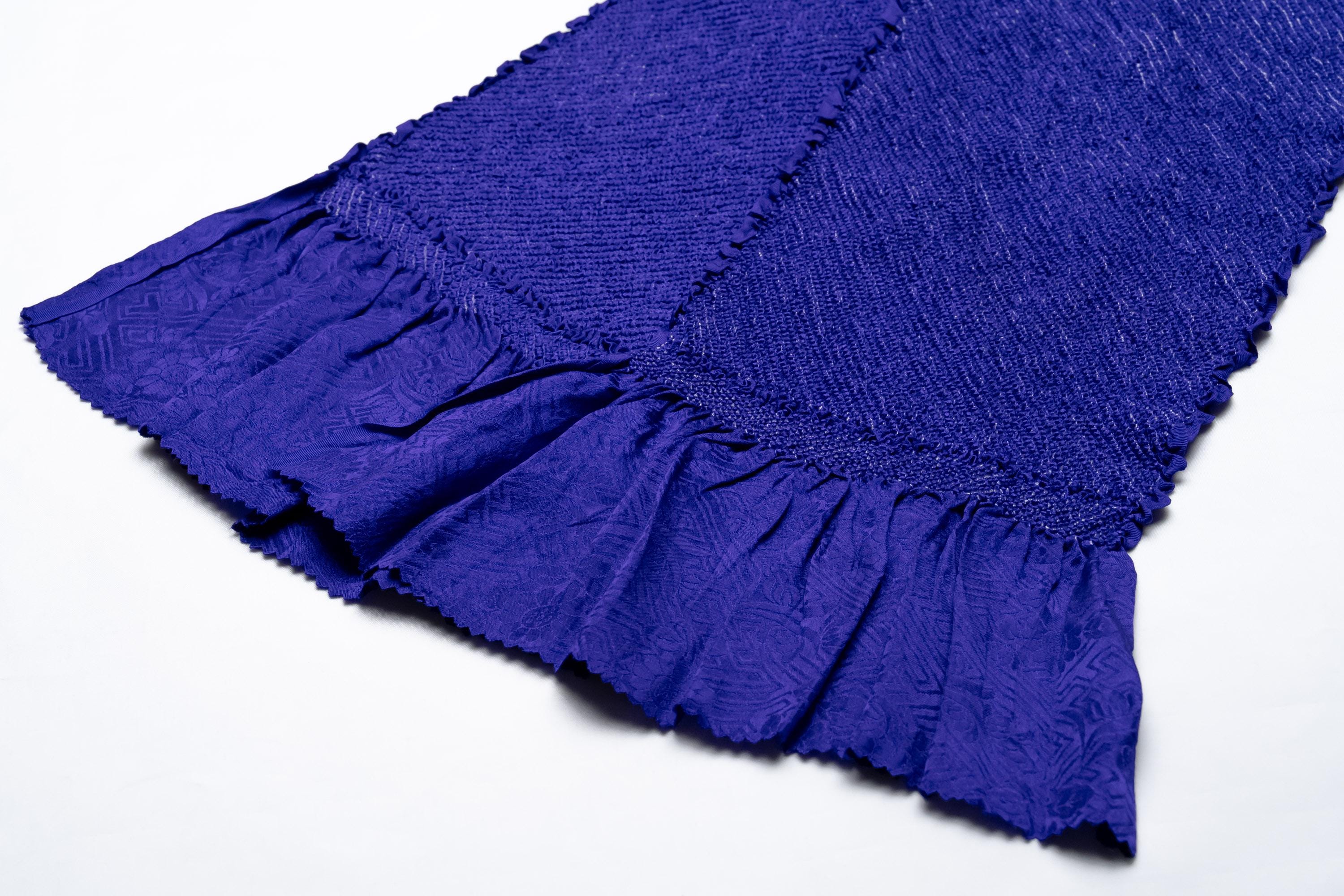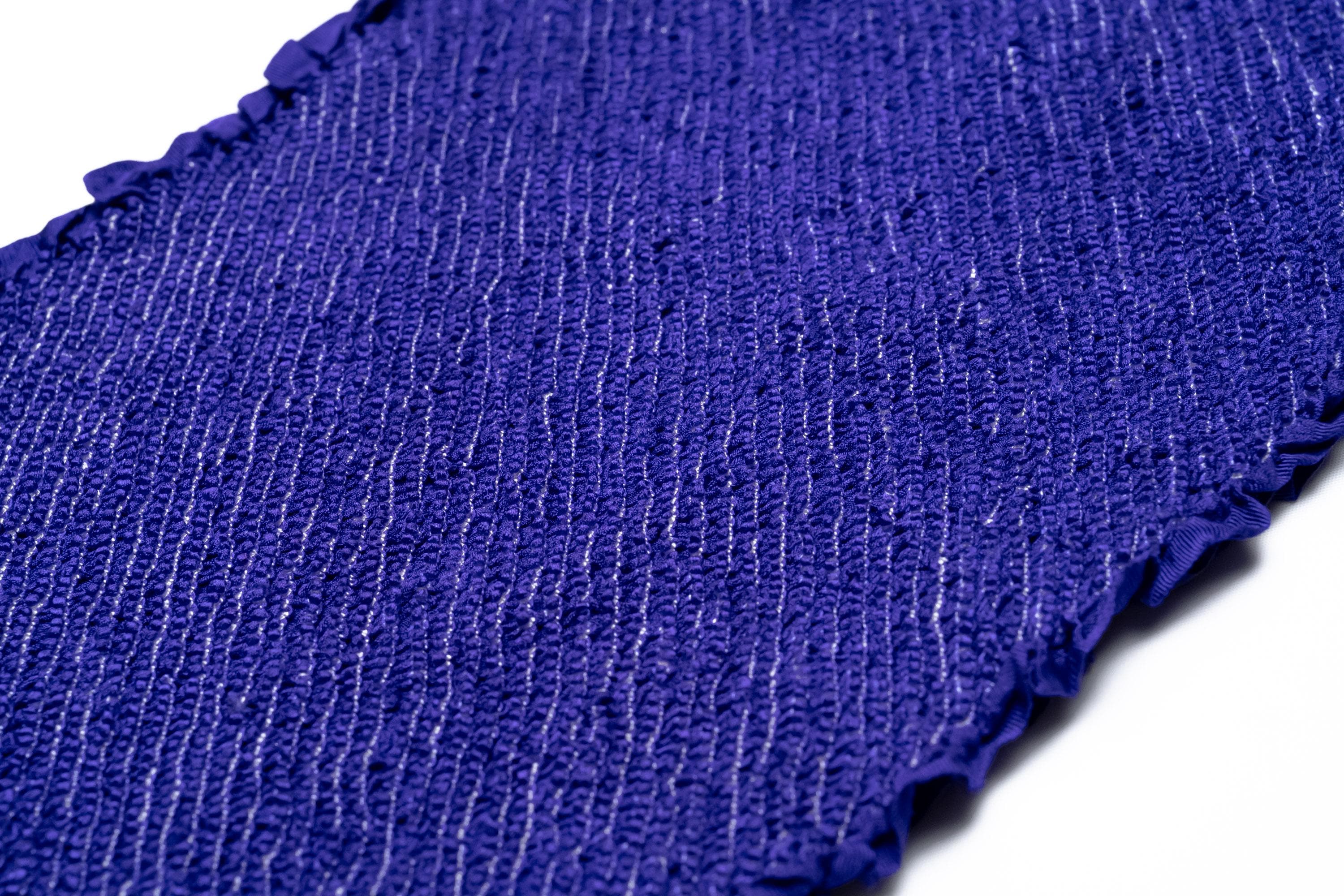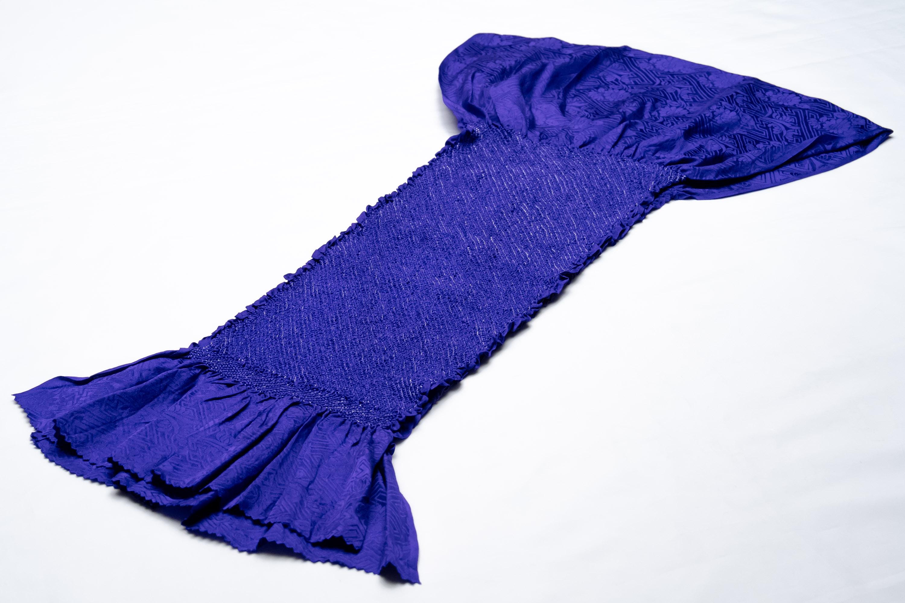 Obiage is a decorative and functional elastic fabric that is being worn above the Obi. It serves the purpose of covering/keeping ObiMakura in place and helping to secure the upper part of Obi knot. Obiage are broadly divided into two different looks/characteristics, a thin scarf-like flat fabric type which are then subdivided into Rinzu, Chirimen, Kinsha and Mofuku, and a thicker scrunchy-like more elastic fabric type which is Shibori.