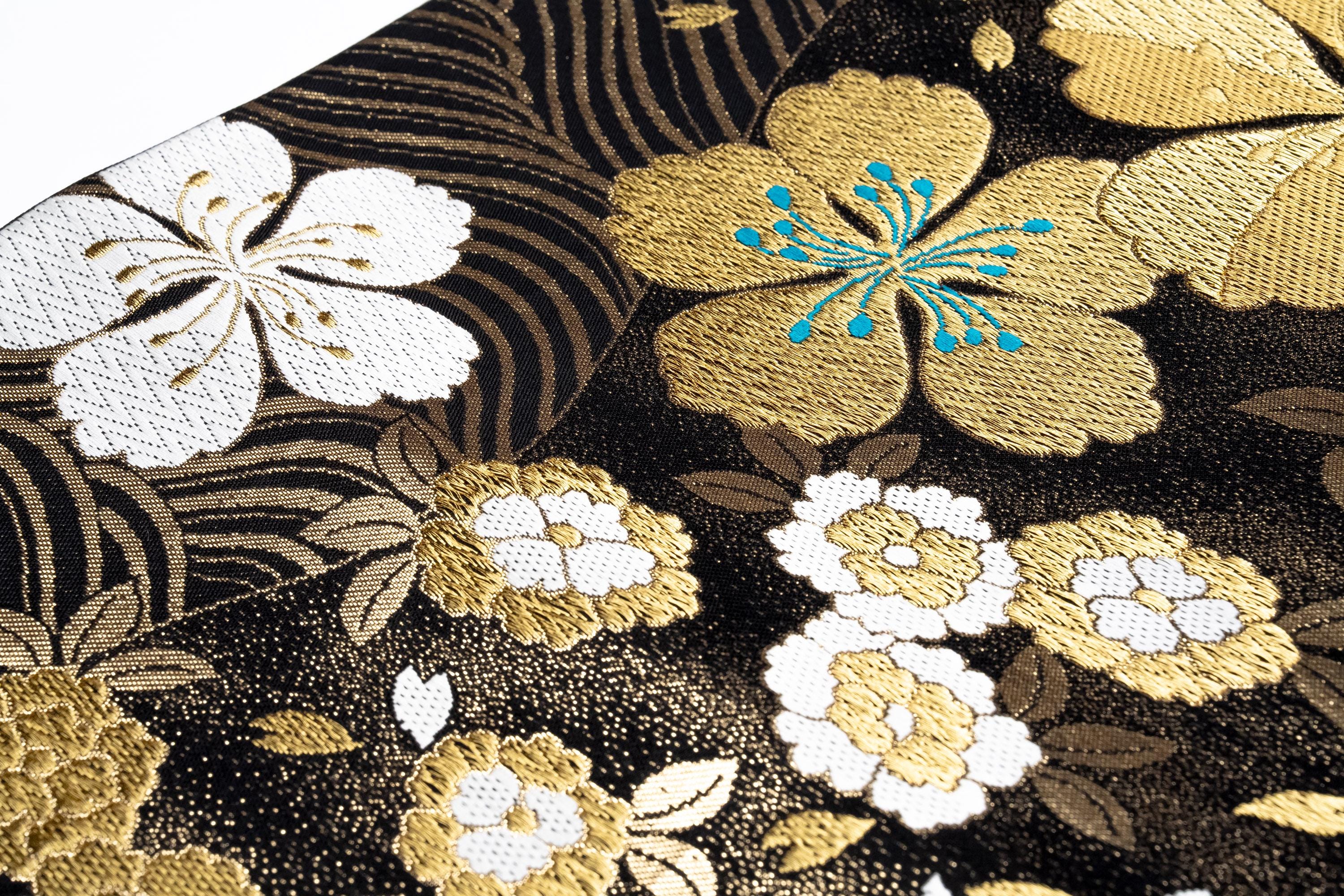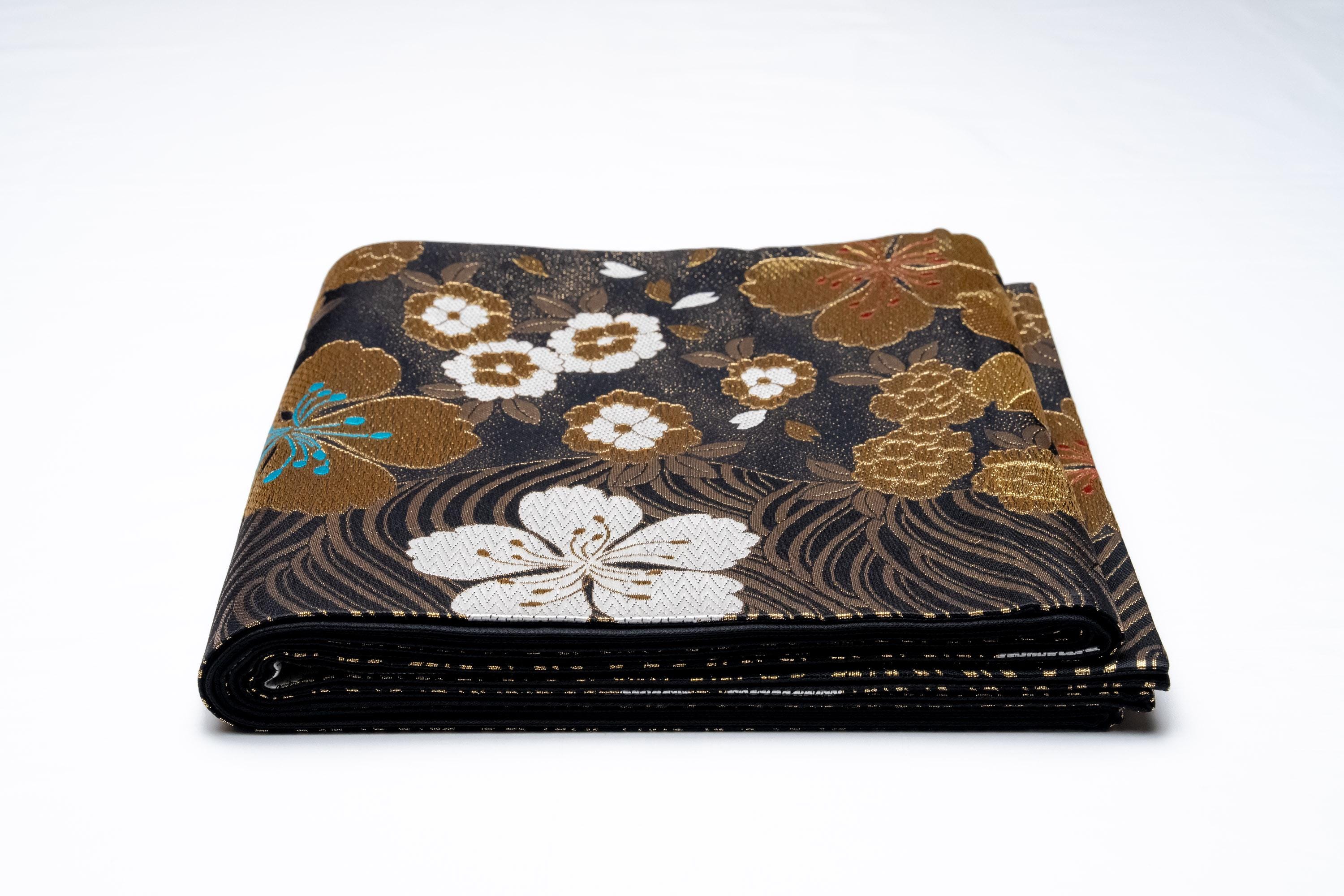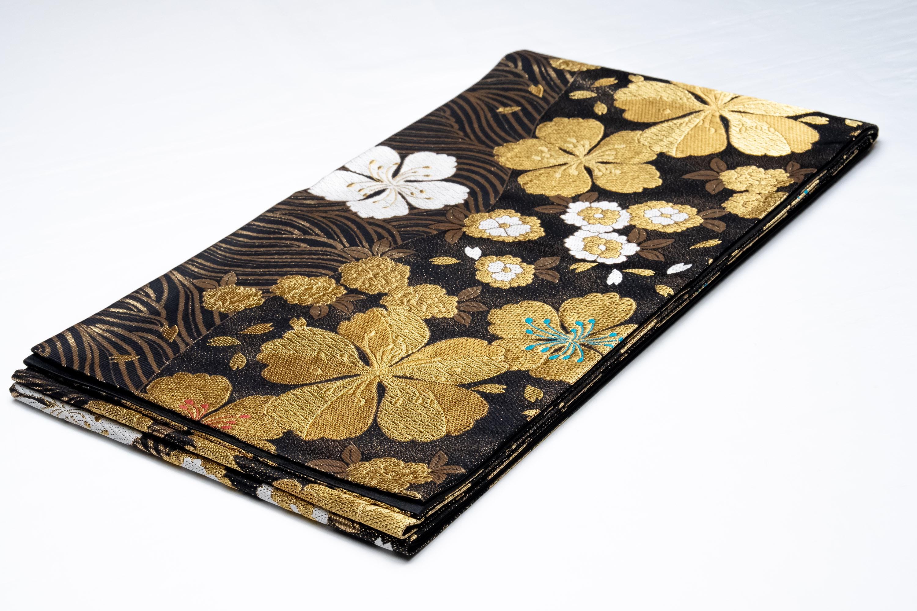 Fukuro Obi is a full-size sash belt that wraps around the torso in women's formal Kimono wearing. It is wider, longer and heavier than other informal Obis and serves the purpose of keeping the Kimono front closed securely, drawing up excess fabric to adjust the length of Kimono, and decorative expressions.