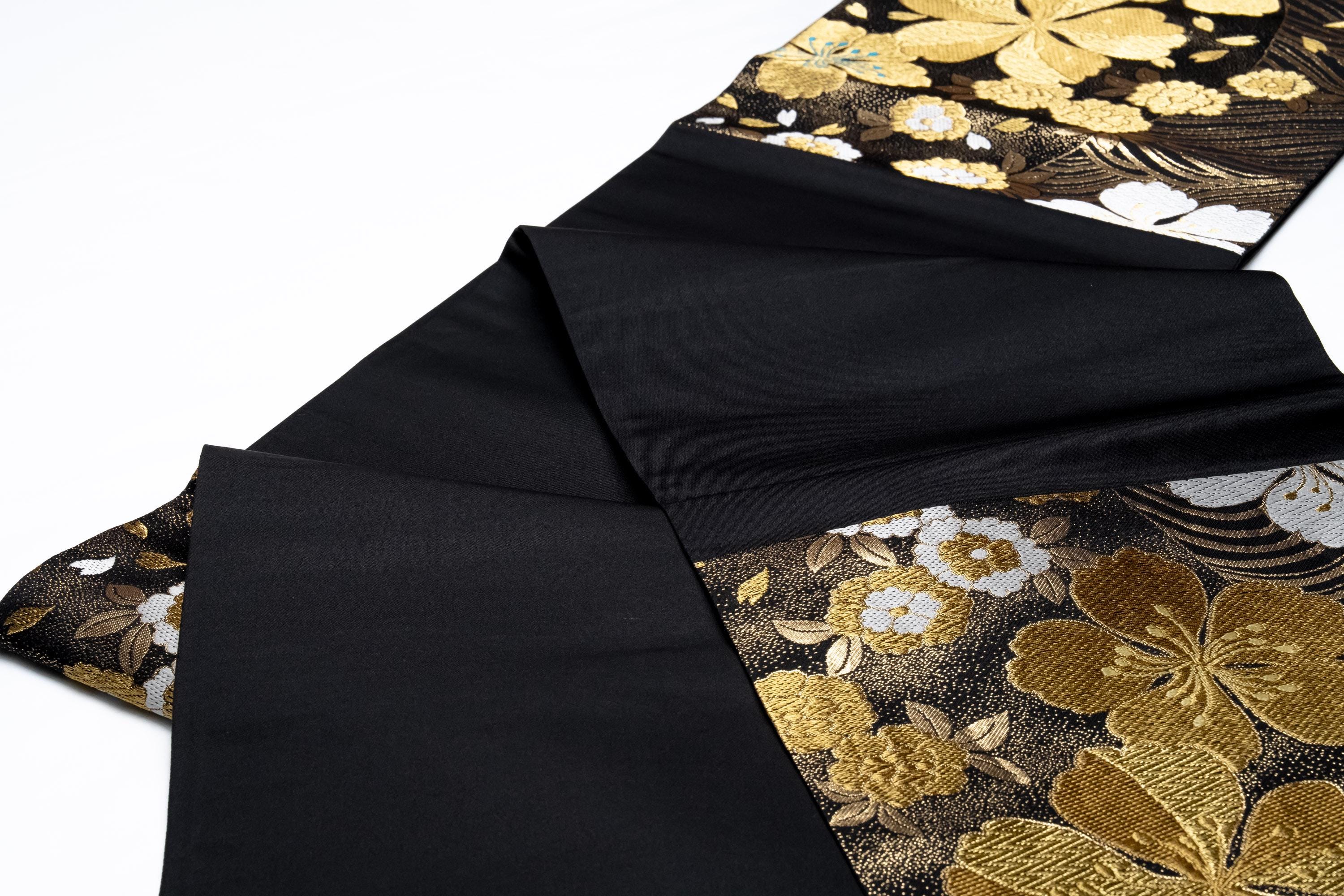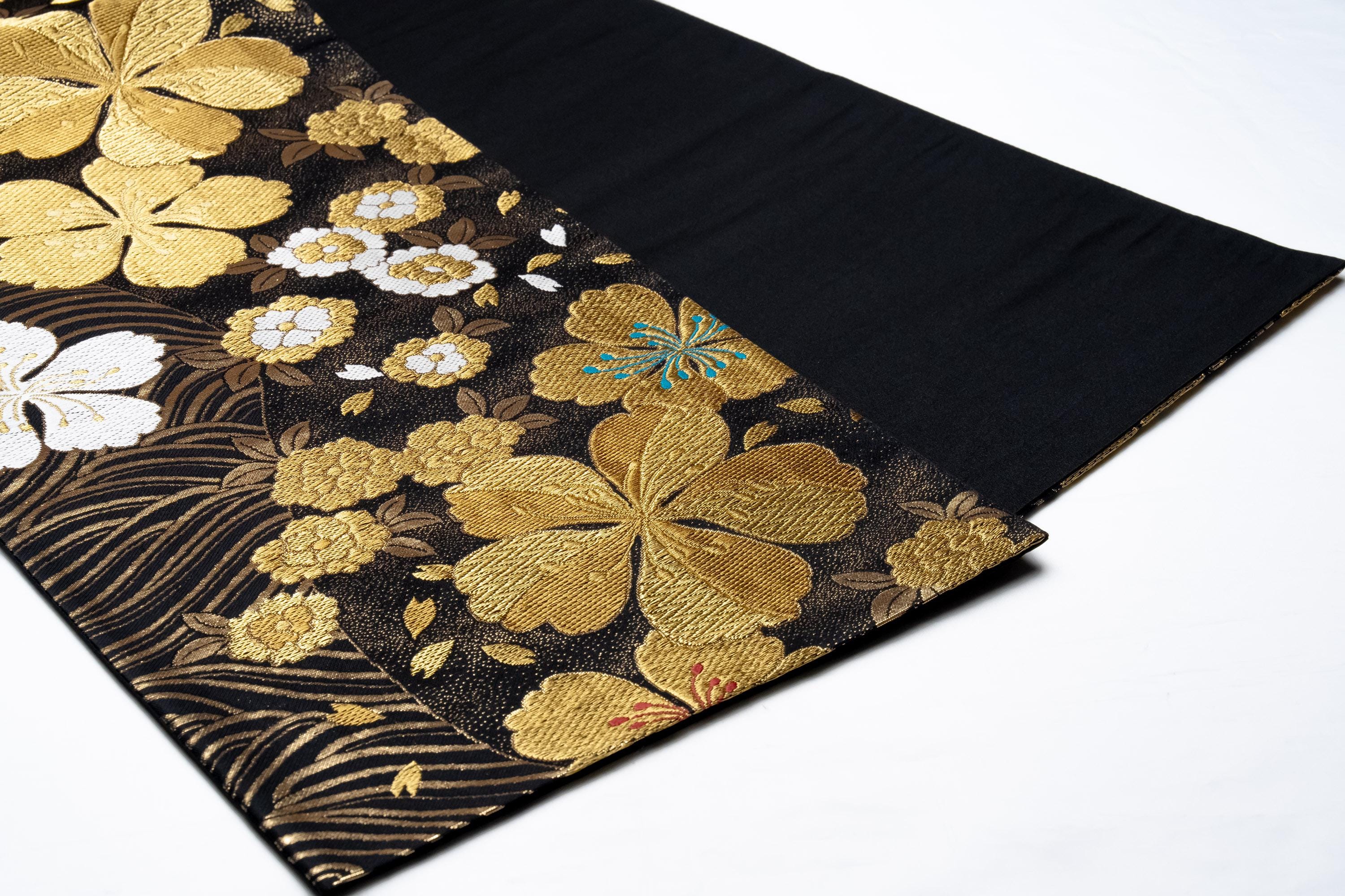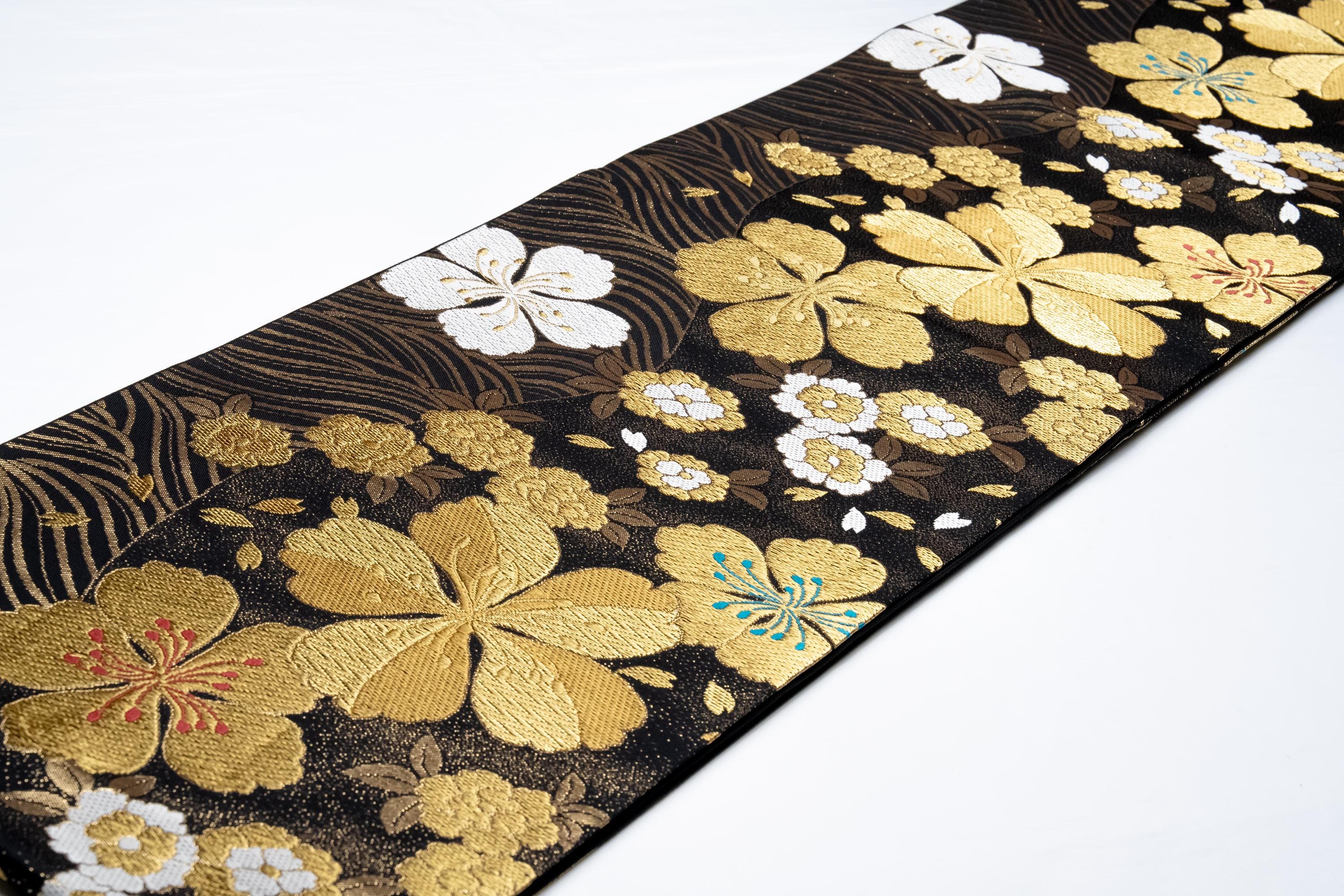 Fukuro Obi is a full-size sash belt that wraps around the torso in women's formal Kimono wearing. It is wider, longer and heavier than other informal Obis and serves the purpose of keeping the Kimono front closed securely, drawing up excess fabric to adjust the length of Kimono, and decorative expressions.